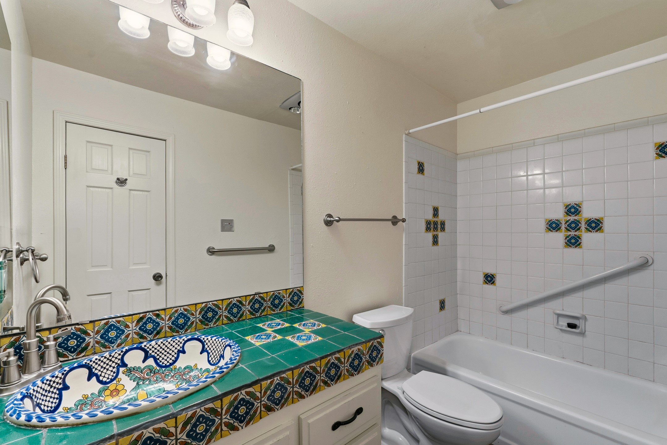 Charming downstairs corner unit in desirable Los Arroyos, filled with natural light and Southwest character. Saltillo tile floors run throughout the main living areas, adding warmth and timeless appeal. The open kitchen features a window that brings in additional light and creates an inviting space for cooking and entertaining. This thoughtfully designed condo offers two bedrooms, including one with its own sink/vanity area for added convenience. The full bath is beautifully appointed with striking Talavera tile accents, adding vibrant color and authentic Santa Fe style. Step outside to a large corner patio finished with flagstone tile -- perfect for outdoor dining, container gardening, or relaxing in your private retreat. A dedicated storage area adds practicality and ease. Comfortable, bright, and full of character, this Los Arroyos gem is an ideal full-time residence, second home, or investment opportunity. Condo fee: $385/monthly, includes baseboard hot water heat, water, sewer, refuse, building and grounds maintenance, and insurance.