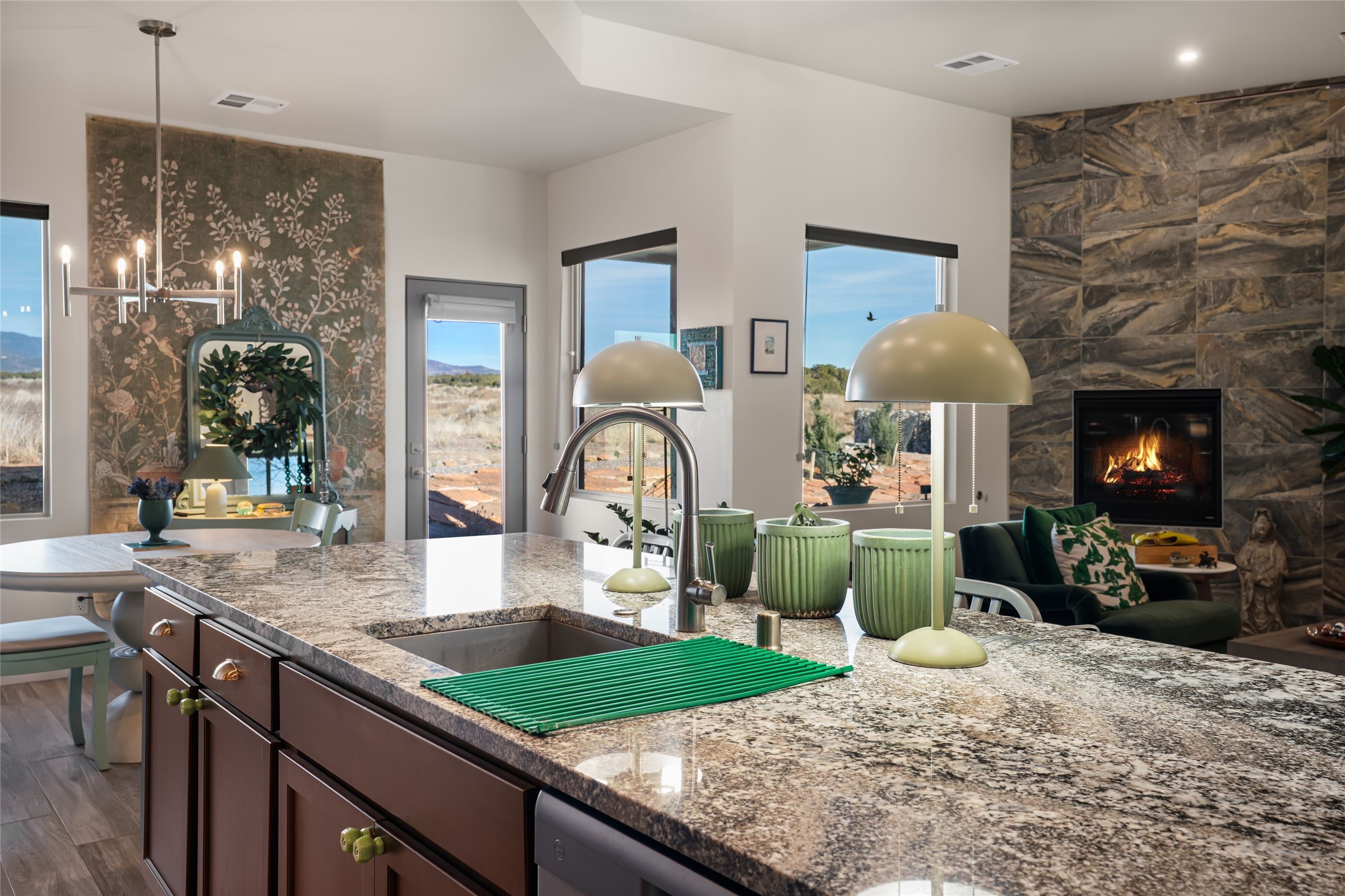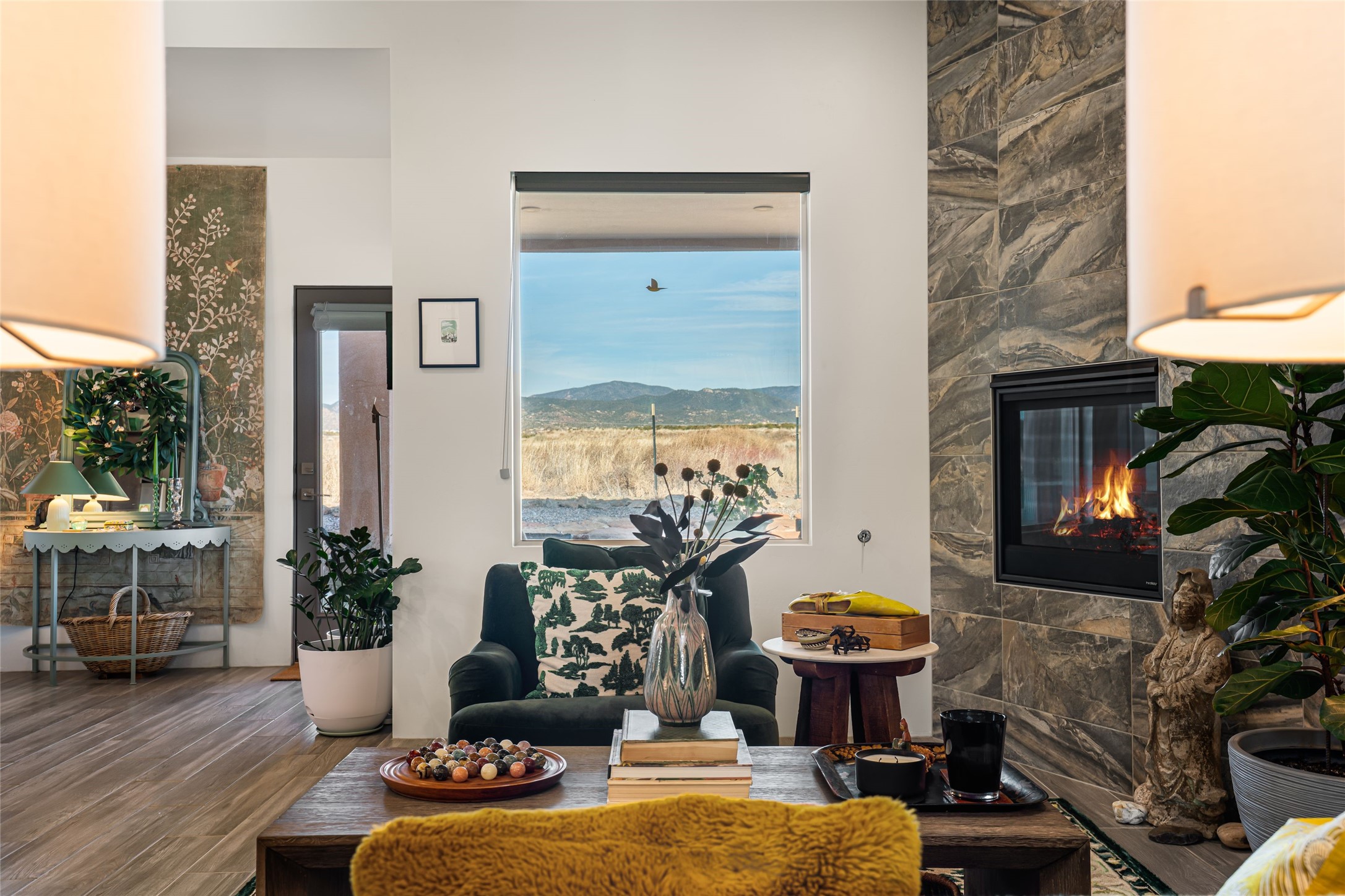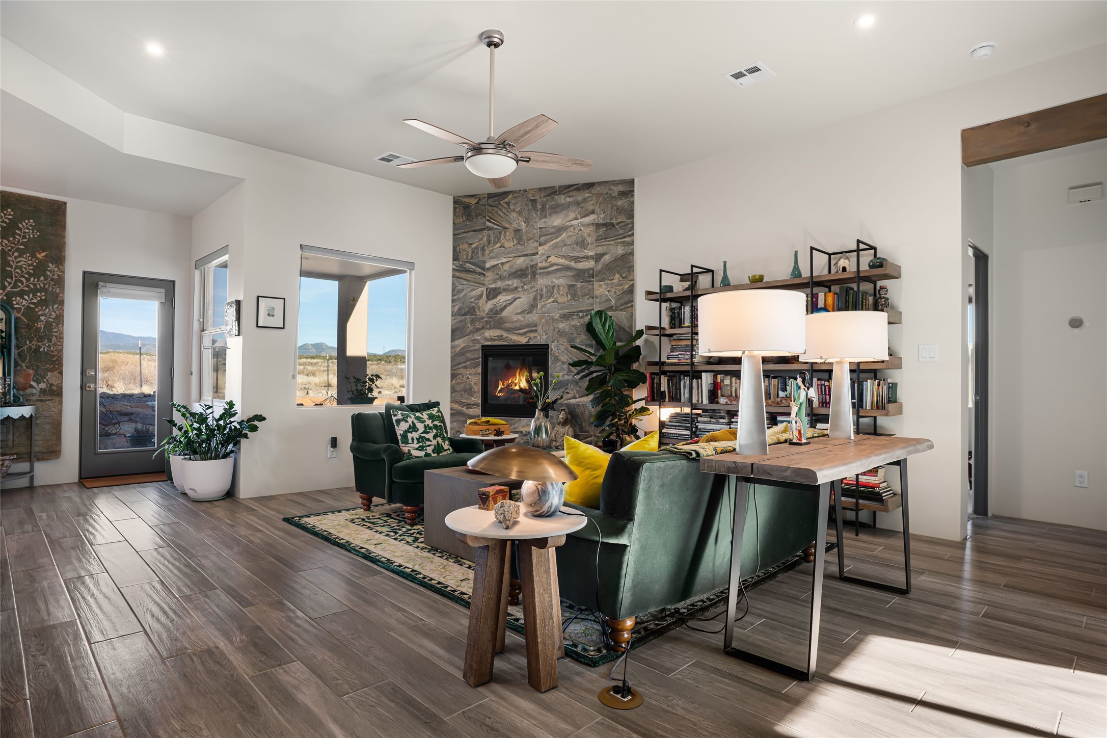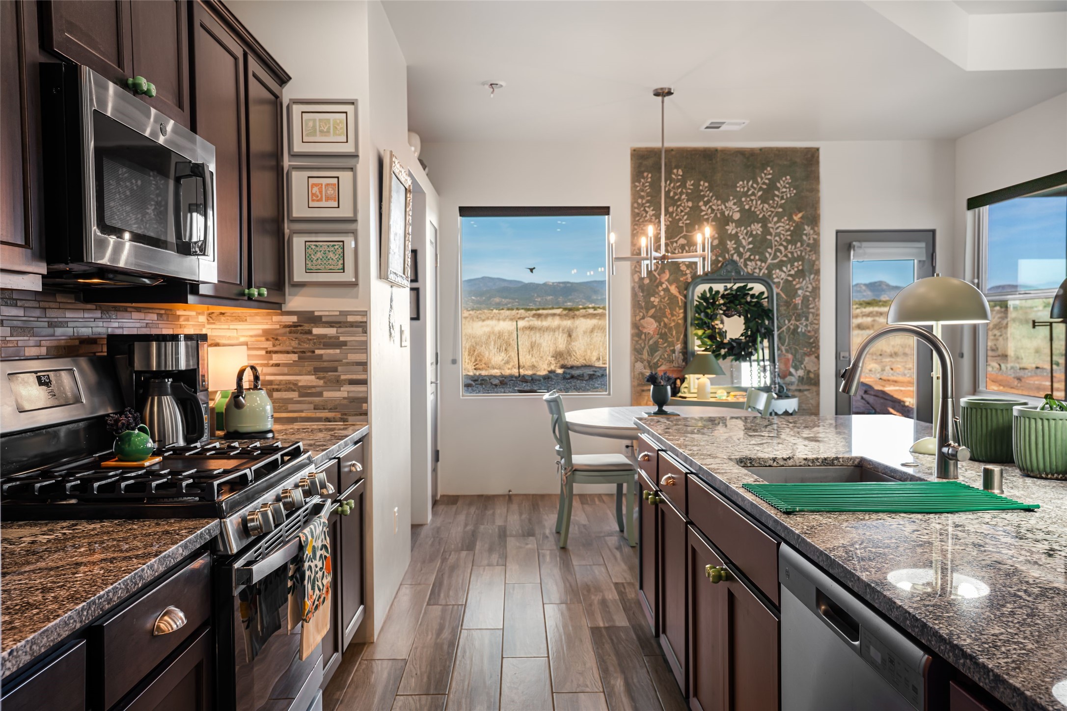 Located on one of the premier Oshara Village estate lots overlooking the green space to the South and the Sangre de Cristo Mountains to the East, this almost new 3 bedroom, 2 bath home was completed spring of 2022 and is a HERS-rated green home through energy efficiency including AC, healthy materials, durability and sustainability. With clean soft contemporary lines, the main living space is open and enjoys a kiva gas fireplace, high ceilings, fantastic light, mountain views and easy access to the outdoor covered portal from which to enjoy sunrises, sunset colors and moonrises over the Sangres. The kitchen has excellent storage in the solid wood cabinets, plenty of prep room on generous granite counters and upgraded stainless appliances, including gas stove and farm sink. The laundry room offers good storage and leads directly into the two car garage. Excellent bedroom separation, the main bedroom is graciously sized, also looks out to the Sangres and has an enormous walk-in closet with plenty of hanging and shelving space. En suite bath with two sinks, granite counters and large walk-in shower. On the other side of the house, the second bedroom has more big mountain vistas, full guest bath adjacent and linen closet. The third bedroom's view is to the south with Sandia views and barn doors to close it off from the main living area, and makes a super media room, office or overflow guest room. The outdoor landscaping includes stone gabions to sculpturally define the space, easy to maintain perennials and conifers and invites the quail, hawks, ravens and roadrunners who live in the adjacent green space. Minutes to the community college, trails and shopping yet just about 15 minutes to the Plaza, this is a very special home, beautifully maintained and lovingly cared for.