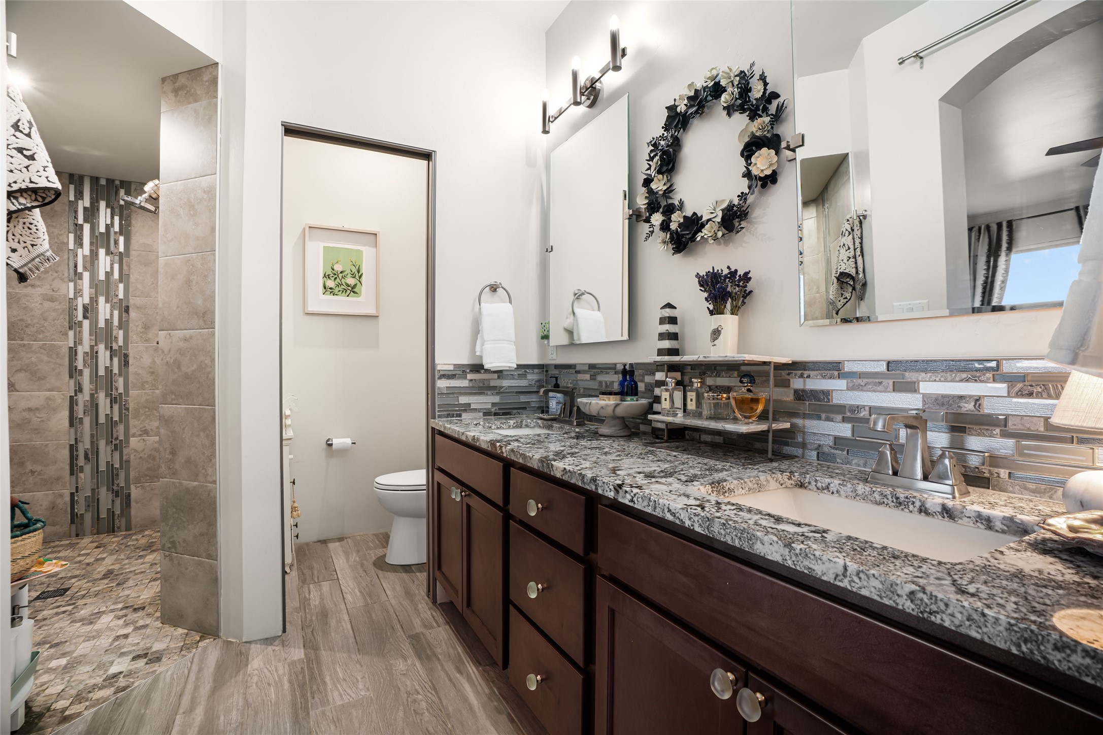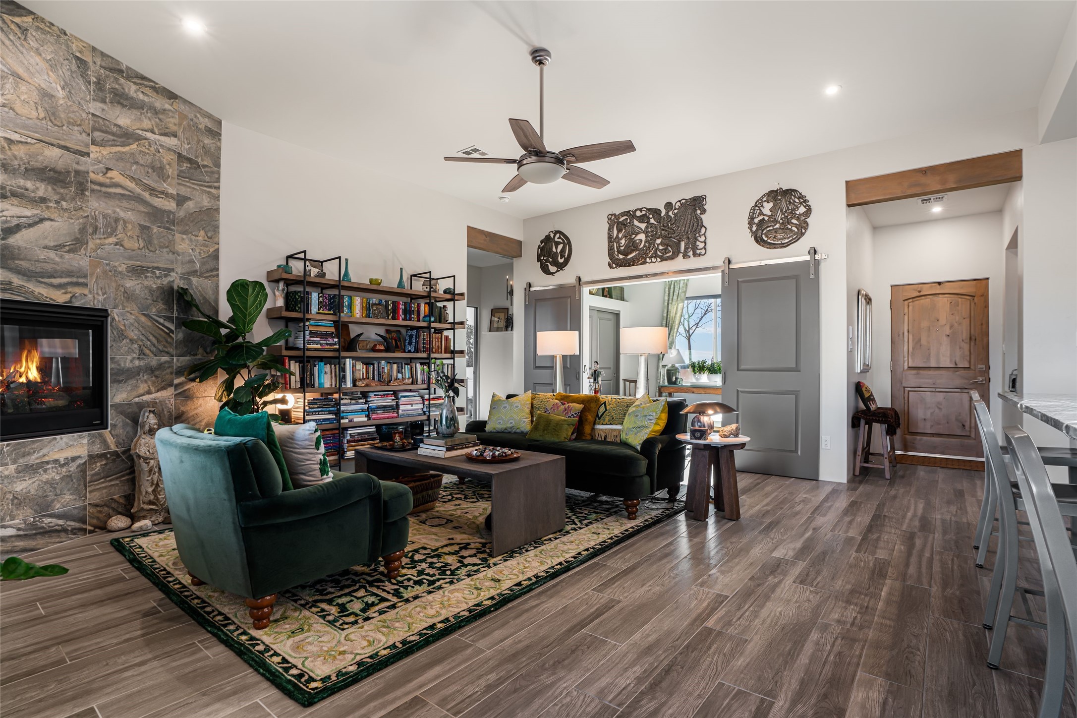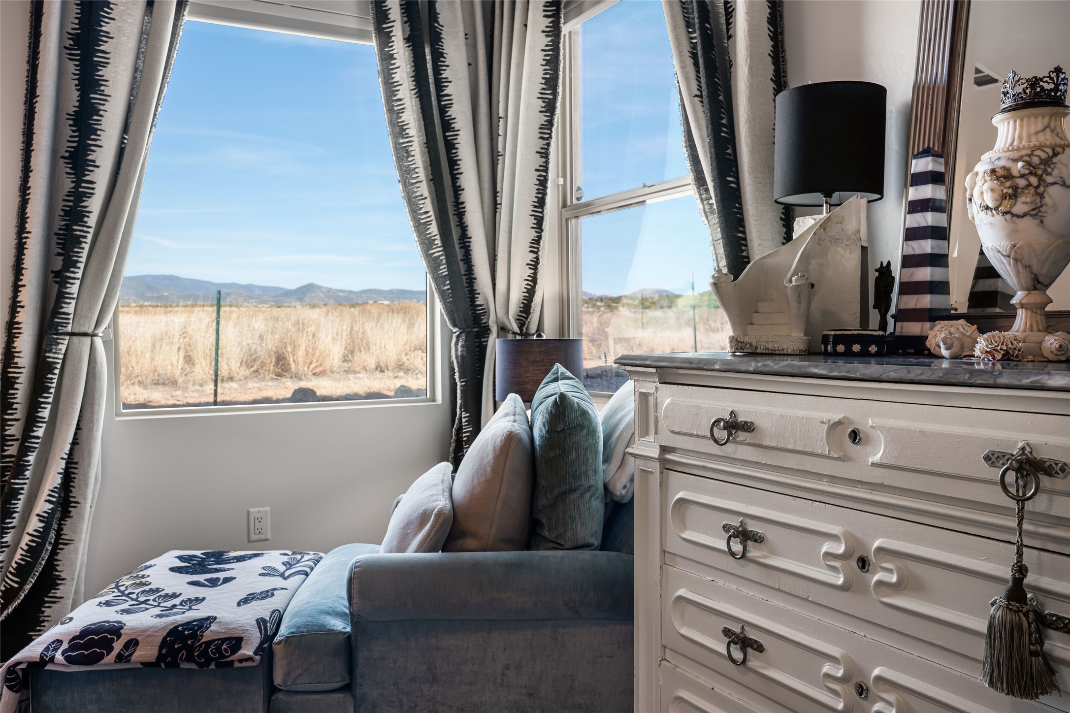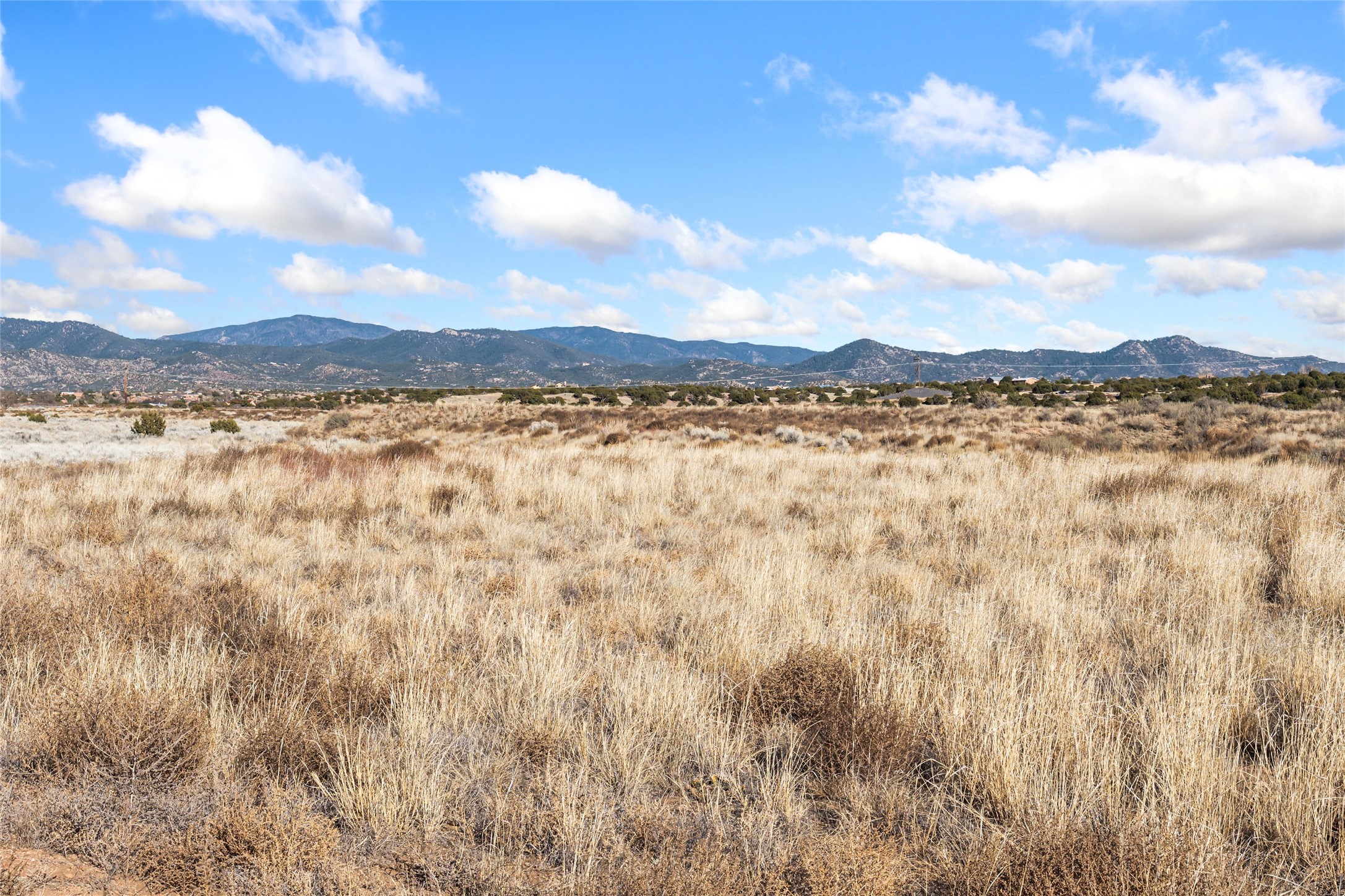 Located on one of the premier Oshara Village estate lots overlooking the green space to the South and the Sangre de Cristo Mountains to the East, this almost new 3 bedroom, 2 bath home was completed spring of 2022 and is a HERS-rated green home through energy efficiency including AC, healthy materials, durability and sustainability. With clean soft contemporary lines, the main living space is open and enjoys a kiva gas fireplace, high ceilings, fantastic light, mountain views and easy access to the outdoor covered portal from which to enjoy sunrises, sunset colors and moonrises over the Sangres. The kitchen has excellent storage in the solid wood cabinets, plenty of prep room on generous granite counters and upgraded stainless appliances, including gas stove and farm sink. The laundry room offers good storage and leads directly into the two car garage. Excellent bedroom separation, the main bedroom is graciously sized, also looks out to the Sangres and has an enormous walk-in closet with plenty of hanging and shelving space. En suite bath with two sinks, granite counters and large walk-in shower. On the other side of the house, the second bedroom has more big mountain vistas, full guest bath adjacent and linen closet. The third bedroom's view is to the south with Sandia views and barn doors to close it off from the main living area, and makes a super media room, office or overflow guest room. The outdoor landscaping includes stone gabions to sculpturally define the space, easy to maintain perennials and conifers and invites the quail, hawks, ravens and roadrunners who live in the adjacent green space. Minutes to the community college, trails and shopping yet just about 15 minutes to the Plaza, this is a very special home, beautifully maintained and lovingly cared for.