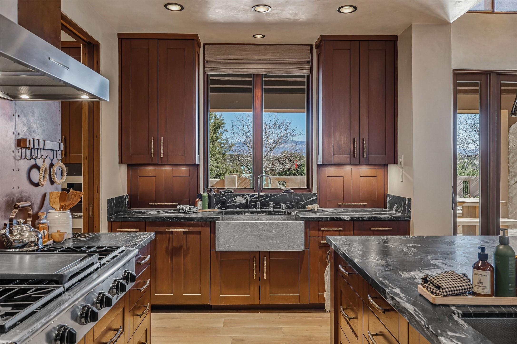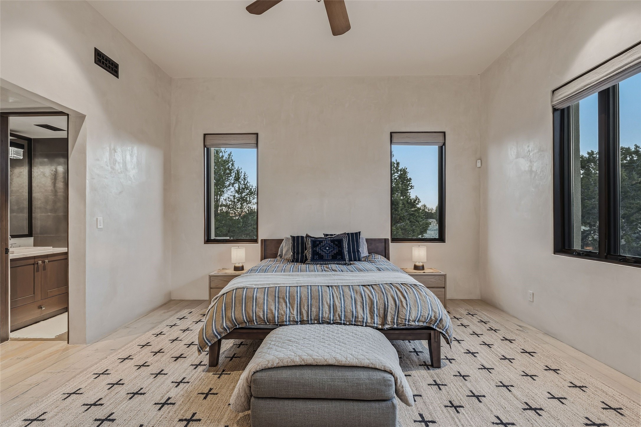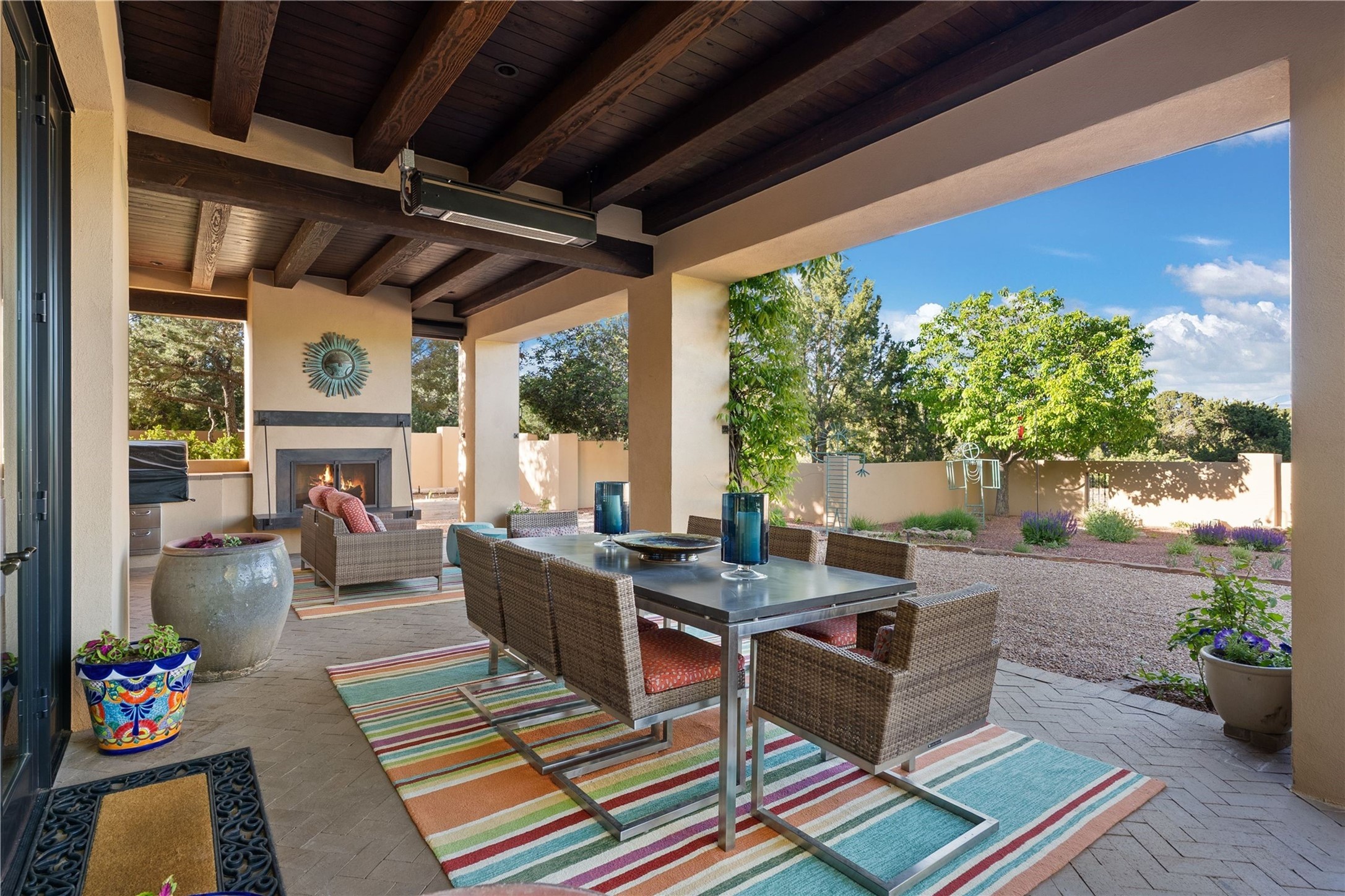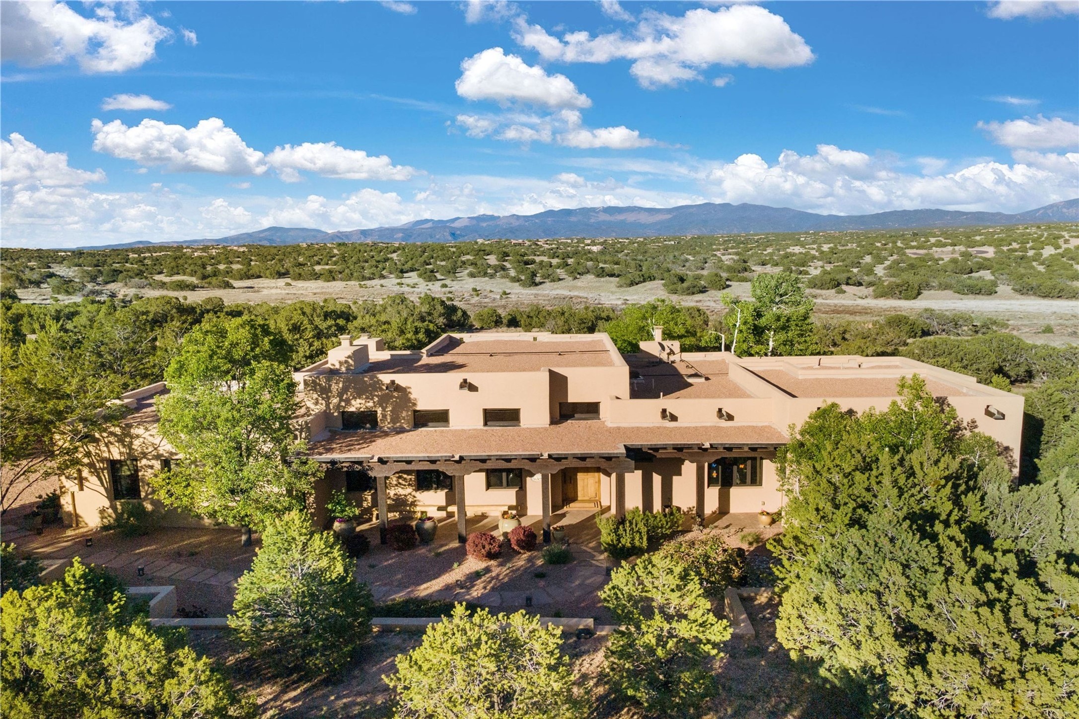 Las Campanas 3-bedroom, 3.5-bath custom home on 2-acres with clear, unobstructed views of the Sangre de Christo Mountains. Single story; no interior steps. Designed by acclaimed architect, David Lorimer AIA with interiors by ASID award winning designer, Jeannie Brown, Diva Interior Design, Ltd., this home features extraordinary unique and high-end features such as century-old, reclaimed beams, antique Mexican doors, hand-hewn oak floors, Douglas fir interior doors, Rocky Mountain cast bronze door hardware, cabinet hardware and pulls on all cabinets and diamond plaster throughout. The stately living room is enhanced by 15-ft. ceilings, a Rumford fireplace, clerestory windows and custom designed, cabinets. The living area easily flows into a spectacular open concept dining room and kitchen, which is appointed with deluxe appliances including a Sub-Zero wine cooler, premium granite counter tops, and island with prep sink. Retreat to the luxurious primary suite with fireplace, two-sided bath divided by a walk-in steam shower, free standing soaking tub and a spacious custom designed, walk in closet. Friends and neighbors alike will enjoy being entertained on the back portal with outdoor fireplace and gorgeous mountain views. Bonus is a separate, fenced in space for pets. Membership to the Club at Las Campanas is available for a separate fee and upon approval. Located at the beginning of Las Campanas, this home has easy access to Santa Fe and all its cultural, culinary and recreational amenities.