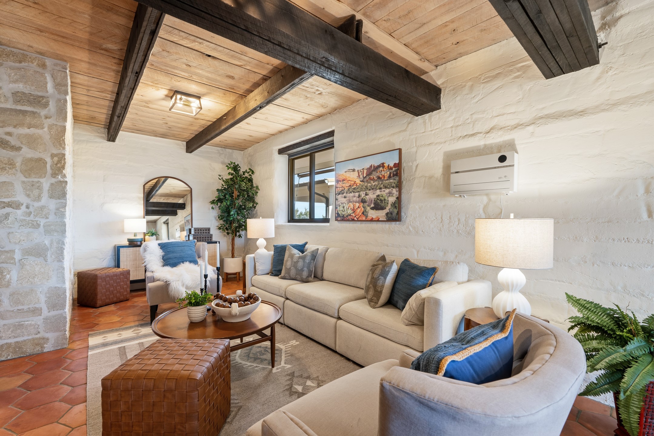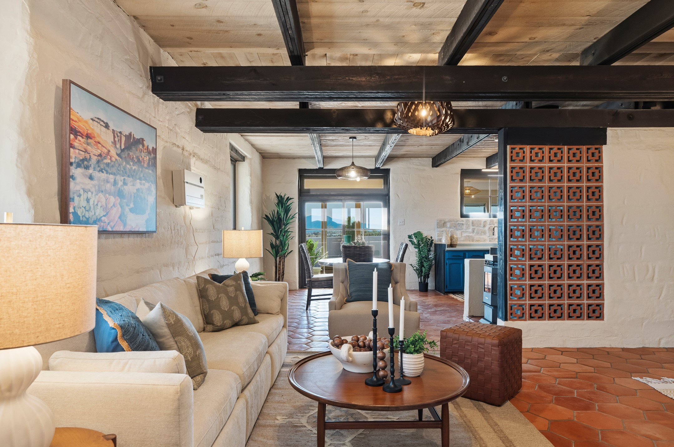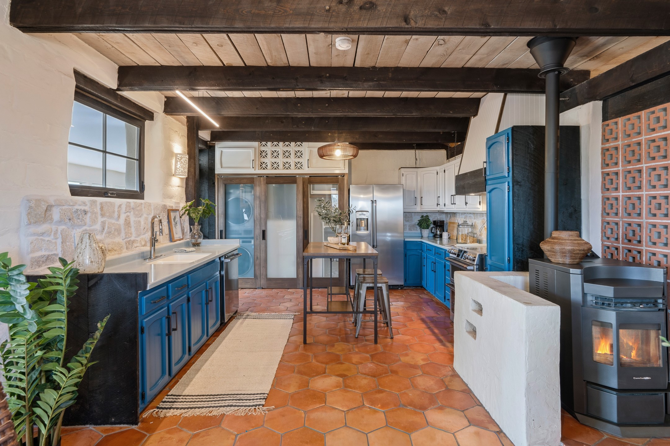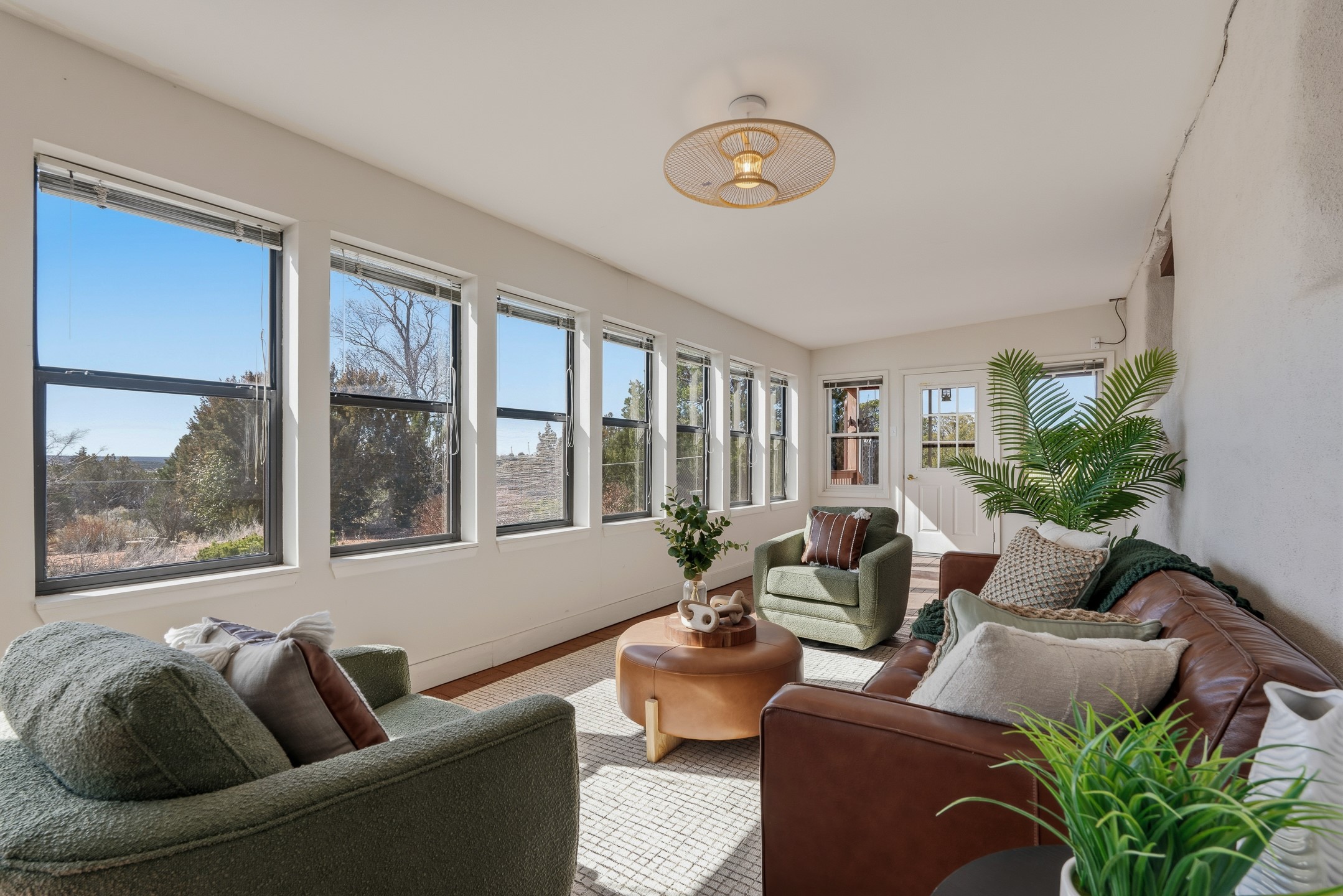Set on just over 3 acres in the Pajarito Acres community of White Rock, this distinctive 4-bedroom, 2-bath adobe home blends timeless Southwestern character with thoughtful updates and rich architectural detail. The entry welcomes you with a beautiful stone wall and warm Saltillo tile floors, setting the tone for the craftsmanship found throughout. Exposed wood beams, natural wood ceilings, and handcrafted wood doors create a warm and inviting atmosphere. In the living area, a striking decorative breeze block wall adds architectural interest while subtly defining the space. A pellet stove provides warmth and ambiance during cooler months. The kitchen offers updated appliances, a beautiful stone backsplash, abundant cabinetry, and generous workspace, all opening seamlessly to the dining and living areas, ideal for everyday living and entertaining. Just beyond the sliding doors off the dining area, the sunroom adds approximately 550 square feet of additional heated living space (included in the total 2,350 sq ft). With brick flooring and walls of windows, this bright space offers the perfect place to relax or enjoy views of the surrounding landscape. Thick adobe walls provide natural insulation, keeping the home cool in summer while the sunroom captures passive solar warmth in winter for improved energy efficiency.The home offers four versatile bedrooms, each with durable Pergo flooring. The primary suite includes a walk-in closet and updated bathroom, while the second bath serves the additional bedrooms. One bedroom features built-in shelving, ideal for a home office. The 3+ acre property offers views to the South and East, space for gardening, recreation, or simply enjoying the peaceful surroundings. Two outbuildings provide additional storage, while a two-car carport and circular driveway offer convenient parking. Additional highlights include a tankless hot water heater, updated lighting, and updated windows throughout the main home. Located minutes from Los Alamos National Laboratory, scenic trails, and White Rock parks and amenities, this property offers a rare combination of space, character, and convenience. If you are looking for acreage and an authentic adobe character in Pajarito Acres, 3 Maya Lane is a truly special opportunity. Schedule a showing today!
