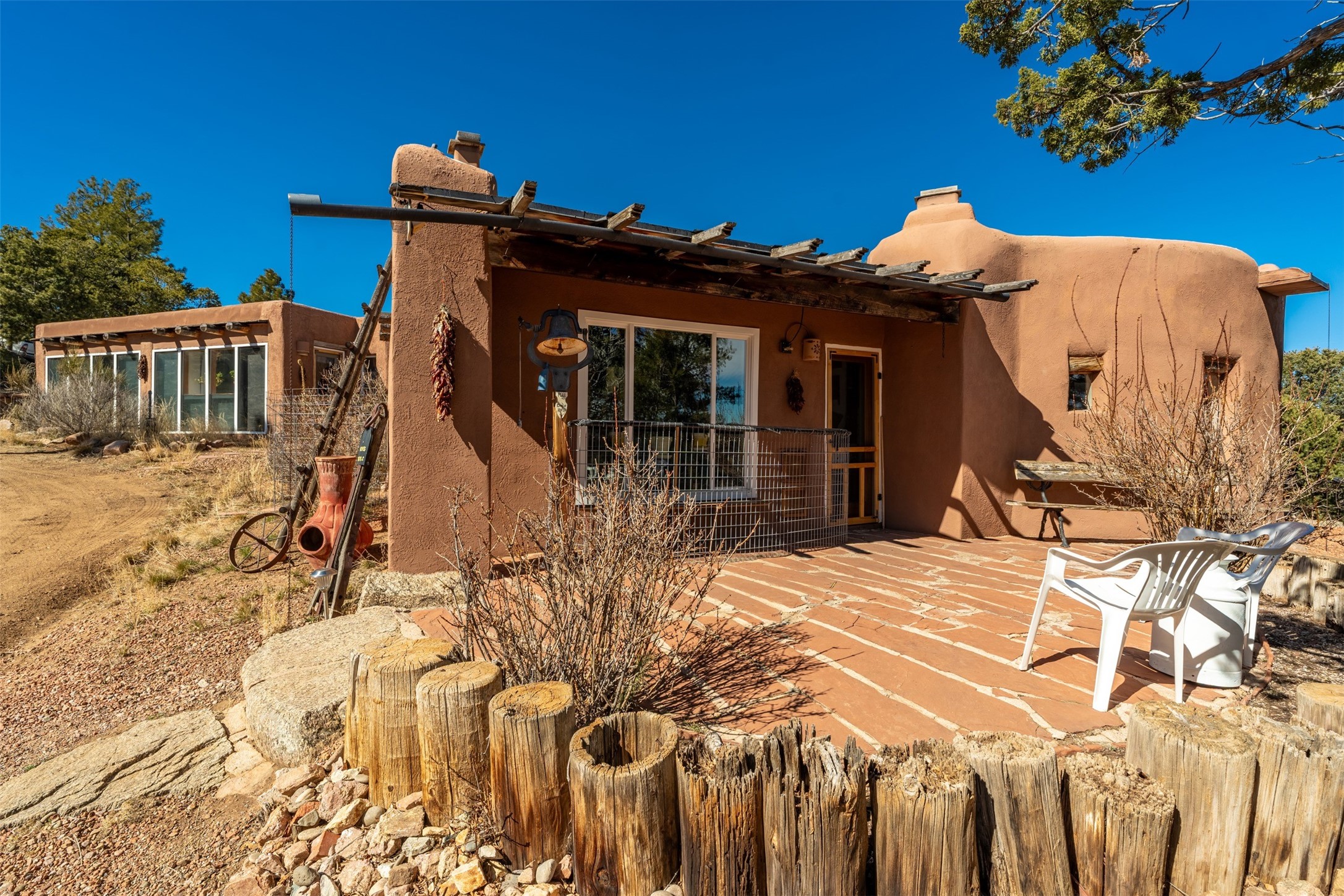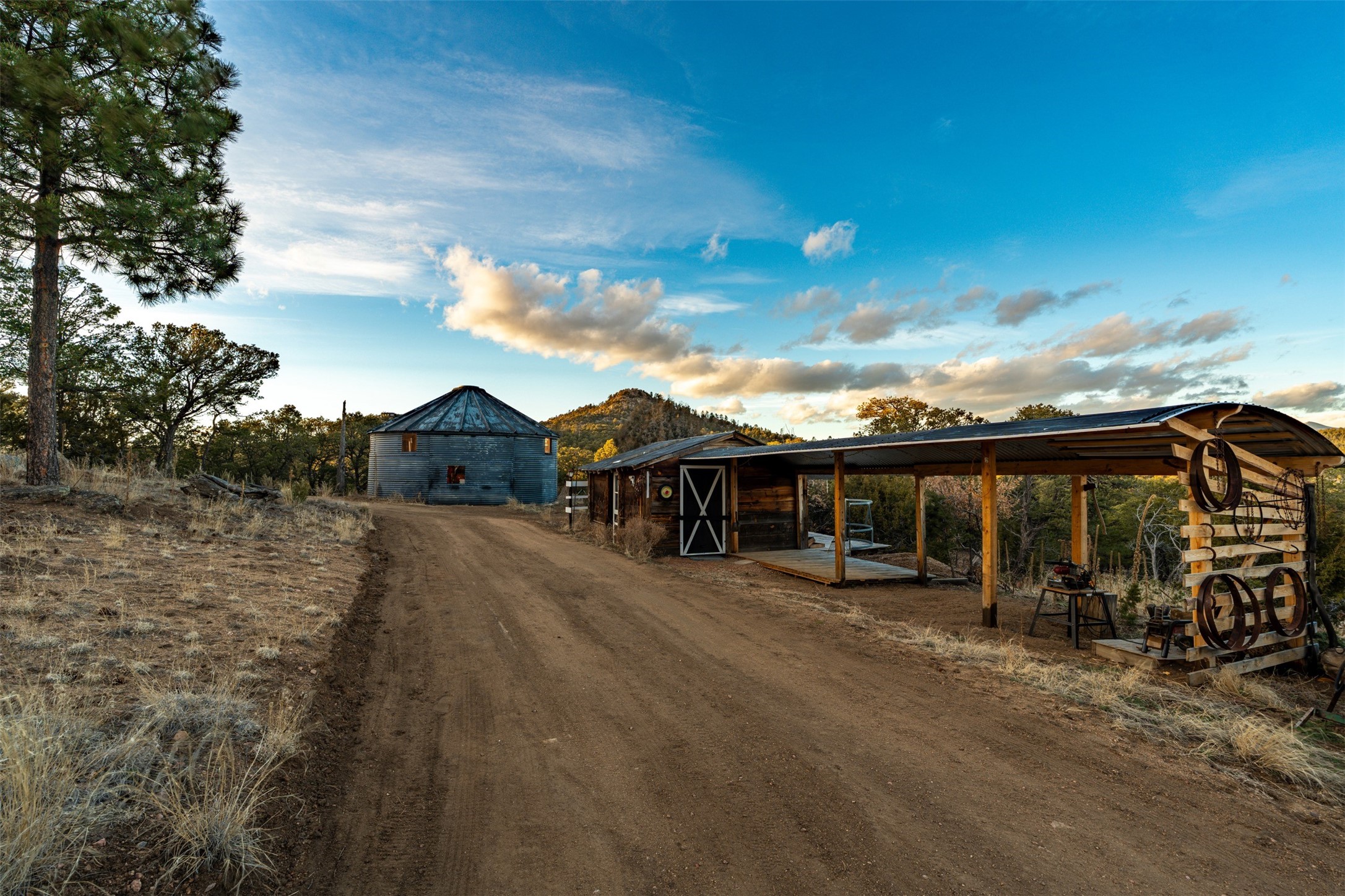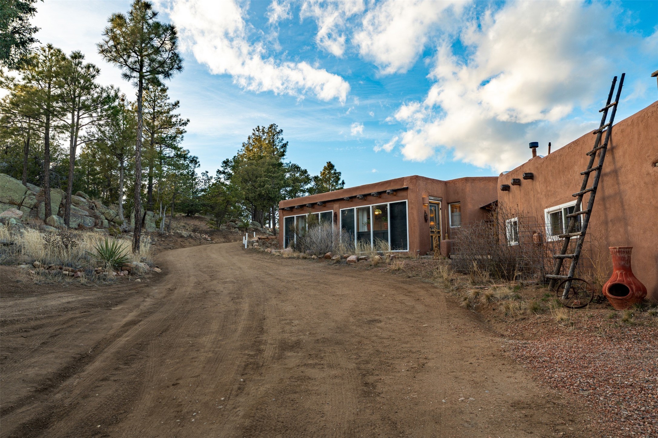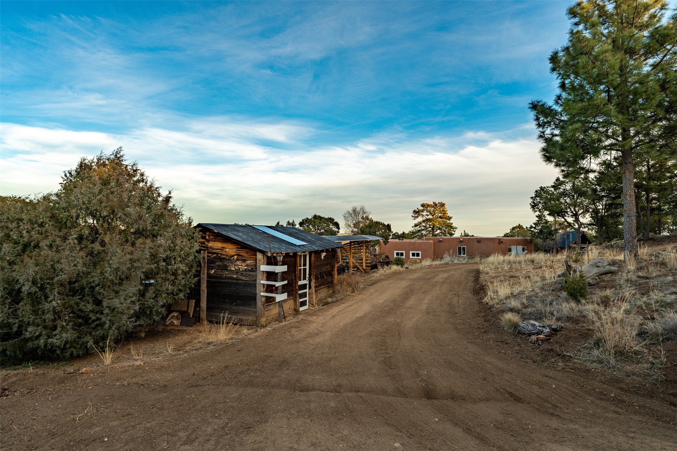 Perched along the historic Old Santa Fe Trail at approximately 7,777 feet in elevation, this hilltop residence spans ten peaceful acres with sweeping high desert views in every direction. Expansive skies, mature trees, and a wraparound vantage point create unforgettable sunsets and panoramic scenery from the elevated deck.The three bedroom, two and one half bath home has been carefully maintained and thoughtfully crafted with traditional Southwest character. Exposed vigas, handcrafted wood details, wood burning fireplaces, and generous windows invite warmth and natural light throughout the open living, dining, and kitchen areas.A welcoming gathering space near the entry sets the tone for celebrations and relaxed entertaining. A separate studio offers privacy for artistic or professional pursuits. Additional structures include a detached garage with barn and workshop space, plus an auxiliary outbuilding and covered parking area that add flexibility and utility.With approximately 3,000 square feet of living space, the floor plan offers the possibility of creating two distinct one bedroom living quarters, opening the door to income potential or comfortable guest accommodations. The land is served by a private well and septic system and may be split into two five acre parcels, providing future options.Surrounded by trails for hiking and cycling, yet only minutes from the Plaza, dining, and cultural destinations, this property offers both seclusion and accessibility. Equipment such as a tractor, implements, generator, and many operational tools related to the upkeep of the land may be available by separate consideration.This is an opportunity for the next steward to continue its legacy. Culmination of ownership is desired, expressions of interest are invited, all reasonable inquiries and sincere offers entertained.