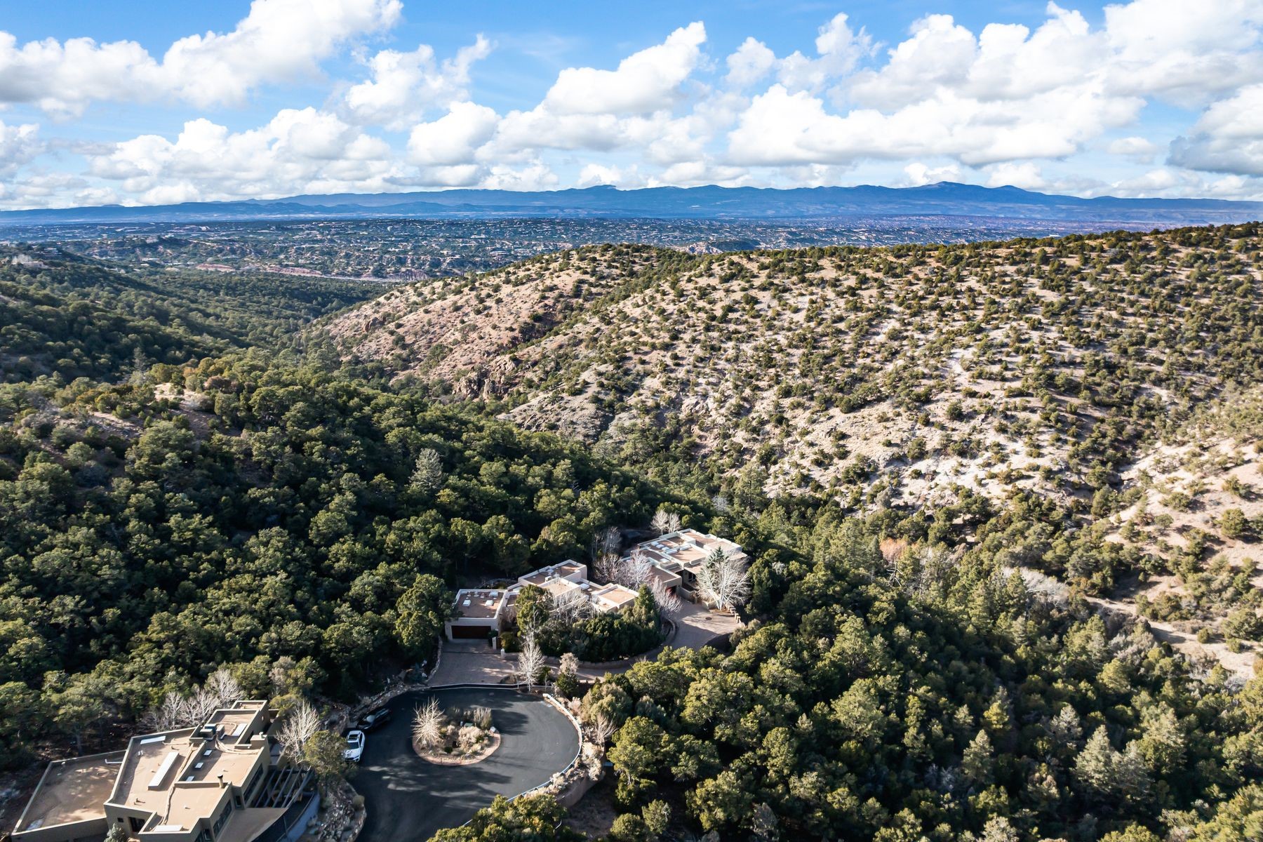 Tranquility and architectural grace define this polished, 3-bedroom, 2.5 bath residence on a quiet cul-de-sac in gated Santa Fe Summit. Step through handcrafted wood doors into the walled front courtyard with fountain and glorious seasonal roses. Inside, robust beams with splendid corbels and a floor-to-ceiling gas kiva add grandeur to the well-proportioned Great Room. The kitchen offers all stainless appliances, including a newer fridge, gas range and double-oven, plus granite counters, a tumbled marble backsplash and an operable window overlooking the backyard's mature pines and lichen-dappled rock work. A private den/office with exterior access introduces the Primary Suite. This true retreat features new wood flooring, soft natural light, and a professionally designed and remodeled en-suite bathroom with dual-vanity, quartzite counters, custom cabinetry, and a spacious walk-in shower. In the well-separated Guest Wing are two additional bedrooms, with newly installed wood floors, and a shared, full bathroom. Recent upgrades include 4 mini-splits for cooling, newer stucco (2022), a 2025 silicone coating on the 2019 roof, and a Navien Heating System (2023). Back yard is fully enclosed. The attached two-car garage is direct access. Enjoy sophisticated living in a refined mountain setting, minutes from the Ski Basin and Santa Fe's historic downtown.