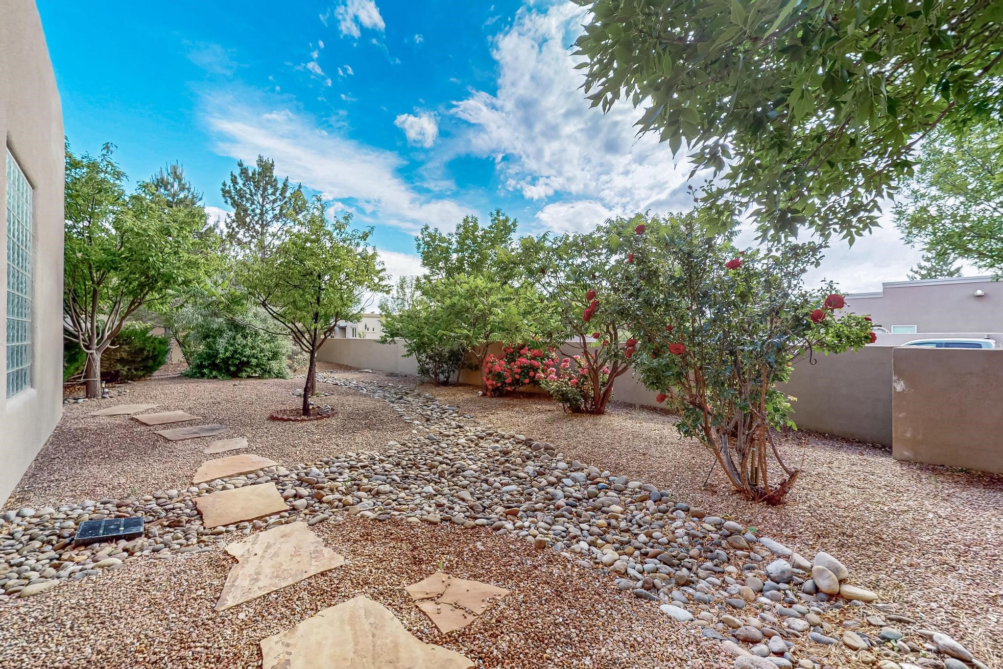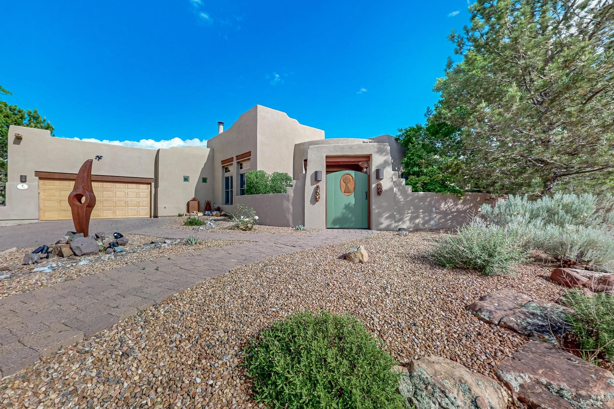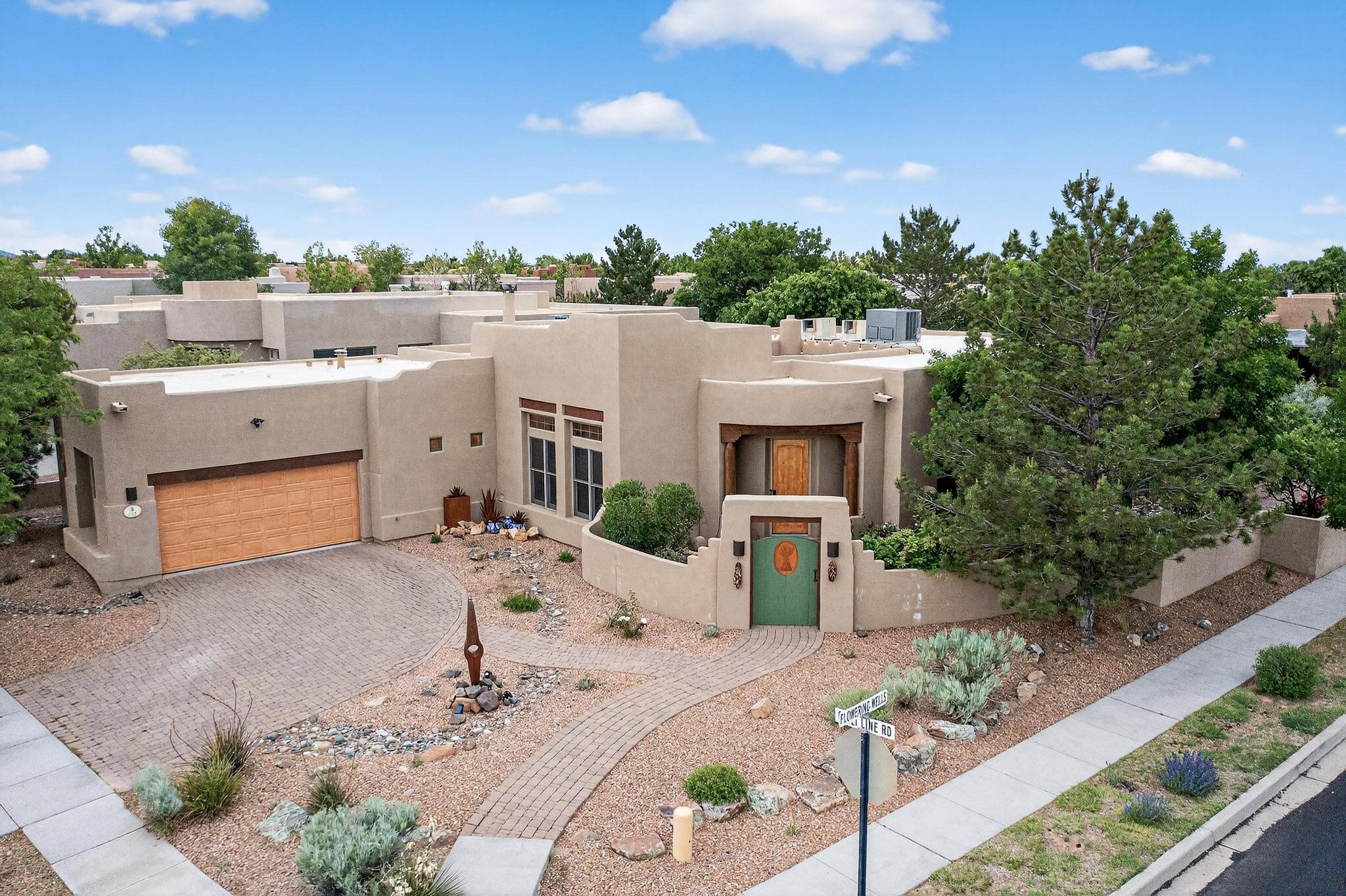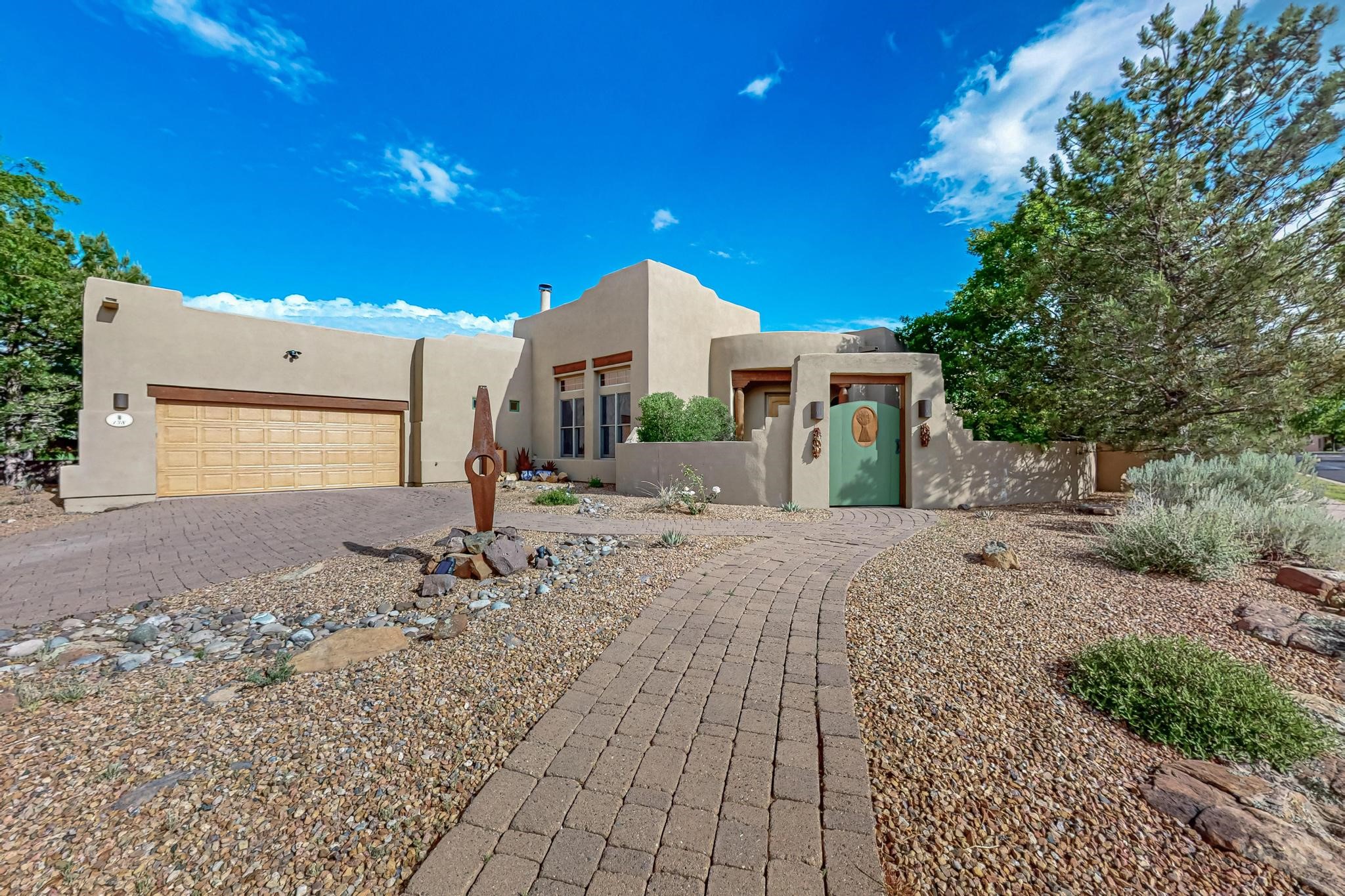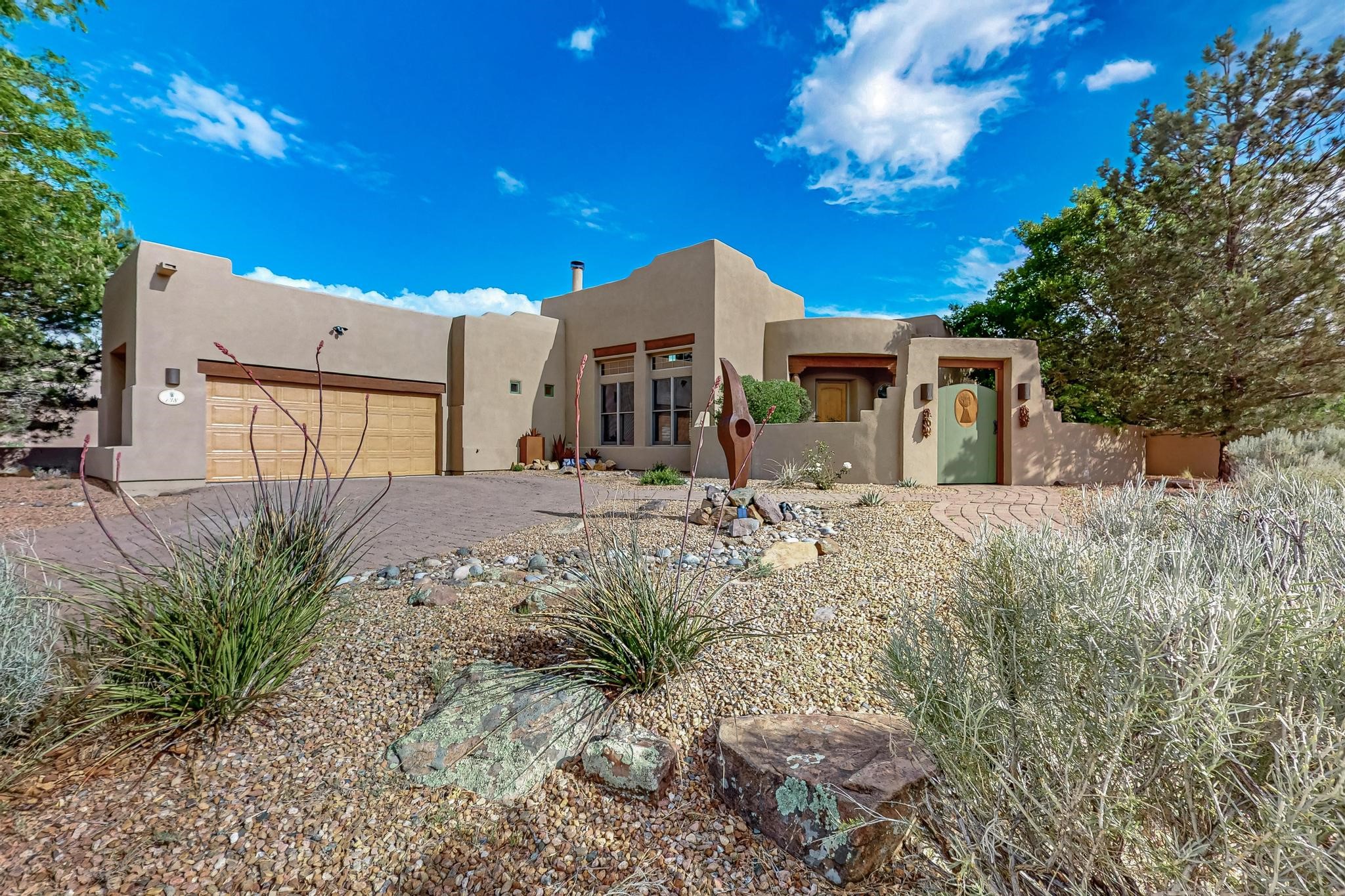 This stunning home in the highly desirable Rancho Viejo community is truly something special! Formerly a Parade of Homes model, this unique floor plan is one of only a few in the neighborhood. From the moment you walk in, you're welcomed by a warm foyer with carved vigas that opens into a breathtaking living space. Soaring 14-foot tongue-and-groove ceilings, exposed beams, a built-in bookcase, and a classic kiva fireplace create an inviting atmosphere filled with natural light from expansive windows. The entire interior was freshly painted in 2023, giving the home a clean, updated feel. The chef's kitchen is as functional as it is beautiful, featuring high-end appliances, dual convection ovens, and easy access to outdoor living spaces--perfect for entertaining. At the center of the home, you'll find a peaceful flagstone patio with its own kiva fireplace, accessible from four different doors. It's the perfect setup for gatherings, relaxing evenings, or simply enjoying the New Mexico sunshine. Comfort and efficiency shine here, too. Two zoned combo heating and cooling systems (installed in 2023), smart thermostats, and radiant heated floors throughout the entire home ensure year-round comfort. You'll also love the whole-house built-in audio system, Tesla charging station, and custom solid wood doors that add warmth and authenticity to every space. The exterior stucco was replaced in 2021, bedroom flooring has been recently upgraded, and the home features a built-in rainwater collection system with an underground cistern, water pump, and spout--thoughtfully designed for sustainability.A private office tucked away near the primary suite offers built-in cabinetry and shelving, making it ideal for remote work or creative projects. And don't miss the rear patio--complete with a kiva fireplace, gas line ready for your grill, and beautiful viga-accented tongue-and-groove ceilings--extending the home's Southwestern charm outdoors.