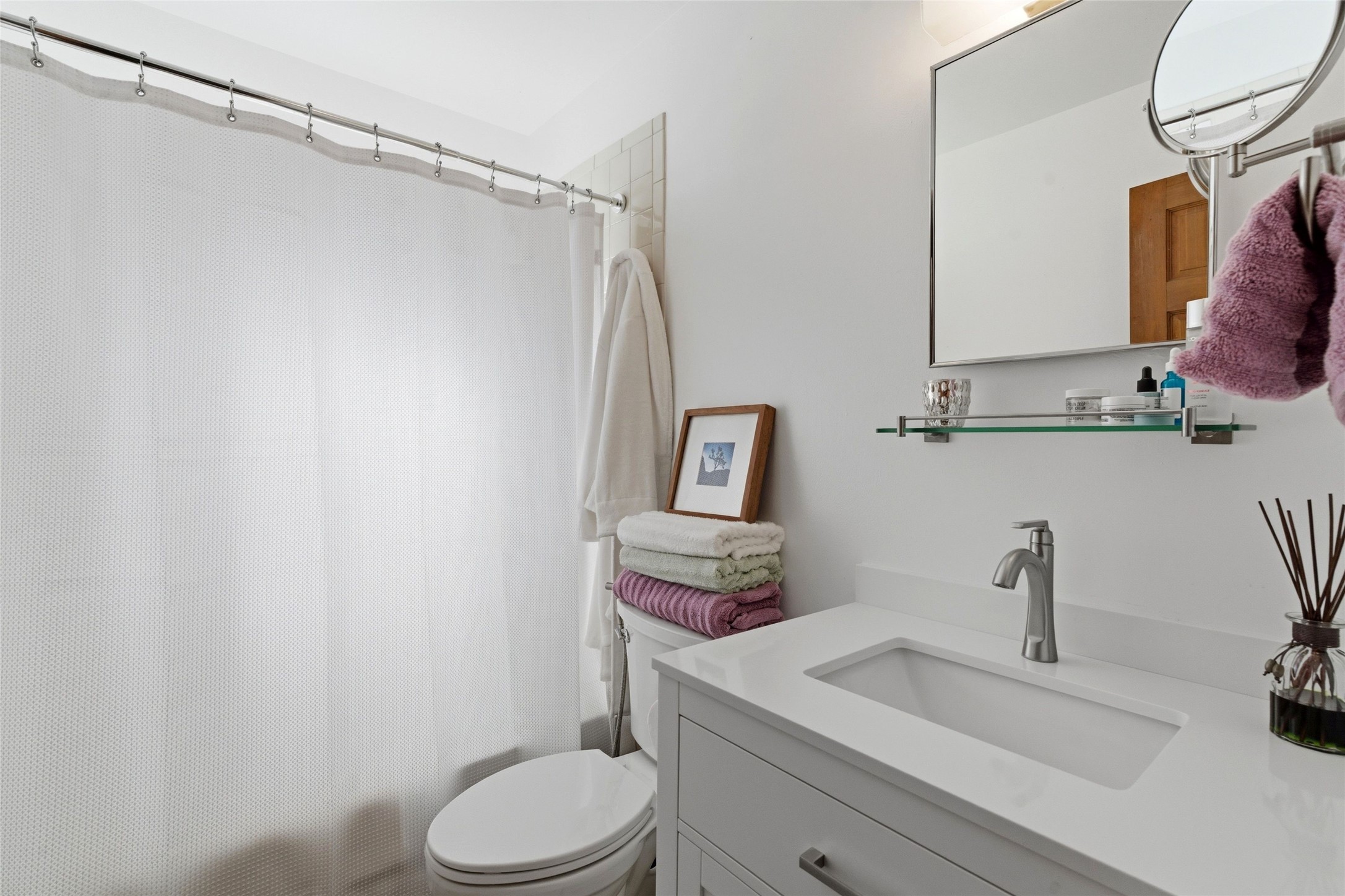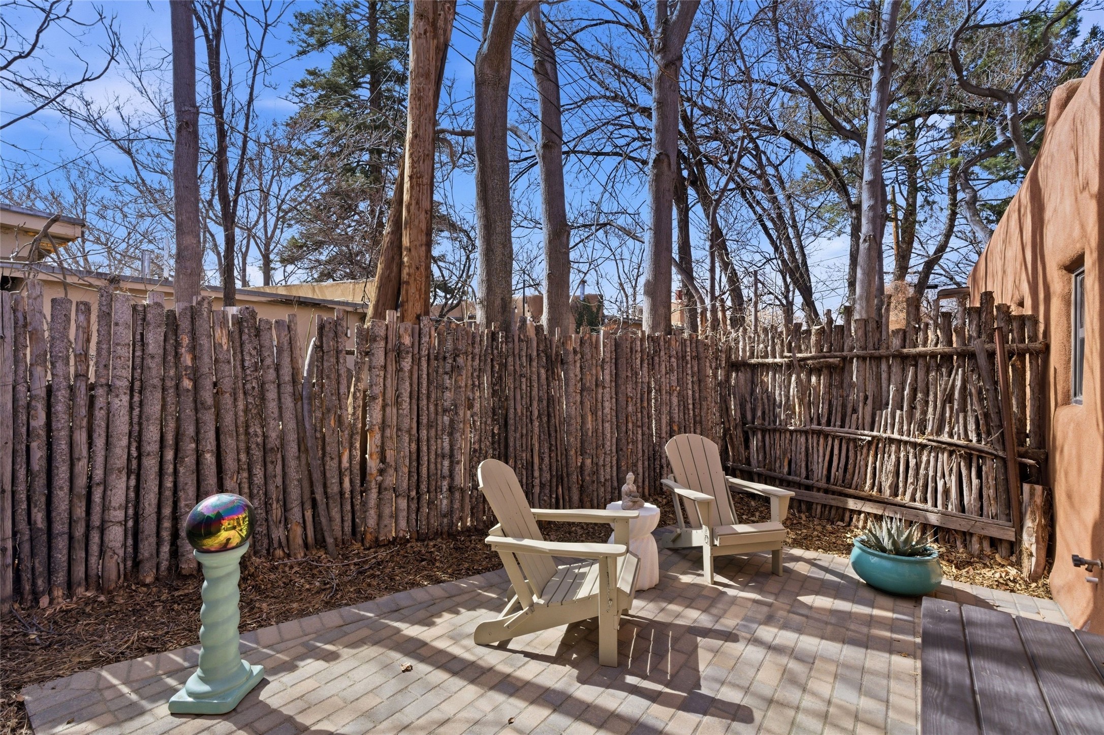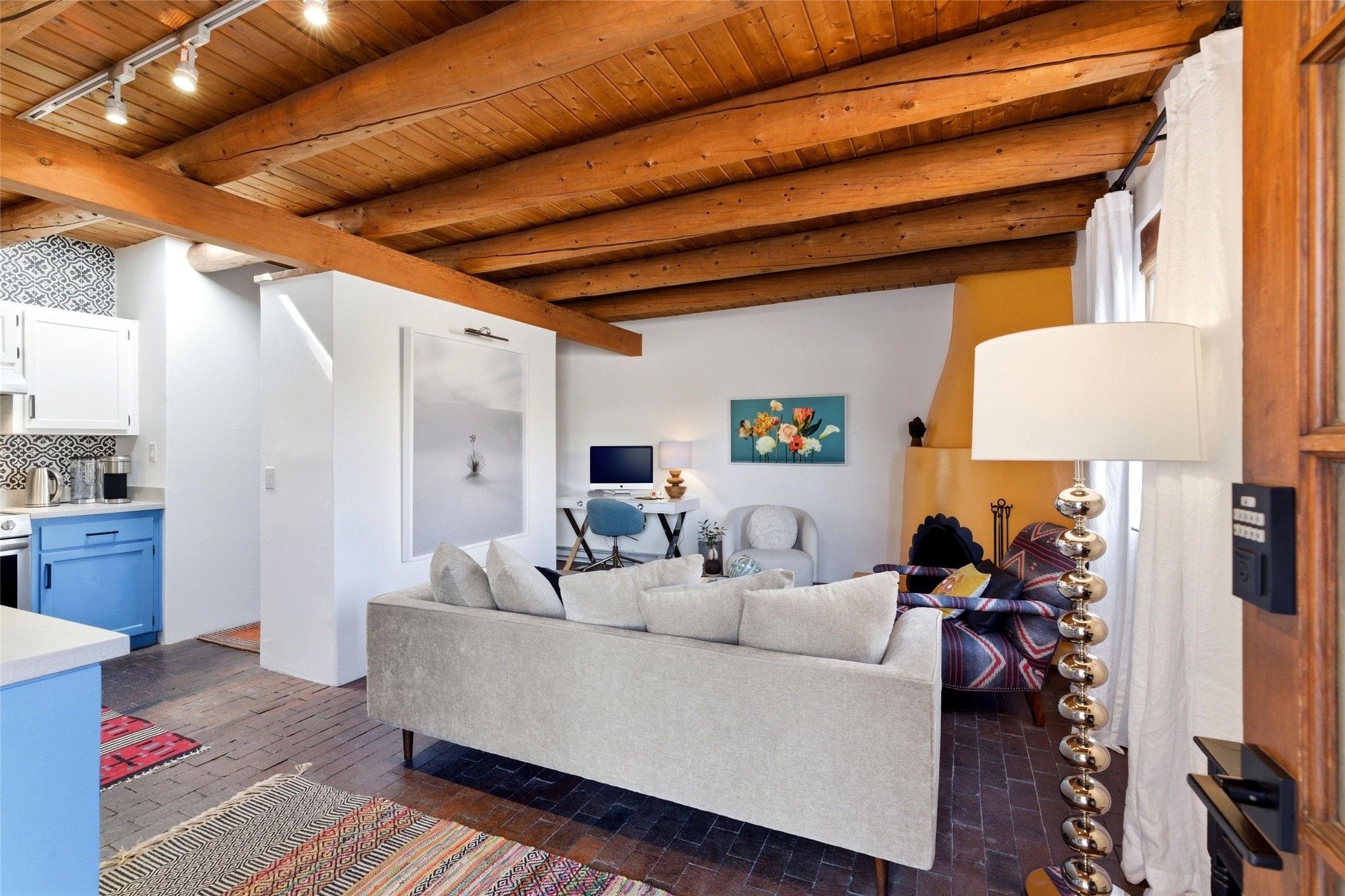 Cheerful, updated South Capitol 1-bedroom, 1-bath condo with a private, shaded courtyard. Whether as a primary residence, a stylish pied--terre, or a potential investment in a sought-after central district, this property represents an opportunity to enjoy the Santa Fe lifestyle. Single level; no interior steps. Iconic Santa Fe touches with wood beamed ceilings, kiva fireplace, and brick floors. Newly renovated kitchen with stainless steel appliances. Bonuses are one designated parking space, deluxe washer/dryer, and a Samsung Frame TV that transforms into a digital art display. Perfect location, close proximity to everything including the Railyard, Canyon Road and the Plaza.