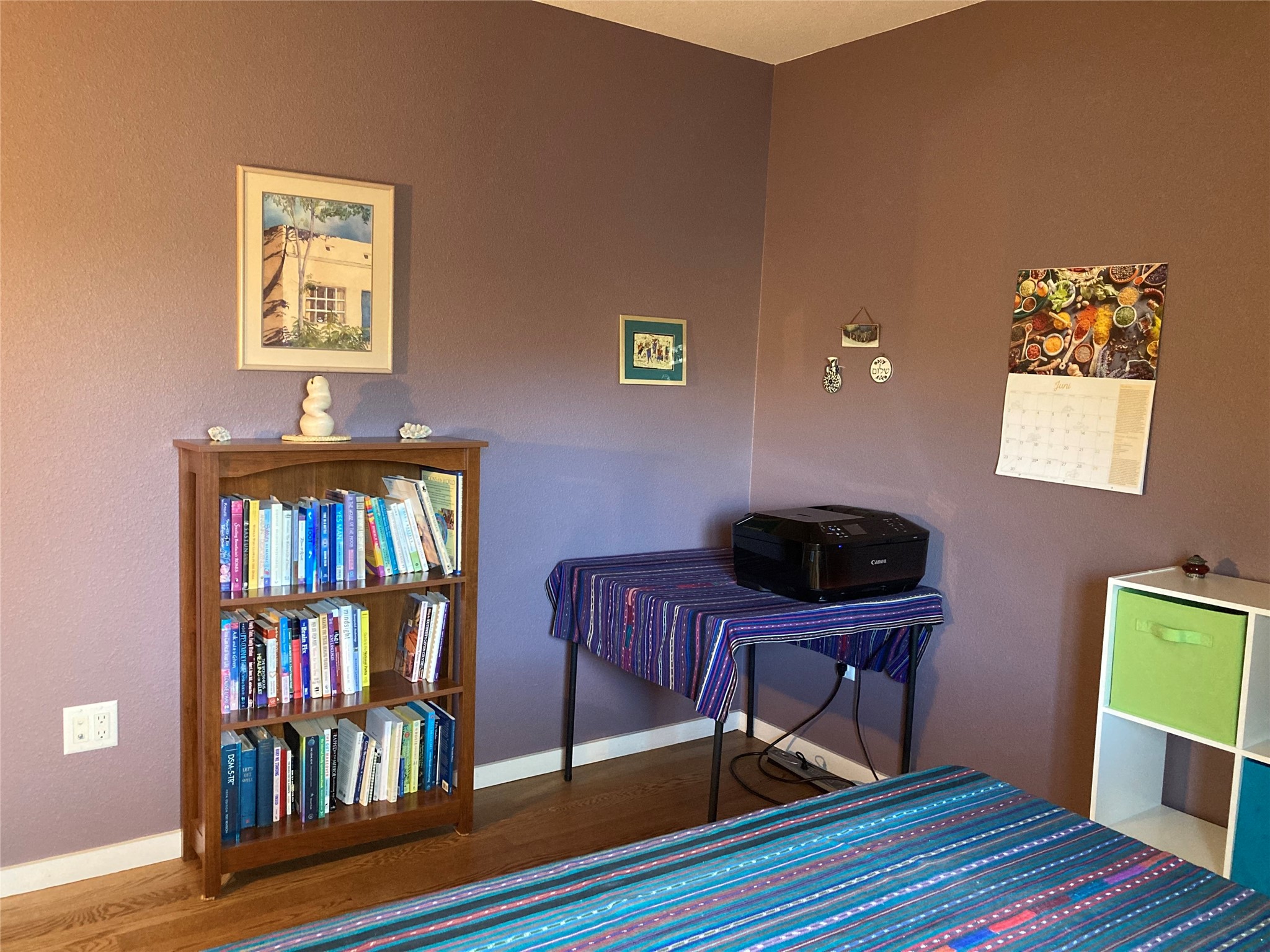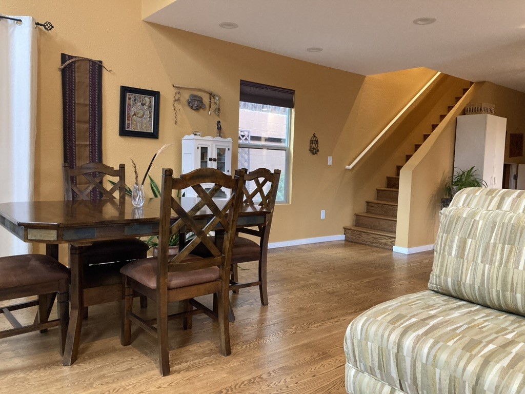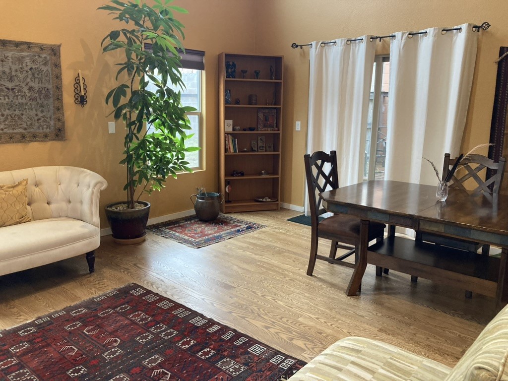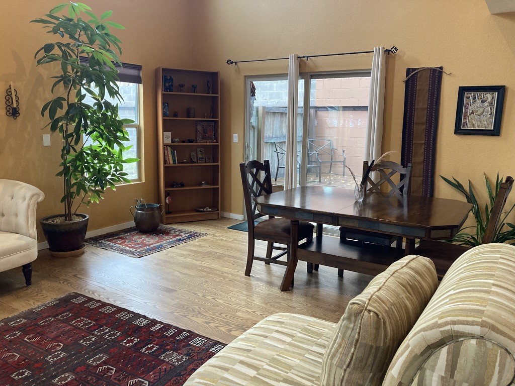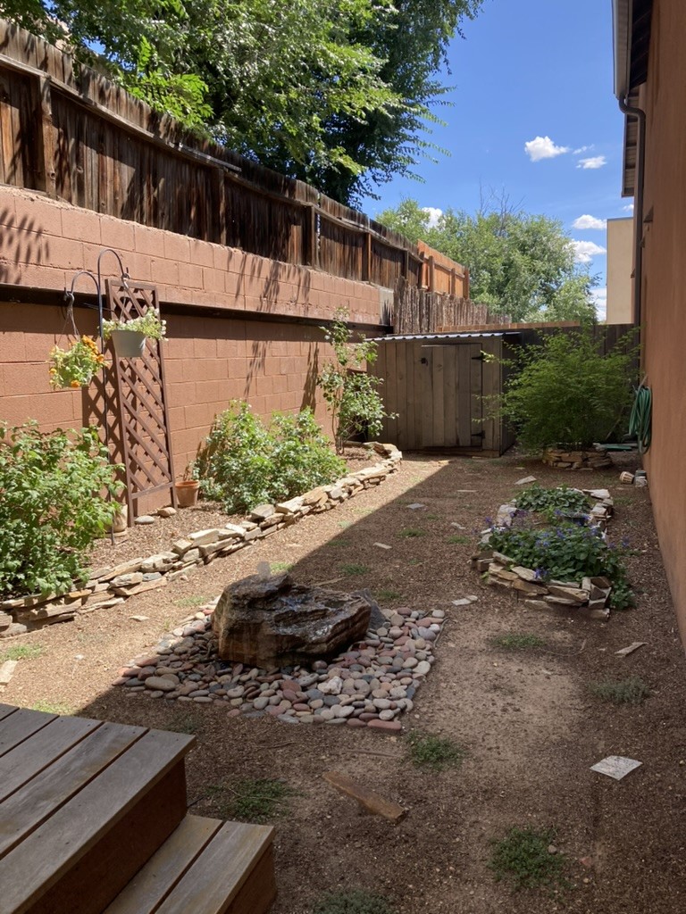 Discover an exceptional blend of comfort, style, and location at this beautifully upgraded 4 bed, 2 bath residence in River Trail Lofts. With direct access to the Santa Fe River Trail from your front door, this lightly used 1,877+/- sq ft home offers bright, inviting living spaces and a thoughtful two-story layout. Interior features include radiant heat, real red oak flooring, high and vaulted ceilings, deep closets, upgraded kitchen appliances, ceiling fans, and top down bottom up cellular blinds throughout. The kitchen and baths feature padded gym flooring for added comfort, with tile in the laundry room. The private backyard has been transformed into a serene outdoor retreat with a custom hardwood deck, fountain, custom storage shed, flower beds, new ground coverings, shrubs, and automated irrigation. It feels like a true extension of the living space and works well for quiet enjoyment or outdoor dining. Ample parking adds to the convenience. River Trail Lofts is tucked below Alameda with no through street, offering a peaceful setting with minimal traffic while still being minutes from downtown, the Railyard, shopping, and the airport.