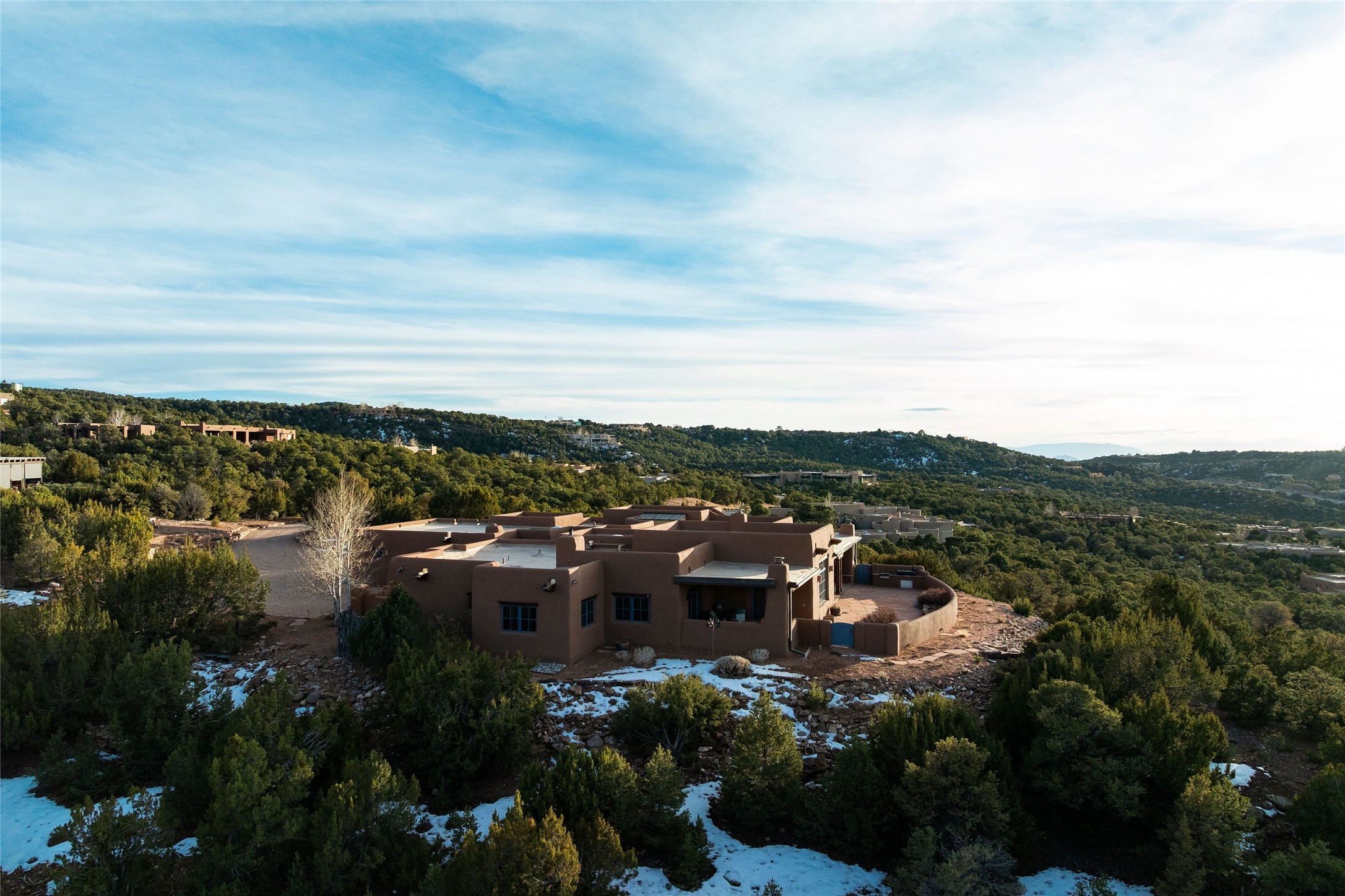 Tesuque 3-bedroom, 6-bath exceptional residence in Bishop's Lodge Hills celebrates the collaboration between acclaimed architect Ed Boniface and master builder Will Prull. Sited on 2.26 acres to capture dramatic views of the surrounding mountains. Single level; no interior stairs. Iconic traditional design features include vigas and beams, nichos, 4 kiva fireplaces, brick and tile floors and multiple patios and portales. Upon entering the foyer, guests are enveloped in a space inspired by the sacred geometry of a Navajo Hogan, setting the tone for the rich architectural heritage woven throughout the home. The grand living room with its soaring beamed ceilings, hand-carved corbels and a striking fireplace design serves as a warm and welcoming focal point. An elegant formal dining room opens to the grand portal which offers extended space for al fresco dining and entertaining. Gourmet kitchen is appointed with antiqued custom cabinetry, custom carved backsplashes, Viking appliances, and a black walnut-topped center island with prep sink. This home is smartly divided into 2 spacious wings. In the primary wing, owners will appreciate the luxurious primary suite with kiva fireplace, two spa-like baths and two walk-in closets. In addition, there is a handsome office with a built-in desk and bookcases. In the opposite wing, 2 guest bedrooms provide privacy for visitors. Recent improvements include new stucco (2025) and new roof (2024). Conveniently located with easy access to the Santa Fe Ski Basin, Ten Thousand Waves Spa, the Santa Fe Opera and the downtown Plaza.