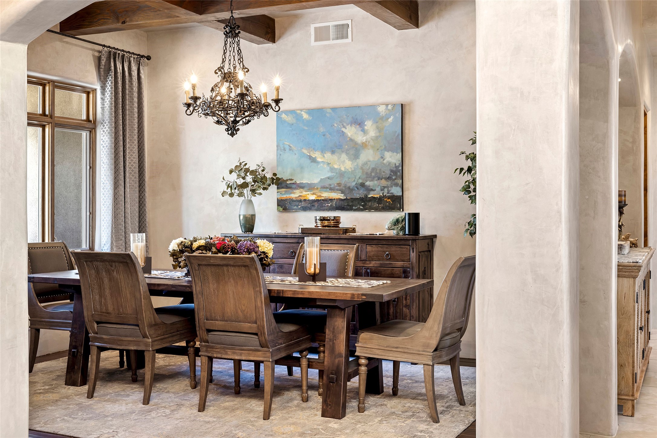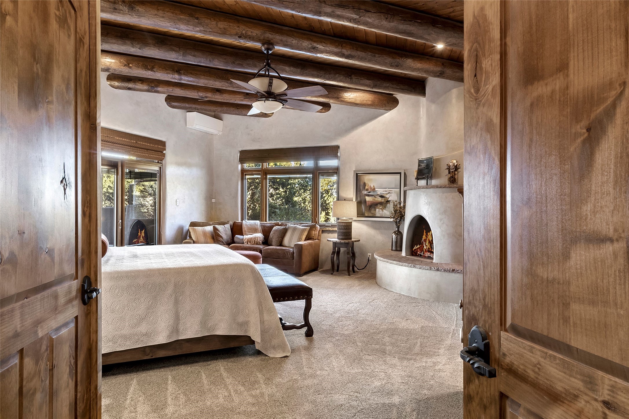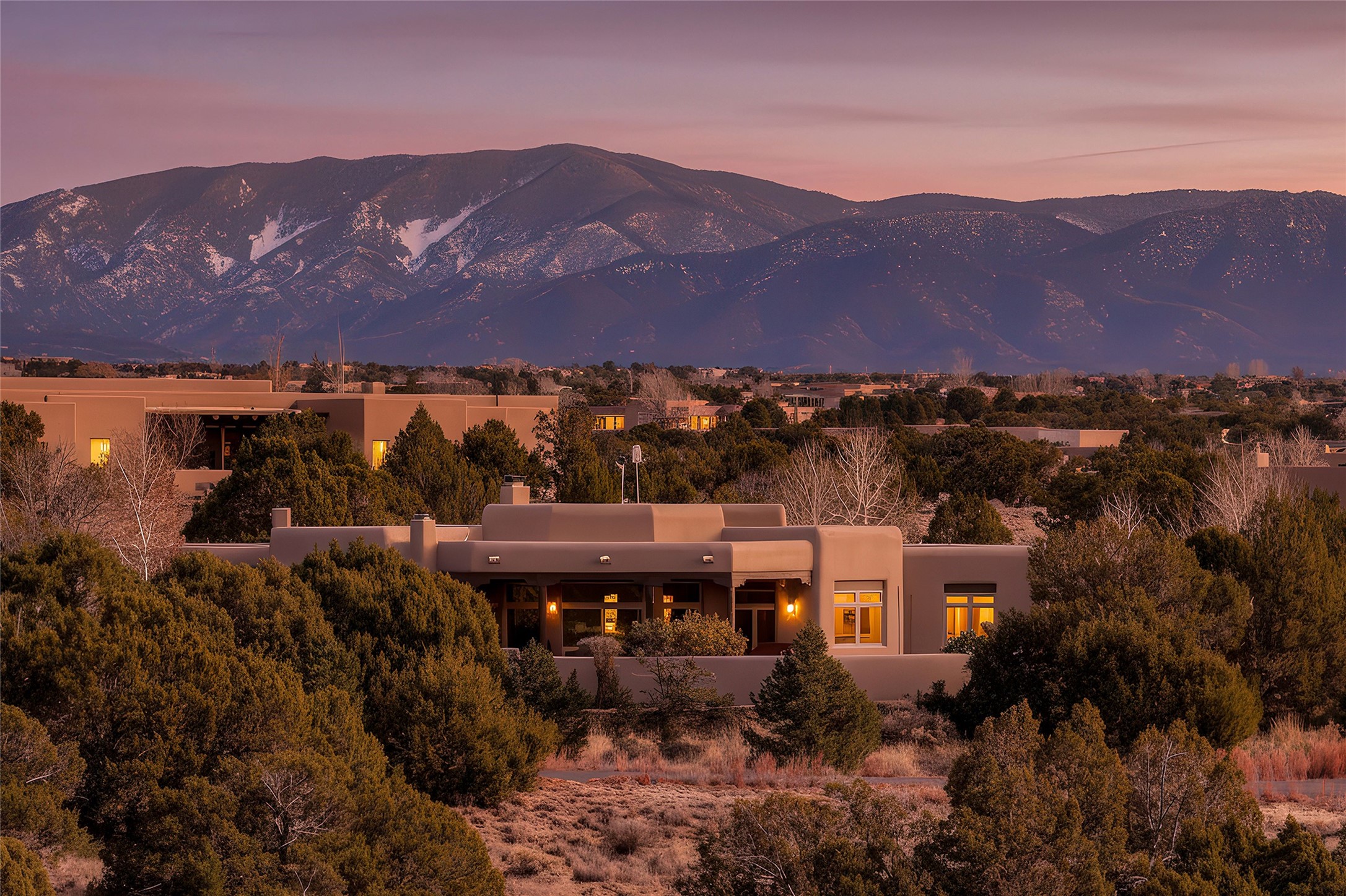 Perched on an elevated lot in Las Campanas, this captivating Santa Fe home celebrates the true essence of high-desert living with panoramic Jemez Mountain and sunset views. Located within the famed community of Las Campanas, 39 Calle Mi Gusto masterfully blends iconic Santa Fe architecture with an open-concept layout designed for seamless indoor-outdoor entertaining. Ideal as a primary residence or an ideal Santa Fe retreat this quality, single level home with four bedrooms, plus an office or media room, impresses with the finest level craftsmanship, flexible use of space and the ultimate indoor and outdoor living experience. Minutes to The Club at Las Campanas, this privately sited home excites with exceptional design features which include a well-appointed chef's kitchen complete with a large granite island, breakfast bar, Wolf and Sub Zero appliances and direct access to the casual dining area and the formal dining room. At the heart of this home is a spacious living room with elevated ceilings, rich beams, a stately fireplace, stunning sunset and mountain views framed by view windows and outdoor access, in addition to a separate den/media room, or ideal office with custom built-in cabinetry. The private owner's suite delights with its own fireplace, portal access, views and a spa-like bath with a separate jetted tub, shower, dual vanities and walk-in closet. Two guest bedrooms with a shared full bath offer excellent privacy and flexible use of space and the fourth bedroom is located in a separate wing of this home with its own bath, walk-in closet and views. Additional highlights include fully enclosed front and back courtyards which are ideal for entertaining, pets and gardening, single-level living with no interior steps, an oversized 2-car garage and quality, neutral finishes throughout. Most furnishings, the owner's equity golf membership to the Club at Las Campanas and the neighboring vacant lot are all negotiable on a separate bill of sale.