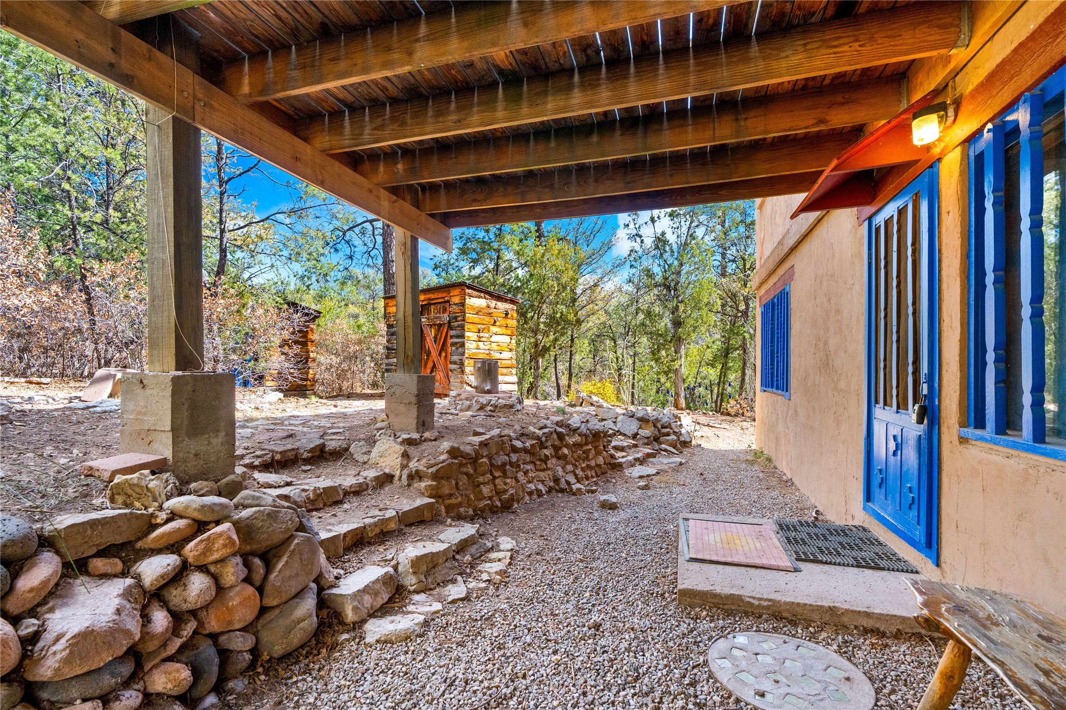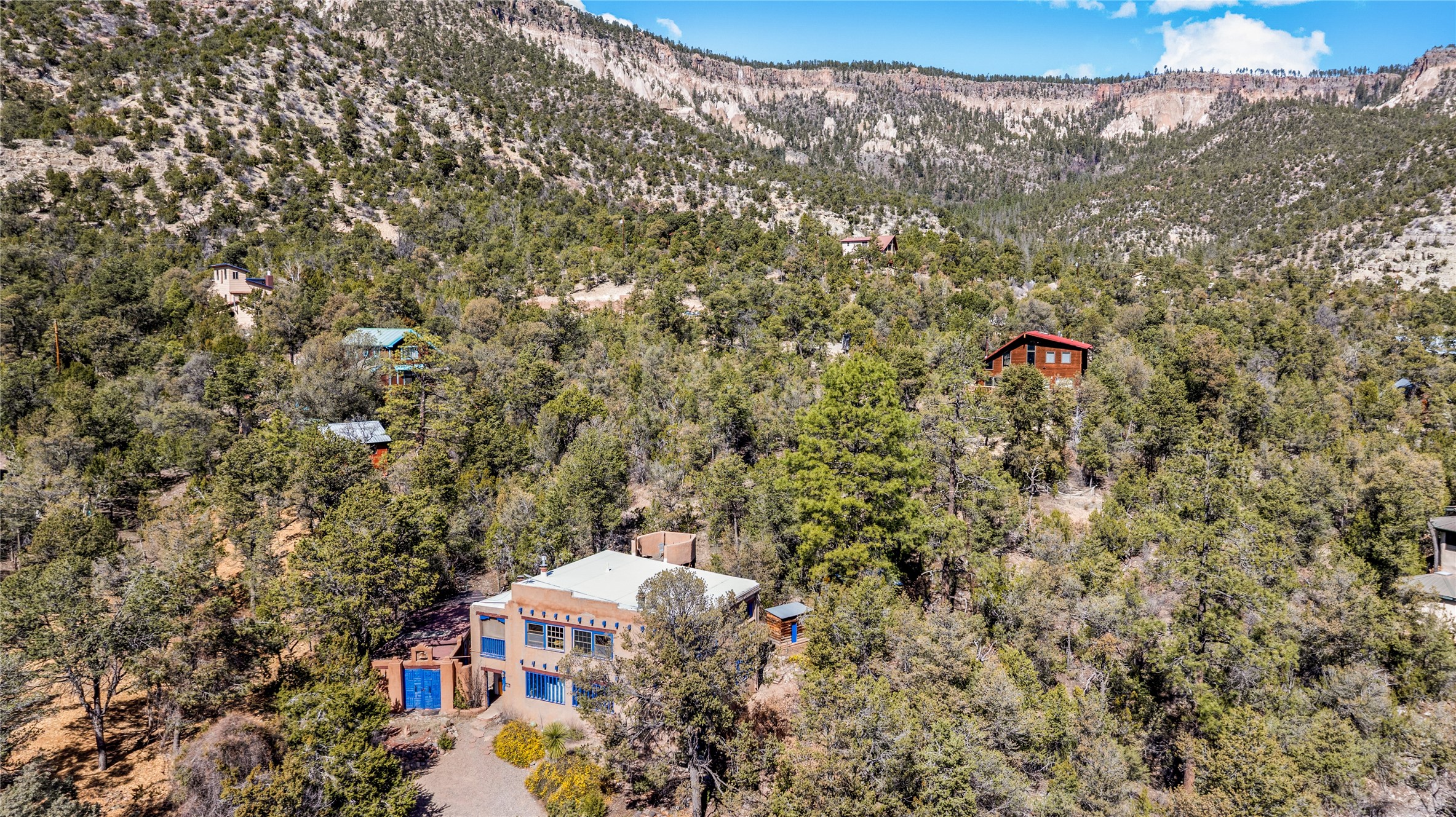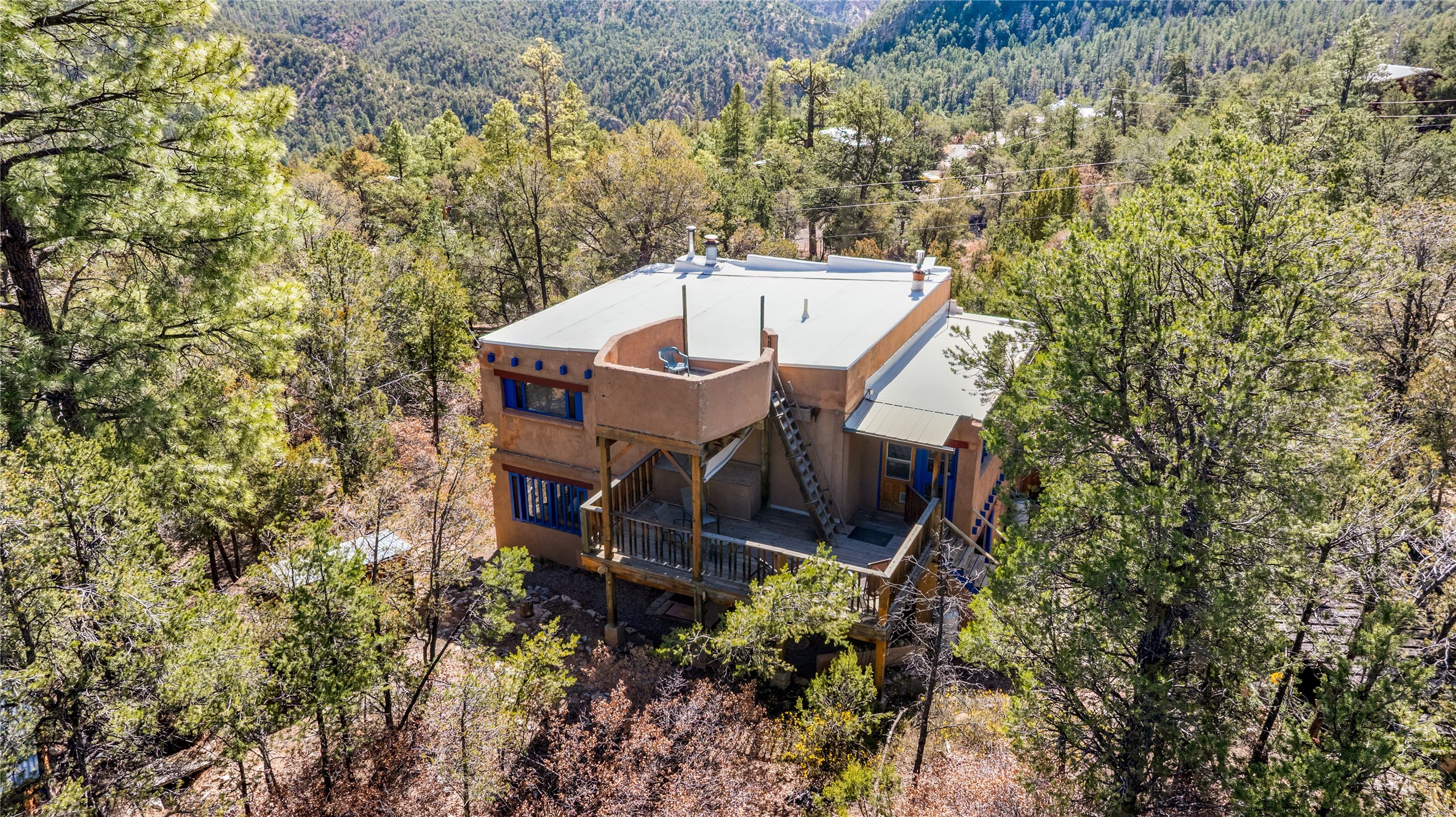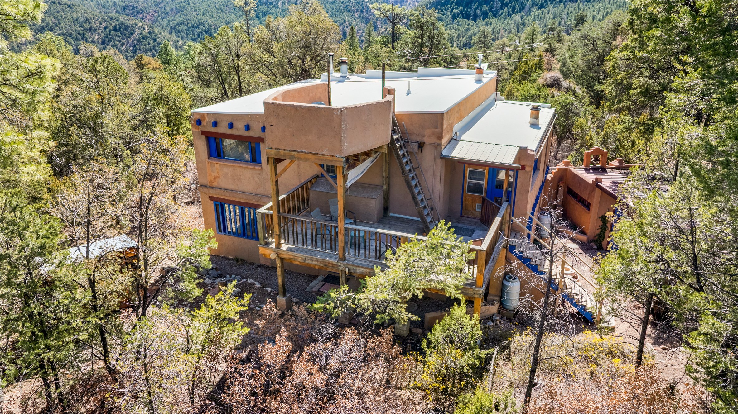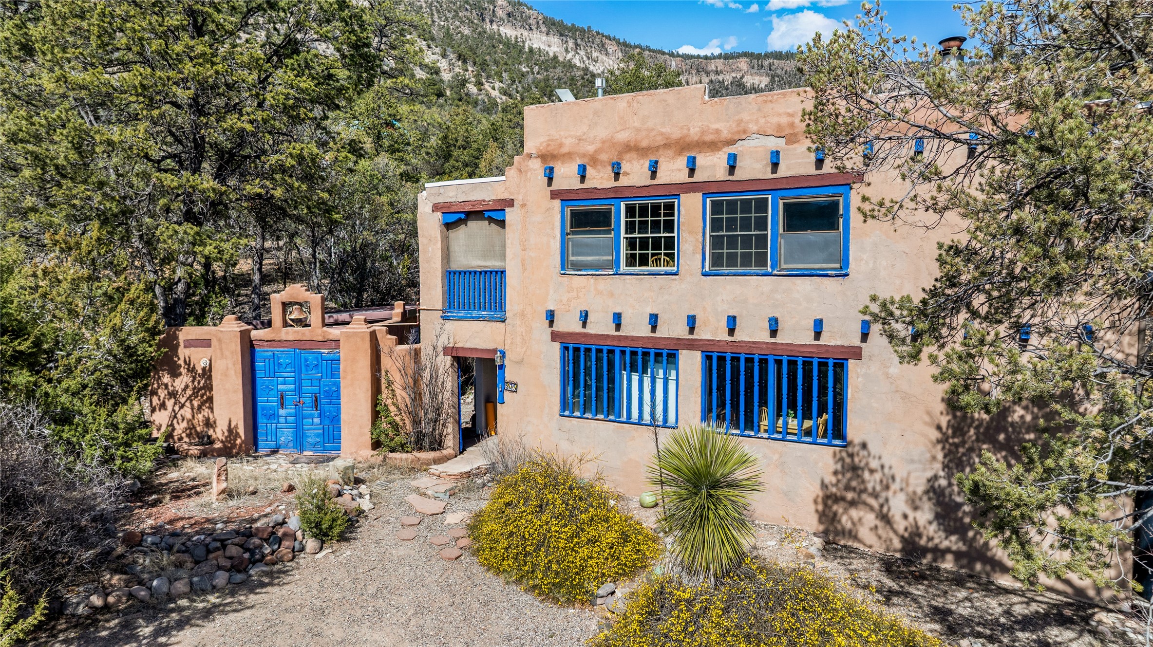 The Sweet Style of Santa Fe...in the Jemez! Just north of Jemez Springs and minutes from Soda Dam, this unique home blends Southwestern charm with proven income potential. Currently operating as a successful Airbnb, it offers a turn-key short-term rental opportunity in one of the most desirable areas of the Jemez. Upper and lower levels each feature their own living space with kitchen. Custom tile work, hand-carved wood doors, and warm Southwestern character throughout. Enjoy mountain views from the partially covered deck or shaded portal. Separate 370 sq ft studio, meditation space, and sand star-gazing platform. Recent upgrades include new propane heaters on both floors, new water heater, electrical grounding upgrades, and stucco repainting in 2025. Most furnishings convey.