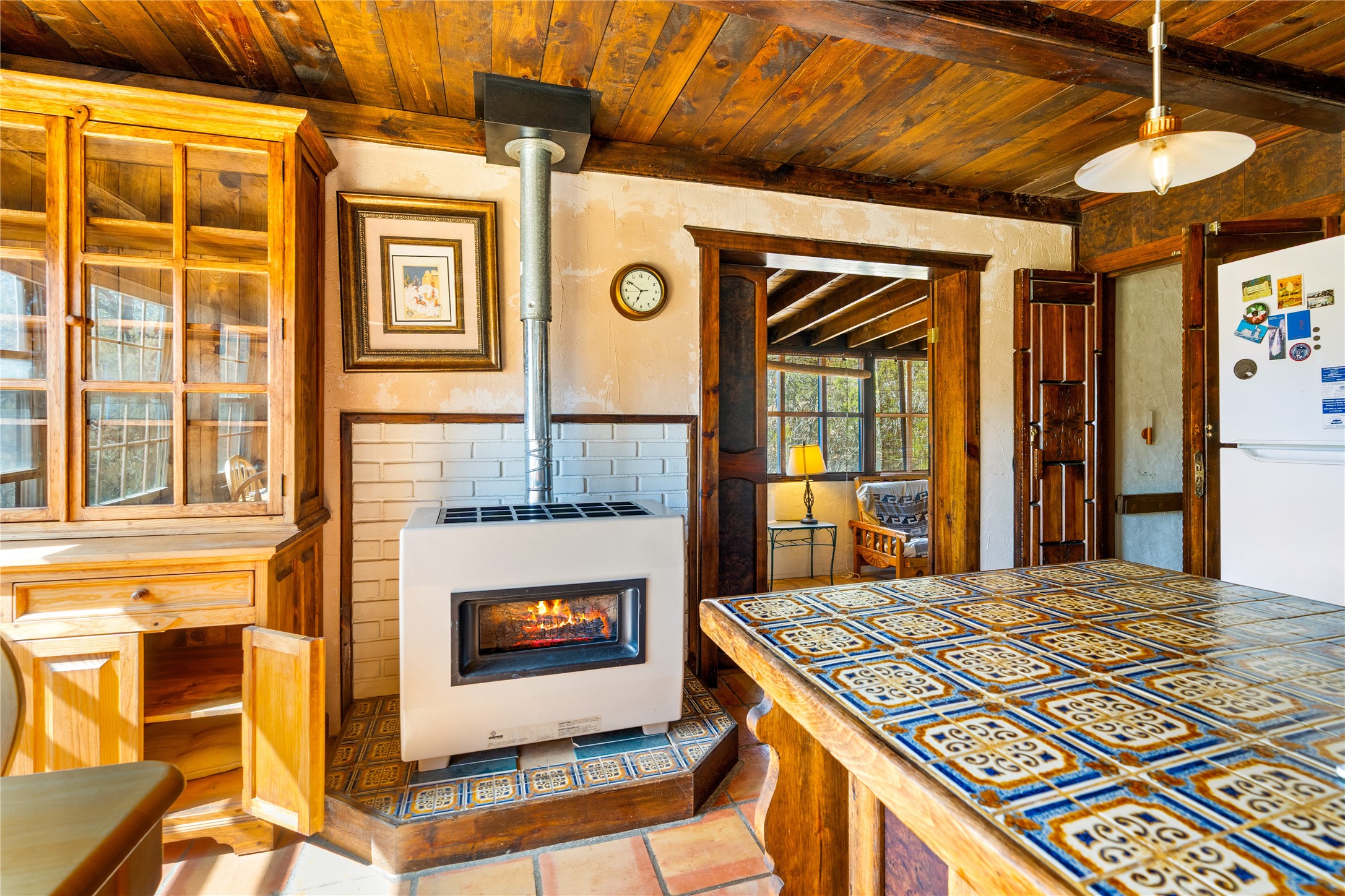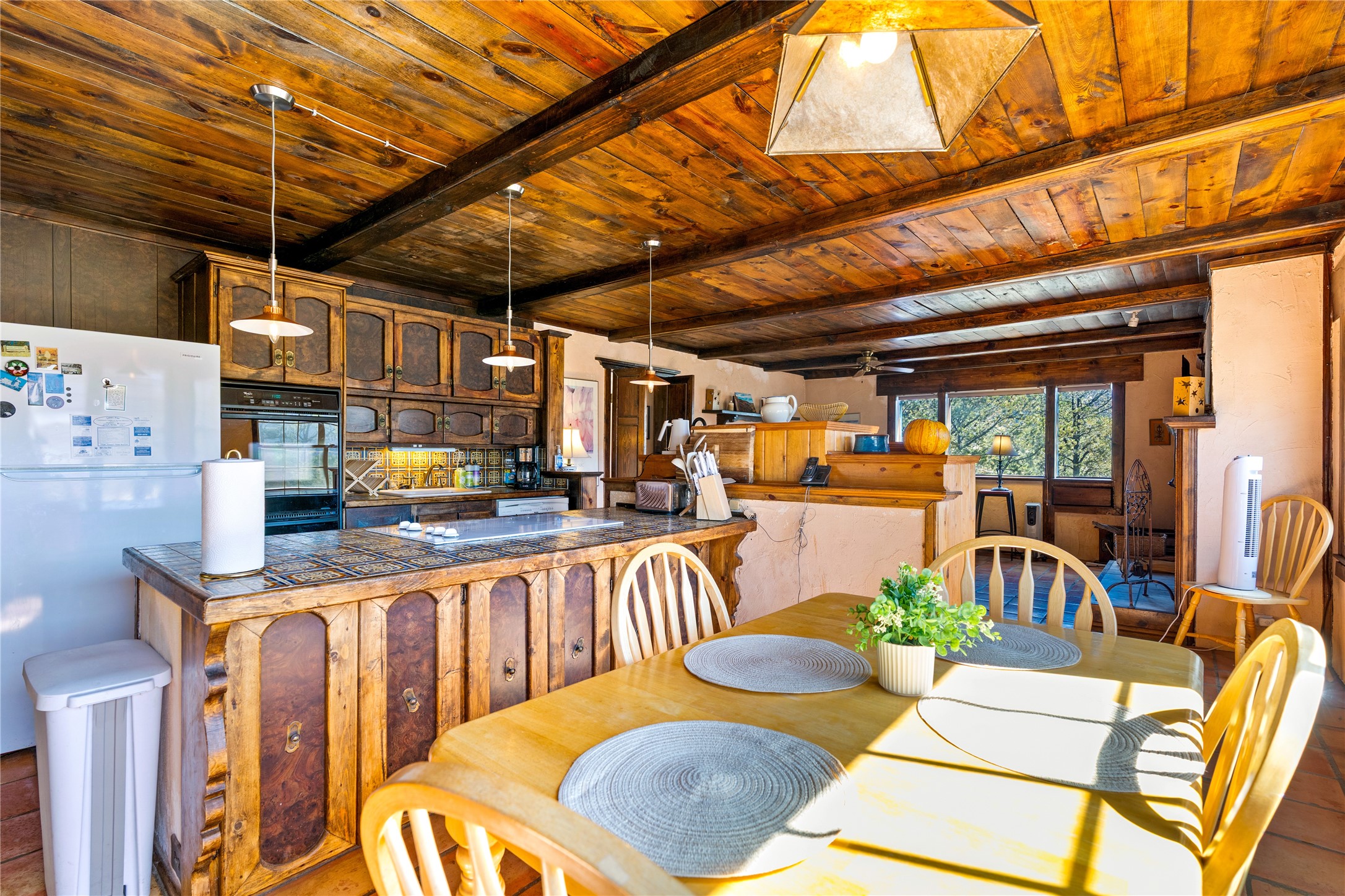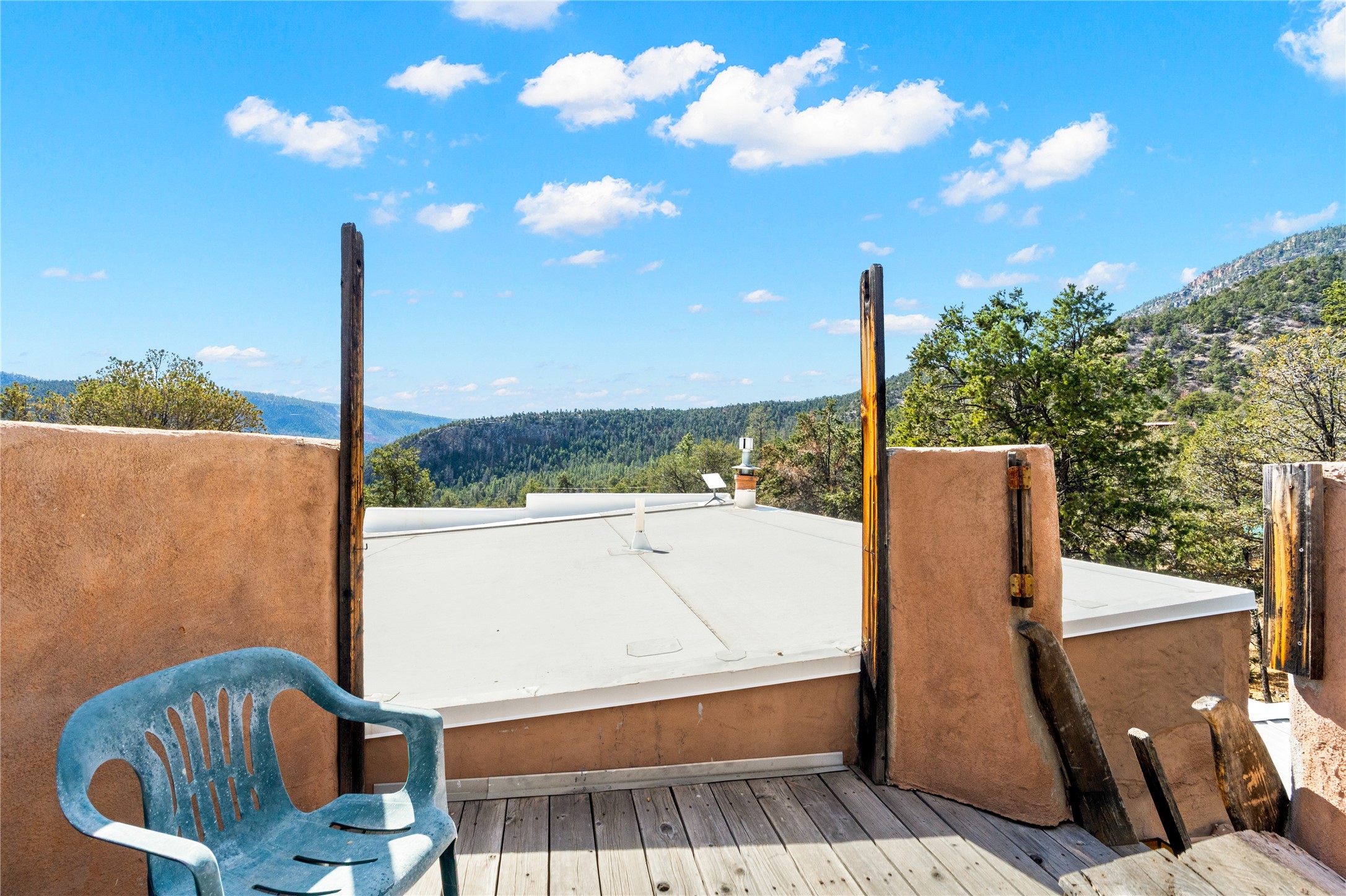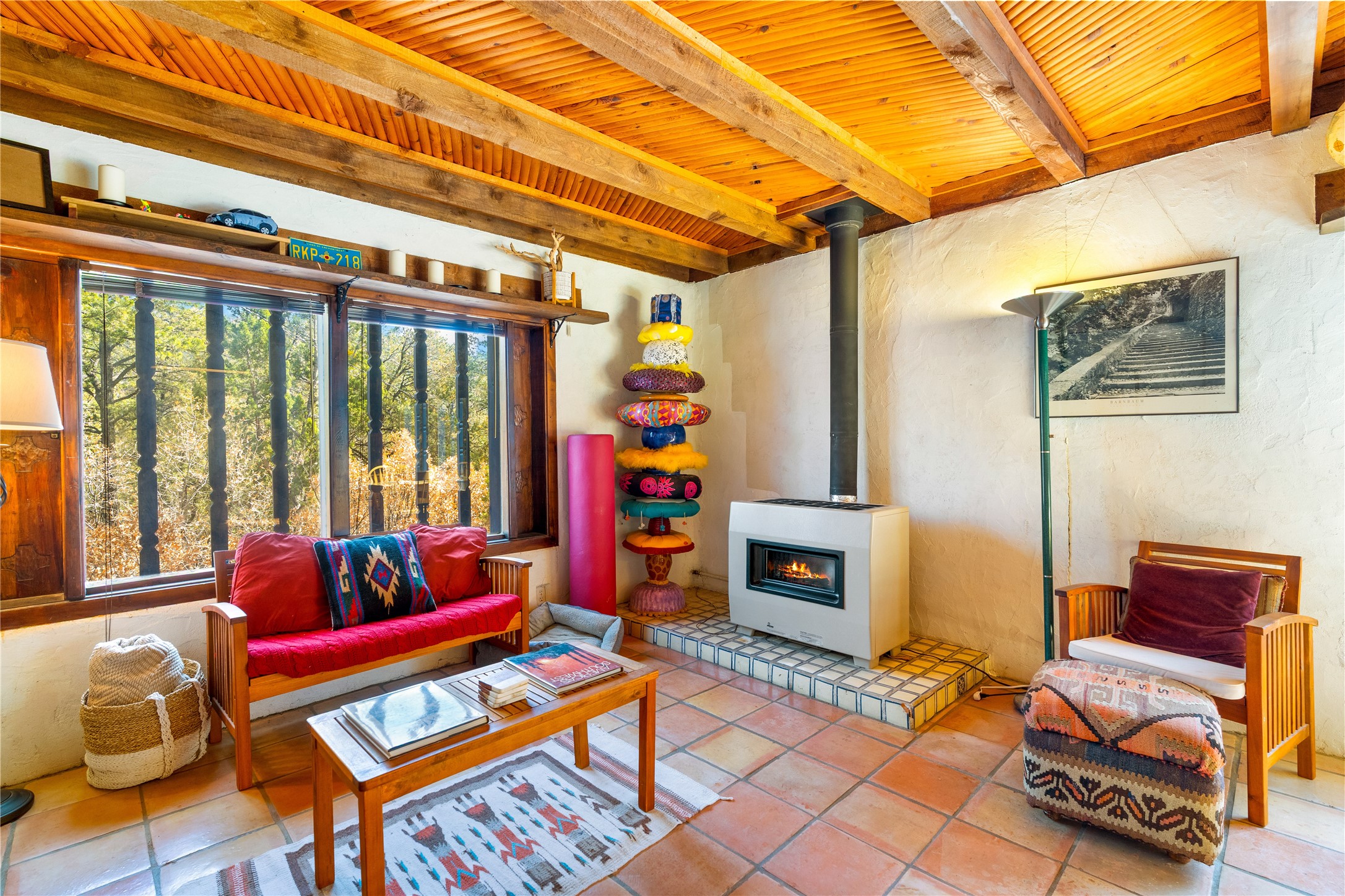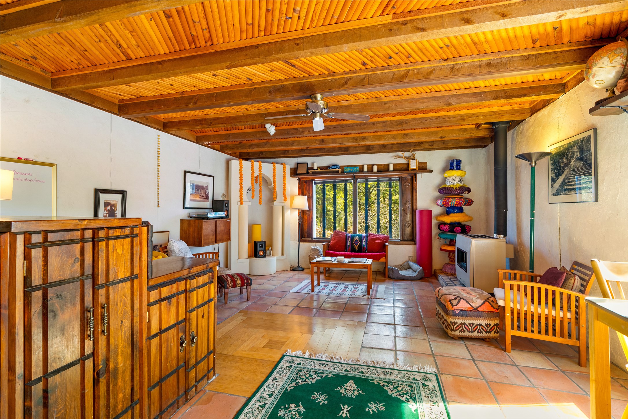 The Sweet Style of Santa Fe...in the Jemez! Just north of Jemez Springs and minutes from Soda Dam, this unique home blends Southwestern charm with proven income potential. Currently operating as a successful Airbnb, it offers a turn-key short-term rental opportunity in one of the most desirable areas of the Jemez. Upper and lower levels each feature their own living space with kitchen. Custom tile work, hand-carved wood doors, and warm Southwestern character throughout. Enjoy mountain views from the partially covered deck or shaded portal. Separate 370 sq ft studio, meditation space, and sand star-gazing platform. Recent upgrades include new propane heaters on both floors, new water heater, electrical grounding upgrades, and stucco repainting in 2025. Most furnishings convey.