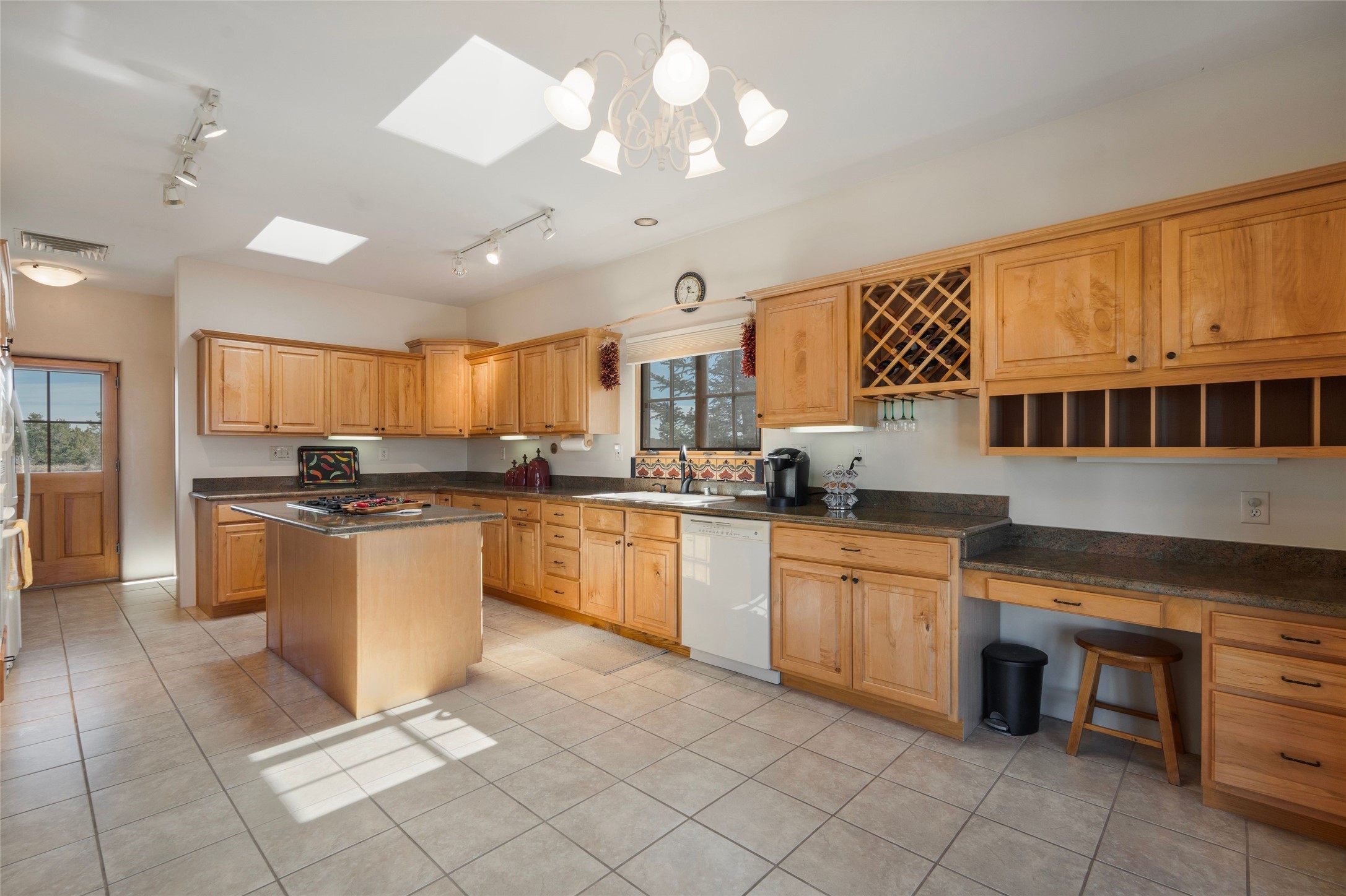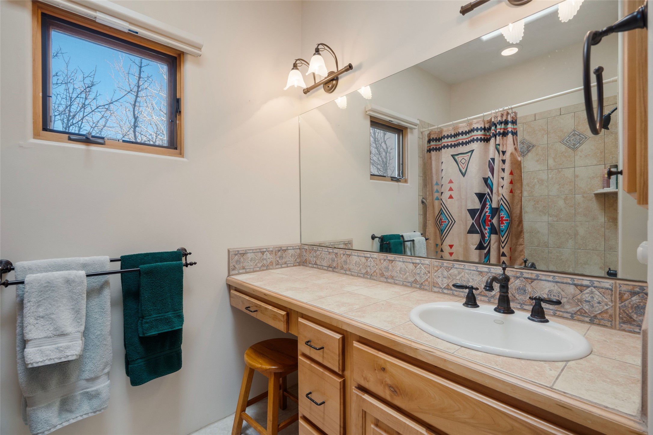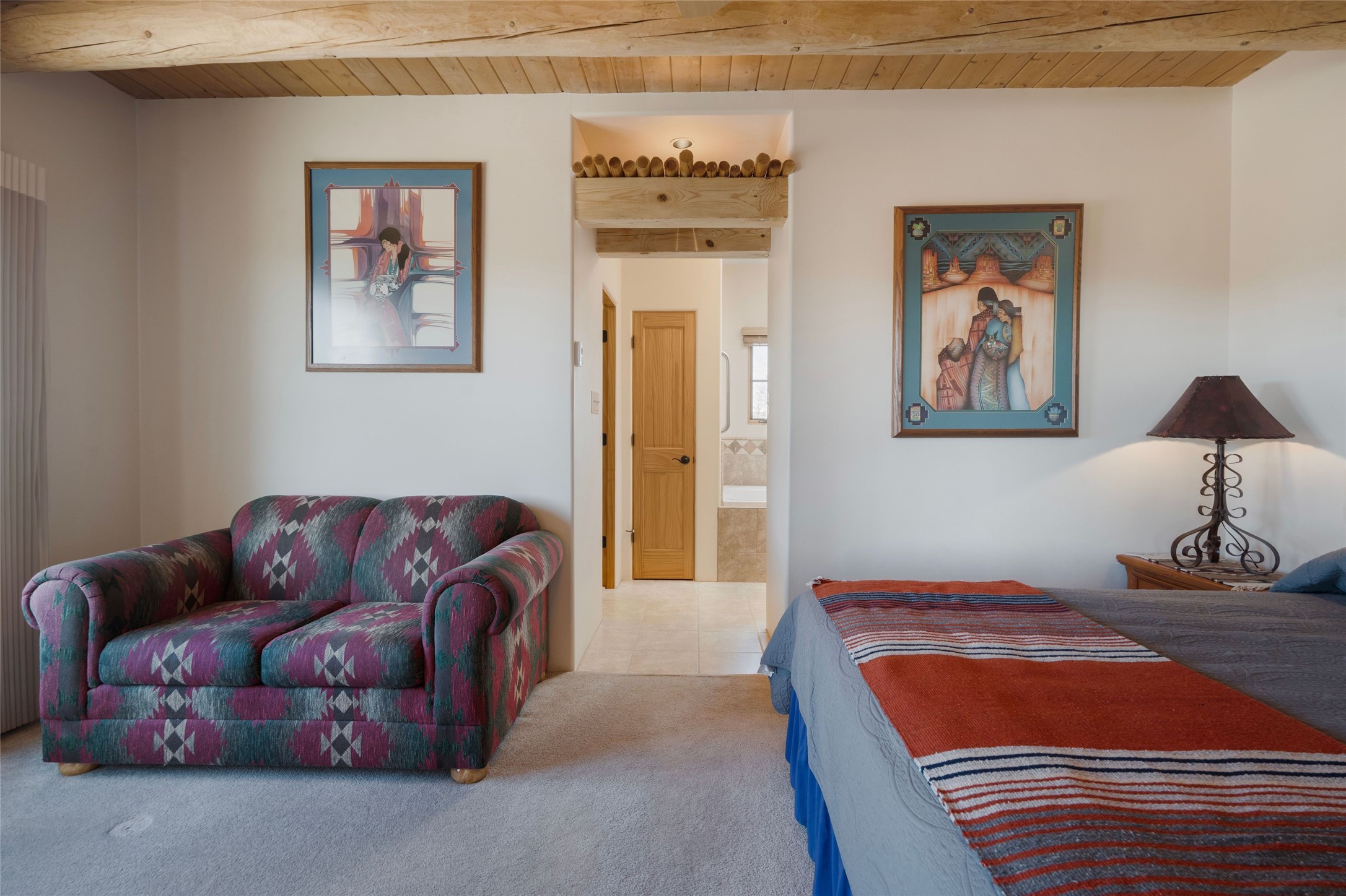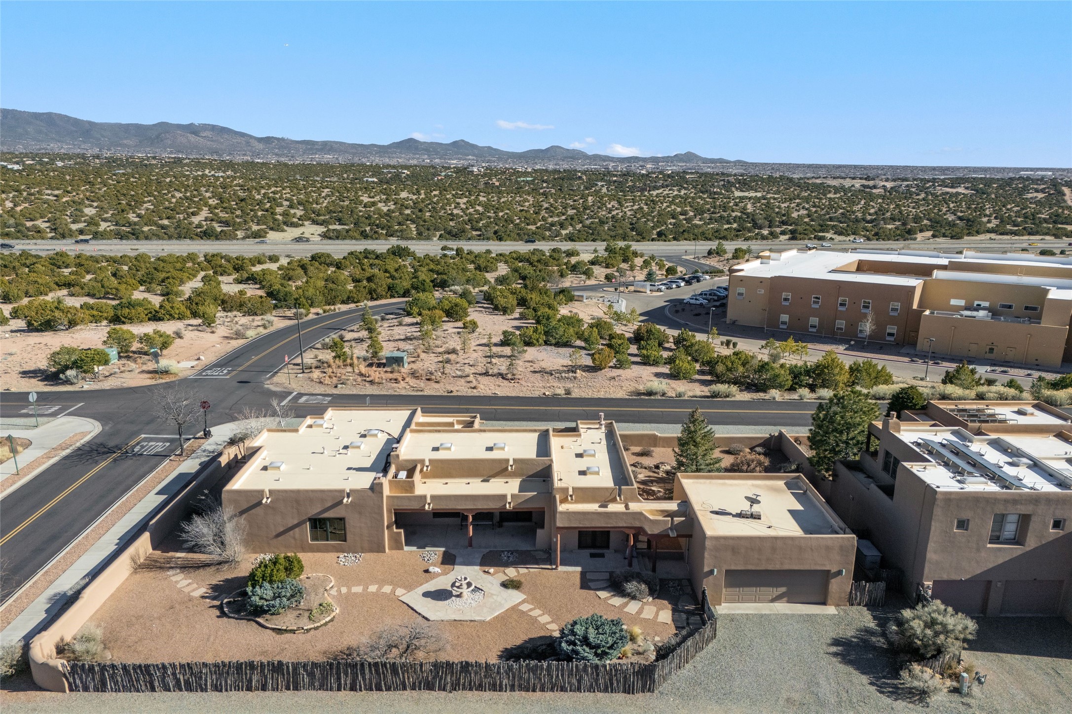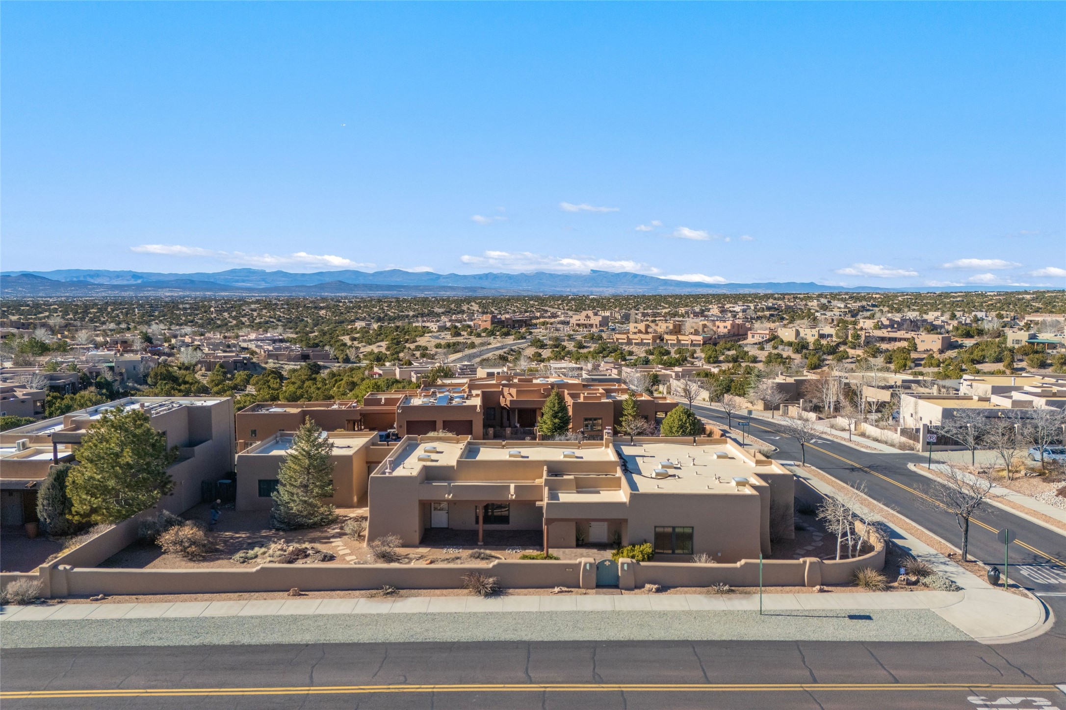 Single level 3-bedroom, 3-bath single level in Aldea, a National Wildlife Federation Certified Wildlife Habitat Community. Sited on a large, walled corner lot with views of the Sangre and Jemez mountains. Home is appointed with plaster walls, nichos, tile in the common living areas, vigas and wood plank ceilings, and 2 kiva fireplaces. Formal dining room has French doors opening to a portal for expanded living and dining. Spacious kitchen with plentiful cabinets. large center island and breakfast area. The primary bedroom has a kiva fireplace, direct access to the back portal and an ensuite bath with a soaking tub and walk in shower. The third bedroom with its built-in desk and bookshelves offers flex space as an office/studio. 2-car detached garage. Aldea is a master- planned community designed and planned by Andres Duany, the "grandfather" of New Urbanism. Residents enjoy 205 acres of open space, walking trails and sports amenities. Conveniently located with easy access to 599 and downtown Santa Fe.
