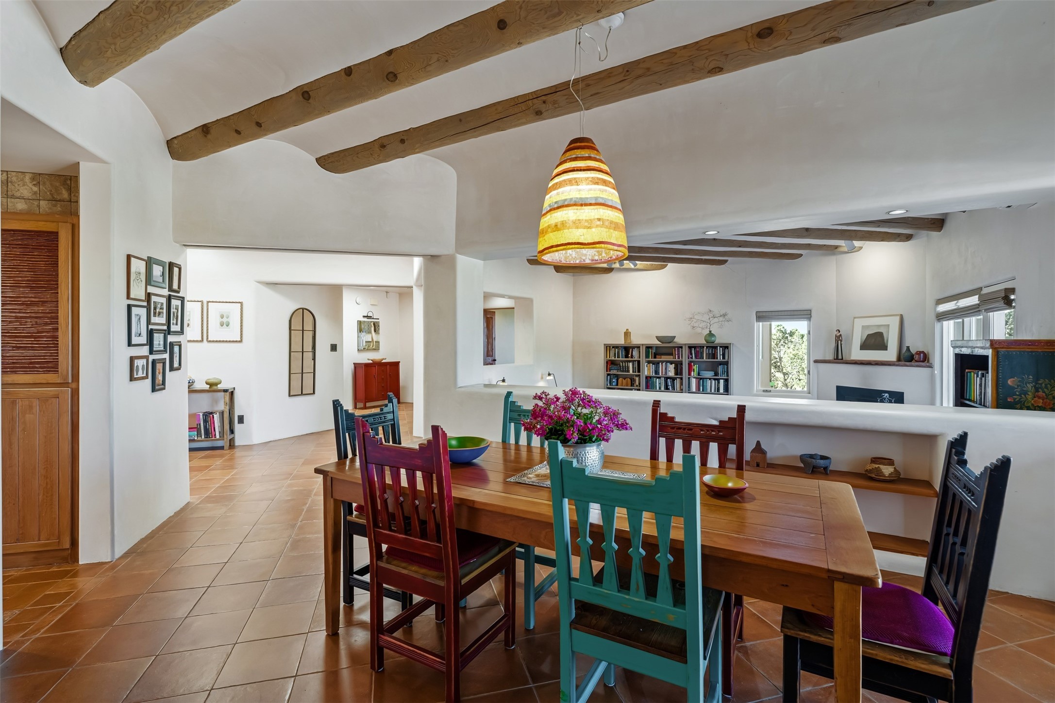 Experience breathtaking views of the majestic Sangre de Cristo and Jemez mountains from this stunning single level 4 bedroom 3.5 bath residence located on 1.76 acres in La Mariposa. This prime location is 10 minutes to the Plaza downtown and close to the Club at Las Campanas. An open natural light filled floor plan features a spacious living room with a fireplace and a dining room - both with large windows showcasing the captivating mouuntain views. A well-appointed kitchen includes a charming breakfast nook with banco seating. The primary suite offers ultimate comfort with a luxurious bath and a cozy fireplace, creating a private retreat. There is a second oversized bedroom with its own fireplace and adjacent bath. Two additional guest bedrooms share a bath. Enjoy relaxing or entertaining in the inviting outdoor spaces, featuring a private enclosed backyard patio and a cozy gas firepit. The property is enhanced with extensive low maintenance landscaping designed for beauty and ease of care.