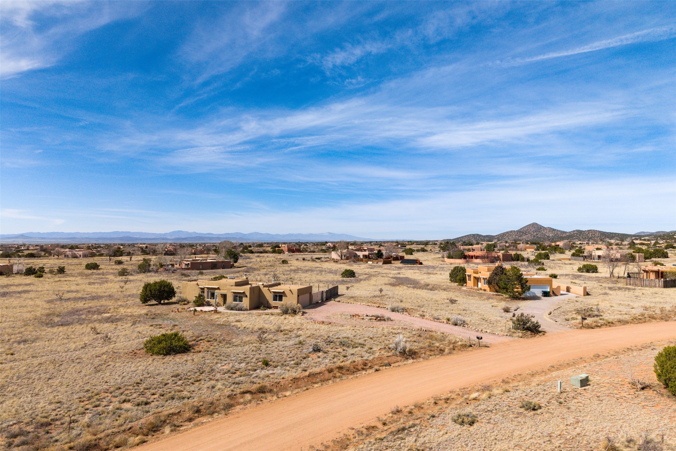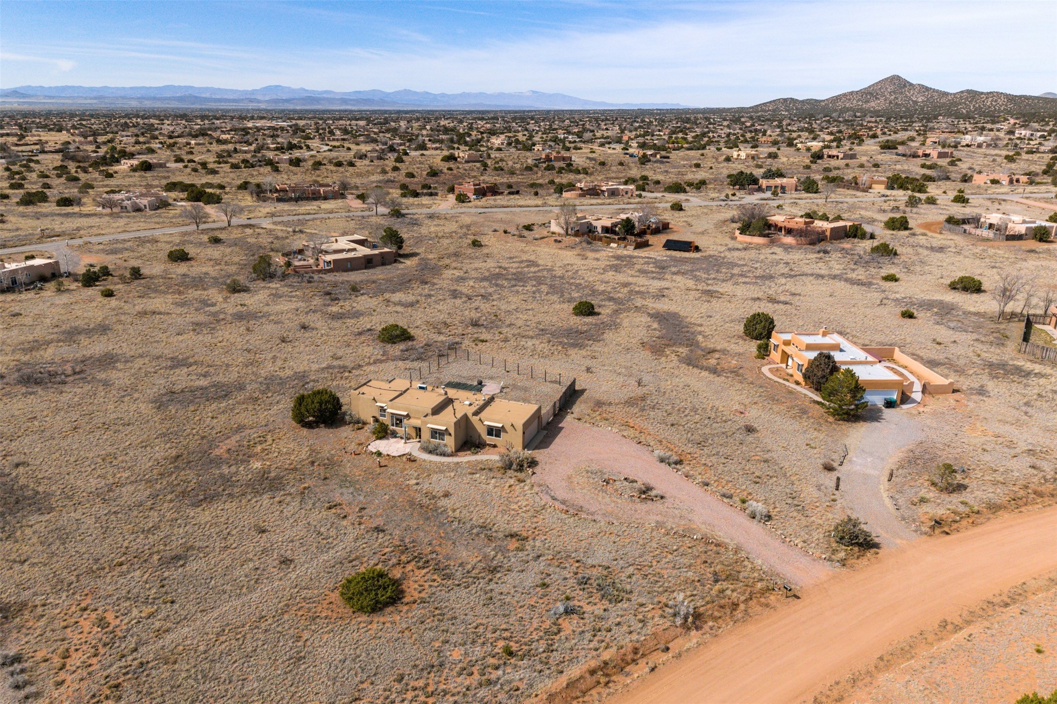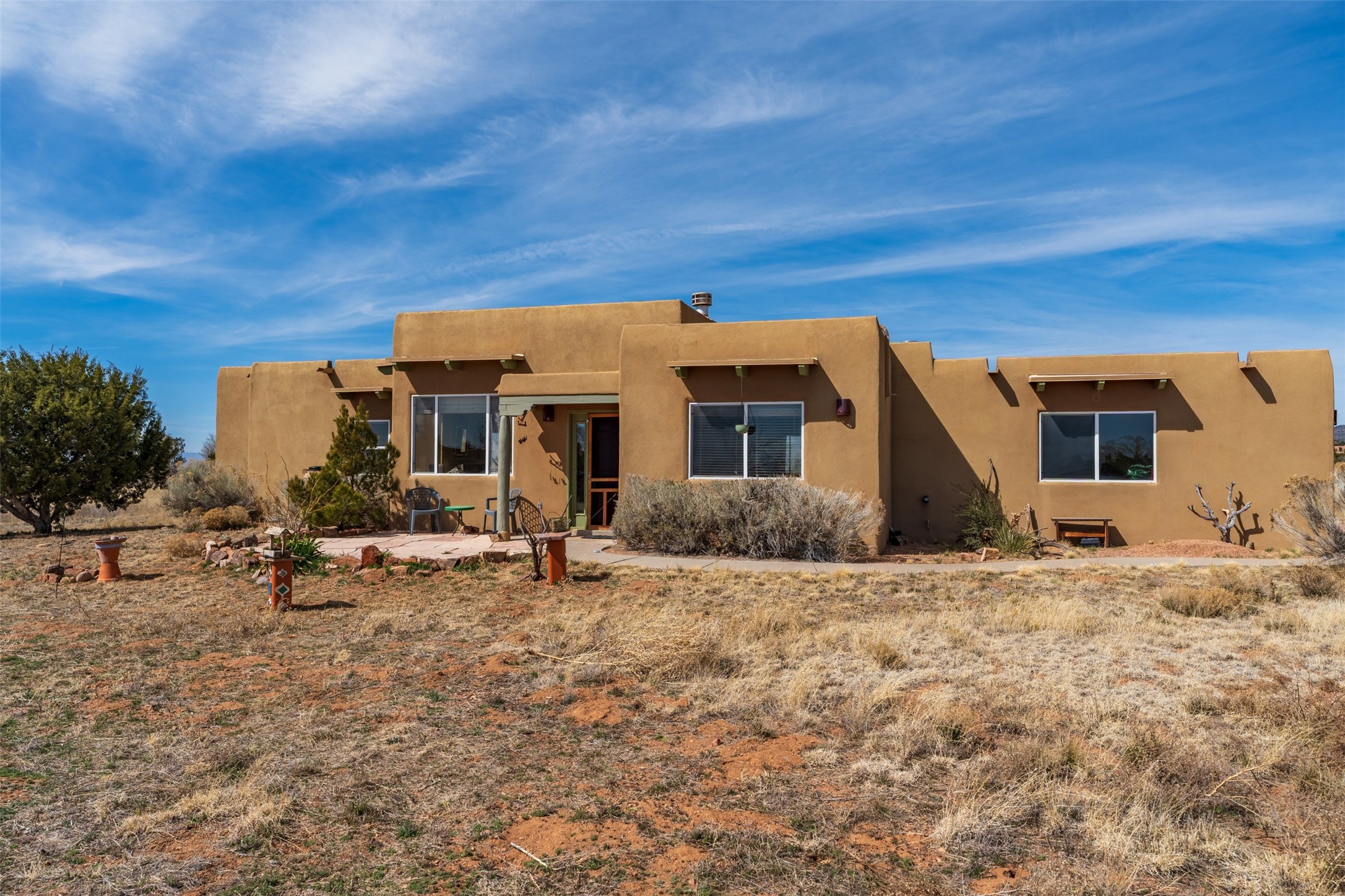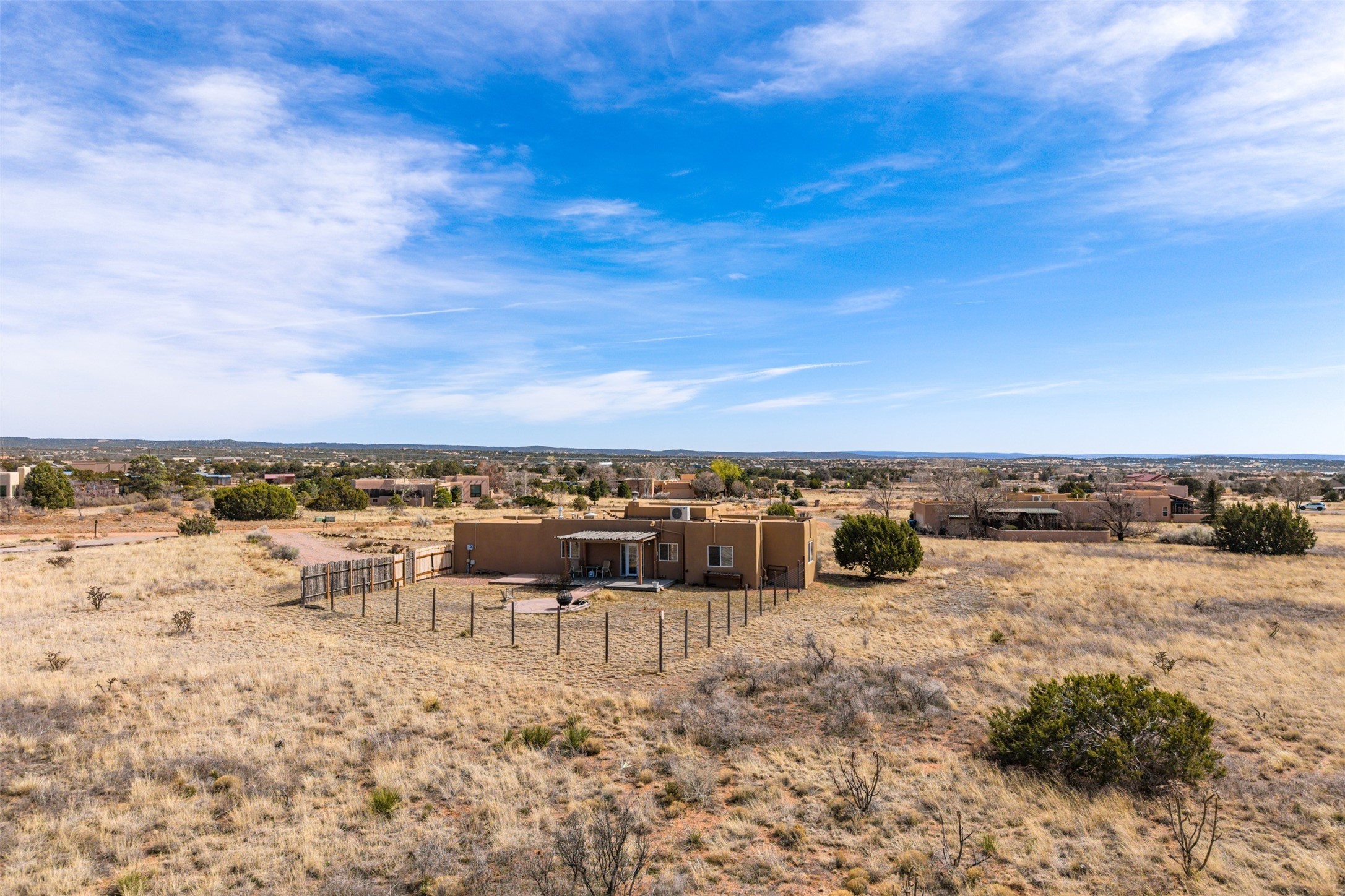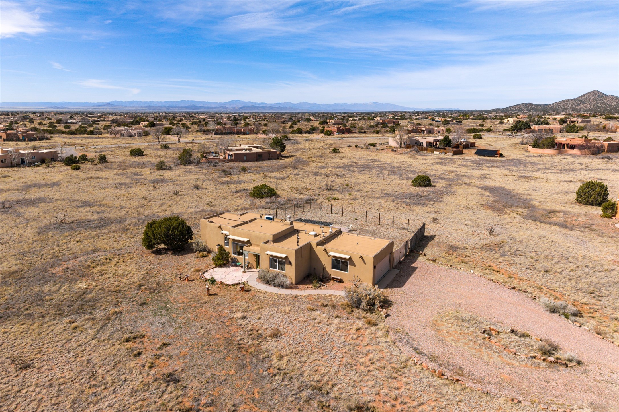 Super light and bright, charming open plan contemporary concept. 3 bedrooms, 2 bath with excellent separation between main and guest suites. The updated entertainers kitchen features granite counter tops and central island. Sweeping sunset mountain views from the living room with a gas fireplace for extra winter warmth. The kitten radiant heating system was abandoned by the previous owners and now a larger compressor was just added to serve the 4 mini splits that both heat and cool this home. The electrical has been updated, and the 2 car garage has been insulated and finished. The home was re roofed in 2019 and been maintained, a patio view at the front and lovely party deck added on the north side with Sangre foothill views. A latilla pergola with awnings and fenced yard for added benefits on over an acre of land. This is a delightful home located close to Eldorado amenities, local shopping, pub, schools, library and senior center. All this with just a short trip into historic Santa Fe.