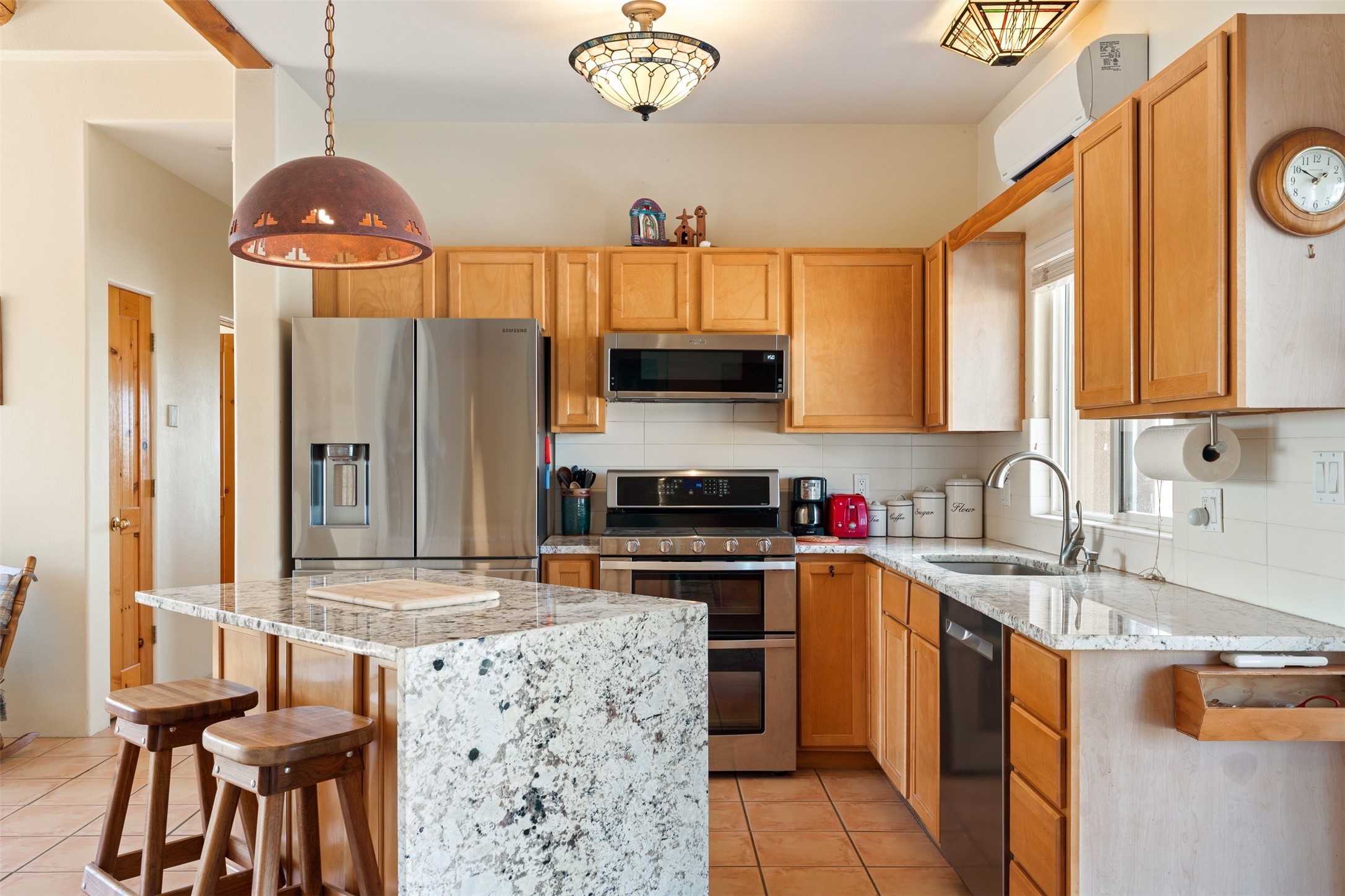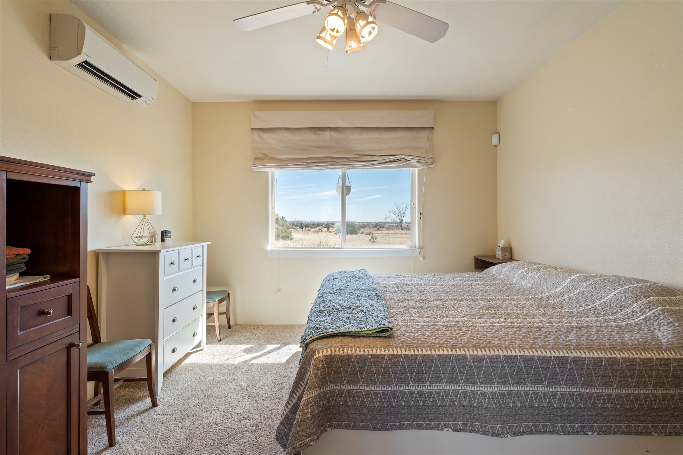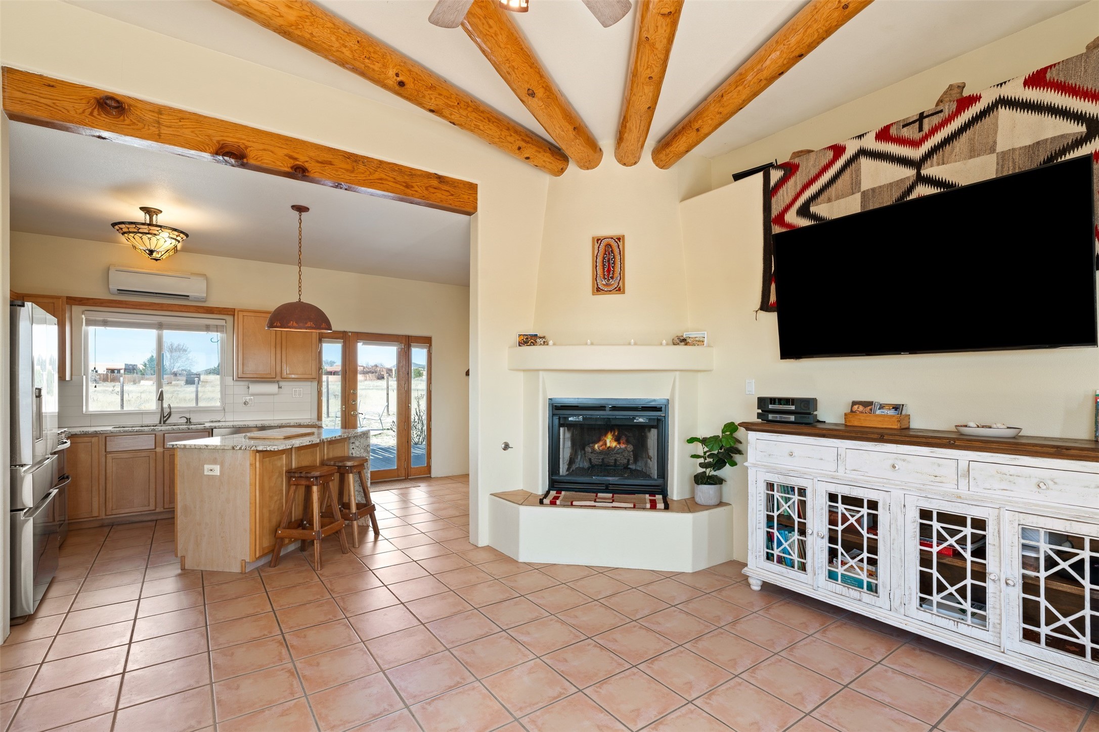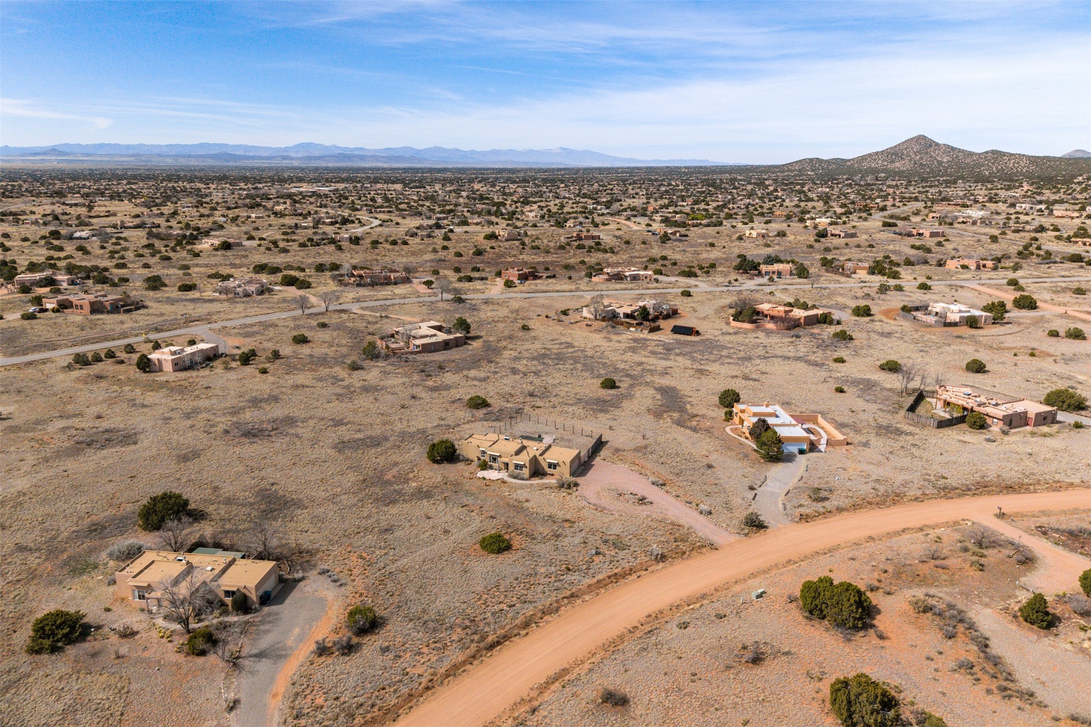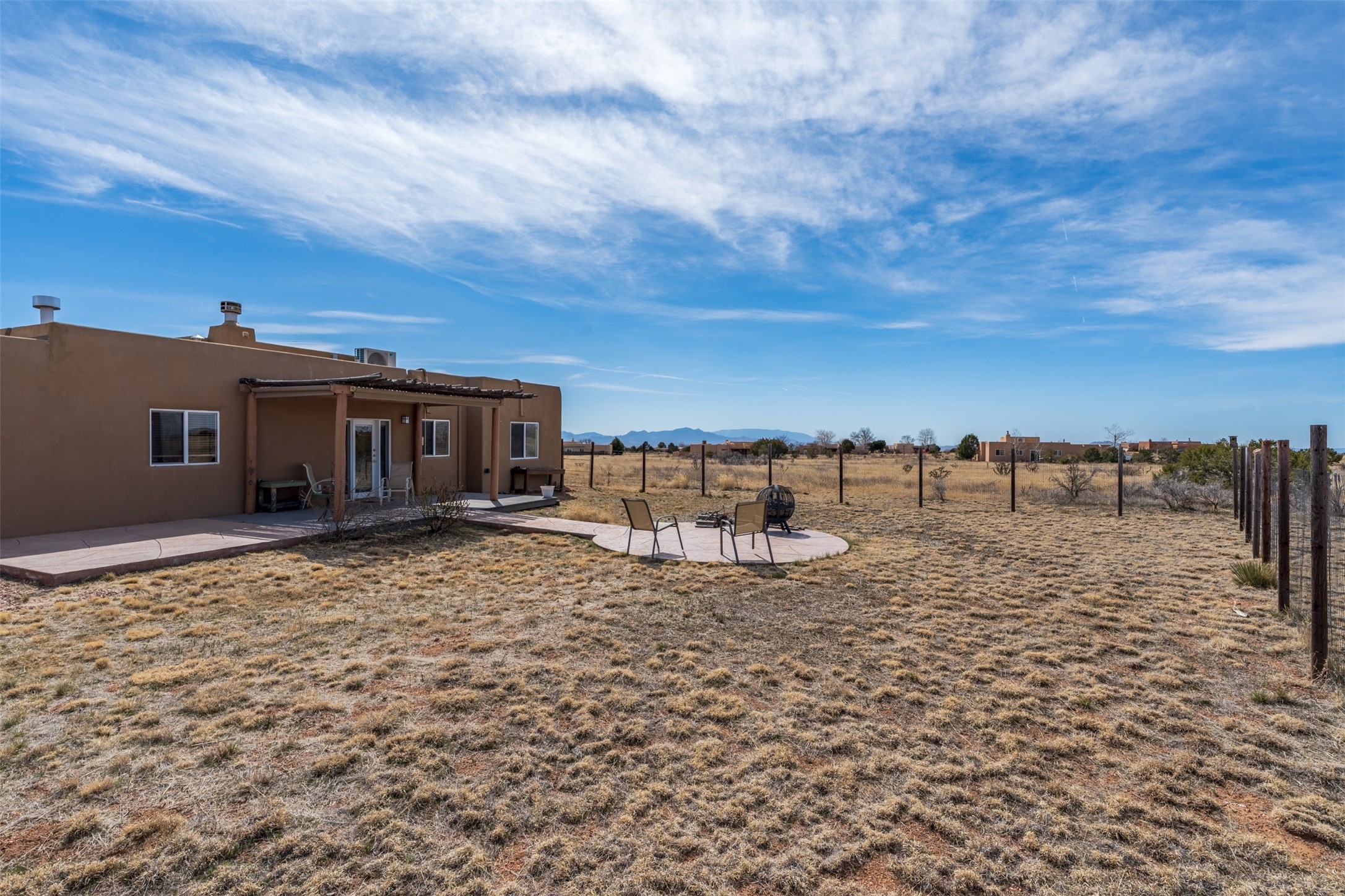 Super light and bright, charming open plan contemporary concept. 3 bedrooms, 2 bath with excellent separation between main and guest suites. The updated entertainers kitchen features granite counter tops and central island. Sweeping sunset mountain views from the living room with a gas fireplace for extra winter warmth. The kitten radiant heating system was abandoned by the previous owners and now a larger compressor was just added to serve the 4 mini splits that both heat and cool this home. The electrical has been updated, and the 2 car garage has been insulated and finished. The home was re roofed in 2019 and been maintained, a patio view at the front and lovely party deck added on the north side with Sangre foothill views. A latilla pergola with awnings and fenced yard for added benefits on over an acre of land. This is a delightful home located close to Eldorado amenities, local shopping, pub, schools, library and senior center. All this with just a short trip into historic Santa Fe.