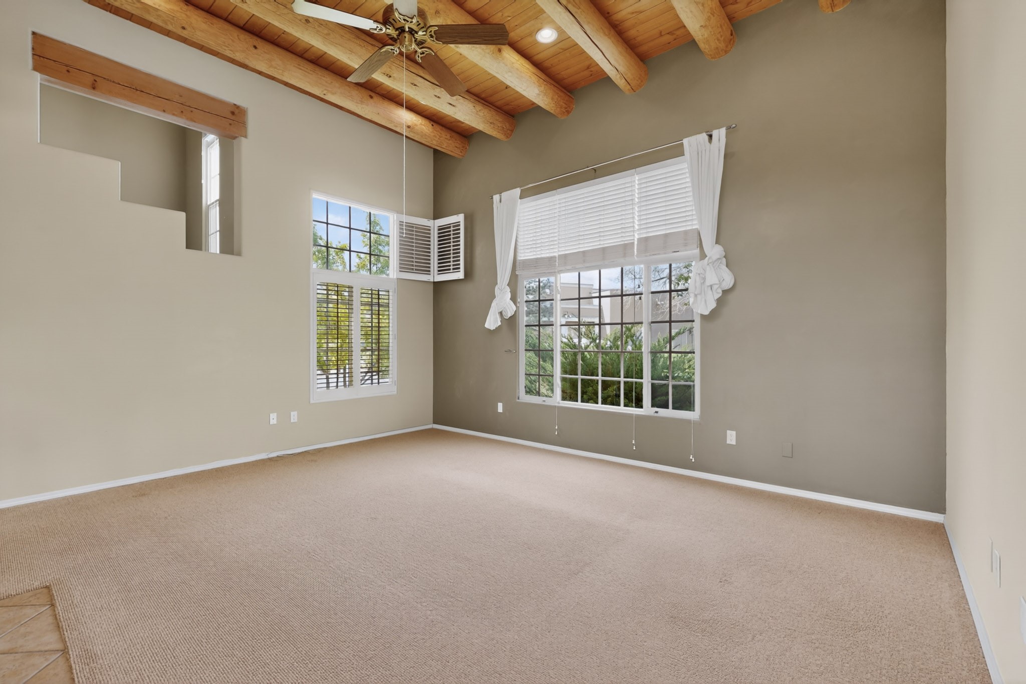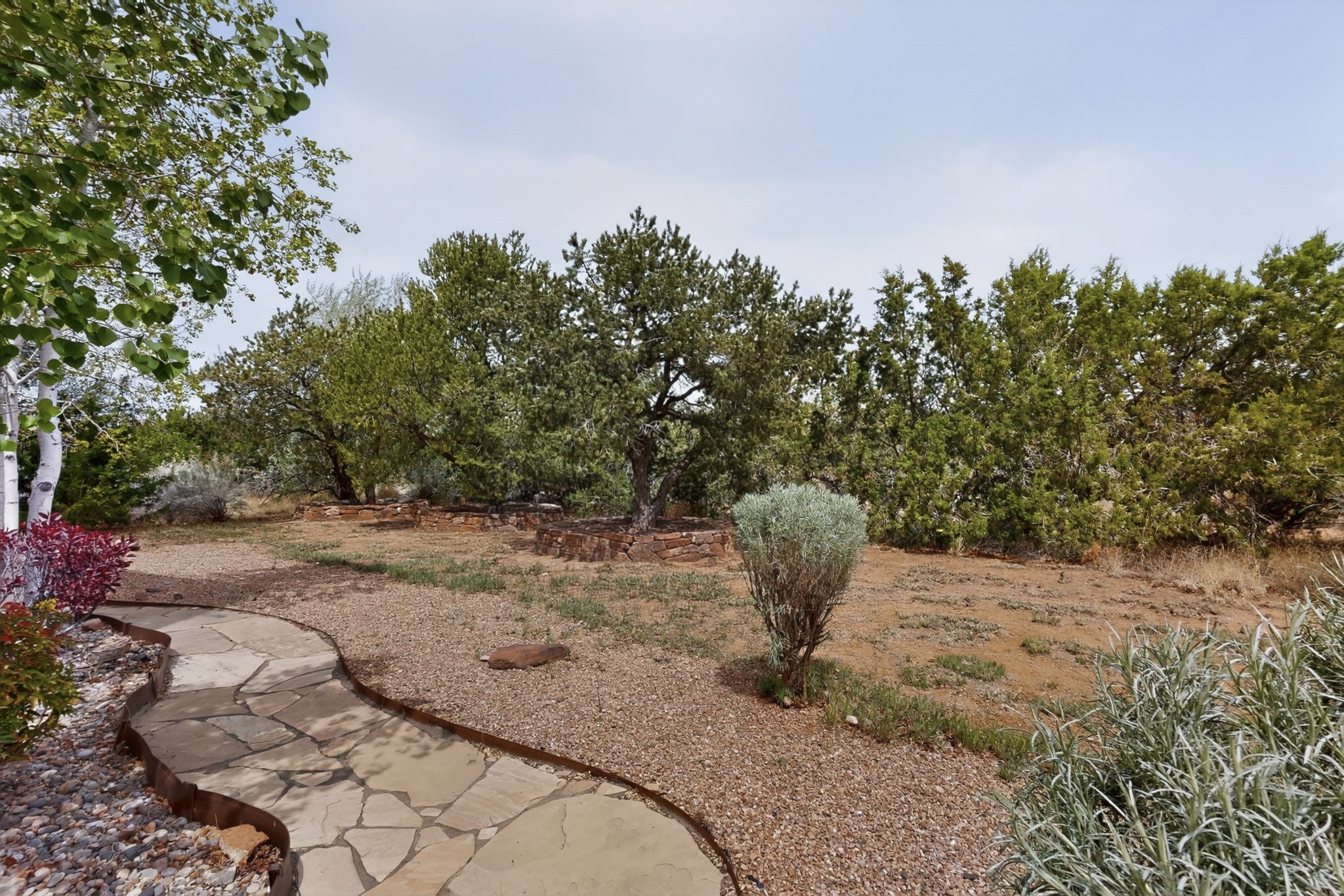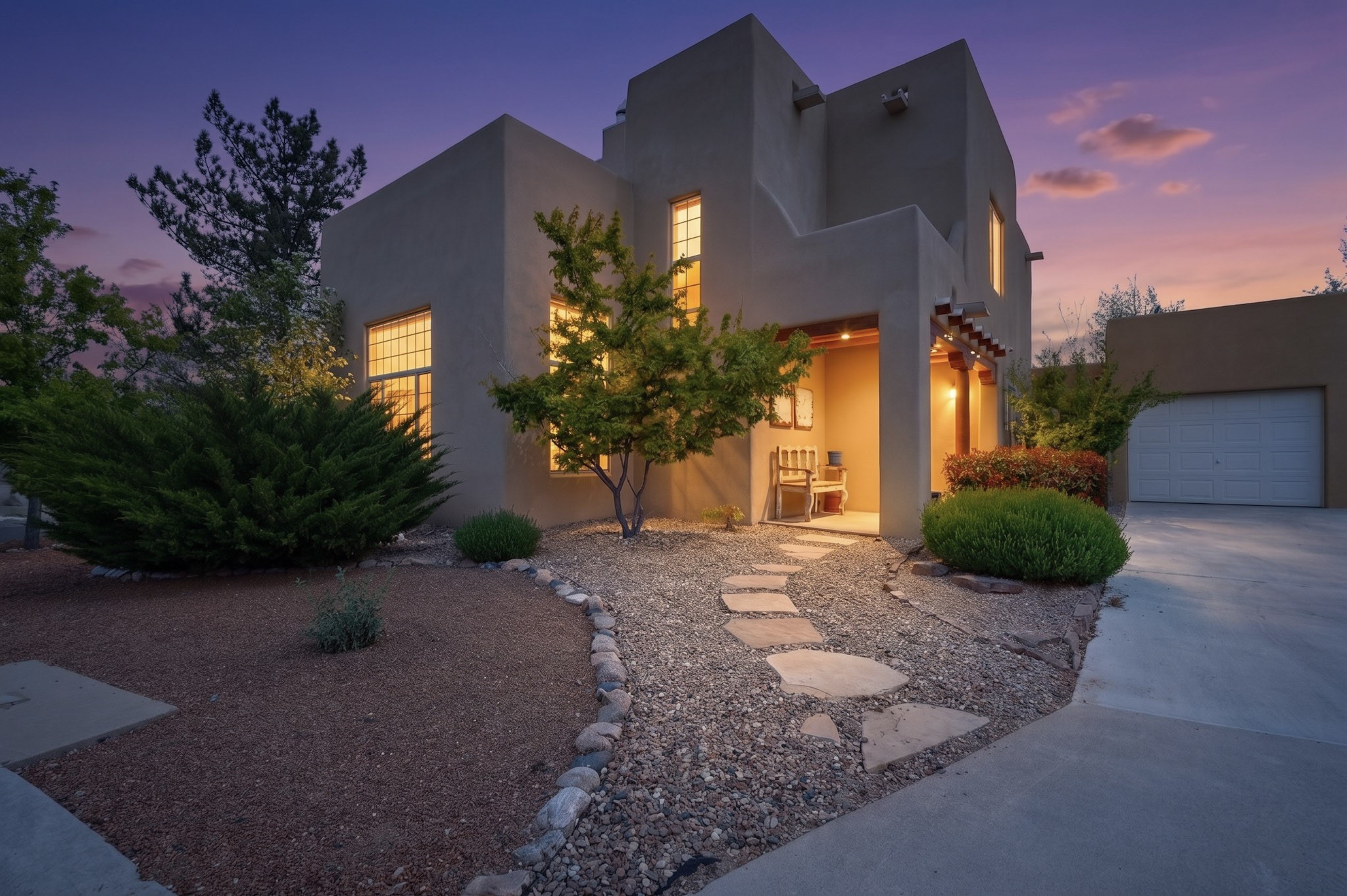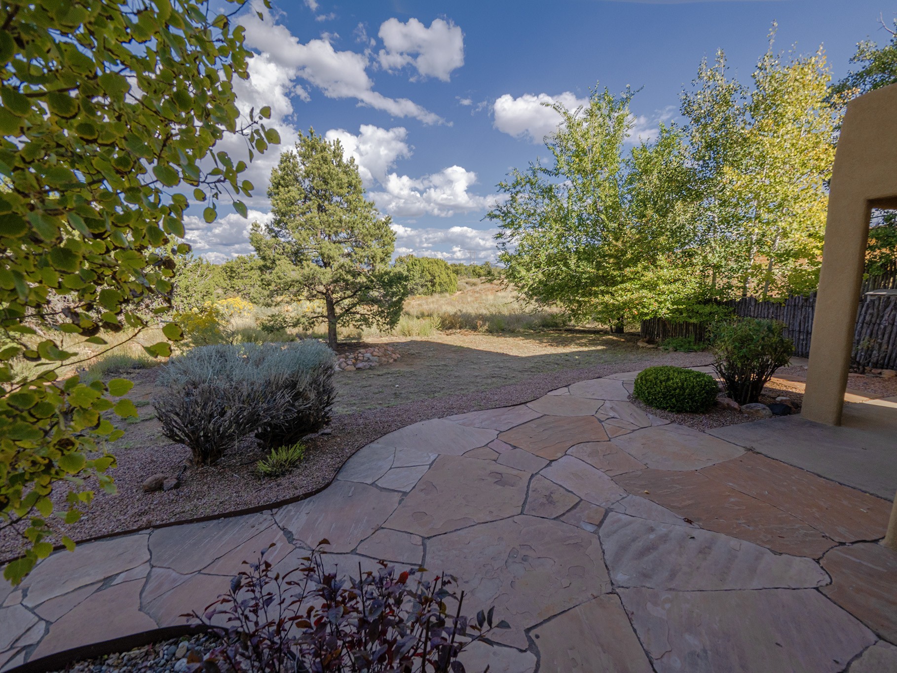 Private, spacious, Nava Ade Gem with Mountain Views! Tucked away at the end of a quiet cul-de-sac & backing to some open space, this home provides tons of privacy, & access to Santa Fe's trail system. With appx 2,024 square feet of well-designed living space, this 3-bedroom + office (or 4th bedroom), 3-bathroom residence offers both flexibility & comfort. Step inside to a light-filled, two-story home to the living room featuring soaring ceiling with vigas & a two-sided gas (gas stub out has never been used-was added when home was built) & wood-burning fireplace shared w/ the dining area. The open-concept kitchen is ideal for entertaining, w/ granite countertops, an island, ample cabinetry, a pantry, & a water purification system at the sink. A standout feature is the versatile downstairs large office space--complete w/ a custom door & separate entrance from the kitchen & exterior--perfect for a studio, guest room, workout area, playroom, or 4th bedroom. Spacious primary suite w/ mountain views include an en-suite bath w/ dual vanity, a separate tub & shower, & a walk-in closet w/ built ins. 2 additional good-sized bedrooms & a full bath complete the upper level. Additional highlights include: Forced air heat w/ refrigerated air, washer/dryer, ceiling fans, track lighting, tile, carpet & NEW laminate flooring (2025) & NEW windows (2018-2019) on east, west, and south sides, NEW stucco (2020), NEW furnace/AC (+/- 2019), NEW refrigerator (+/- 2022), NEW garage door (2025), TPO roof, long driveway providing room for multiple cars, under-stair storage, drip irrigation & more. Enjoy peaceful mornings or evenings in the backyard from 2 patios, & open space offering a natural feel--yet you're only minutes from hospitals, restaurants, shopping, and schools. Nava Ade offers a clubhouse, pool, work-out room, hot tub & more in addition to a trail system connecting to the Arroyo Chamiso Trail, making it ideal for outdoor lovers.