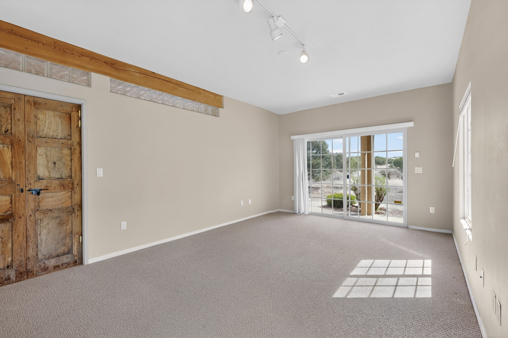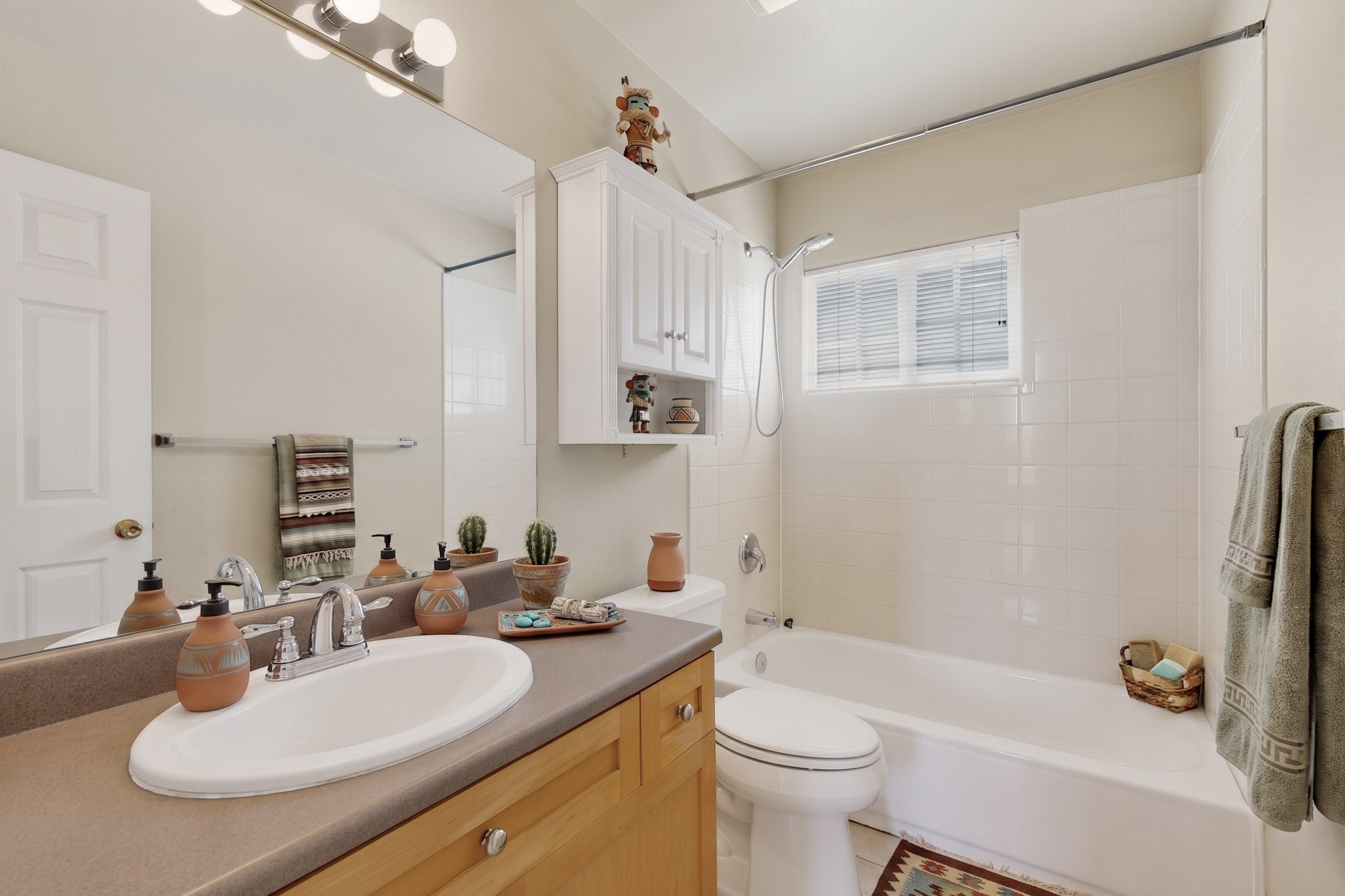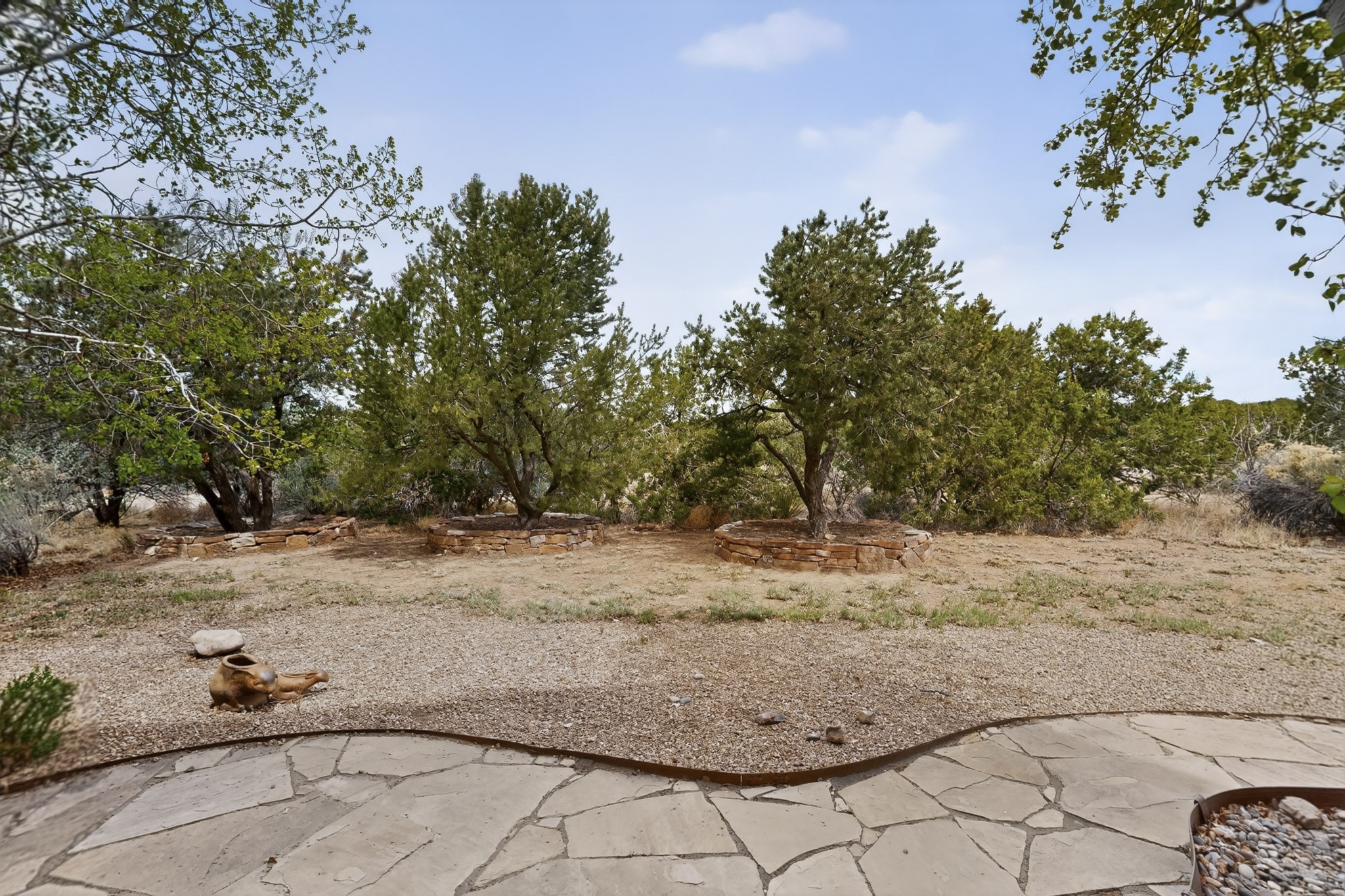 Private, spacious, Nava Ade Gem with Mountain Views! Tucked away at the end of a quiet cul-de-sac & backing to some open space, this home provides tons of privacy, & access to Santa Fe's trail system. With appx 2,024 square feet of well-designed living space, this 3-bedroom + office (or 4th bedroom), 3-bathroom residence offers both flexibility & comfort. Step inside to a light-filled, two-story home to the living room featuring soaring ceiling with vigas & a two-sided gas (gas stub out has never been used-was added when home was built) & wood-burning fireplace shared w/ the dining area. The open-concept kitchen is ideal for entertaining, w/ granite countertops, an island, ample cabinetry, a pantry, & a water purification system at the sink. A standout feature is the versatile downstairs large office space--complete w/ a custom door & separate entrance from the kitchen & exterior--perfect for a studio, guest room, workout area, playroom, or 4th bedroom. Spacious primary suite w/ mountain views include an en-suite bath w/ dual vanity, a separate tub & shower, & a walk-in closet w/ built ins. 2 additional good-sized bedrooms & a full bath complete the upper level. Additional highlights include: Forced air heat w/ refrigerated air, washer/dryer, ceiling fans, track lighting, tile, carpet & NEW laminate flooring (2025) & NEW windows (2018-2019) on east, west, and south sides, NEW stucco (2020), NEW furnace/AC (+/- 2019), NEW refrigerator (+/- 2022), NEW garage door (2025), TPO roof, long driveway providing room for multiple cars, under-stair storage, drip irrigation & more. Enjoy peaceful mornings or evenings in the backyard from 2 patios, & open space offering a natural feel--yet you're only minutes from hospitals, restaurants, shopping, and schools. Nava Ade offers a clubhouse, pool, work-out room, hot tub & more in addition to a trail system connecting to the Arroyo Chamiso Trail, making it ideal for outdoor lovers.