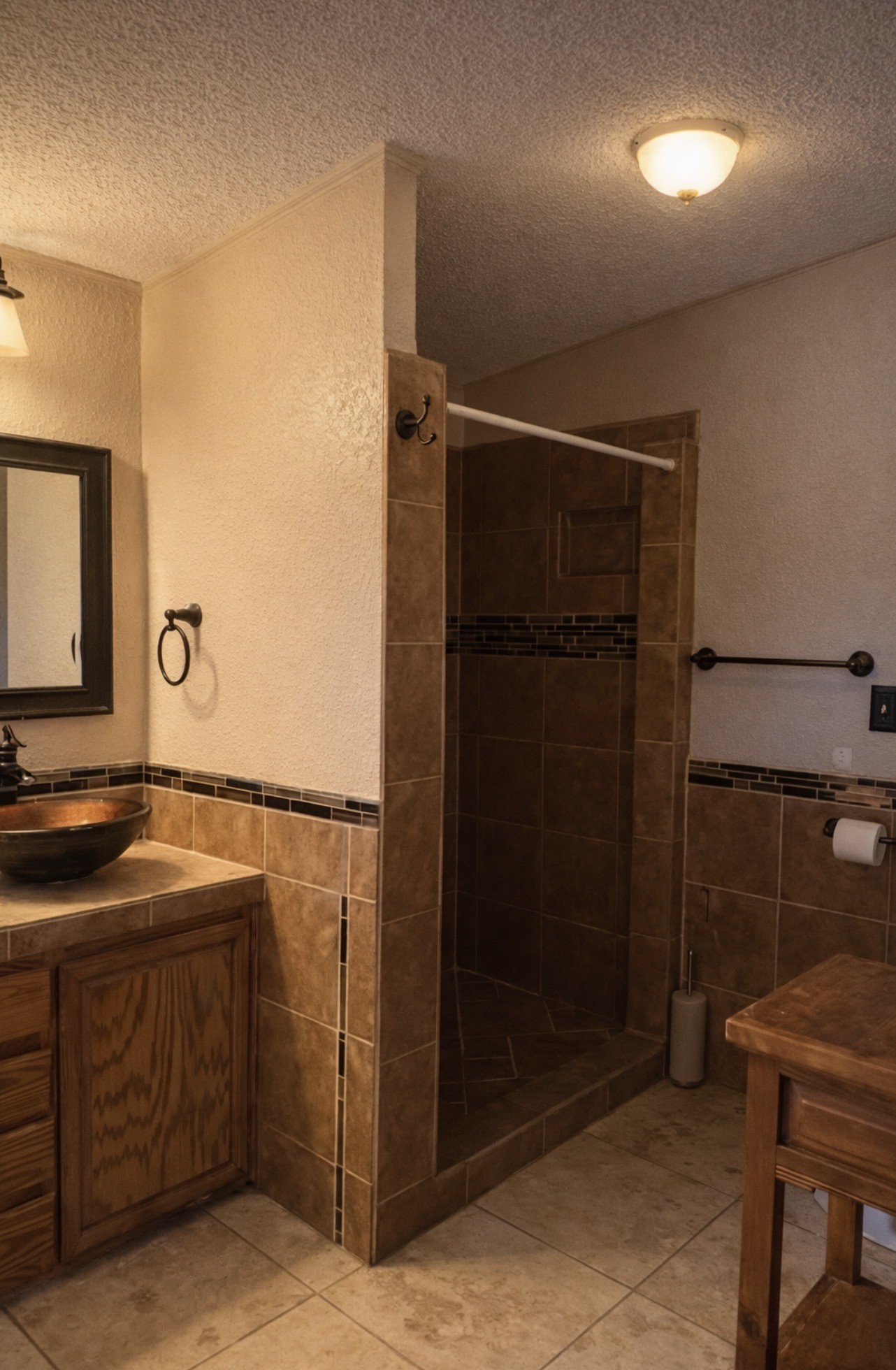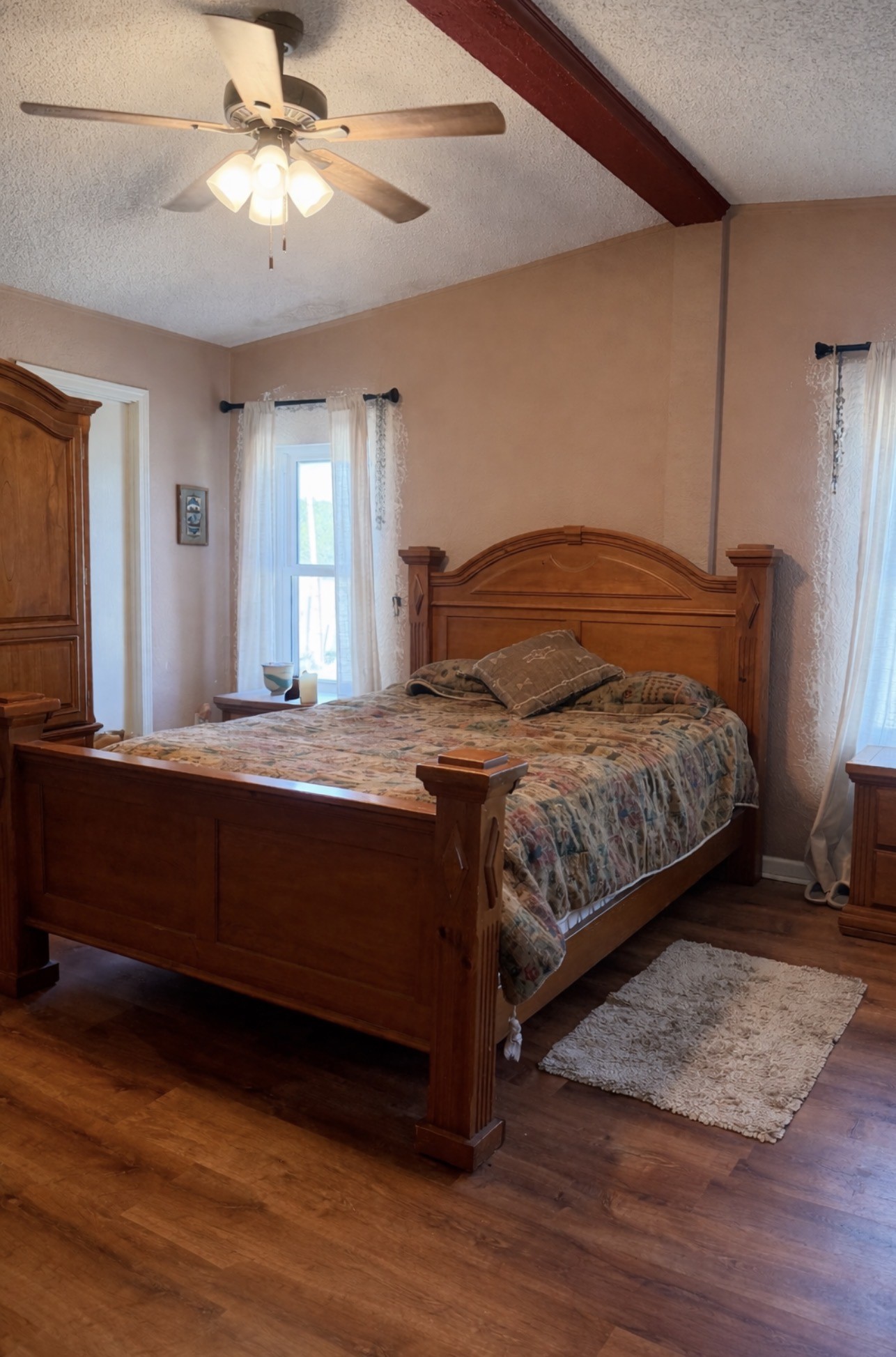 On a spacious one-acre lot with beautiful mountain views. This Manufactured Home features an inviting open floor plan with a cozy wood-burning fireplace, vinyl wood flooring, and ceramic tile throughout, creating a warm and welcoming living space. Recent updates provide peace of mind, including new stucco and windows installed in 2020, along with a new furnace installed in August 2024. Tranquil outdoor setting; A flagstone walkway connects the side parking area to the home's entrance and leads to a relaxing outdoor spa, surrounded by coyote fencing and beautiful wisteria. The property offers fruit trees,stunning mountain views from the front porch, and plenty of space to enjoy the outdoors, making it perfect for gardening, entertaining, or simply relaxing in nature. Close proximity to the La Tierra Trail System and Buckman MX Track. Convenient access to Highways 599 and 285 allows for an easy commute, while shopping, dining, and amenities at DeVargas Mall are just about 12 minutes away.