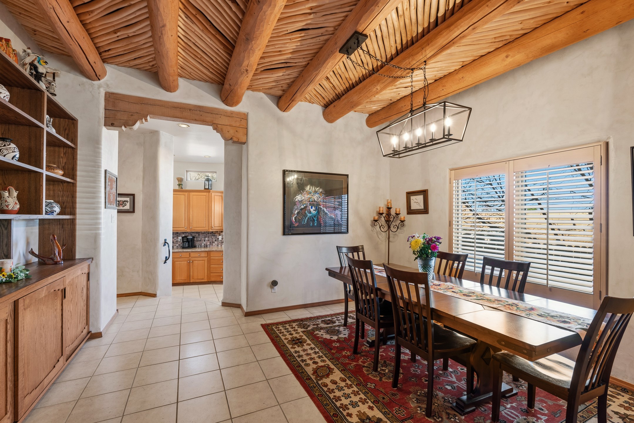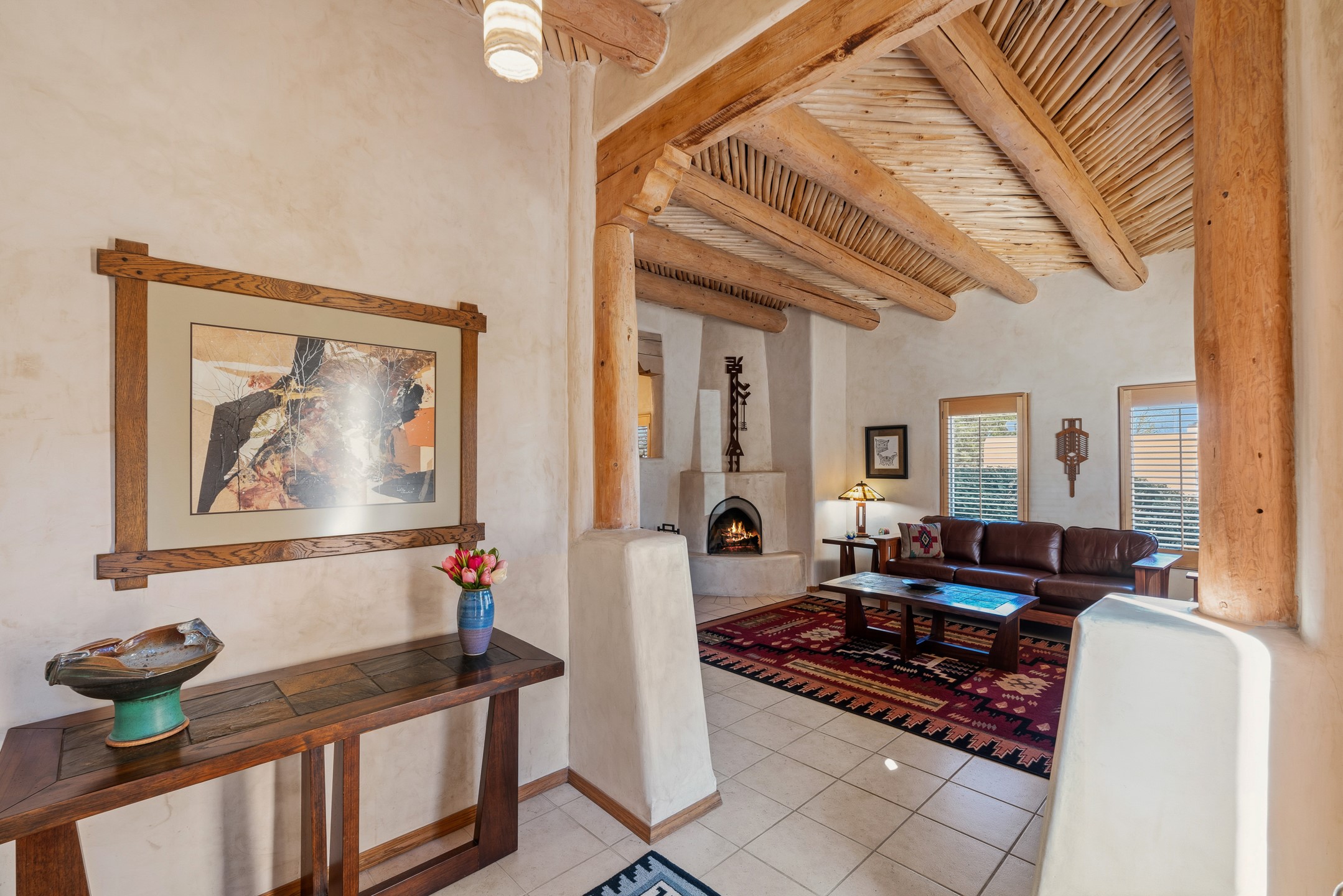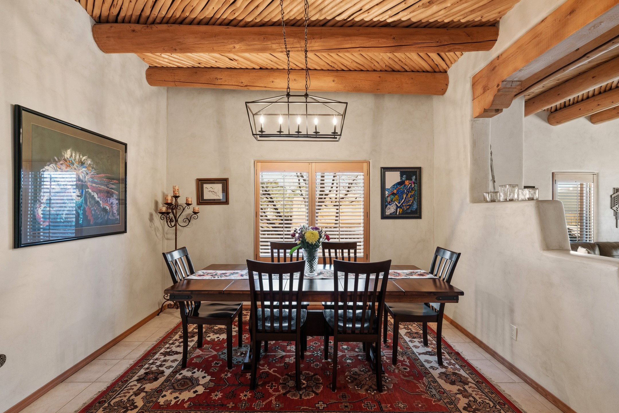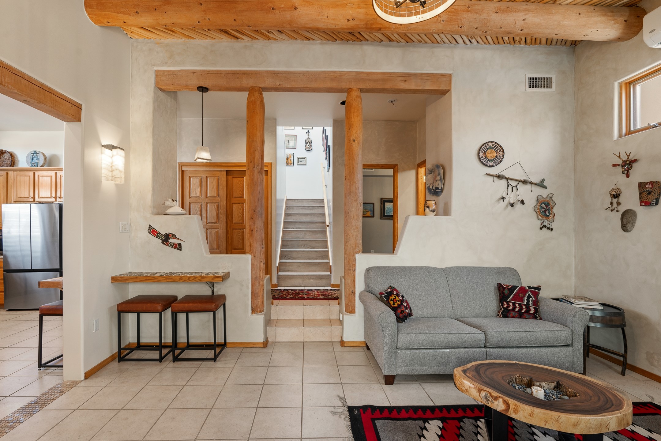 Experience authentic Southwestern charm in this beautifully maintained custom Santa Fe-style home. Built in 1995, with classic architectural details including stunning vigas and aspen latilla ceilings, tile flooring, two inviting kiva fireplaces, and custom built-in shelving in the dining room. The thoughtfully designed curved kitchen has been tastefully updated with new appliances, a stylish tile backsplash, wine fridge, and breakfast bar--creating an inviting space for both everyday living and entertaining.Comfort and efficiency are enhanced by four mini-split systems providing cooling in the summer and quick, efficient heat in cooler months.Outdoor living is equally impressive. A pergola-covered patio overlooks a beautifully enhanced backyard featuring mature landscaping, new side fencing, additional drip irrigation, and three private seating areas connected by flagstone patios and walkways--perfect for relaxing or gathering with guests.The home offers 3 bedrooms and 3 baths, including a convenient main-level bedroom with an adjacent accessible shower bath. The main level also features a spacious living room, dining area, and a cozy TV/sitting room with wood burning kiva fire place opens to the outdoor portal for effortless indoor-outdoor entertaining.Upstairs, you will find a large master bedroom suite with a remodeled bathroom featuring new tile flooring, a new tub, updated vanity and sinks, and a generous tiled shower with dual shower heads. Off of this bedroom is a deck with views of the Sangres. Upstairs is an additional ensuite bedroom which could be used as a second primary suite. There is a second upstairs deck off of this area. Additional features include abundant storage, 4 minisplits for cooling and a garage with a 220-volt outlet suitable for EV charging or workshop use.Filled with natural light and lovingly cared for, this exceptional Santa Fe home offers timeless character, thoughtful upgrades, and inviting indoor and outdoor living spaces.