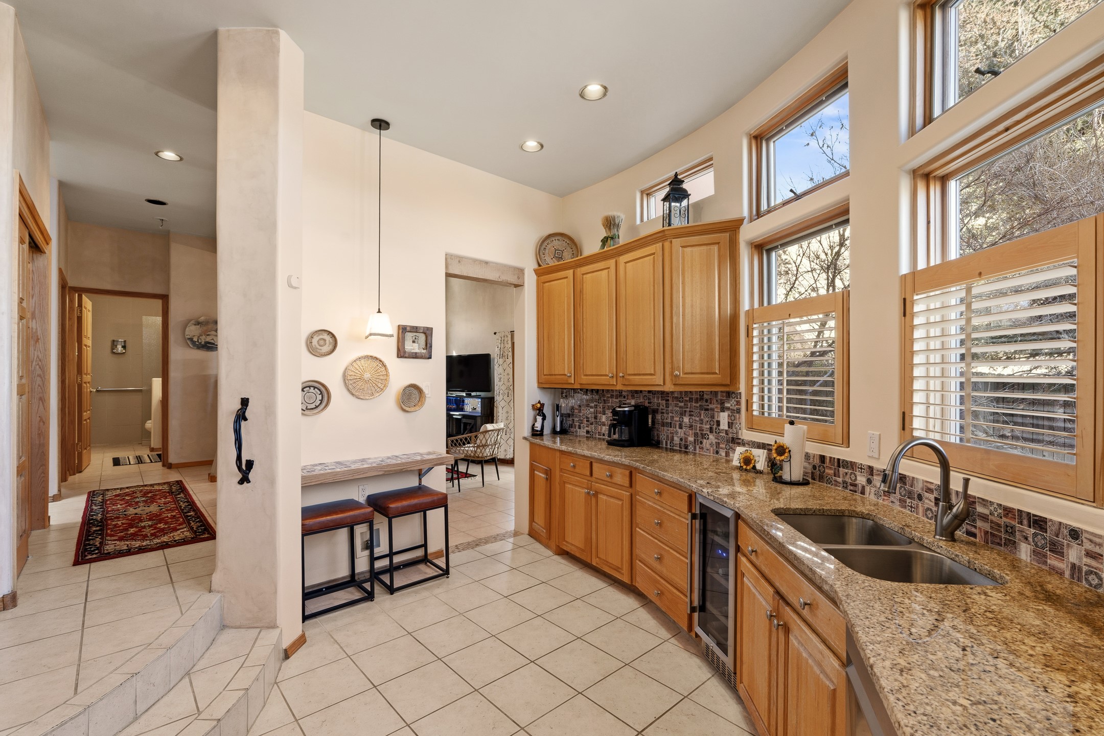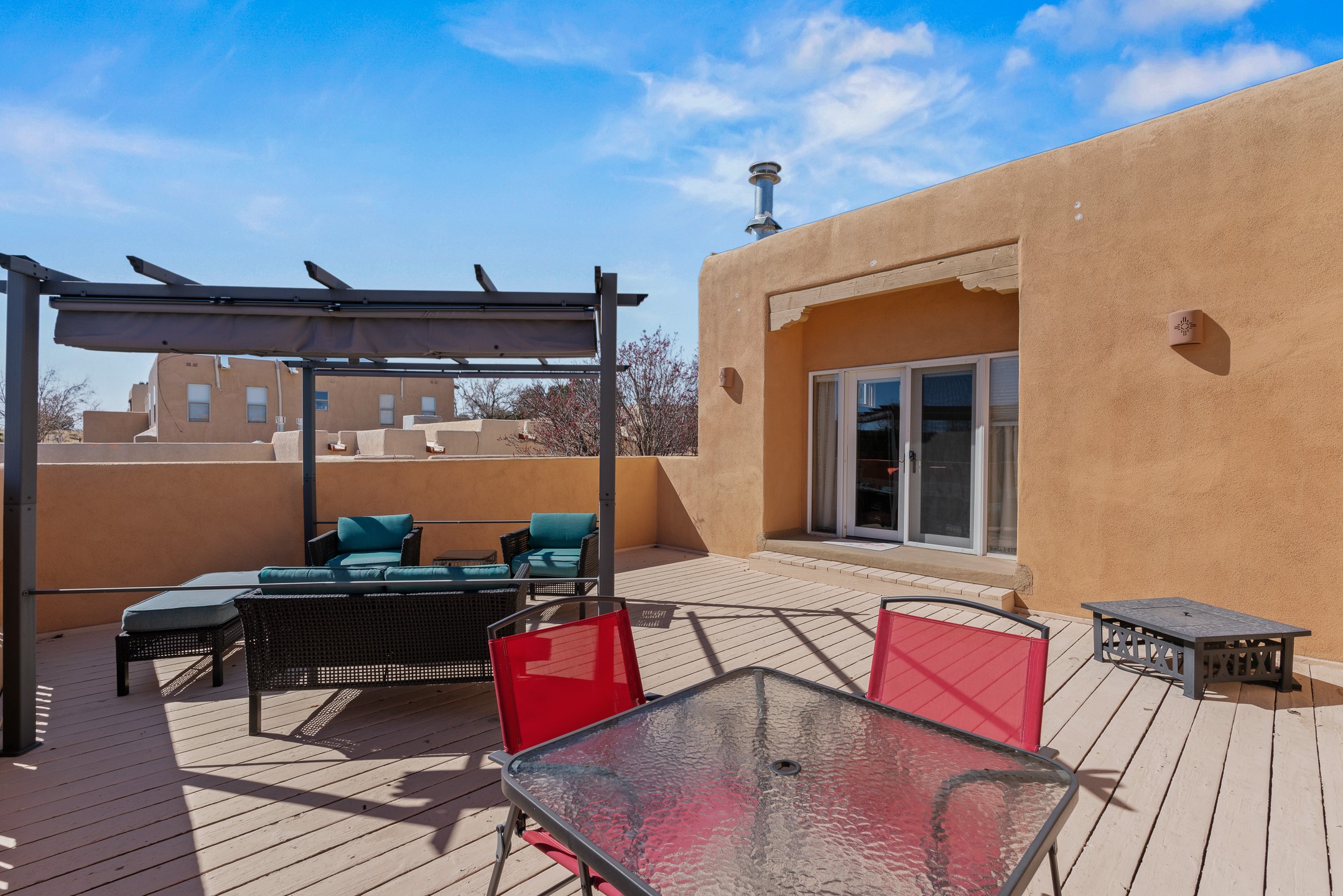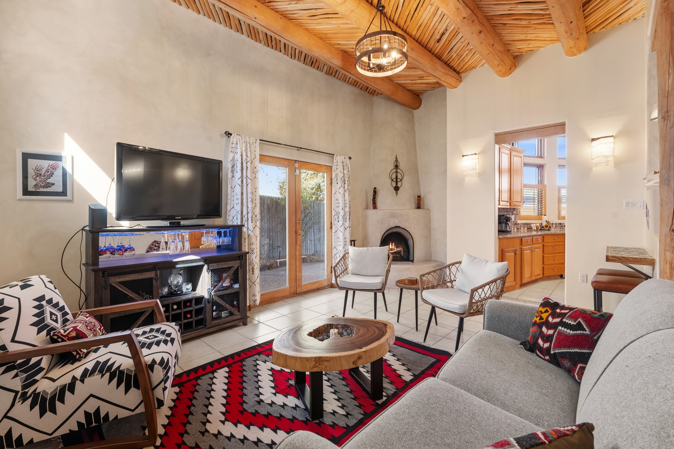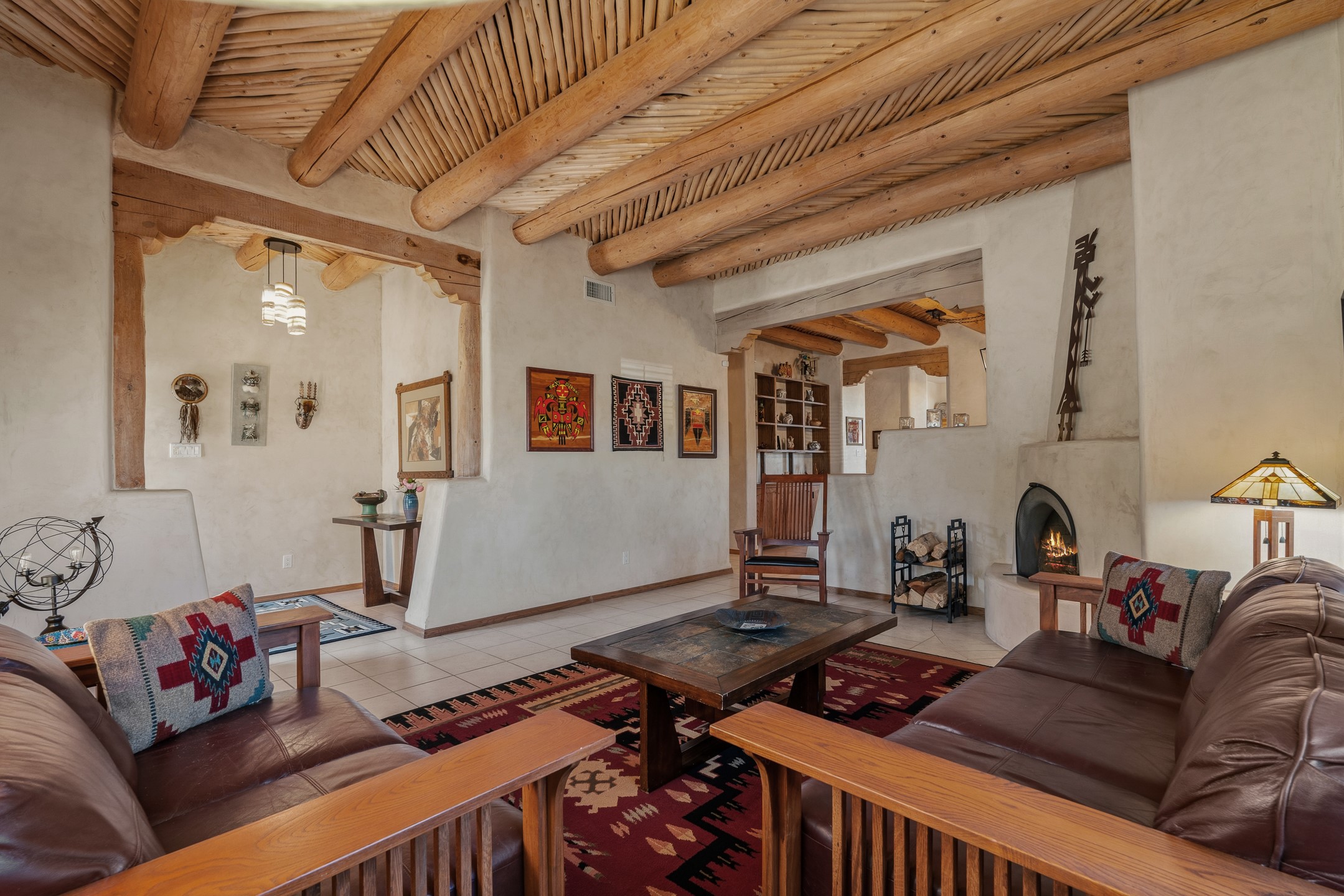 Experience authentic Southwestern charm in this beautifully maintained custom Santa Fe-style home. Built in 1995, with classic architectural details including stunning vigas and aspen latilla ceilings, tile flooring, two inviting kiva fireplaces, and custom built-in shelving in the dining room. The thoughtfully designed curved kitchen has been tastefully updated with new appliances, a stylish tile backsplash, wine fridge, and breakfast bar--creating an inviting space for both everyday living and entertaining.Comfort and efficiency are enhanced by four mini-split systems providing cooling in the summer and quick, efficient heat in cooler months.Outdoor living is equally impressive. A pergola-covered patio overlooks a beautifully enhanced backyard featuring mature landscaping, new side fencing, additional drip irrigation, and three private seating areas connected by flagstone patios and walkways--perfect for relaxing or gathering with guests.The home offers 3 bedrooms and 3 baths, including a convenient main-level bedroom with an adjacent accessible shower bath. The main level also features a spacious living room, dining area, and a cozy TV/sitting room with wood burning kiva fire place opens to the outdoor portal for effortless indoor-outdoor entertaining.Upstairs, you will find a large master bedroom suite with a remodeled bathroom featuring new tile flooring, a new tub, updated vanity and sinks, and a generous tiled shower with dual shower heads. Off of this bedroom is a deck with views of the Sangres. Upstairs is an additional ensuite bedroom which could be used as a second primary suite. There is a second upstairs deck off of this area. Additional features include abundant storage, 4 minisplits for cooling and a garage with a 220-volt outlet suitable for EV charging or workshop use.Filled with natural light and lovingly cared for, this exceptional Santa Fe home offers timeless character, thoughtful upgrades, and inviting indoor and outdoor living spaces.