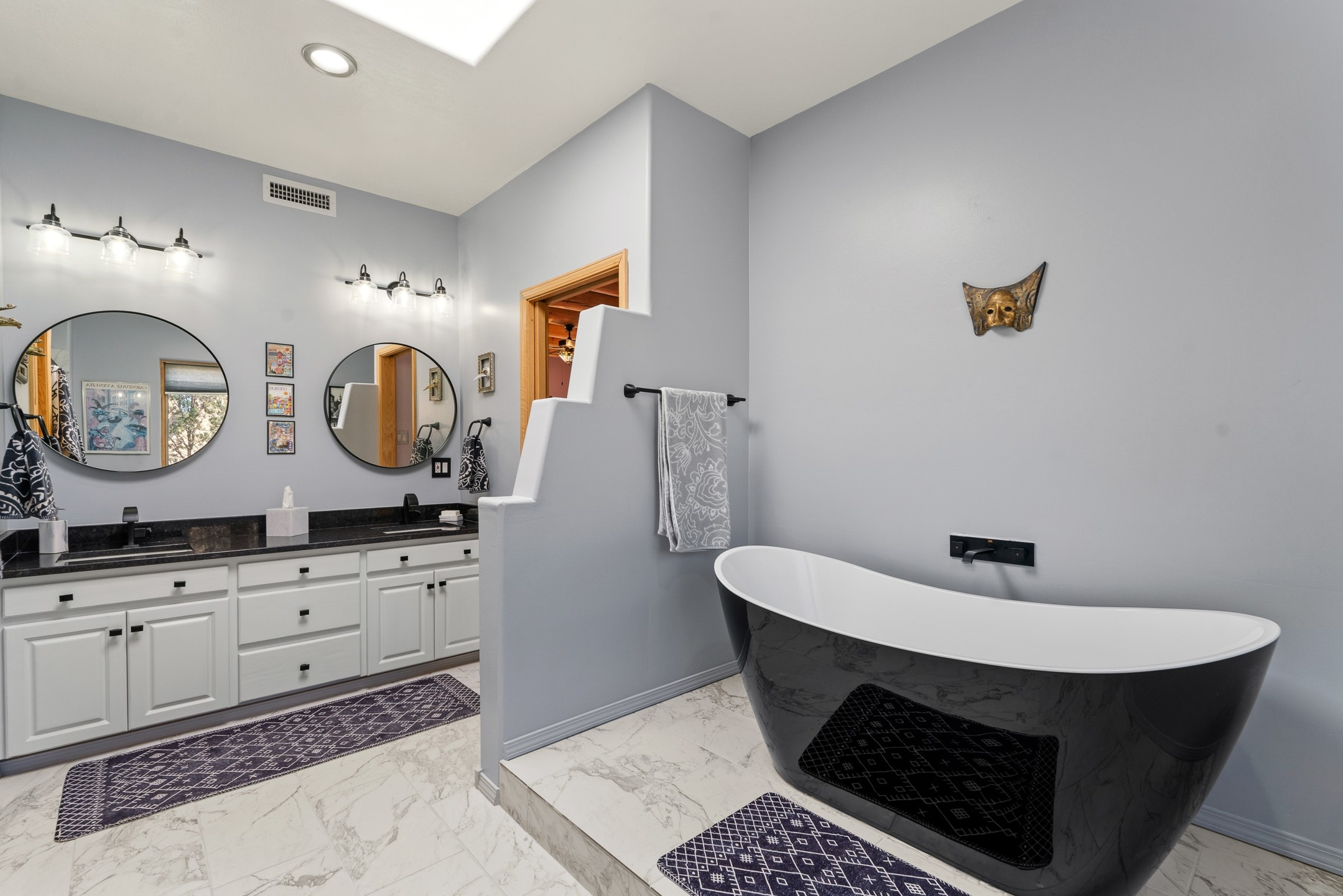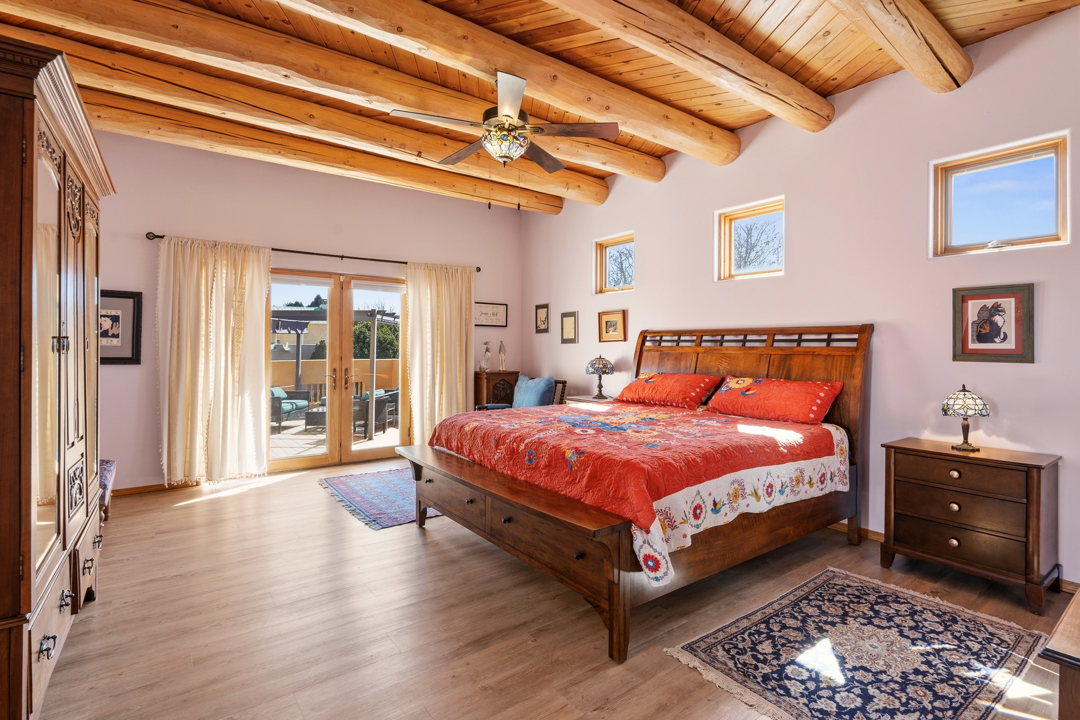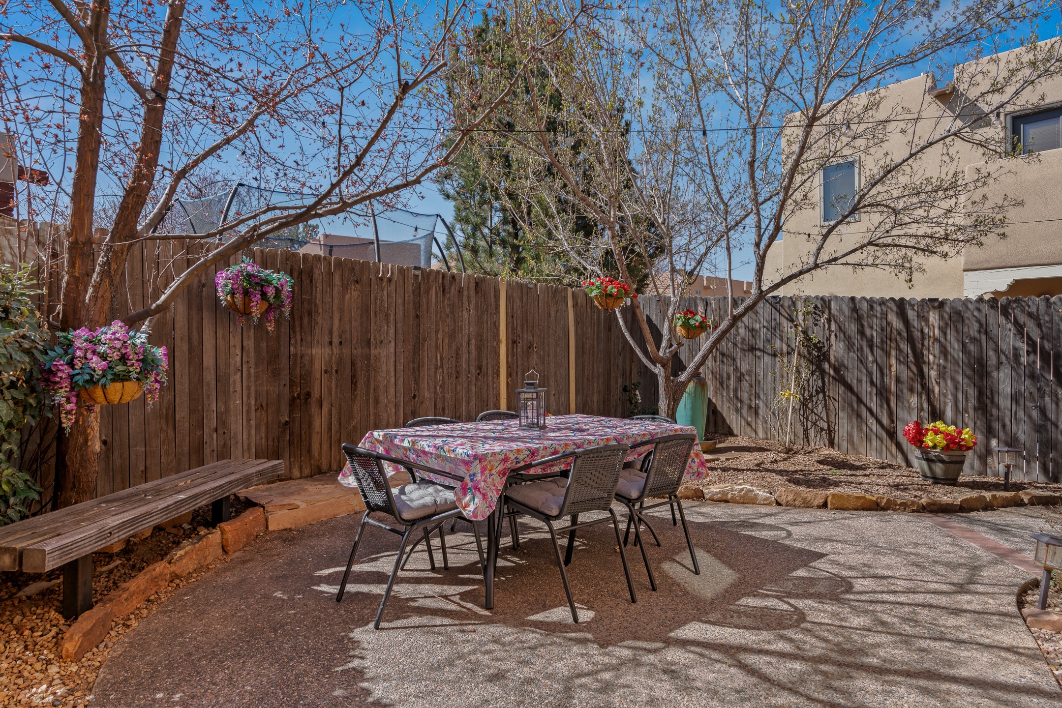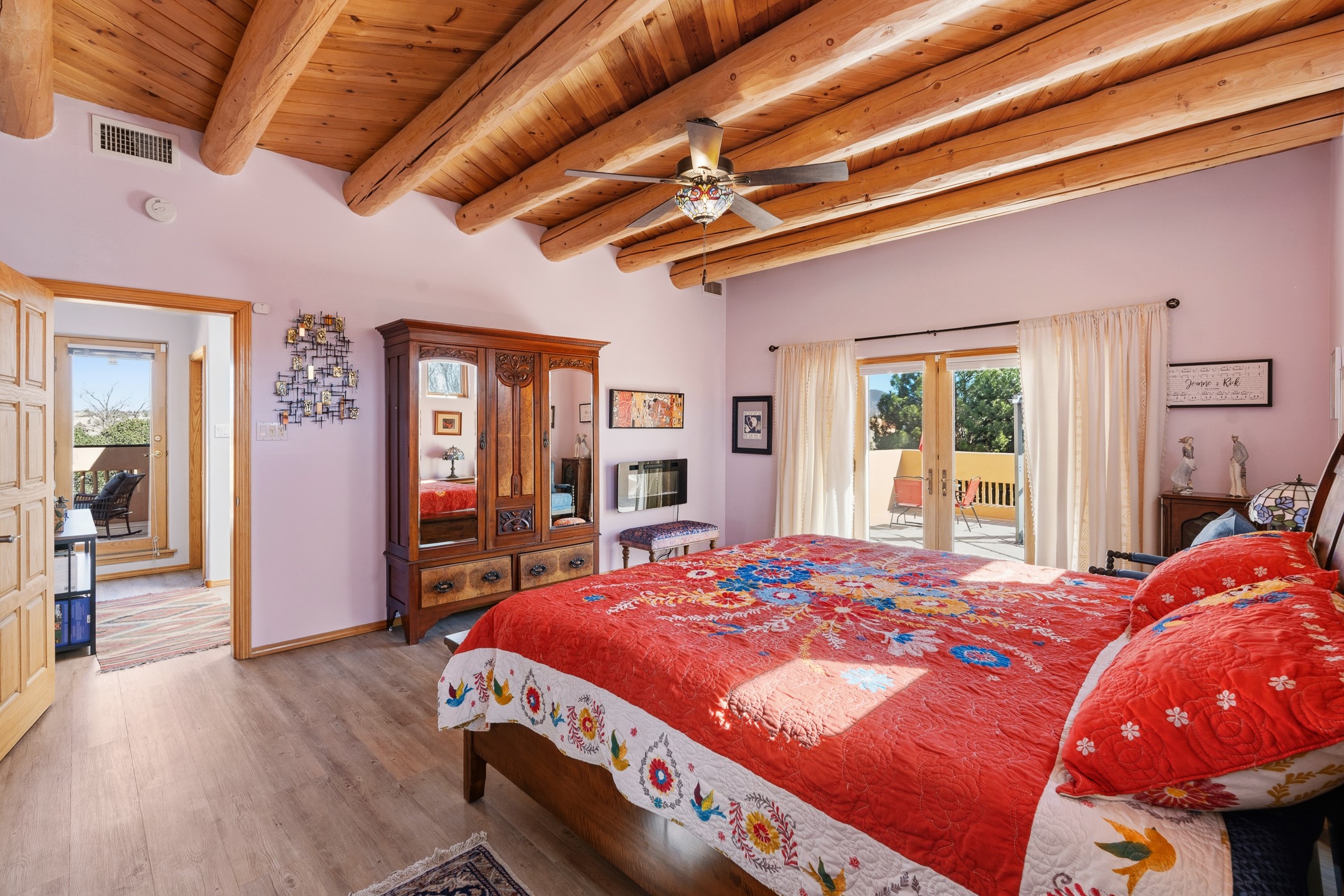 Experience authentic Southwestern charm in this beautifully maintained custom Santa Fe-style home. Built in 1995, with classic architectural details including stunning vigas and aspen latilla ceilings, tile flooring, two inviting kiva fireplaces, and custom built-in shelving in the dining room. The thoughtfully designed curved kitchen has been tastefully updated with new appliances, a stylish tile backsplash, wine fridge, and breakfast bar--creating an inviting space for both everyday living and entertaining.Comfort and efficiency are enhanced by four mini-split systems providing cooling in the summer and quick, efficient heat in cooler months.Outdoor living is equally impressive. A pergola-covered patio overlooks a beautifully enhanced backyard featuring mature landscaping, new side fencing, additional drip irrigation, and three private seating areas connected by flagstone patios and walkways--perfect for relaxing or gathering with guests.The home offers 3 bedrooms and 3 baths, including a convenient main-level bedroom with an adjacent accessible shower bath. The main level also features a spacious living room, dining area, and a cozy TV/sitting room with wood burning kiva fire place opens to the outdoor portal for effortless indoor-outdoor entertaining.Upstairs, you will find a large master bedroom suite with a remodeled bathroom featuring new tile flooring, a new tub, updated vanity and sinks, and a generous tiled shower with dual shower heads. Off of this bedroom is a deck with views of the Sangres. Upstairs is an additional ensuite bedroom which could be used as a second primary suite. There is a second upstairs deck off of this area. Additional features include abundant storage, 4 minisplits for cooling and a garage with a 220-volt outlet suitable for EV charging or workshop use.Filled with natural light and lovingly cared for, this exceptional Santa Fe home offers timeless character, thoughtful upgrades, and inviting indoor and outdoor living spaces.