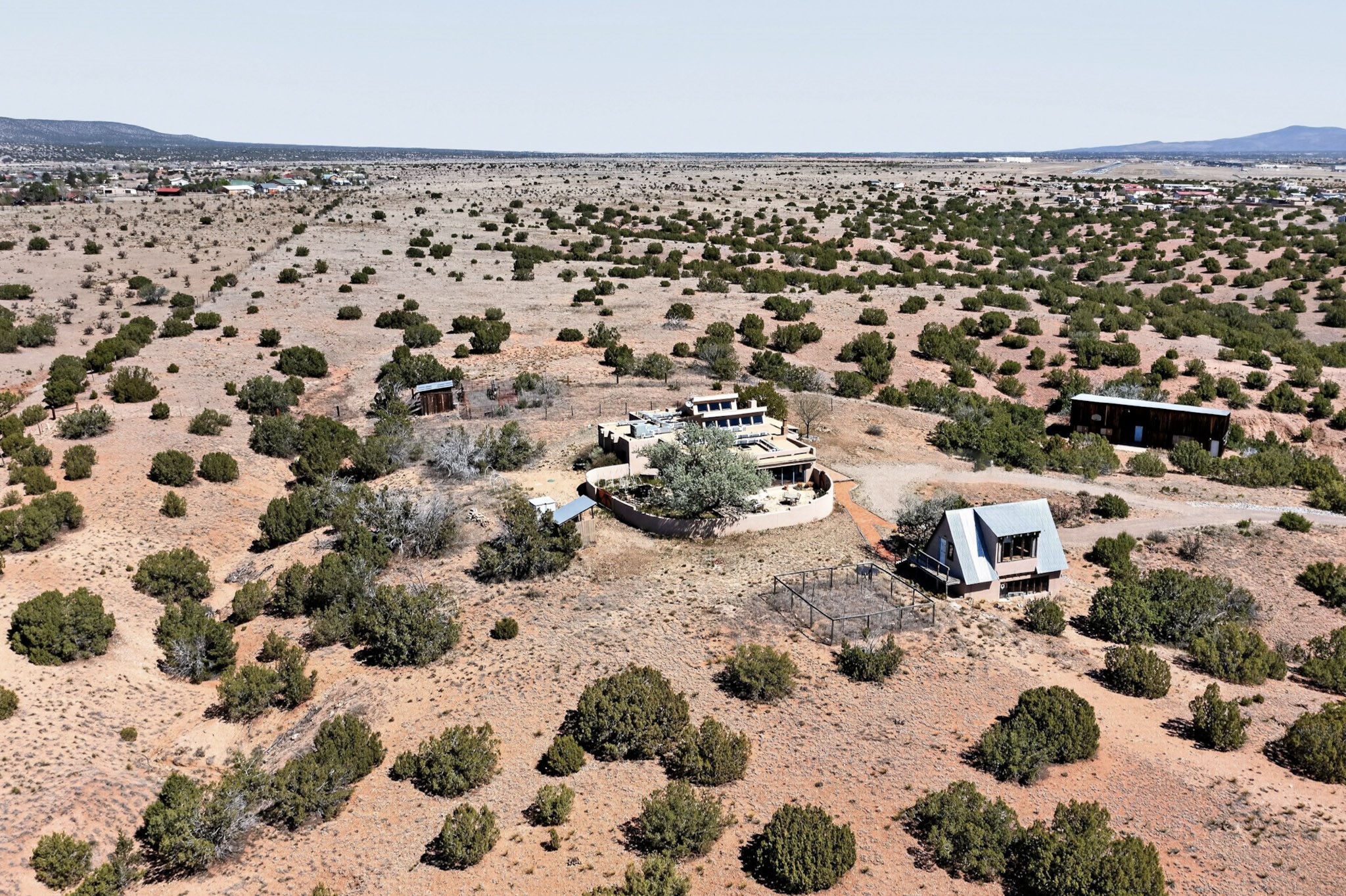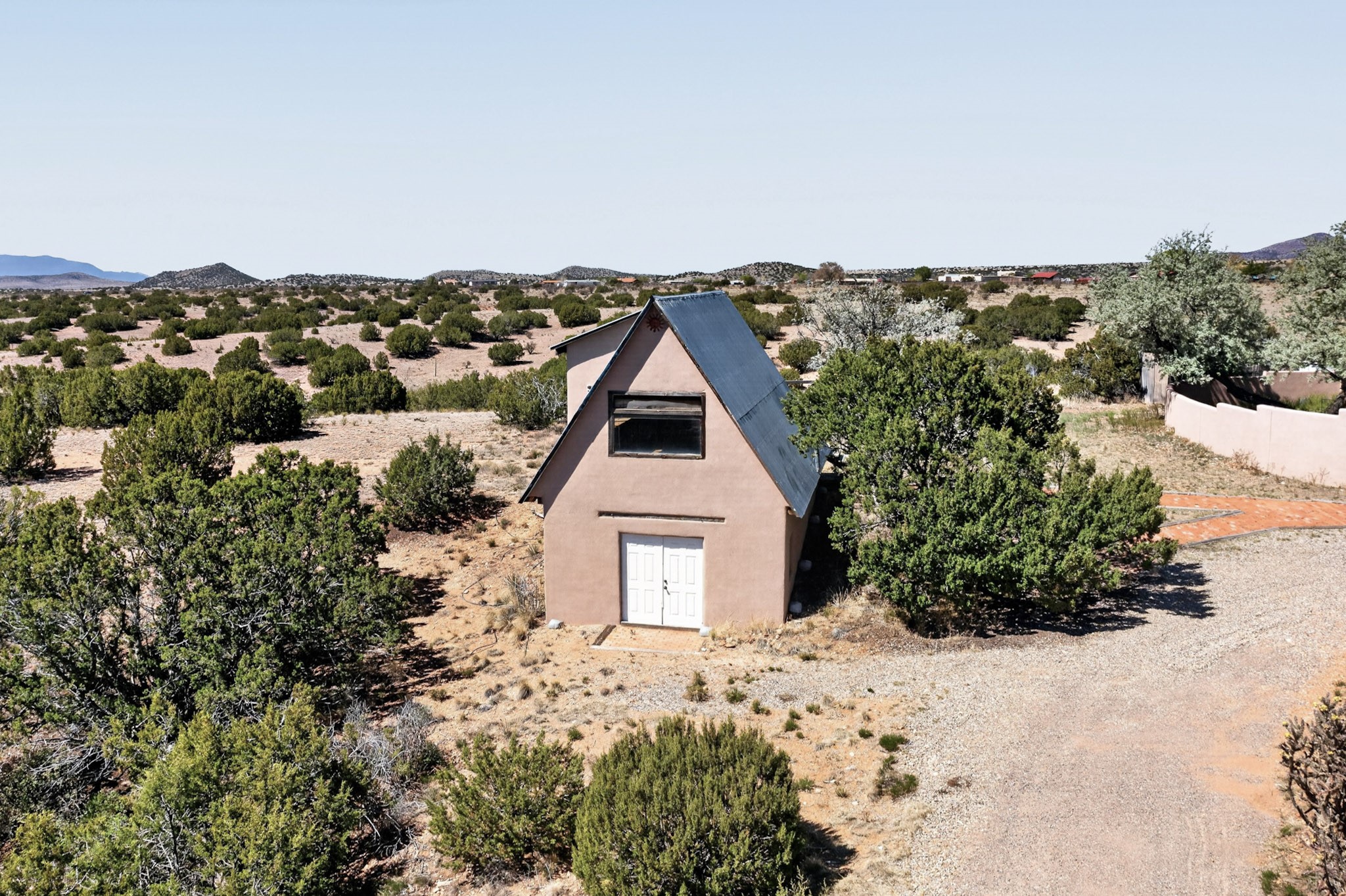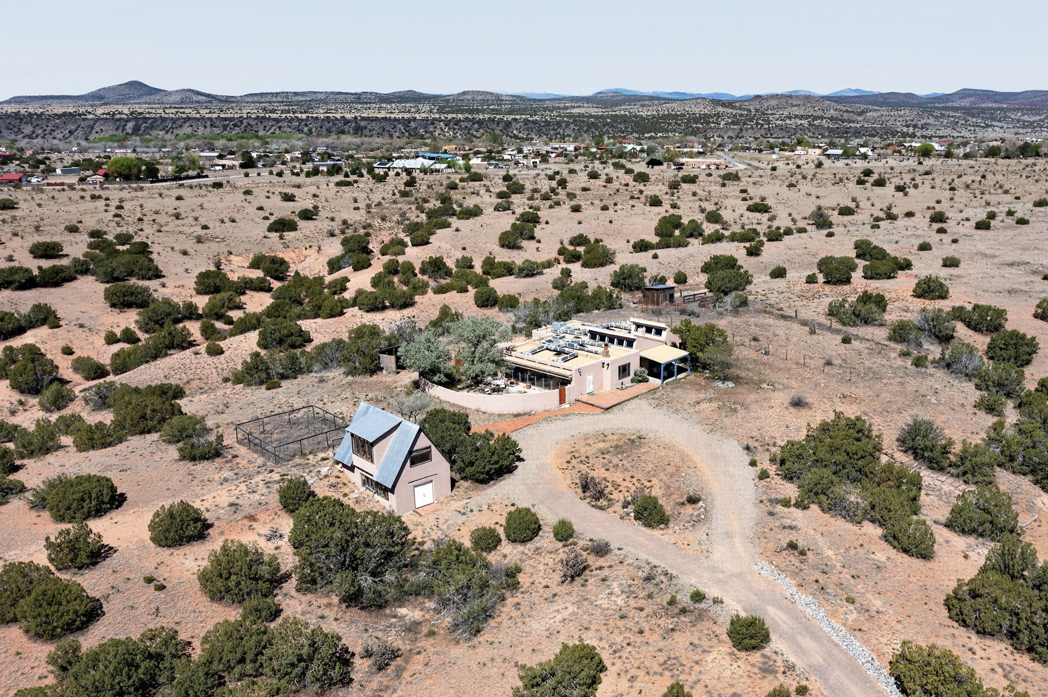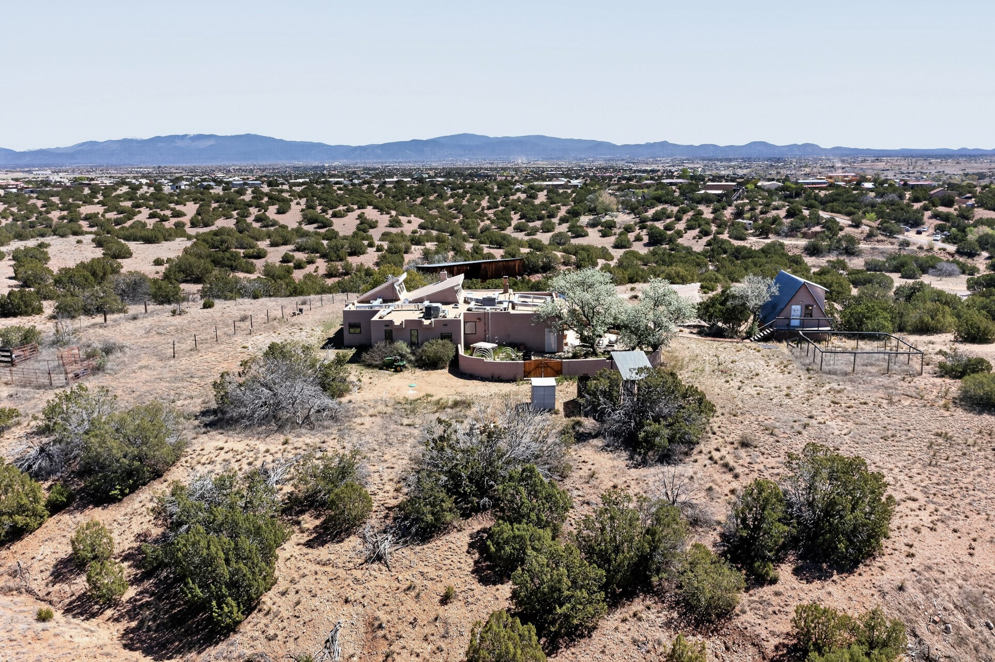 Set on 5 acres and just 20 minutes to downtown Santa Fe, this exceptional property offers breathtaking 360-degree mountain views and an ideal blend of comfort, versatility, and New Mexico charm. The 3-bedroom, 2-bath home includes a dedicated office, large sunroom flanked by a walled courtyard and is extensively renovated, showcasing quality, craftsmanship and thoughtful upgrades. Beyond the main residence, the property features a 1000 sq. ft. two-story studio, perfect for creative pursuits or a home business. Additionally, a 2,500 square foot outbuilding for a tradesman or large workshop with ample parking. For the horseman, rancher or privacy seeker, there is a contiguous, transferable, fenced 40-acre land lease from the NM Land Commissioner at a $50 yearly rent. Horses can run free to graze. The beautifully updated kitchen features custom maple wood cabinetry, copper sink, large center island with seating, granite countertops, and premium appliances: a six burner 42" Wolf gas stove with grill and double oven along with Sub-Zero. The spacious primary suite offers a luxurious bath complete with dual steam/shower for two, jetted tub with granite surround, travertine tile walls, vanity with granite-top and updated fixtures plus a custom solid hardwood closet system. Additional improvements include hickory wood flooring throughout, Pella triple-pane windows, solid alder wood interior doors, and an upgraded laundry room with maple cabinetry, granite counter and slate tile flooring. This home has underground electric and natural gas, a newer septic, private well with 3-acre feet of water registered with NM State Engineer, newer bitumen roof and two-zoned forced heat/refrigerated air for year-round comfort & instant tankless water heater. Permission for future stables or other structures on the leasehold can be had with the investment cost returnable. This property offers a rare opportunity to enjoy peaceful rural living with easy access to Santa Fe's amenities