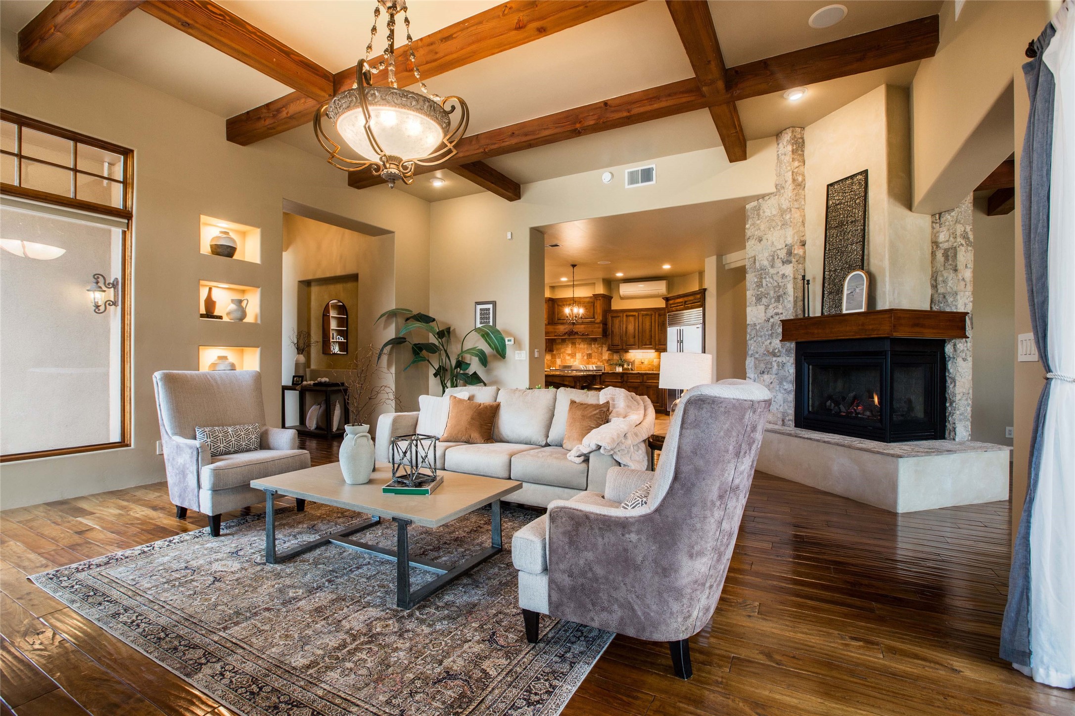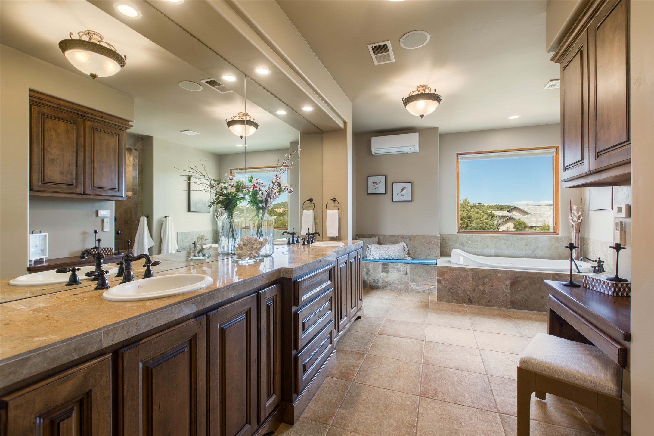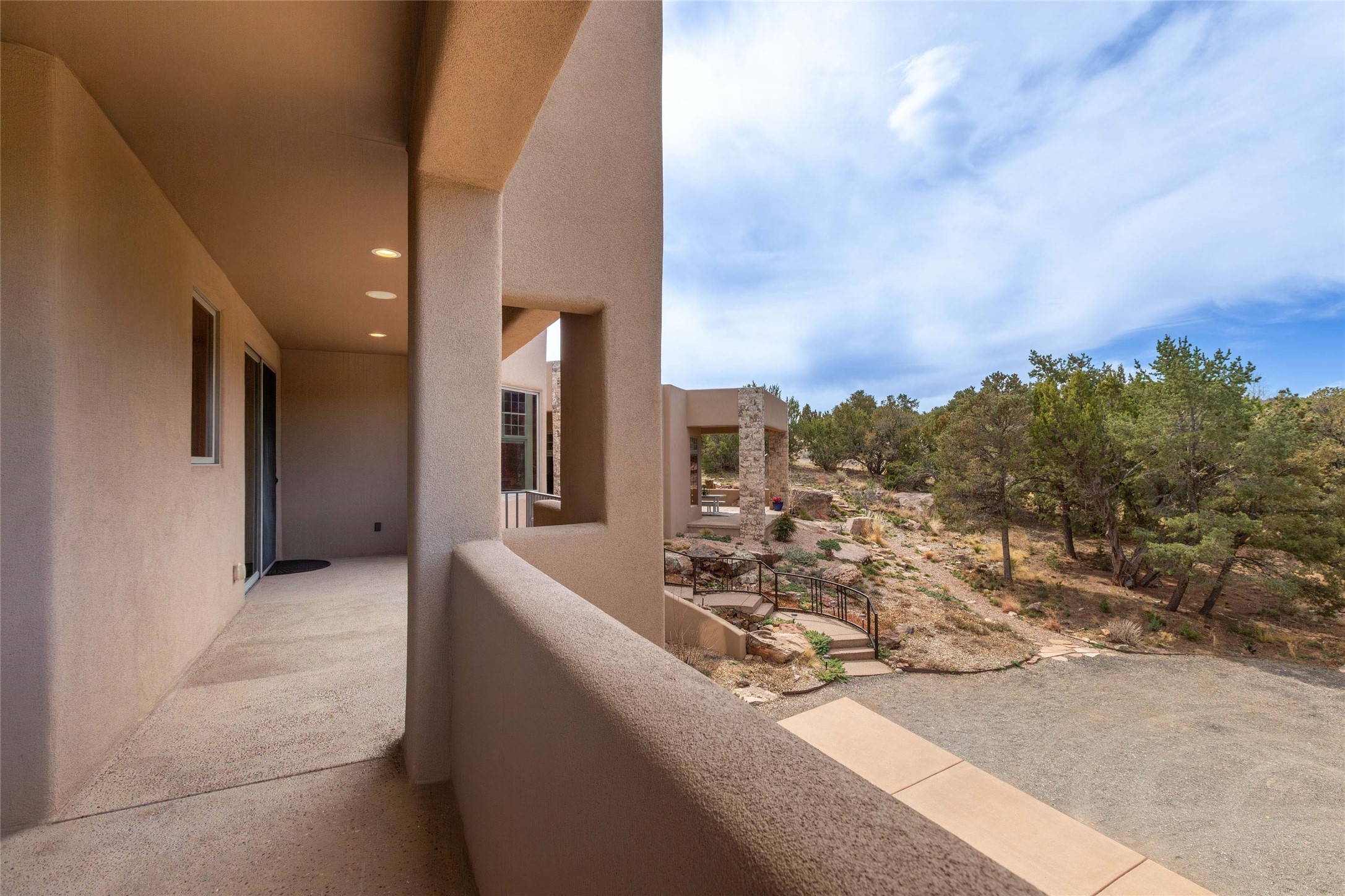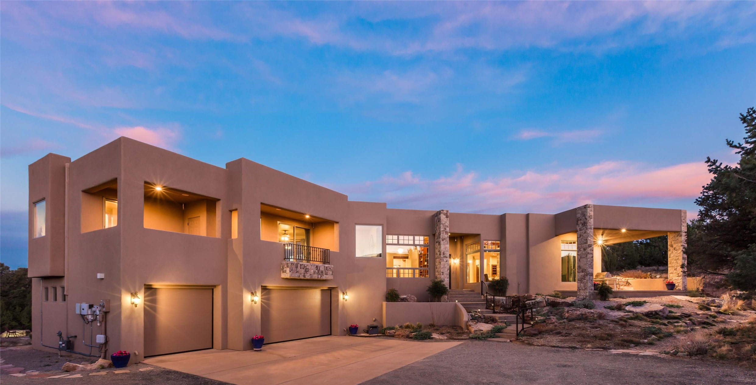 OPEN HOUSE 3-15 from 2-4pm. The outside and the inside meet in this superb warm Contemporary design. Wood, stone and glass elements and views from every room. Custom Harwell home; nestled in Paa-Ko with breathtaking Sandia and Placer Mountain views. Soaring ceilings with elegant wood beams, striking travertine accent walls, a multi-sided gas fireplace, and hand-scraped cherry hardwood floors. The gourmet kitchen boasts custom knotty alder cabinetry, and Wolf & Subzero pro-style appliances. Elegant dining room flanked by a fireplace one one side and large windows on the other is an inviting space and is separated from the kitchen by a convenient wet bar. Plush primary suite, in its own wing for ultimate privacy, offers a coffee bar, gas fireplace, sitting rm,spa-like bath, and private balcony. A gorgeous library features custom wood floor-to-ceiling shelving makes an excellent office. Two additional bedrooms on the opposite side of the home with a large full bath between. Enchanting outdoor spaces include a covered patio, courtyard, nature trail, and water features. Oversized 3-car garage. Owned Solar. The Paa-Ko community features a renowned golf course and a golf club with beautifully situated restaurant overlooking the course with the pond and mountains in the background. Additionally, there is a community pool, tennis courts and clubhouse. All of these amenities are within walking distance of the home. Living in this home is truly living New Mexico.