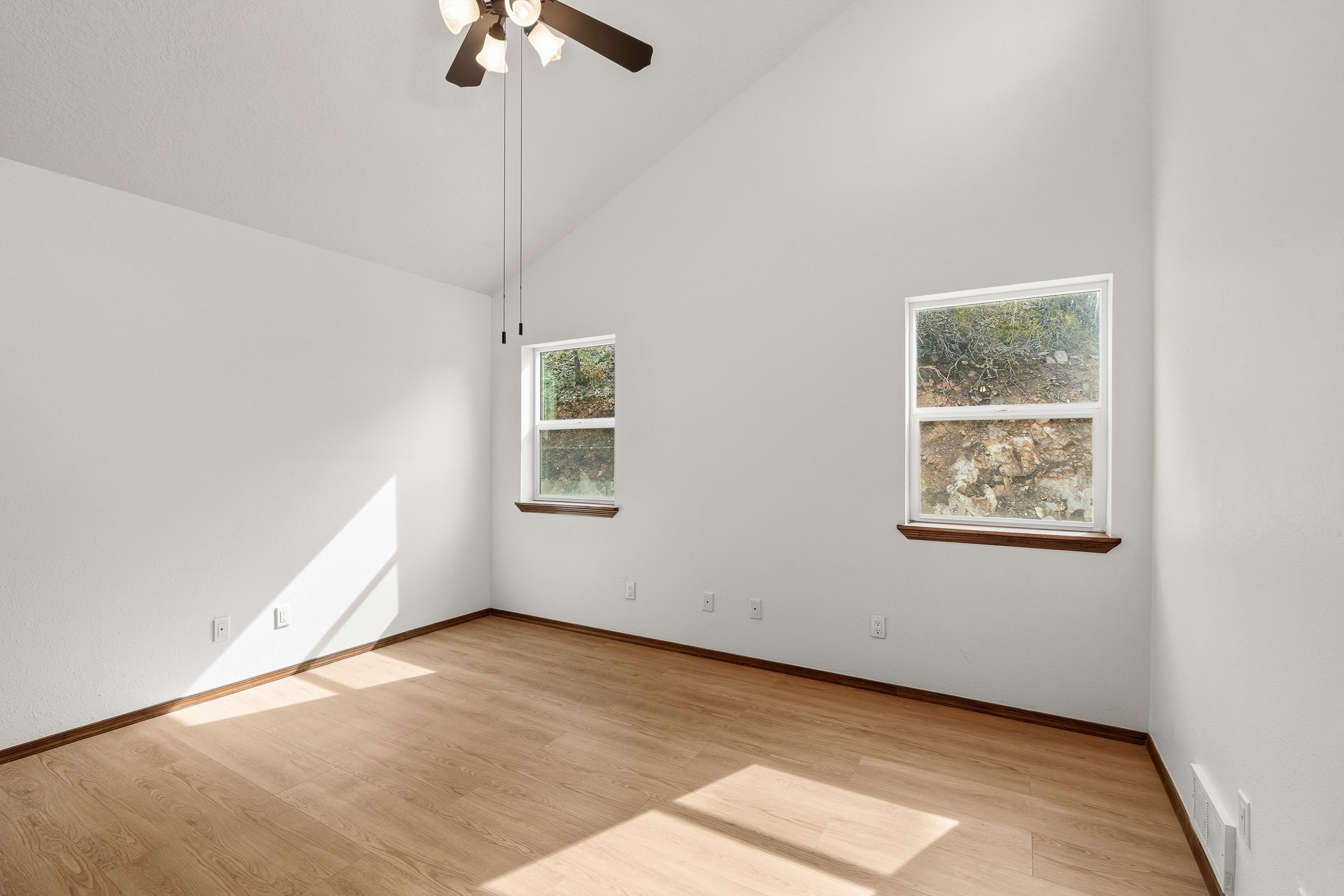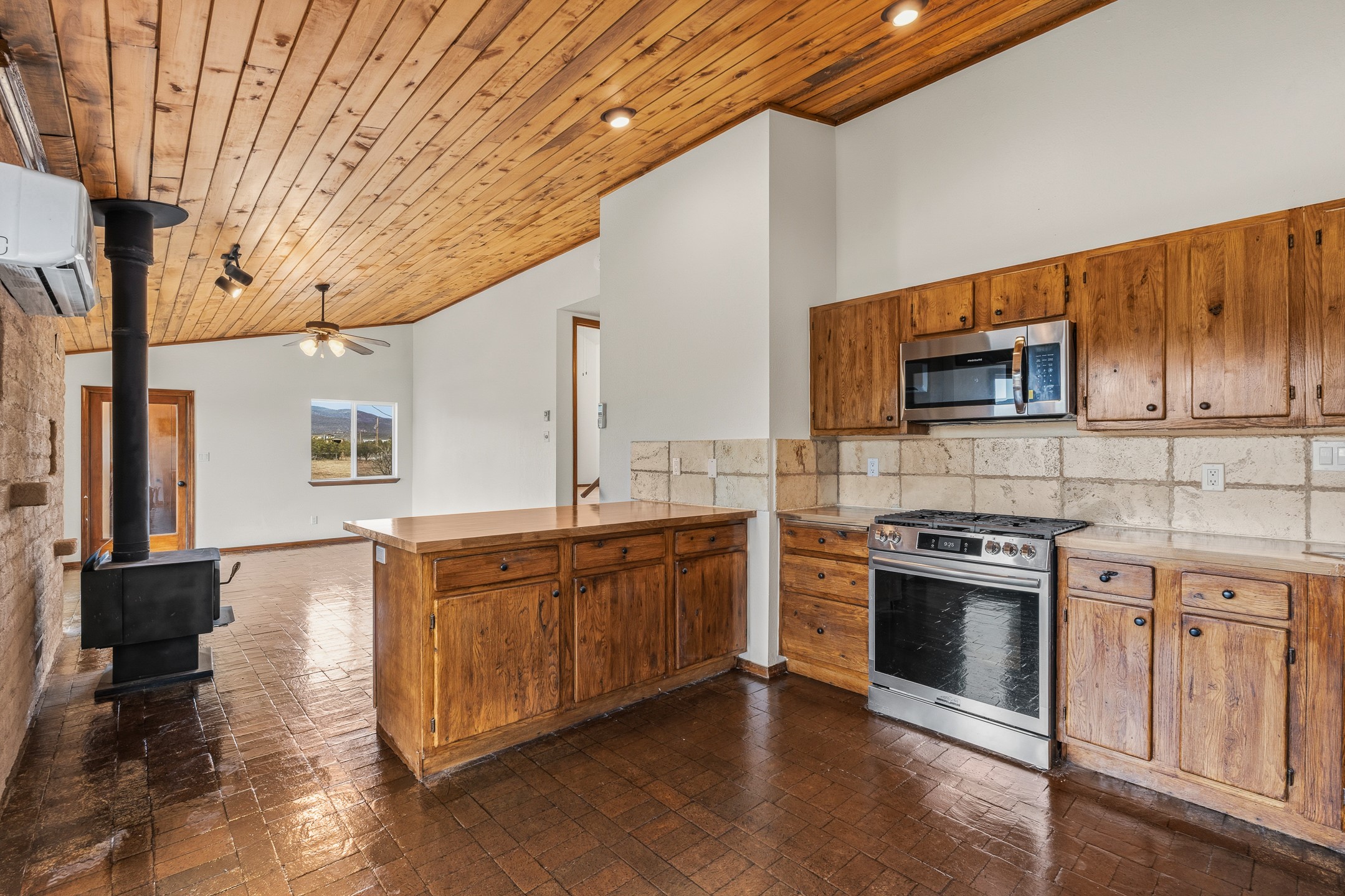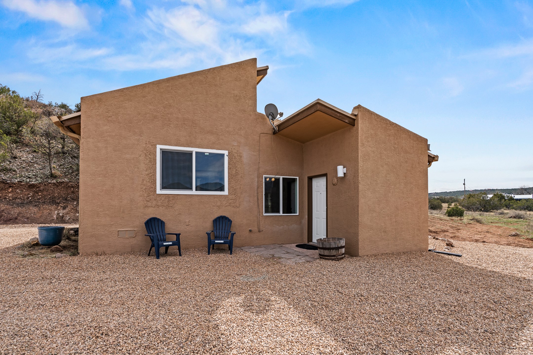Just updated! Open floorpan, two bedroom, one bath home, sited on an elevated two acres twenty minutes from Albuquerque in Sandia Park. So much is new, including propanel roof, new windows, new kitchen appliances, kitchen counters, mini-split, updated bathroom, bedroom flooring. Designed for energy efficiency and passive solar, with a large south-facing window to take in views, a trombe wall to store heat, and a wood stove anchoring the high-ceilinged living areas. Move-in ready.