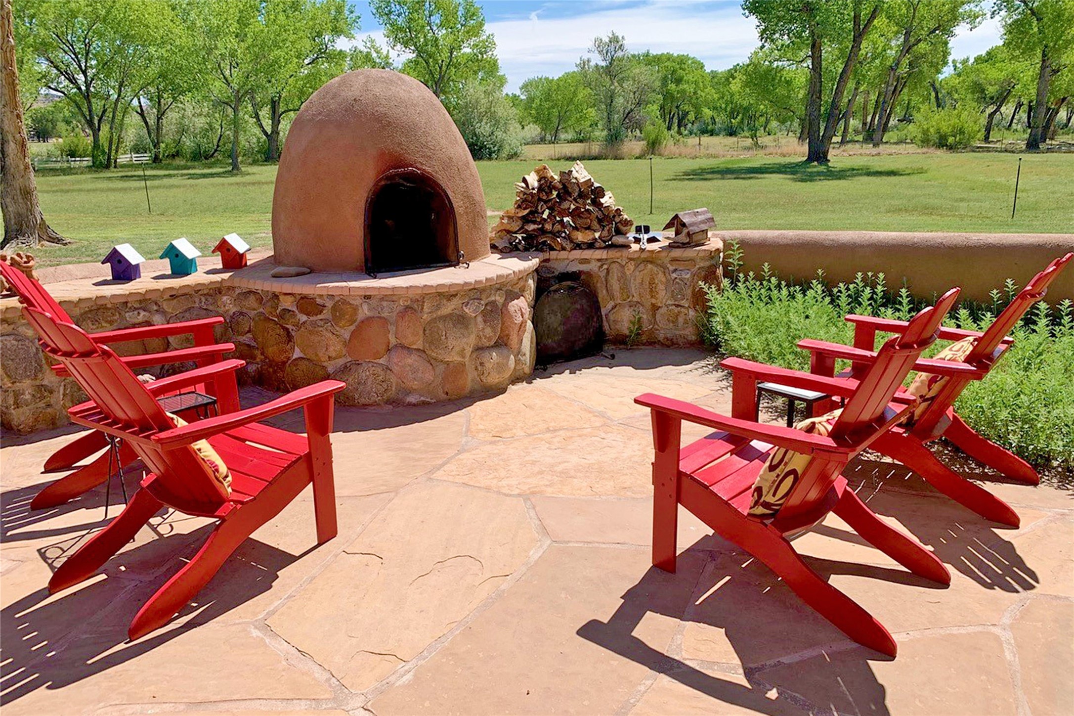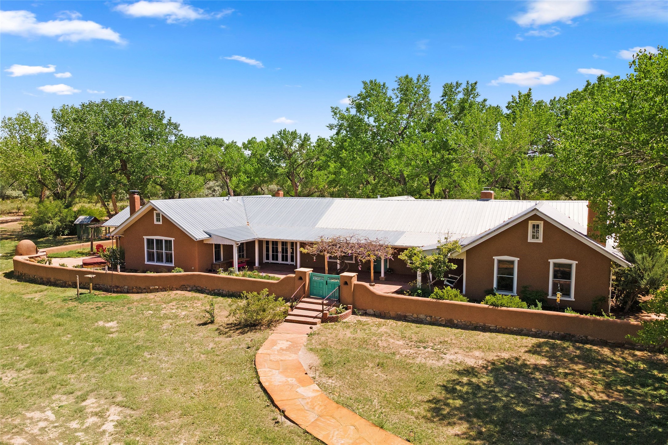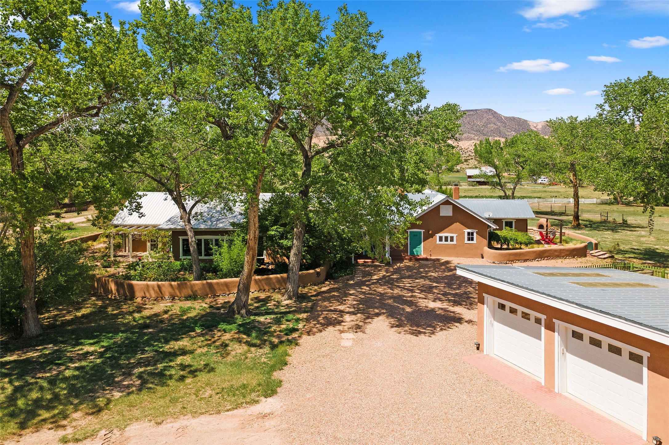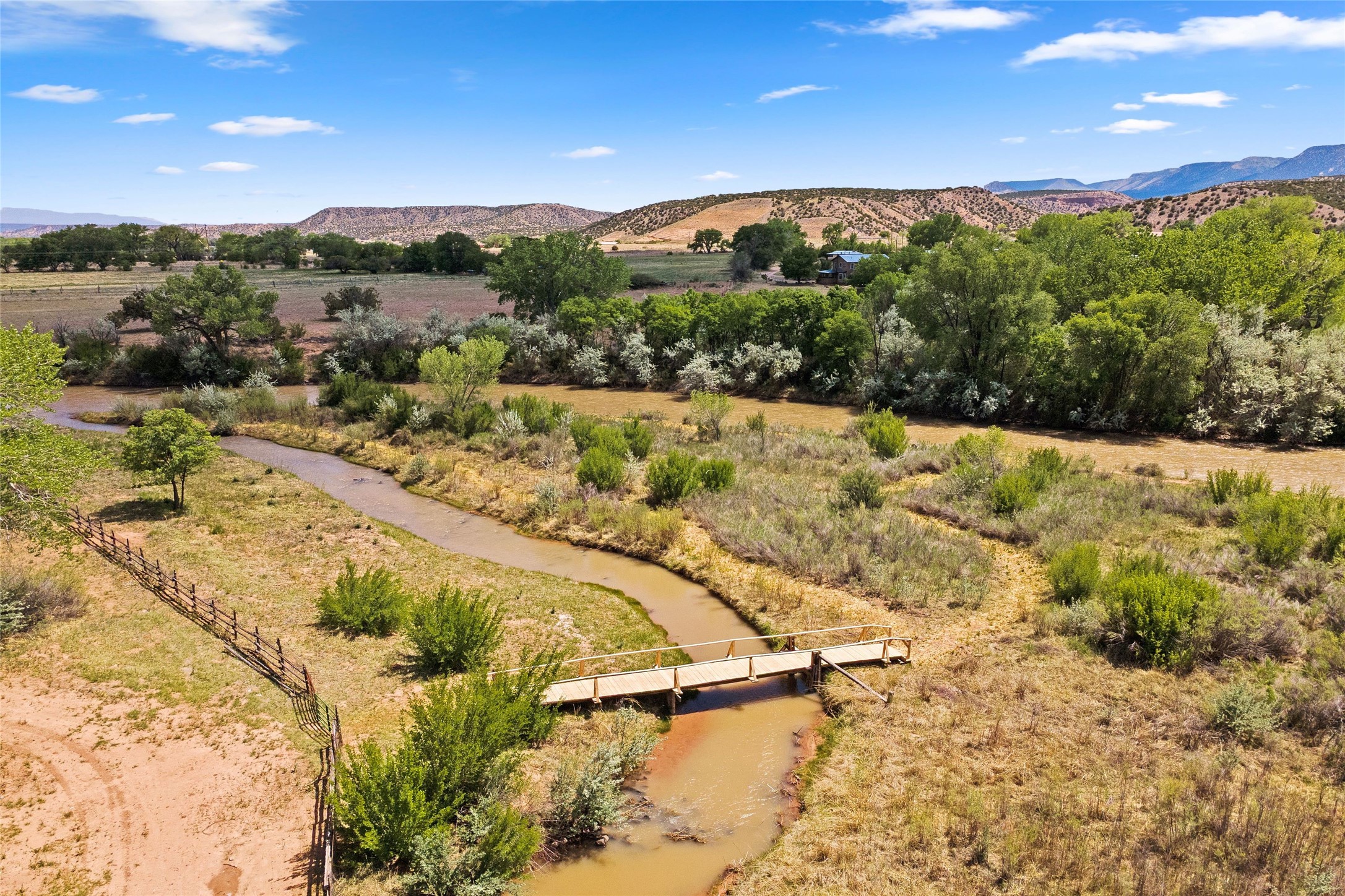 Set along the tranquil banks of the Chama River, this exceptional private estate captures the extraordinary beauty of northern New Mexico's landscape--with panoramic views of colorful canyons and mesas immortalized in the paintings of Georgia O'Keeffe. Shaded by majestic cottonwoods and thoughtfully positioned on 20 acres of fertile pastureland including a small vineyard, the residence offers gracious sanctuary. Northern New Mexico style main home features soaring vaulted ceilings, exposed beams and vigas, brick floors, multiple fireplaces, hand-carved wooden doors, and expansive living spaces that blend warmth, craftsmanship, and timeless regional character. At the heart of the home, an open chef's kitchen--ideal for both intimate living and elegant entertaining. The secluded primary suite provides a peaceful retreat with an ensuite bath and adjoining sun-filled study, opening onto a private courtyard patio. Additional bedrooms each feature their own baths and direct outdoor access, offering guests both comfort and privacy. A fully equipped modern casita provides luxurious accommodations for visitors, artists, or extended stays, with its own inviting outdoor spaces. Outdoor living unfolds across beautifully designed grounds with covered flagstone portals, courtyard gardens, and multiple seating areas that invite relaxation and celebration. Amenities include a traditional horno oven, grill, jacuzzi spa, tree-lined pond, and a fire pit--where the current owners have hosted memorable annual oyster roasts beneath expansive New Mexico skies. A private bridge crossing a fork of the river adds a distinctive and enchanting element to the property. For equestrian and agricultural pursuits, the estate includes a large, lofted barn, corrals, livestock pens, and a chicken coop. The fully fenced acreage benefits from two private wells and valuable water ditch rights, supporting both the vineyard and pastureland. This remarkable property offers a rare combination of luxury living, agricultural potential, and authentic Southwestern character, while serving as a gateway to the region's renowned natural and cultural landmarks, including Plaza Blanca, Christ in the Desert Monastery, Ghost Ranch, Georgia O'Keeffe Home and Studio, Abiquiu Lake, and Echo Amphitheater.