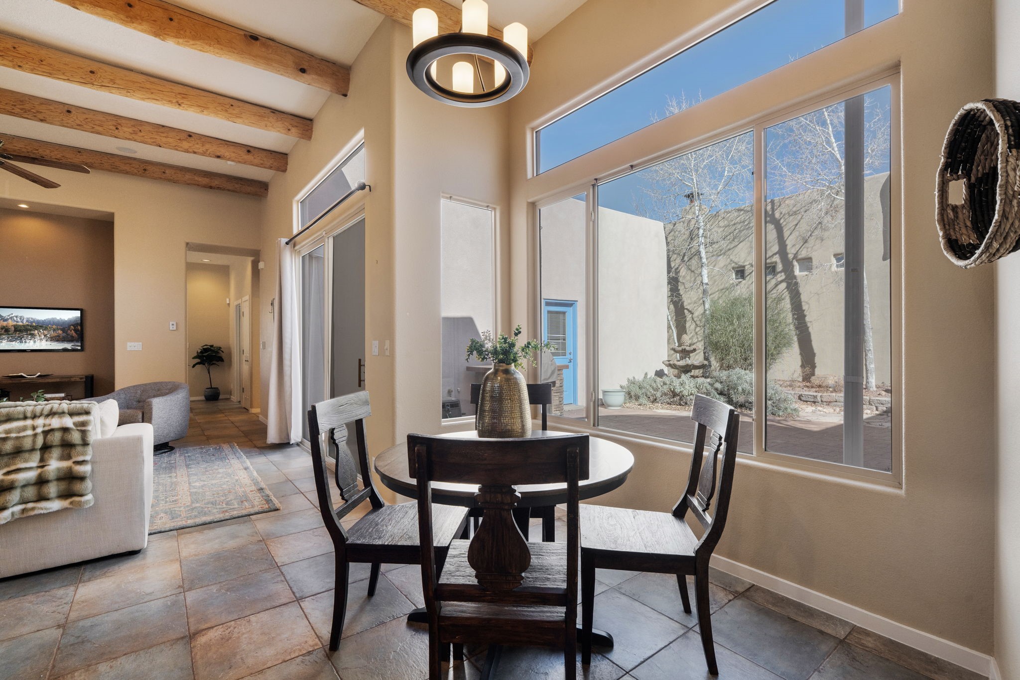Seller financing available for this gorgeous cozy single-story home in desirable Rancho Viejo, just a couple homes from a park. Three bedrooms, an office, and a bonus room for exercise or play. The home surrounds a private courtyard, accessible from the great room or the primary suite, with a bubbling fountain for serenity. The circular dining room adds sophistication to entertaining, and the private master suite is truly a retreat. A built-in Murphy bed is so efficient in one of the guest bedrooms. Open floor plan with upgraded cabinetry, granite countertops, and stainless appliances. Enjoy a glass of wine in front of your custom fireplace. Take advantage of the paved walking trails, parks, and community amenities. Many upgrades: Roof (2024), stucco (2024-2025), high efficiency boiler (2024). Fresh paint, and new carpet (2026) in the primary suite. Radiant heat and tankless water heater! This home is bathed in natural light, and lends itself to display wonderful art. Move-in ready!