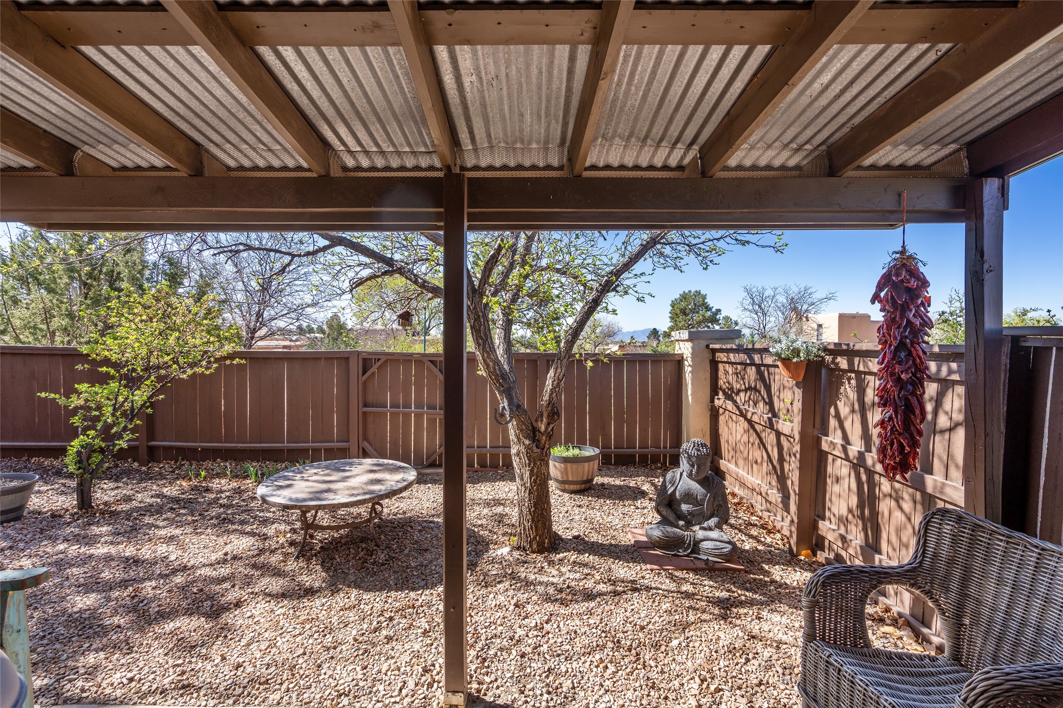 y: Enjoy your morning coffee or tea in the charming south-facing sunroom of this beautifully updated Park Plazas end-unit gem. This single-level Santa Fe home features recently installed wood-laminate flooring, a brand-new A/C system, and a modernized walk-in shower. The home offers two spacious bedrooms and a fully updated kitchen with all new appliances. Stay cozy during the colder months with the inviting wood-burning stove, perfect to warm winter days and nights. Additional highlights include a two-car garage and community open space beside the fenced backyard. This property truly has so much to offer--Come See!