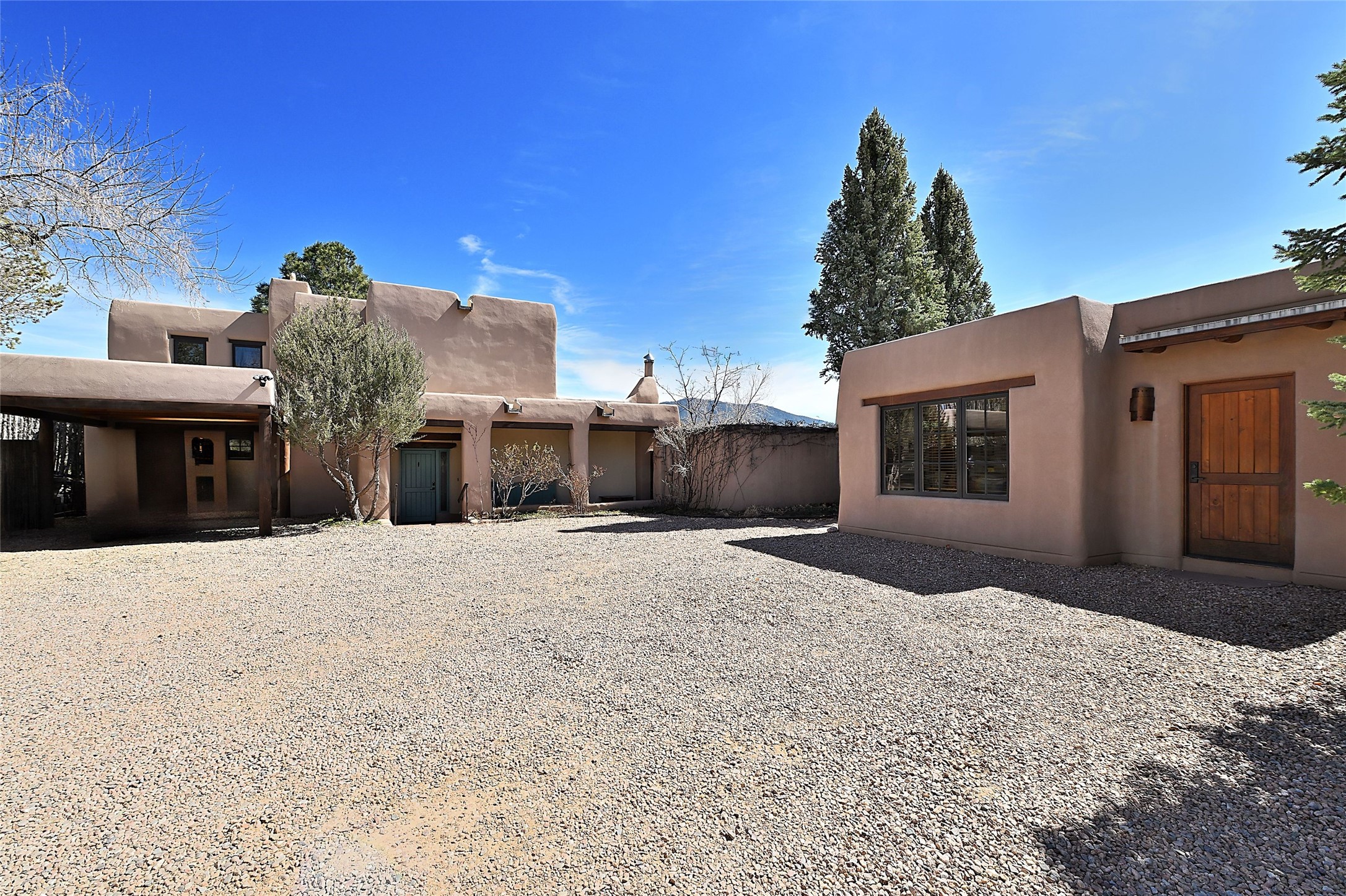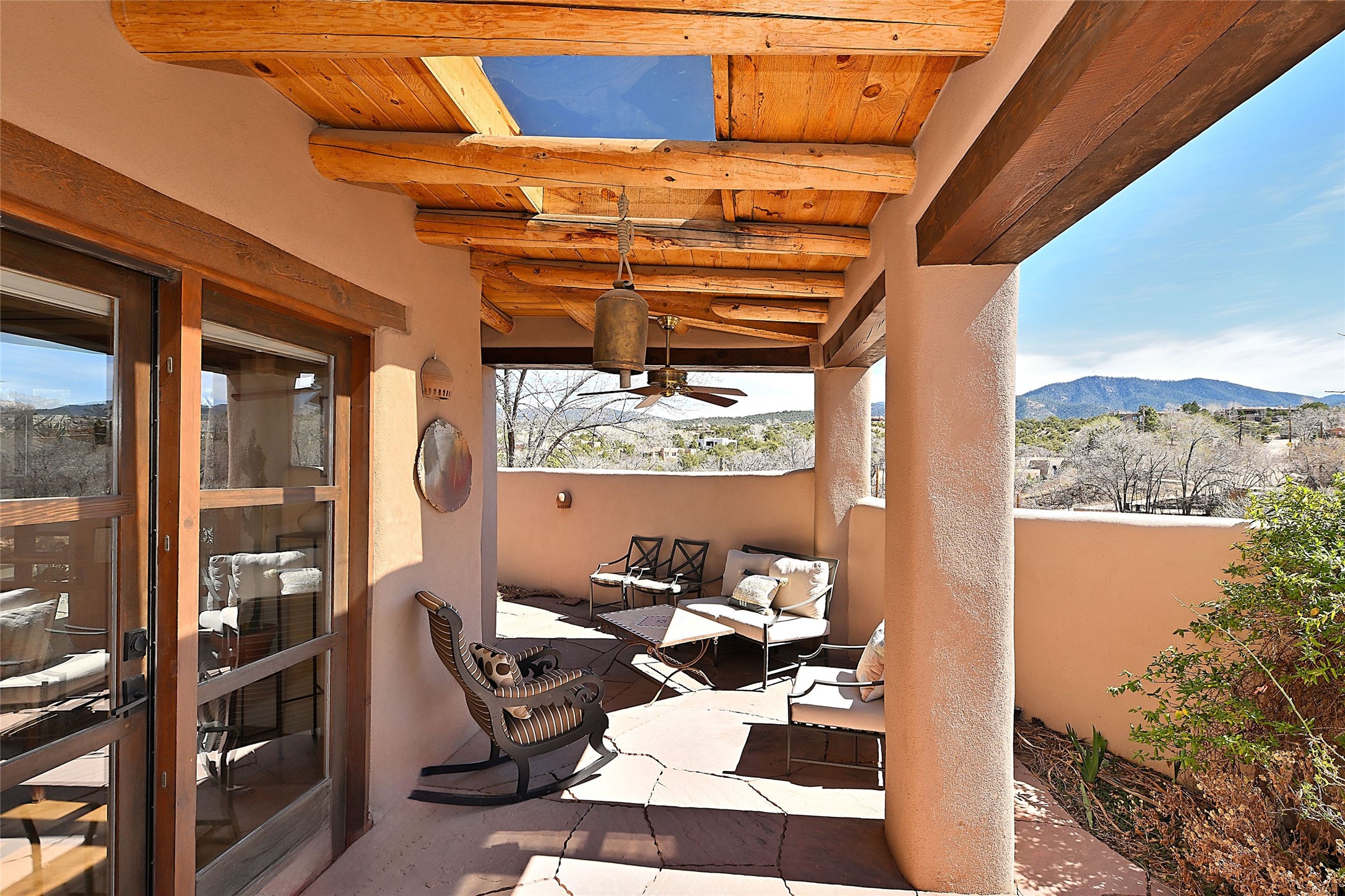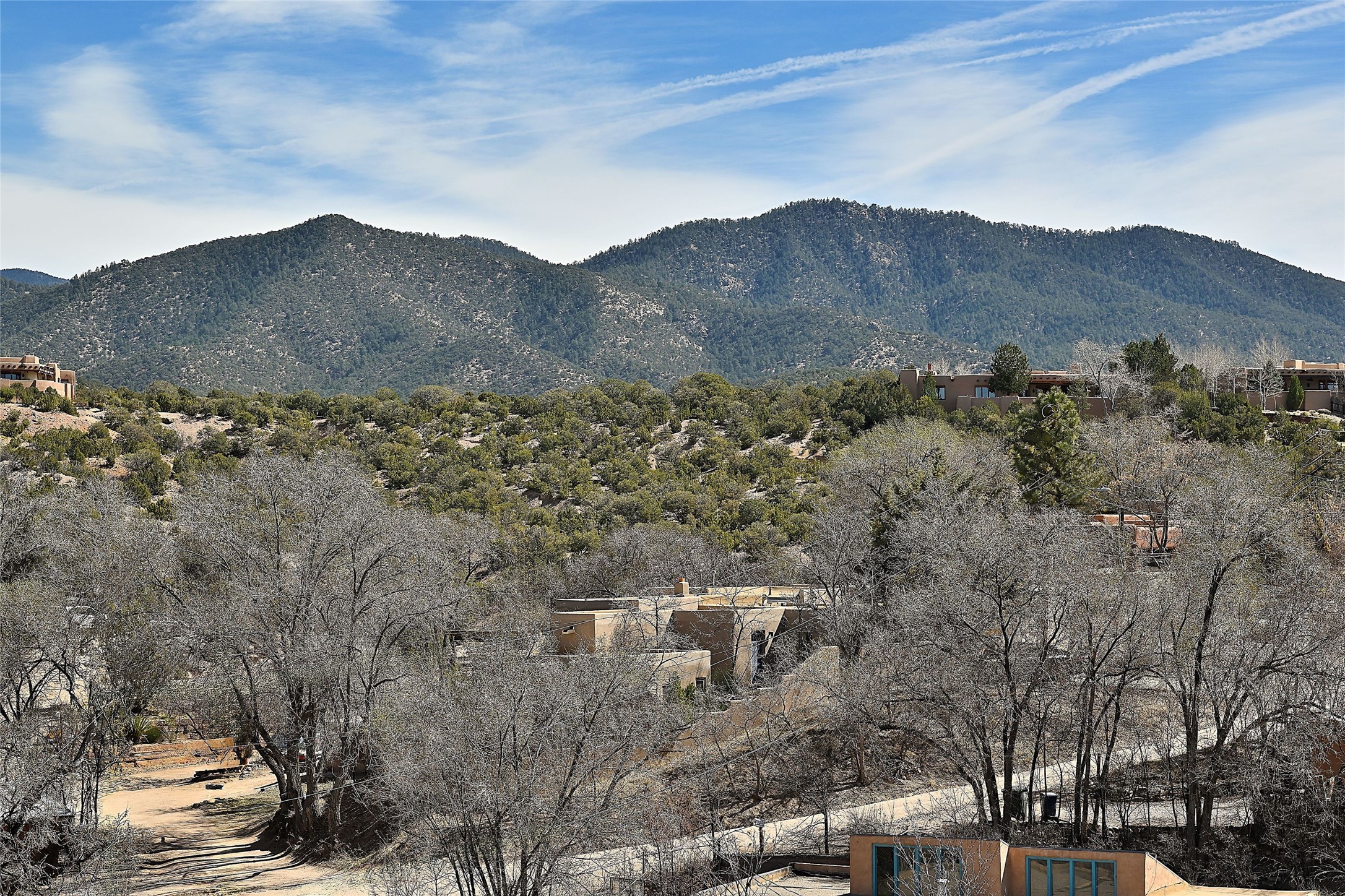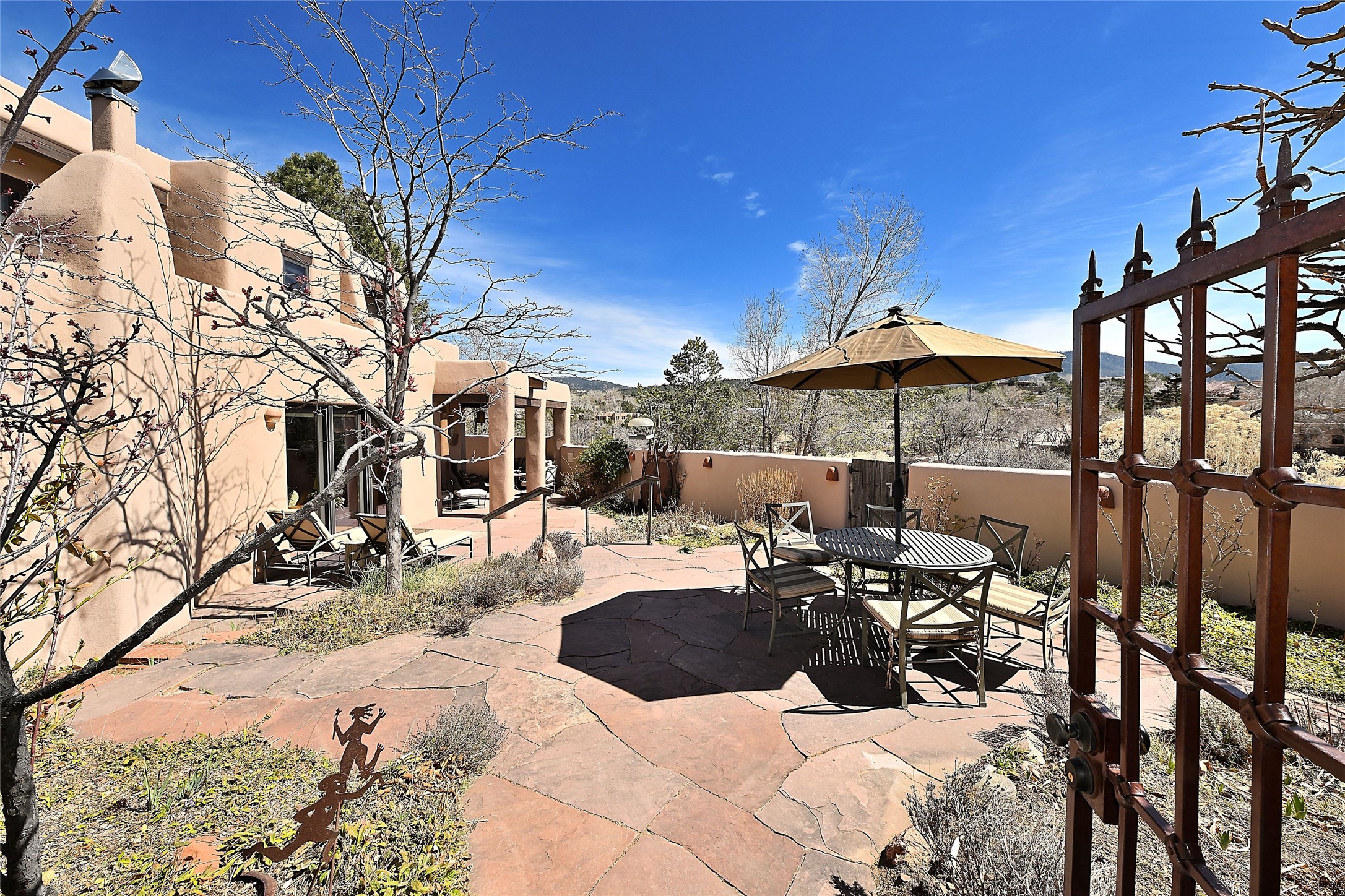 One of only two homes on a quiet cul-de-sac off an iconic winding Eastside lane, this hilltop hideaway enjoys an enviable private perch with a view of historic rooftops, mountains and foothills, and clear blue skies. The property's gated drive ascends to a spacious parking area that accompanies a three-bedroom home with a carport and an idyllic courtyard, a generous guest casita, and a versatile light-filled studio. The main residence marries stylish living, dining, and entertaining spaces with a cook's kitchen, a rare greenhouse or solarium, a main-level guest bedroom and bath, an upper-floor guest bedroom with a balcony, and an owner's suite that includes a sitting room or library with a foothills-facing balcony and a spa-inspired bath with a "wet room" tub and shower. Ceiling beams and vigas, colorful tilework, kiva fireplaces, numerous skylights and French doors, and warm earthy hues contribute to the sophisticated Southwestern ambience. The landscaped courtyard features a flagstone terrace, a portal, and a picturesque view. The separate studio will delight artists but can also serve as a workshop, fitness, or meditation space. Short- or long-term guests will appreciate the lofty bedroom and living space of the casita, which also offers a well-outfitted kitchen, a fashionable bath, and a laundry area. The coveted location is walking distance from the Plaza, Canyon Road, and other attractions and amenities of downtown and the historic Eastside.