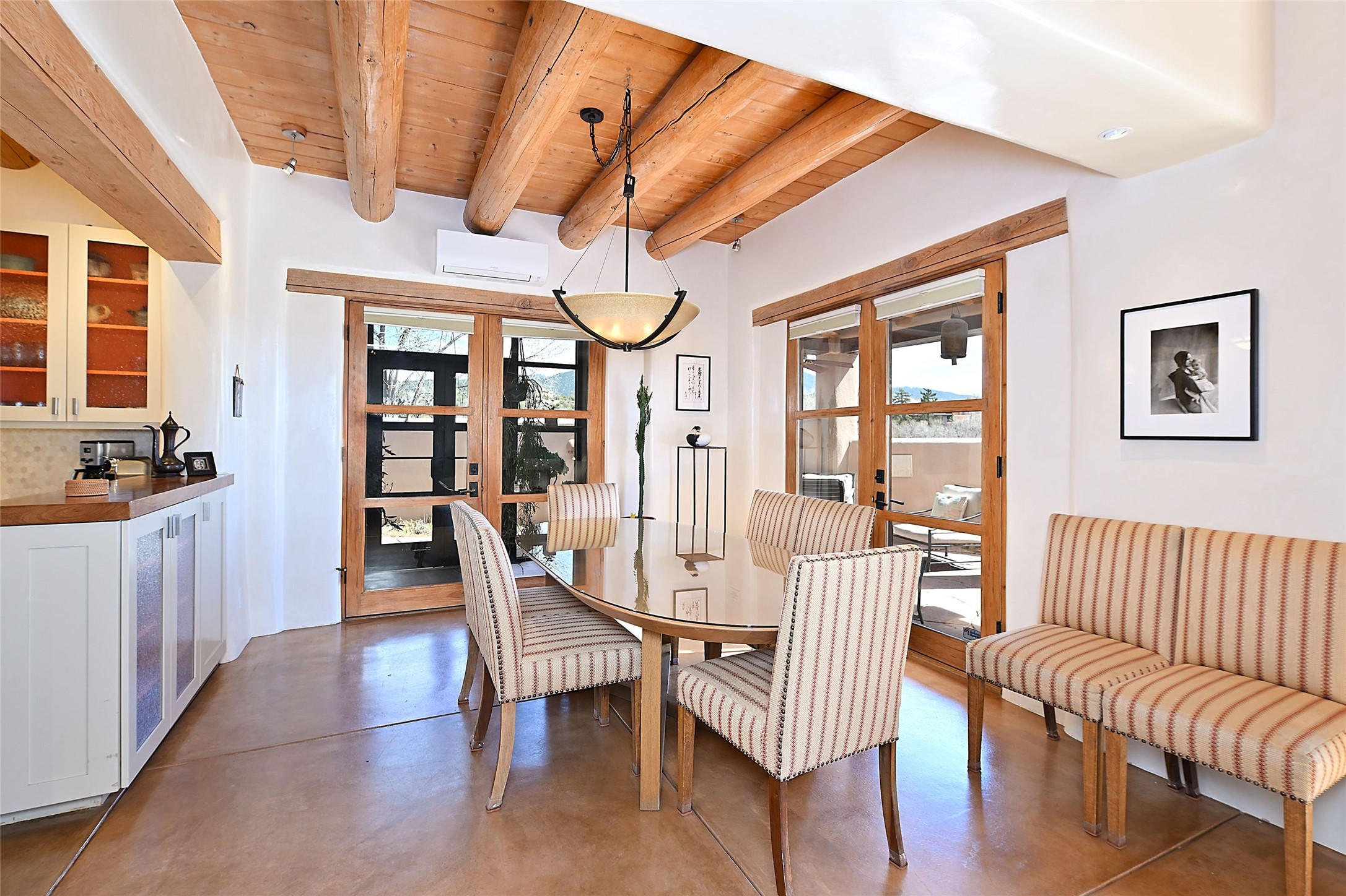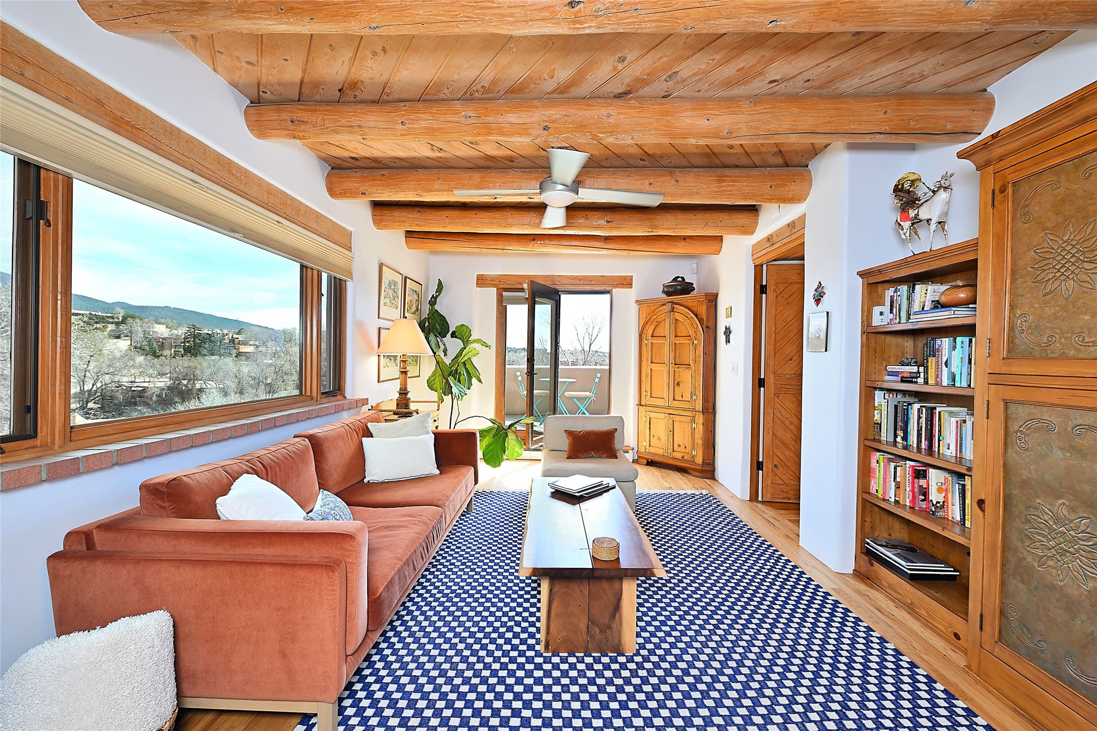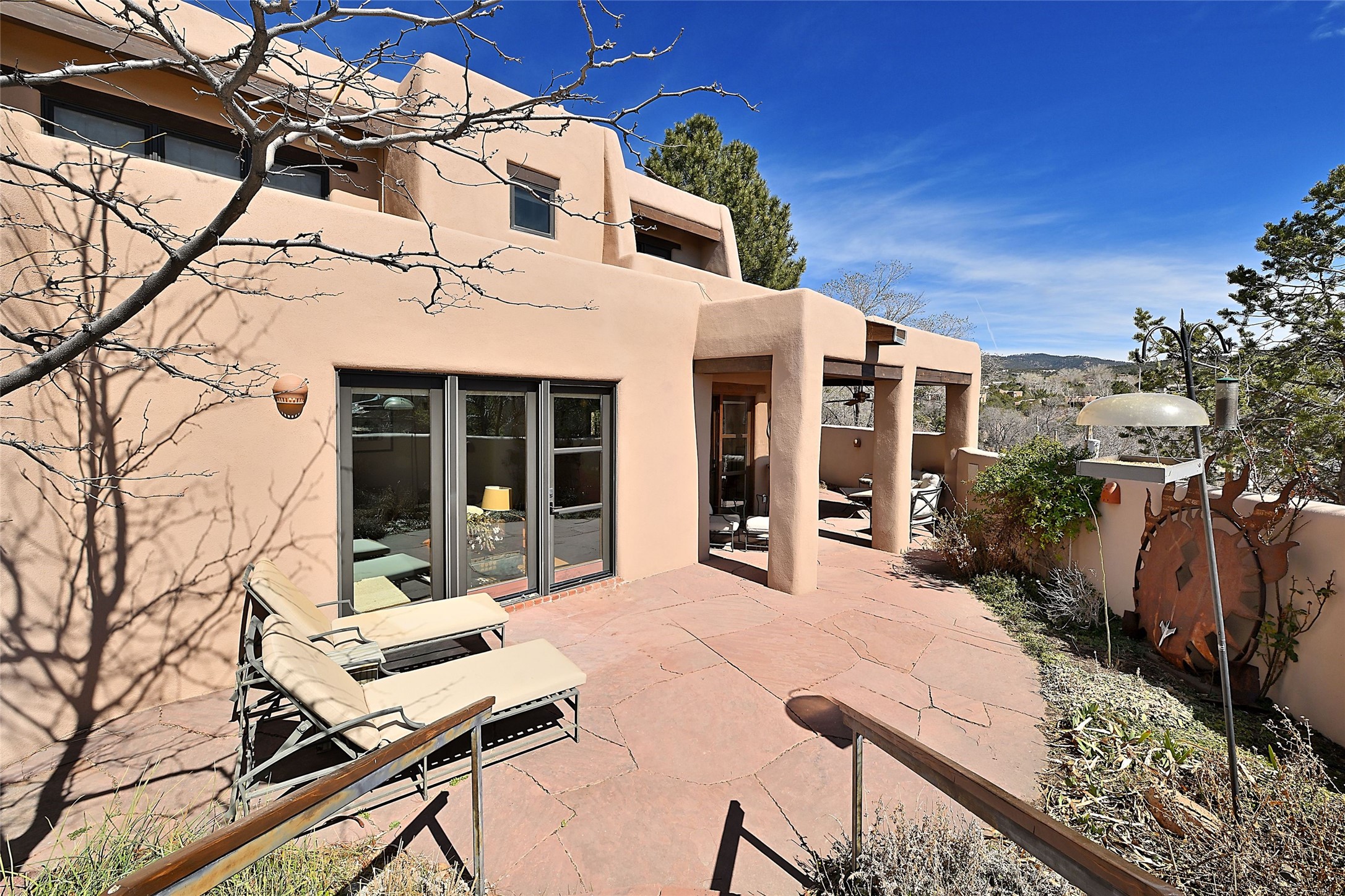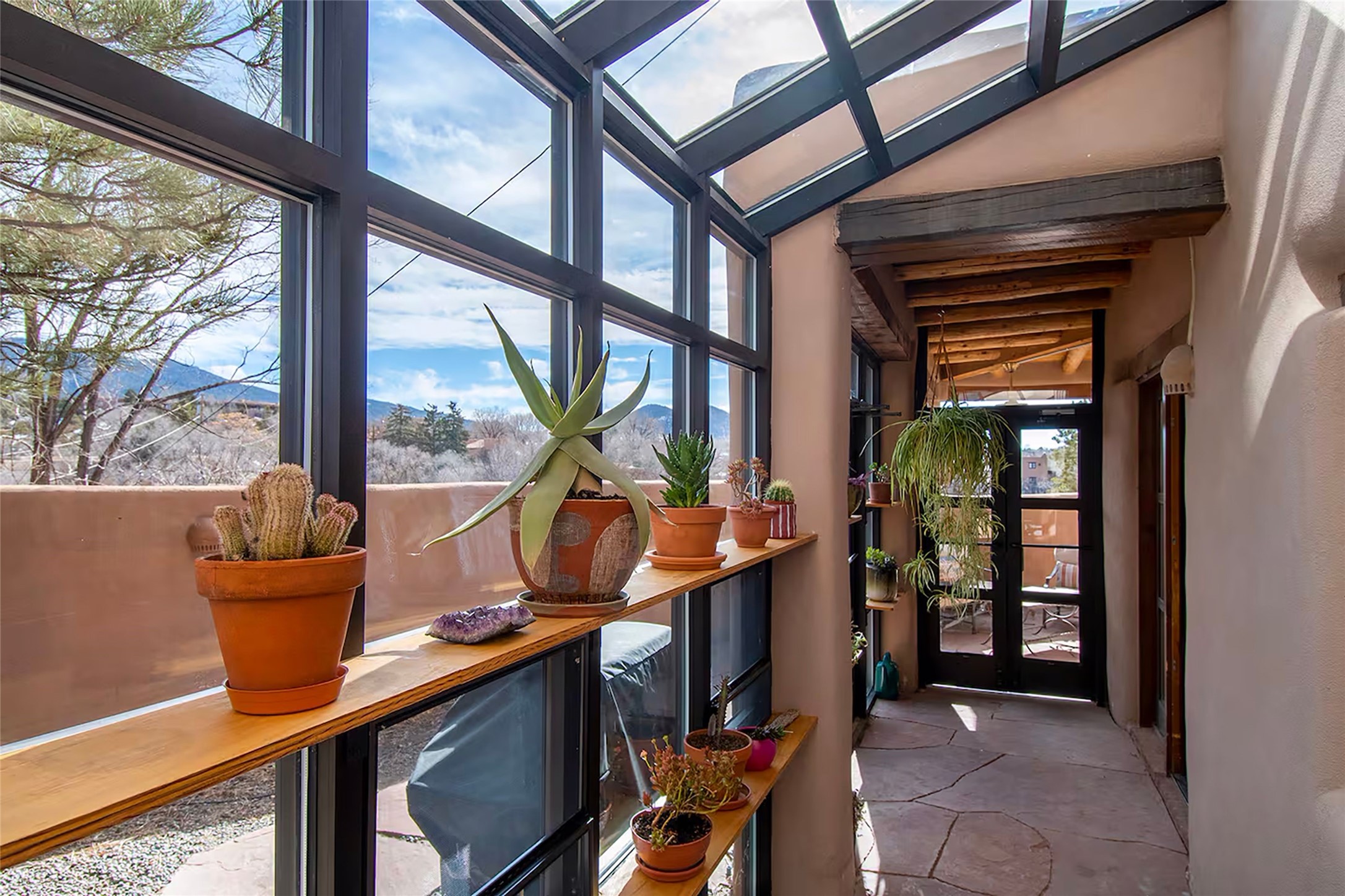 One of only two homes on a quiet cul-de-sac off an iconic winding Eastside lane, this hilltop hideaway enjoys an enviable private perch with a view of historic rooftops, mountains and foothills, and clear blue skies. The property's gated drive ascends to a spacious parking area that accompanies a three-bedroom home with a carport and an idyllic courtyard, a generous guest casita, and a versatile light-filled studio. The main residence marries stylish living, dining, and entertaining spaces with a cook's kitchen, a rare greenhouse or solarium, a main-level guest bedroom and bath, an upper-floor guest bedroom with a balcony, and an owner's suite that includes a sitting room or library with a foothills-facing balcony and a spa-inspired bath with a "wet room" tub and shower. Ceiling beams and vigas, colorful tilework, kiva fireplaces, numerous skylights and French doors, and warm earthy hues contribute to the sophisticated Southwestern ambience. The landscaped courtyard features a flagstone terrace, a portal, and a picturesque view. The separate studio will delight artists but can also serve as a workshop, fitness, or meditation space. Short- or long-term guests will appreciate the lofty bedroom and living space of the casita, which also offers a well-outfitted kitchen, a fashionable bath, and a laundry area. The coveted location is walking distance from the Plaza, Canyon Road, and other attractions and amenities of downtown and the historic Eastside.