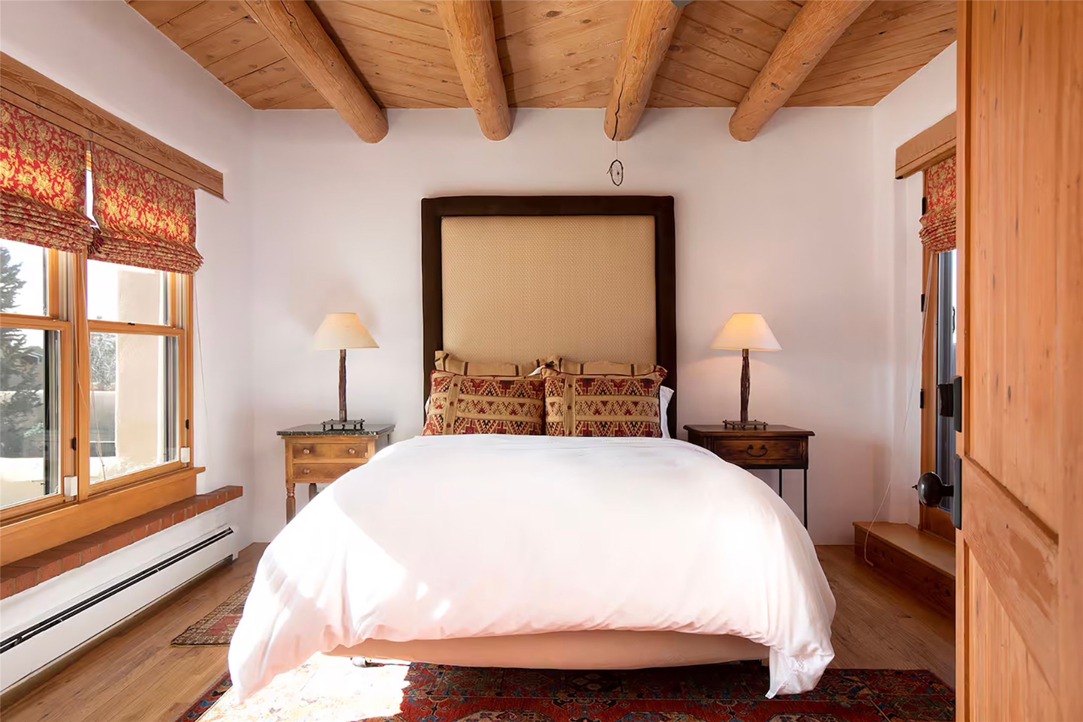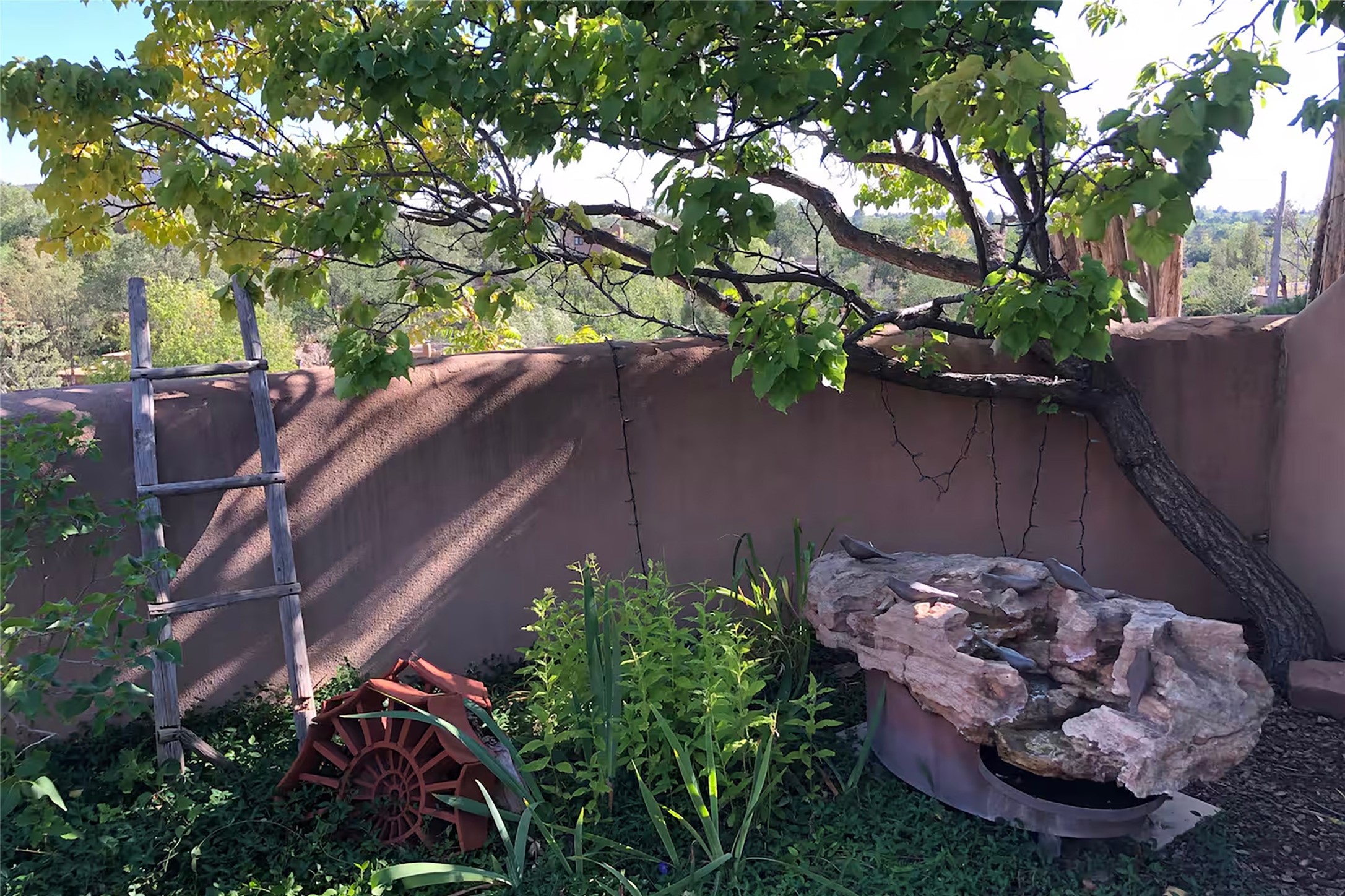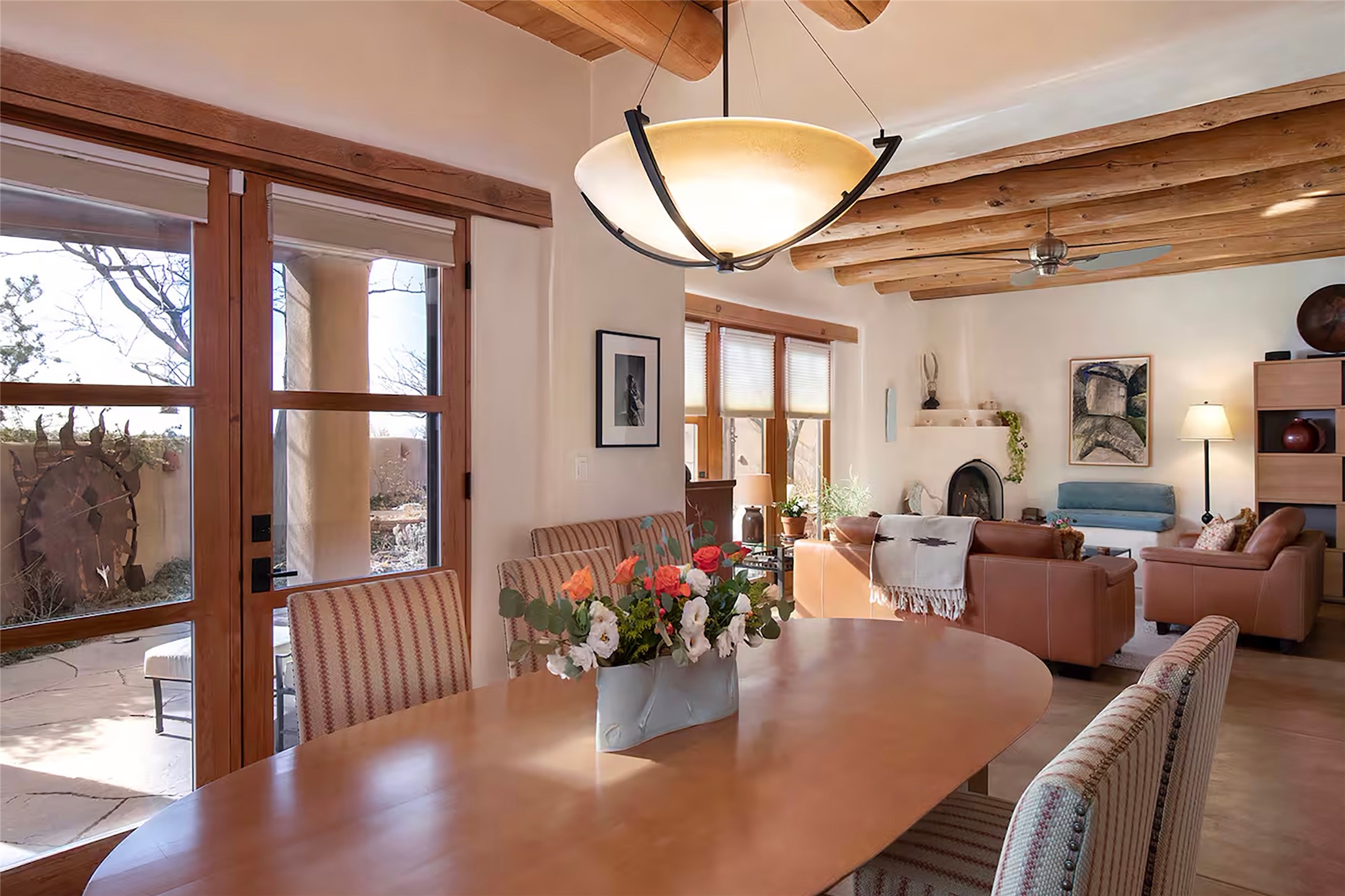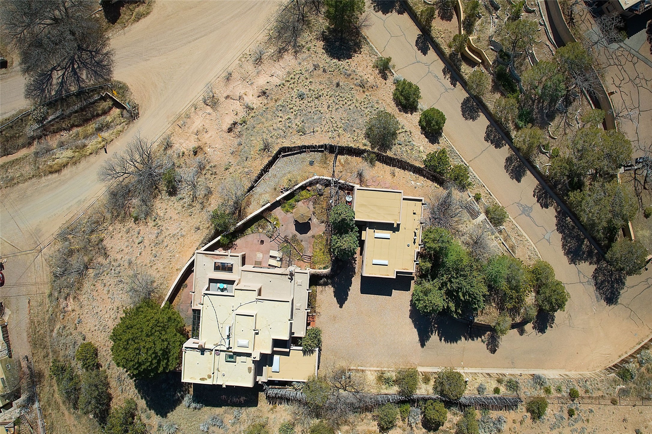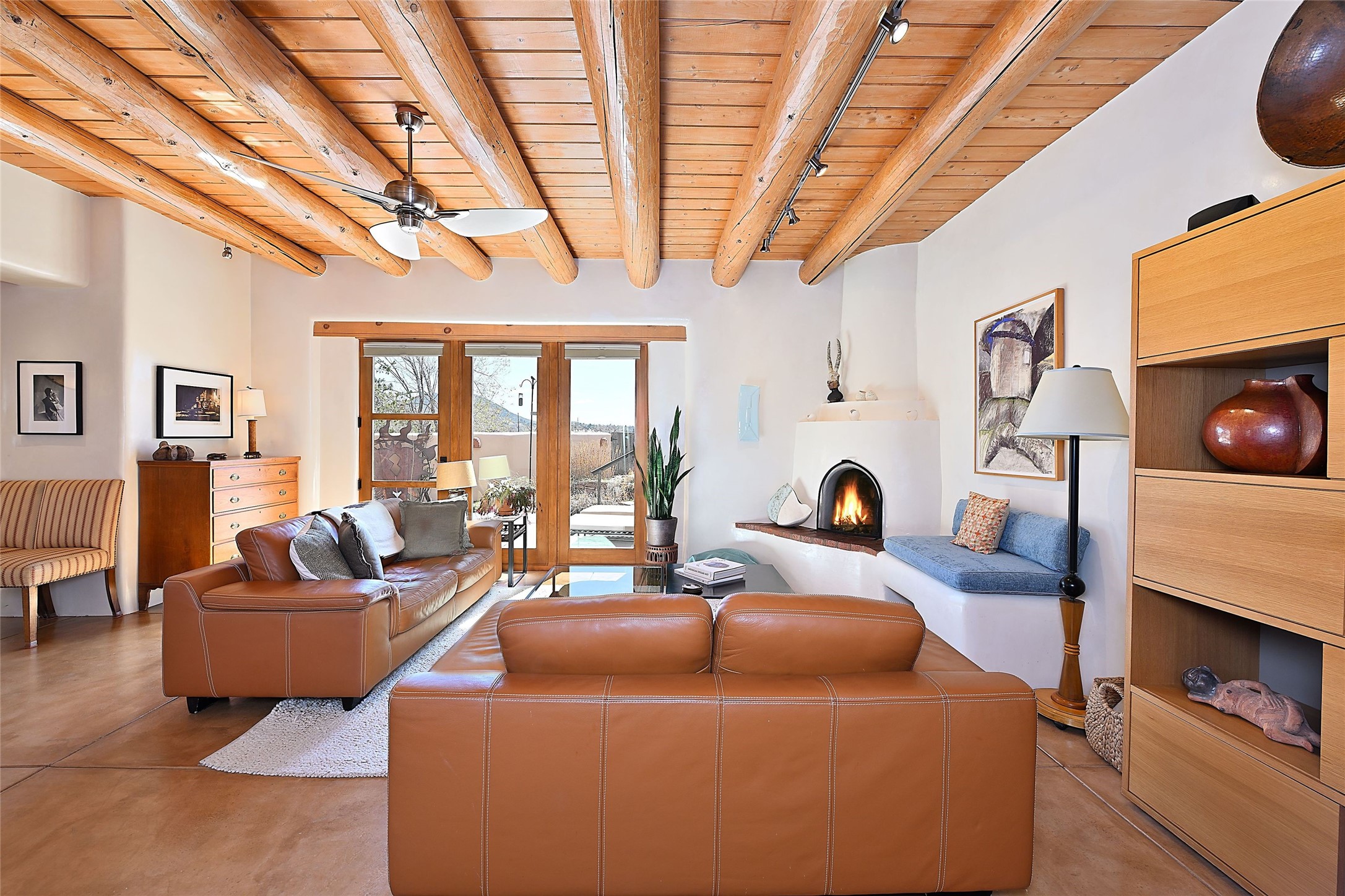 One of only two homes on a quiet cul-de-sac off an iconic winding Eastside lane, this hilltop hideaway enjoys an enviable private perch with a view of historic rooftops, mountains and foothills, and clear blue skies. The property's gated drive ascends to a spacious parking area that accompanies a three-bedroom home with a carport and an idyllic courtyard, a generous guest casita, and a versatile light-filled studio. The main residence marries stylish living, dining, and entertaining spaces with a cook's kitchen, a rare greenhouse or solarium, a main-level guest bedroom and bath, an upper-floor guest bedroom with a balcony, and an owner's suite that includes a sitting room or library with a foothills-facing balcony and a spa-inspired bath with a "wet room" tub and shower. Ceiling beams and vigas, colorful tilework, kiva fireplaces, numerous skylights and French doors, and warm earthy hues contribute to the sophisticated Southwestern ambience. The landscaped courtyard features a flagstone terrace, a portal, and a picturesque view. The separate studio will delight artists but can also serve as a workshop, fitness, or meditation space. Short- or long-term guests will appreciate the lofty bedroom and living space of the casita, which also offers a well-outfitted kitchen, a fashionable bath, and a laundry area. The coveted location is walking distance from the Plaza, Canyon Road, and other attractions and amenities of downtown and the historic Eastside.