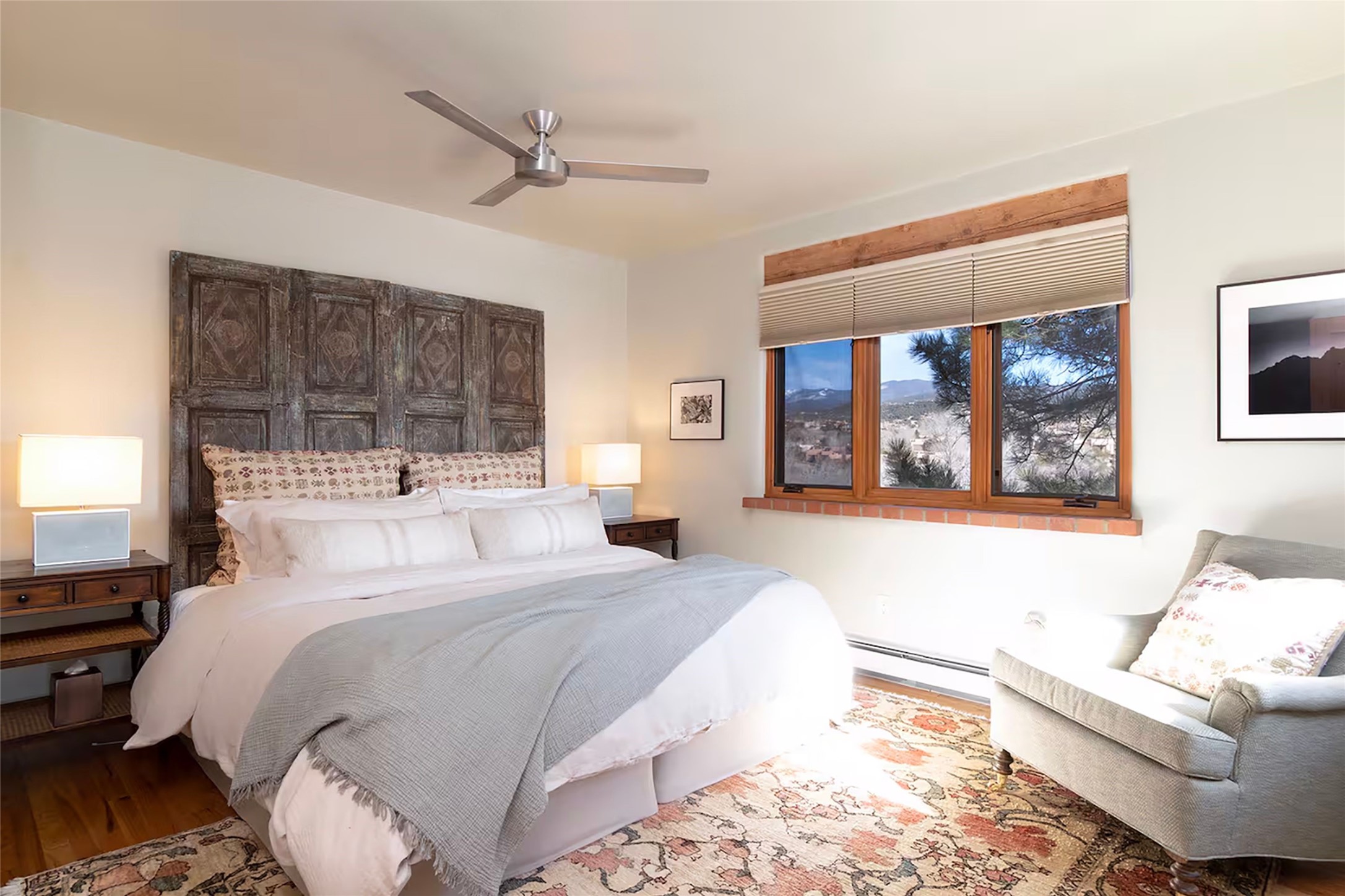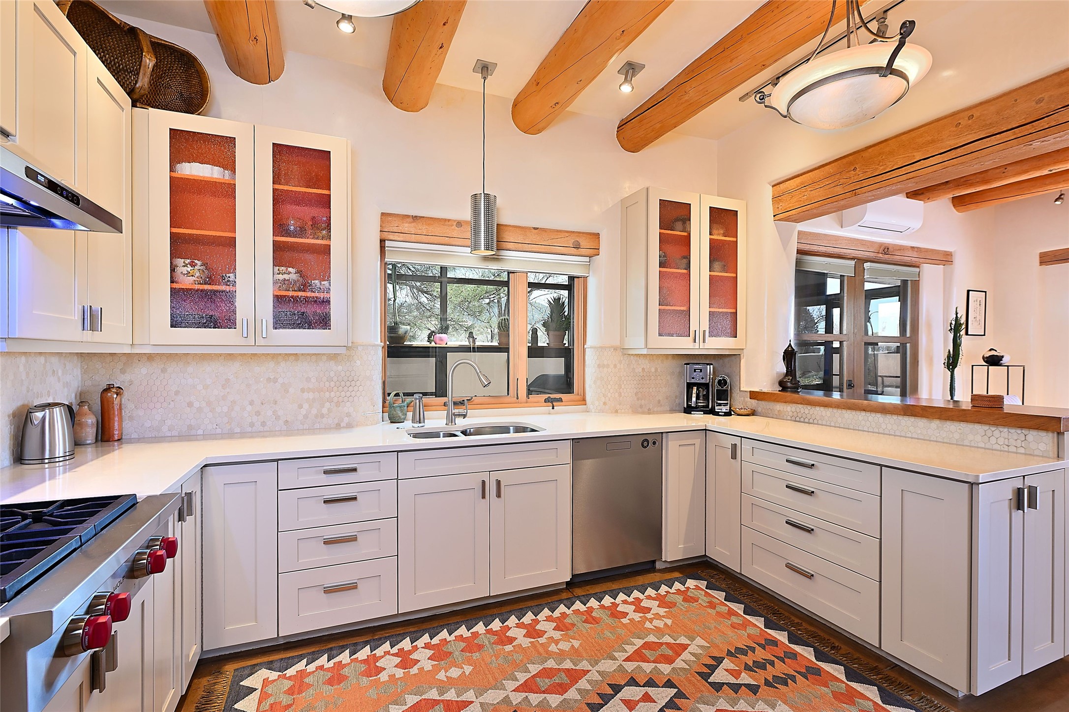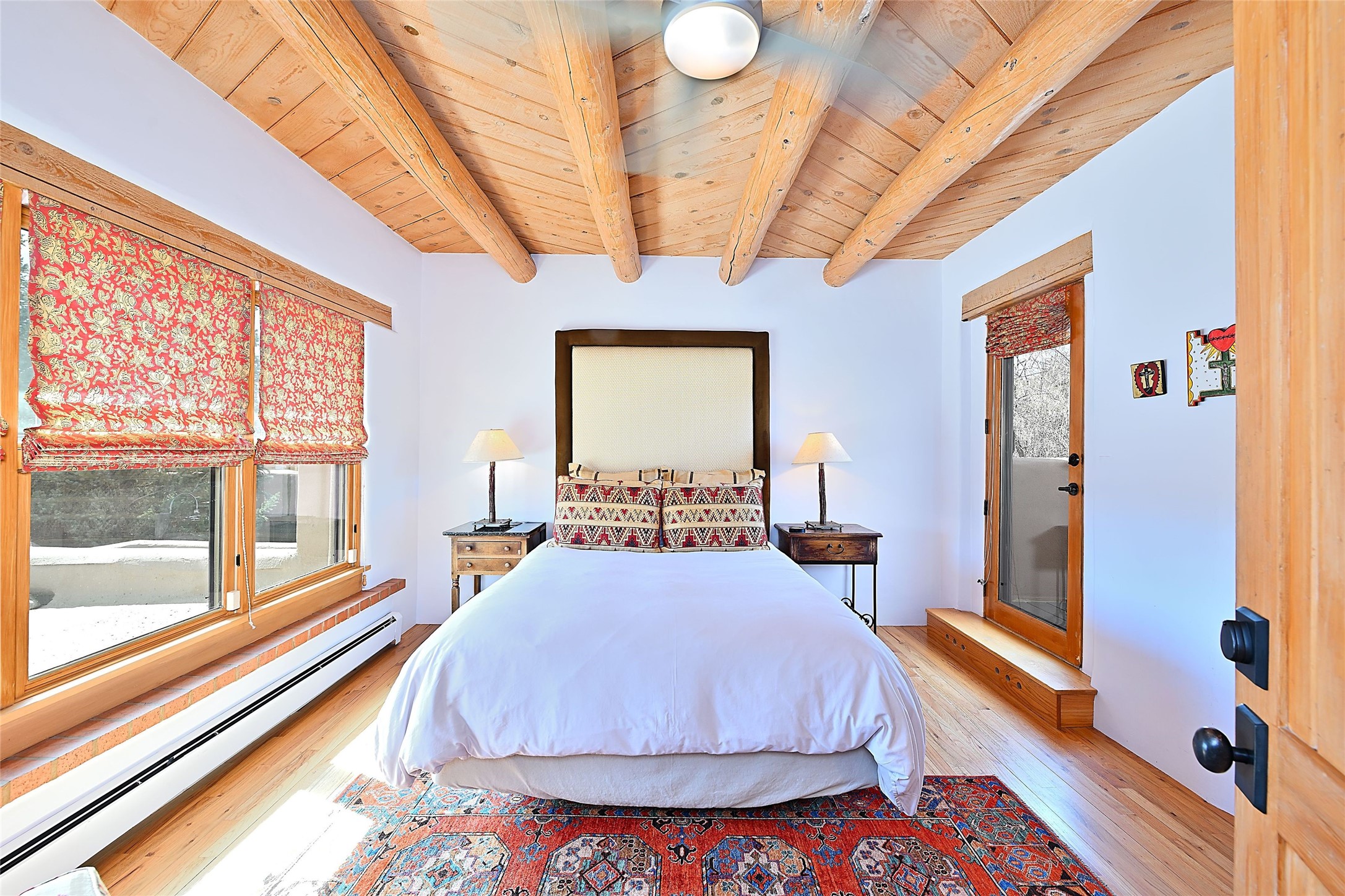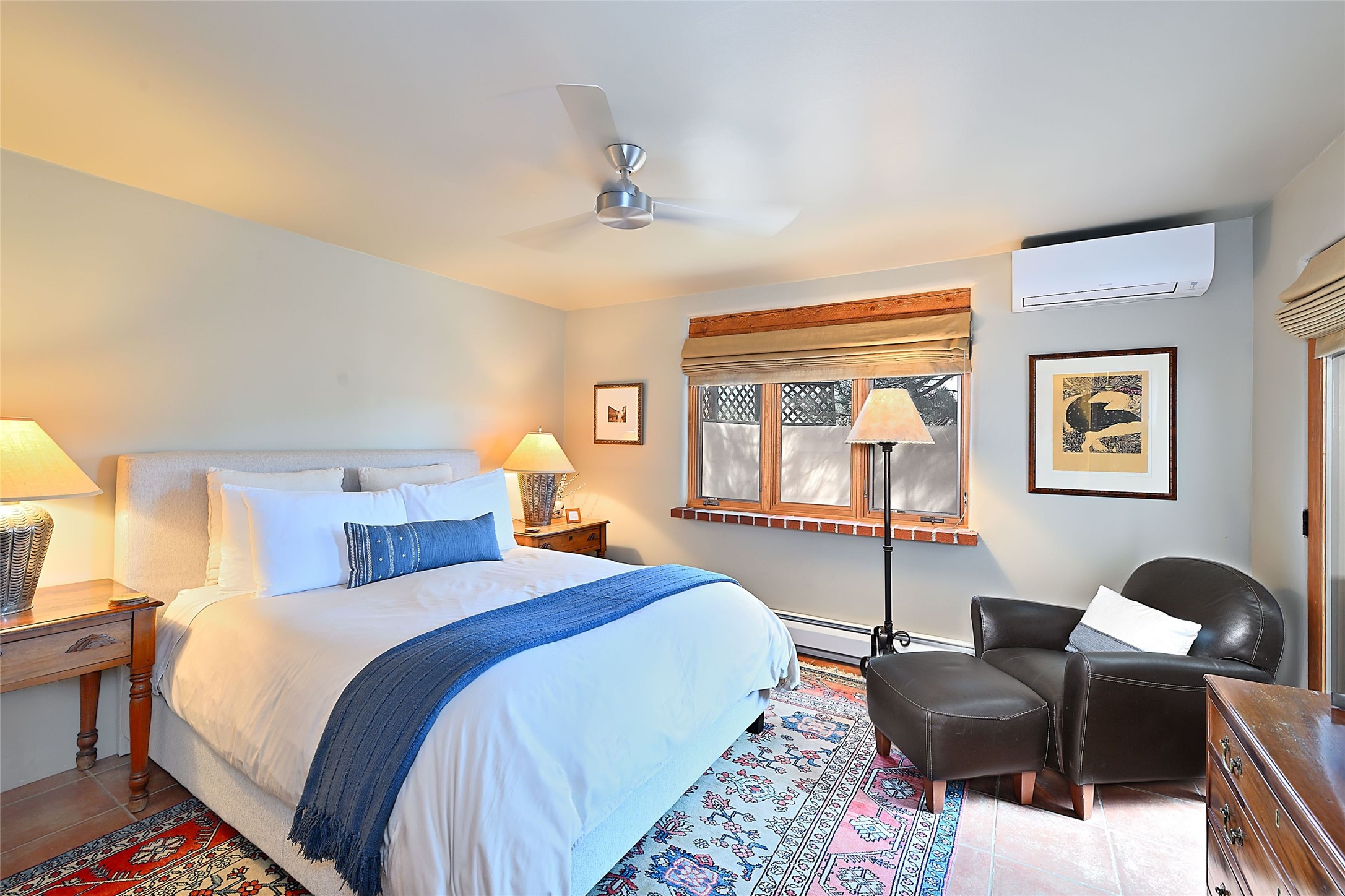 One of only two homes on a quiet cul-de-sac off an iconic winding Eastside lane, this hilltop hideaway enjoys an enviable private perch with a view of historic rooftops, mountains and foothills, and clear blue skies. The property's gated drive ascends to a spacious parking area that accompanies a three-bedroom home with a carport and an idyllic courtyard, a generous guest casita, and a versatile light-filled studio. The main residence marries stylish living, dining, and entertaining spaces with a cook's kitchen, a rare greenhouse or solarium, a main-level guest bedroom and bath, an upper-floor guest bedroom with a balcony, and an owner's suite that includes a sitting room or library with a foothills-facing balcony and a spa-inspired bath with a "wet room" tub and shower. Ceiling beams and vigas, colorful tilework, kiva fireplaces, numerous skylights and French doors, and warm earthy hues contribute to the sophisticated Southwestern ambience. The landscaped courtyard features a flagstone terrace, a portal, and a picturesque view. The separate studio will delight artists but can also serve as a workshop, fitness, or meditation space. Short- or long-term guests will appreciate the lofty bedroom and living space of the casita, which also offers a well-outfitted kitchen, a fashionable bath, and a laundry area. The coveted location is walking distance from the Plaza, Canyon Road, and other attractions and amenities of downtown and the historic Eastside.