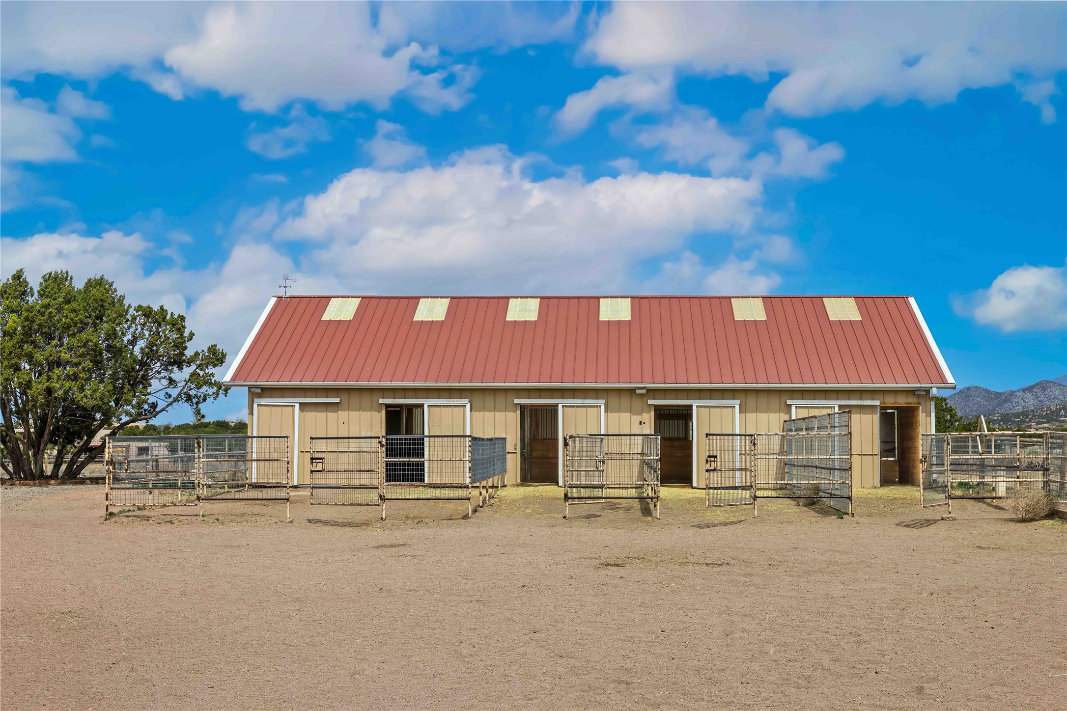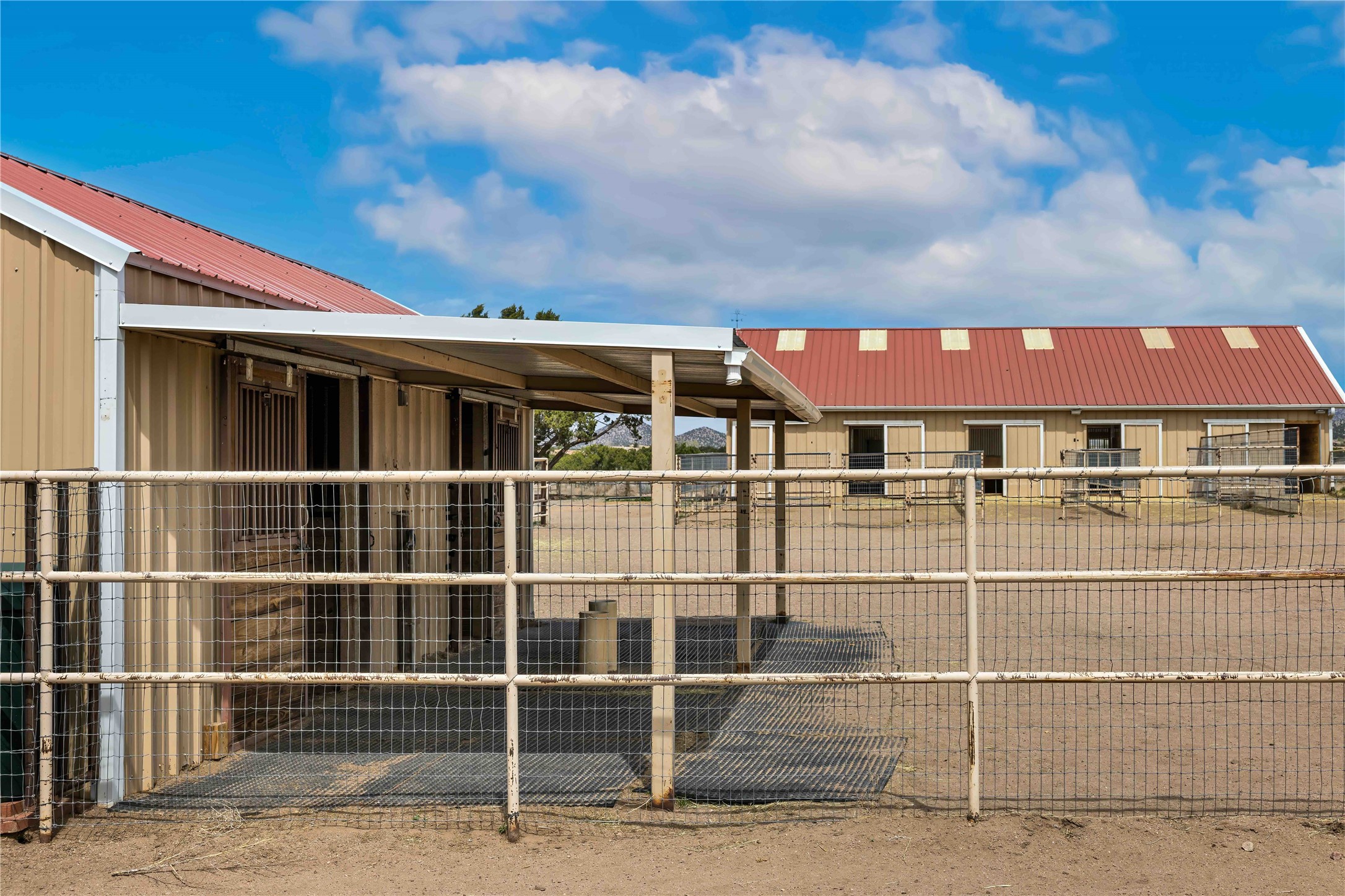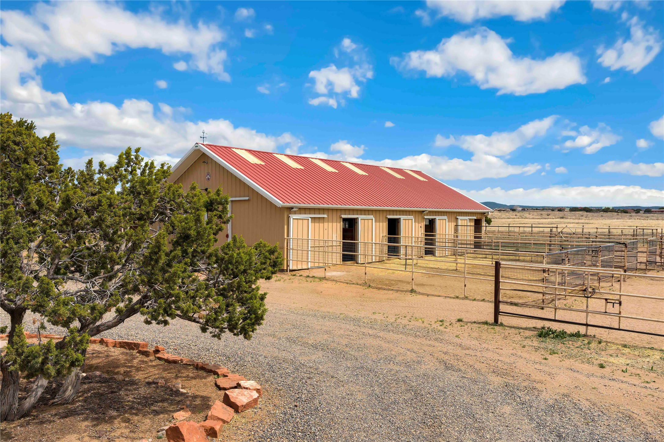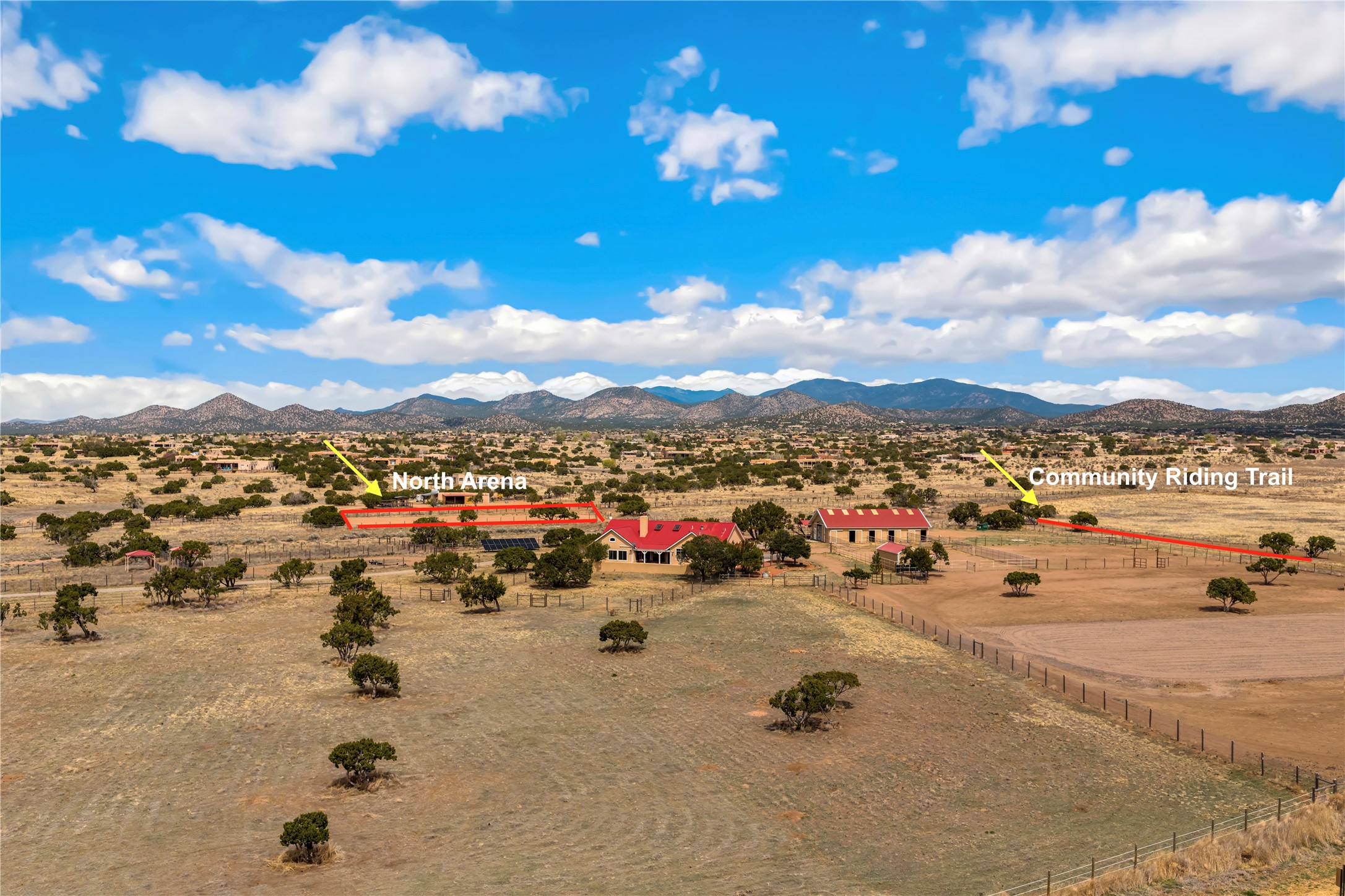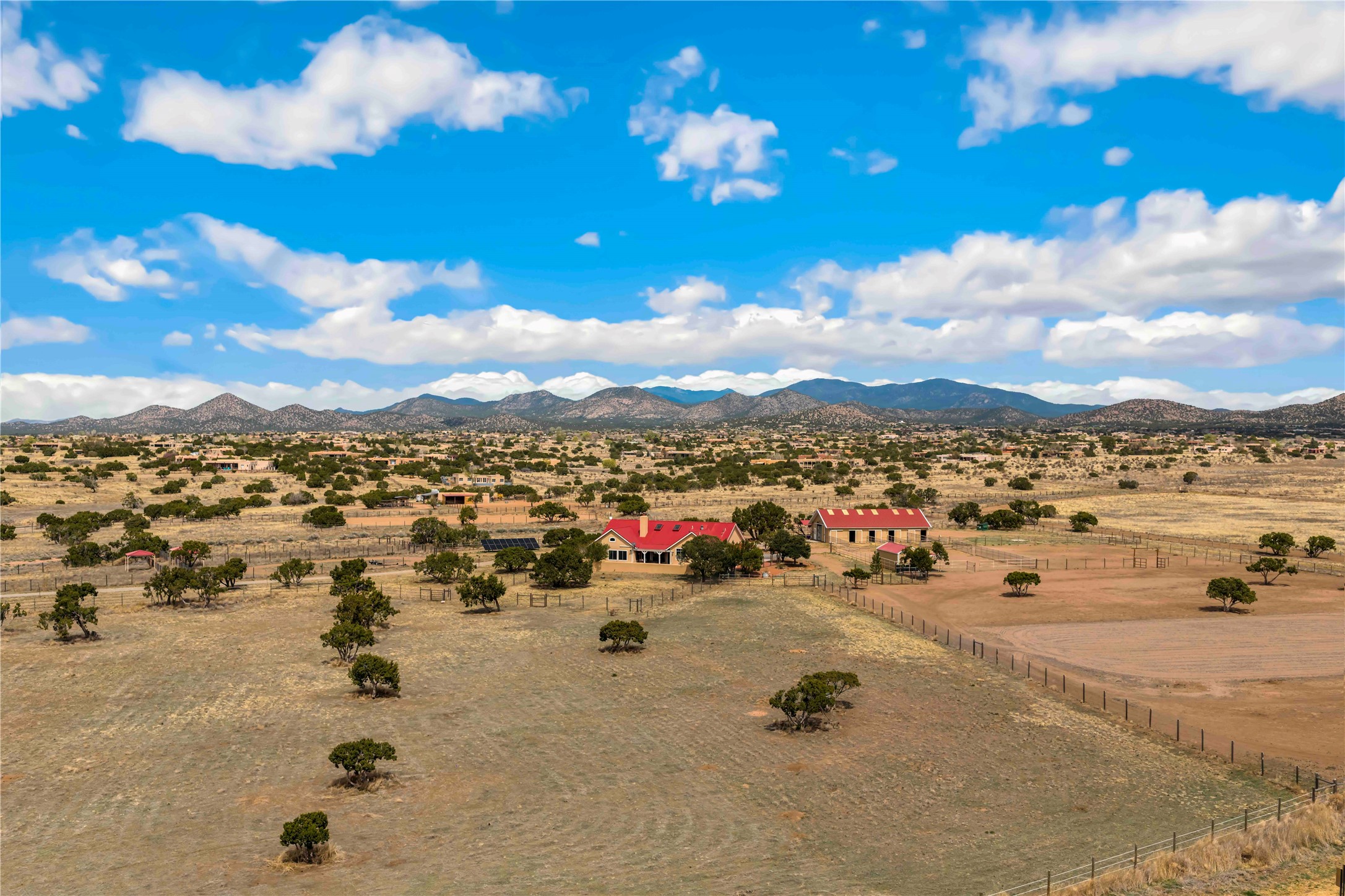 Exceptional turn-key equestrian property located in the desirable horse community, Los Caballos; 133 Jacinto is a 1,945 sq ft Northern New Mexico-style residence showcasing soaring pitched, beamed wood ceilings, sun-drenched windows, new luxury vinyl floors, and a classic brick fireplace with floor-to-ceiling glazing and sliding doors opening to a portal great for entertaining. The completely remodeled kitchen has a connected dining area making it a suitable space for everyone to gather. Both front and back patios have mountain views. The primary suite includes a large closet space, dressing area, and renovated bathroom. A second bedroom, beautiful guest bath and a flexible den/office complete the layout.The centerpiece is a 5-stall Morton barn (currently 3 oversized box stalls) with runs, attached turnouts, a tack room with 1/2 bath, hot/cold water throughout, Nelson automatic waterers, and generous grooming and storage space. A separate 2-stall barn adds its own tack room/ hay shed, and overhang. Three front paddocks with shade structures offer additional flexibility. Two arenas set this property apart: a 100200 ft main arena -- extended, laser leveled, drained, and finished with a 3" base and 2" sand layer and a 90150 ft front arena with specialized ReitenRight performance footing. A riding trail encircles the property, with access to additional trails throughout the community. Solar panels and a 10,000 gallon rainwater catchment system with drip irrigation enhance the property's sustainability and keep utility costs impressively low.Make an appointment to see this spectacular property today.