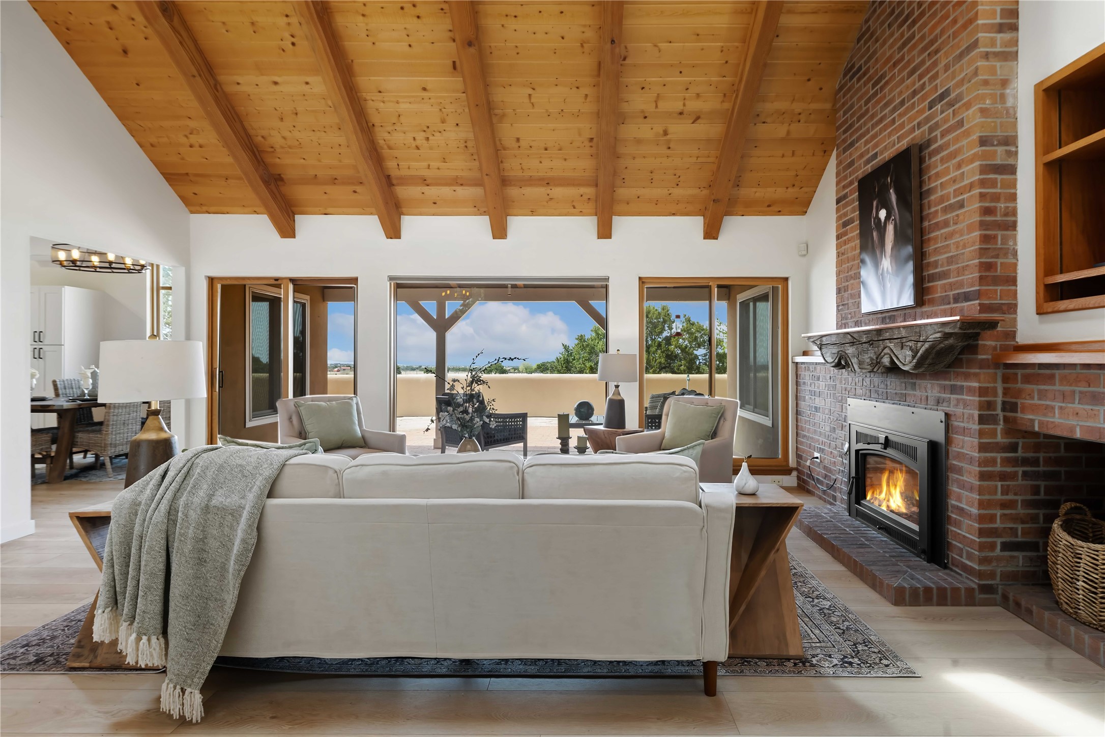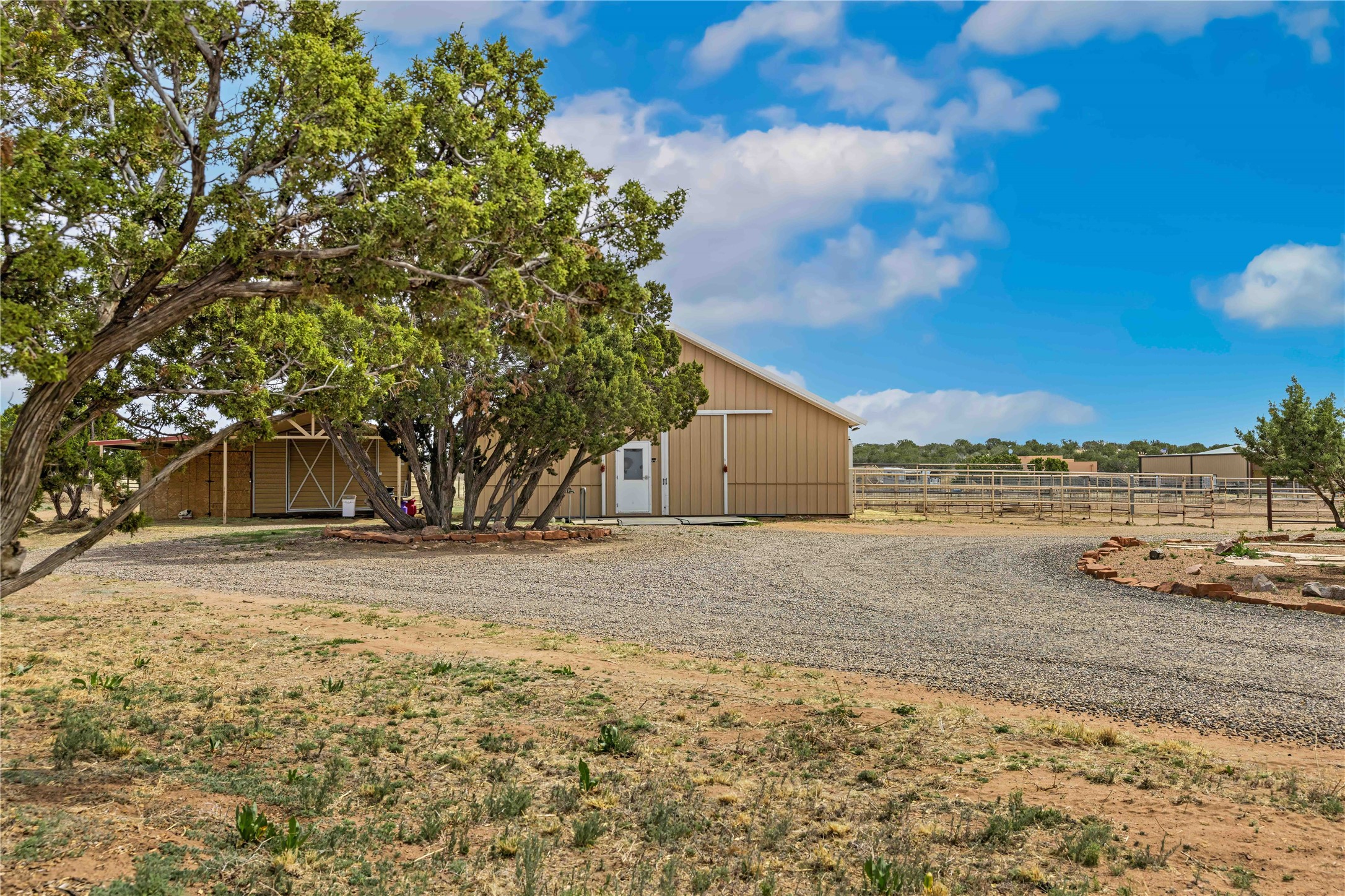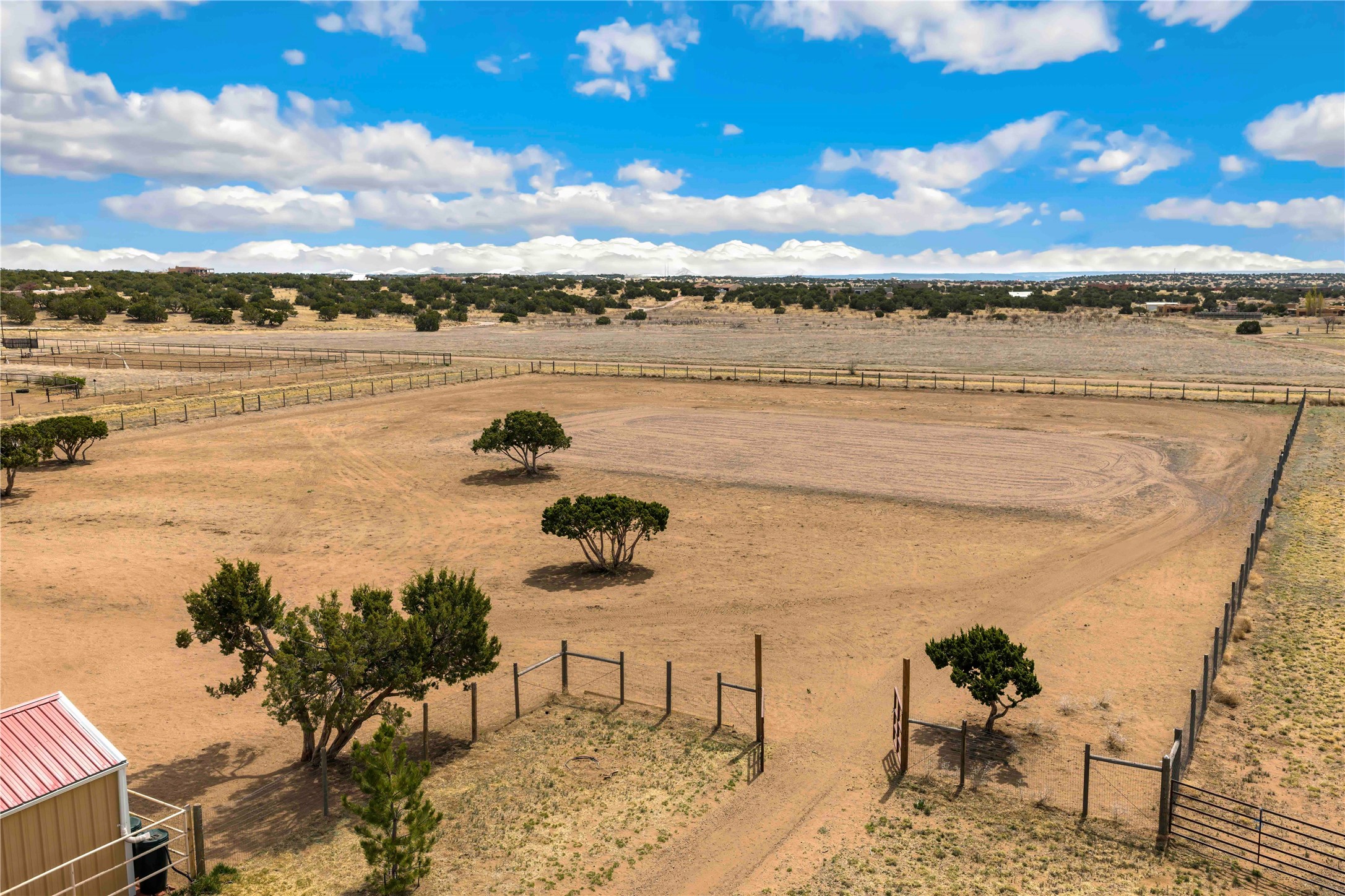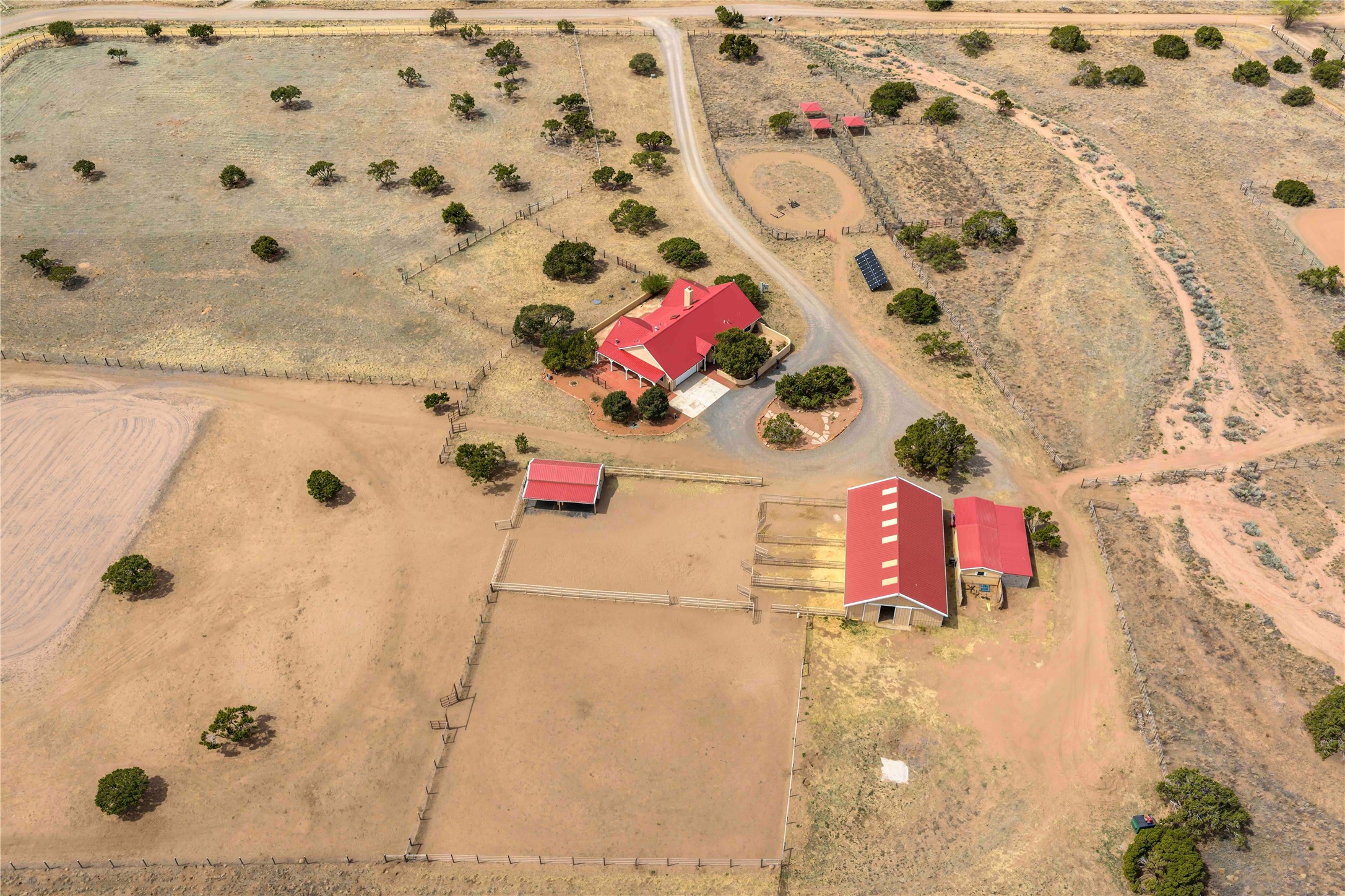 Exceptional turn-key equestrian property located in the desirable horse community, Los Caballos; 133 Jacinto is a 1,945 sq ft Northern New Mexico-style residence showcasing soaring pitched, beamed wood ceilings, sun-drenched windows, new luxury vinyl floors, and a classic brick fireplace with floor-to-ceiling glazing and sliding doors opening to a portal great for entertaining. The completely remodeled kitchen has a connected dining area making it a suitable space for everyone to gather. Both front and back patios have mountain views. The primary suite includes a large closet space, dressing area, and renovated bathroom. A second bedroom, beautiful guest bath and a flexible den/office complete the layout.The centerpiece is a 5-stall Morton barn (currently 3 oversized box stalls) with runs, attached turnouts, a tack room with 1/2 bath, hot/cold water throughout, Nelson automatic waterers, and generous grooming and storage space. A separate 2-stall barn adds its own tack room/ hay shed, and overhang. Three front paddocks with shade structures offer additional flexibility. Two arenas set this property apart: a 100200 ft main arena -- extended, laser leveled, drained, and finished with a 3" base and 2" sand layer and a 90150 ft front arena with specialized ReitenRight performance footing. A riding trail encircles the property, with access to additional trails throughout the community. Solar panels and a 10,000 gallon rainwater catchment system with drip irrigation enhance the property's sustainability and keep utility costs impressively low.Make an appointment to see this spectacular property today.