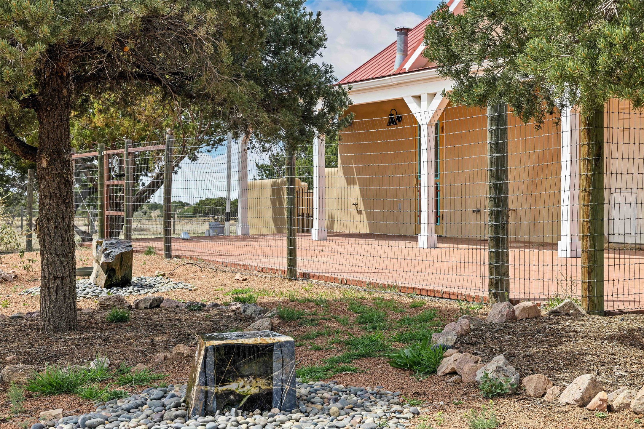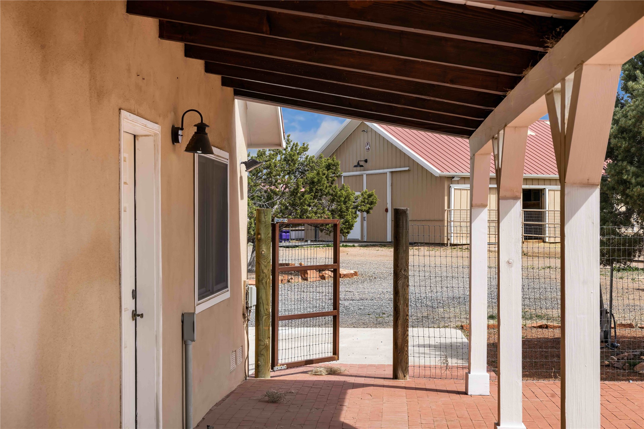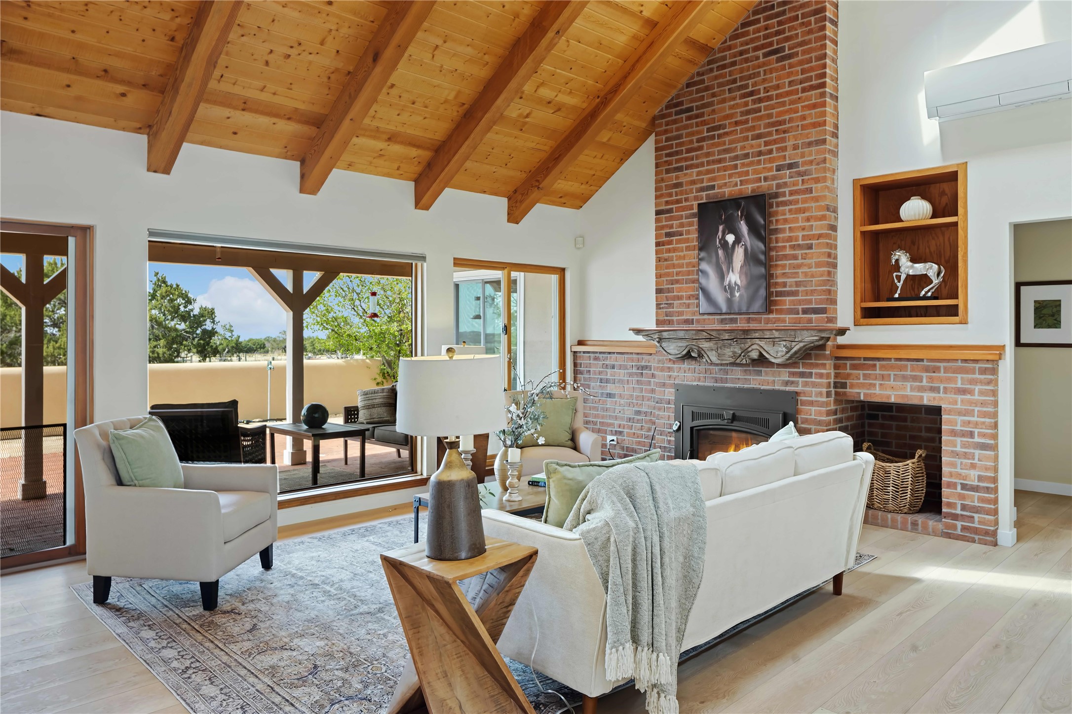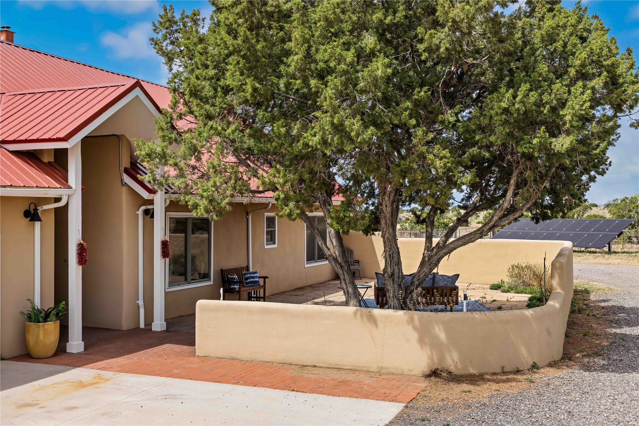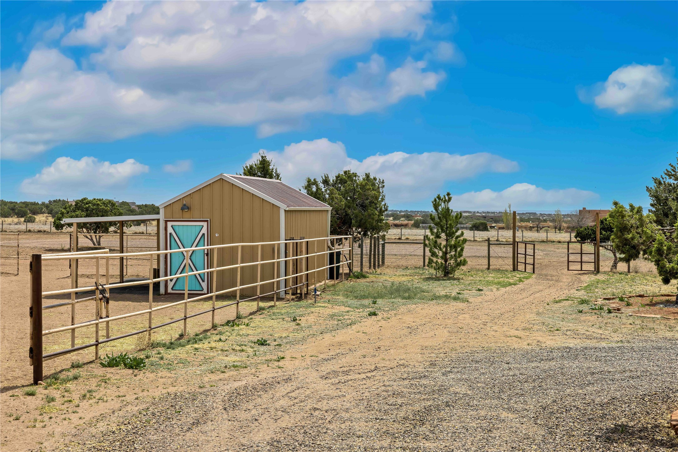 Exceptional turn-key equestrian property located in the desirable horse community, Los Caballos; 133 Jacinto is a 1,945 sq ft Northern New Mexico-style residence showcasing soaring pitched, beamed wood ceilings, sun-drenched windows, new luxury vinyl floors, and a classic brick fireplace with floor-to-ceiling glazing and sliding doors opening to a portal great for entertaining. The completely remodeled kitchen has a connected dining area making it a suitable space for everyone to gather. Both front and back patios have mountain views. The primary suite includes a large closet space, dressing area, and renovated bathroom. A second bedroom, beautiful guest bath and a flexible den/office complete the layout.The centerpiece is a 5-stall Morton barn (currently 3 oversized box stalls) with runs, attached turnouts, a tack room with 1/2 bath, hot/cold water throughout, Nelson automatic waterers, and generous grooming and storage space. A separate 2-stall barn adds its own tack room/ hay shed, and overhang. Three front paddocks with shade structures offer additional flexibility. Two arenas set this property apart: a 100200 ft main arena -- extended, laser leveled, drained, and finished with a 3" base and 2" sand layer and a 90150 ft front arena with specialized ReitenRight performance footing. A riding trail encircles the property, with access to additional trails throughout the community. Solar panels and a 10,000 gallon rainwater catchment system with drip irrigation enhance the property's sustainability and keep utility costs impressively low.Make an appointment to see this spectacular property today.