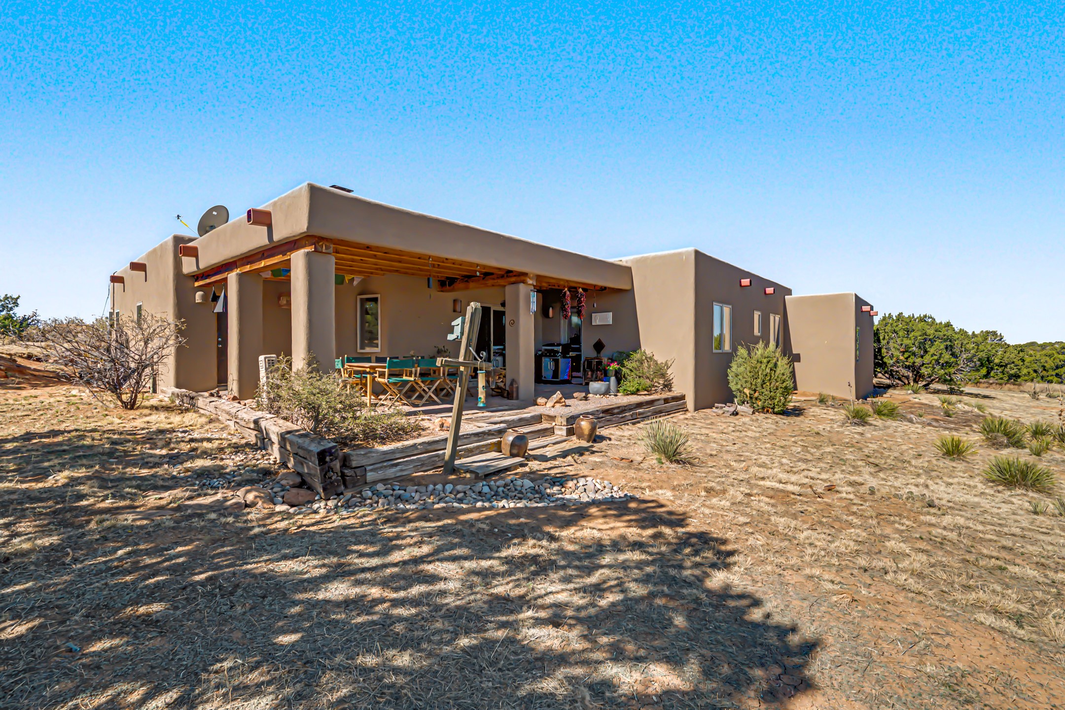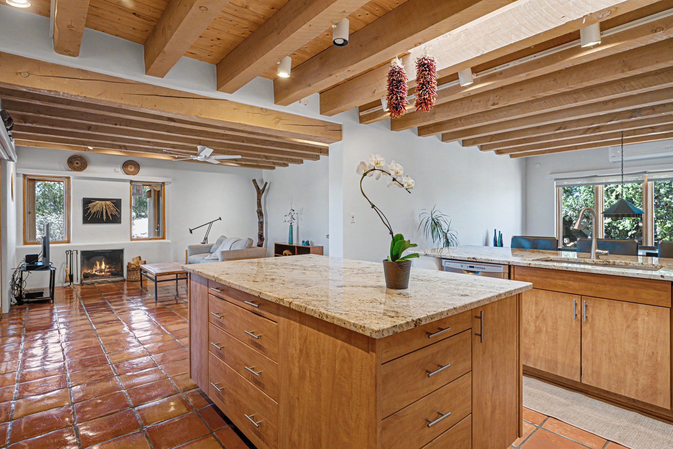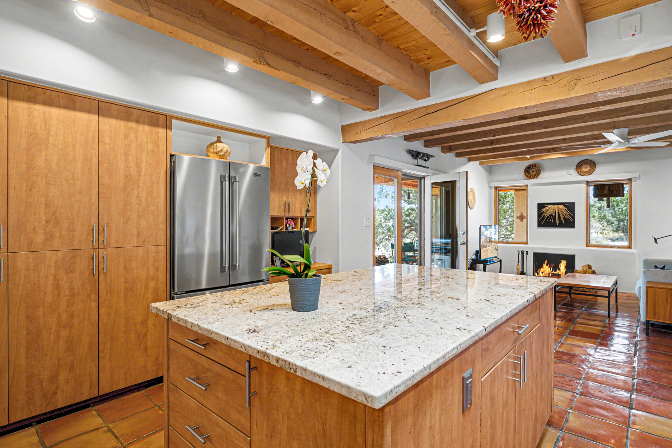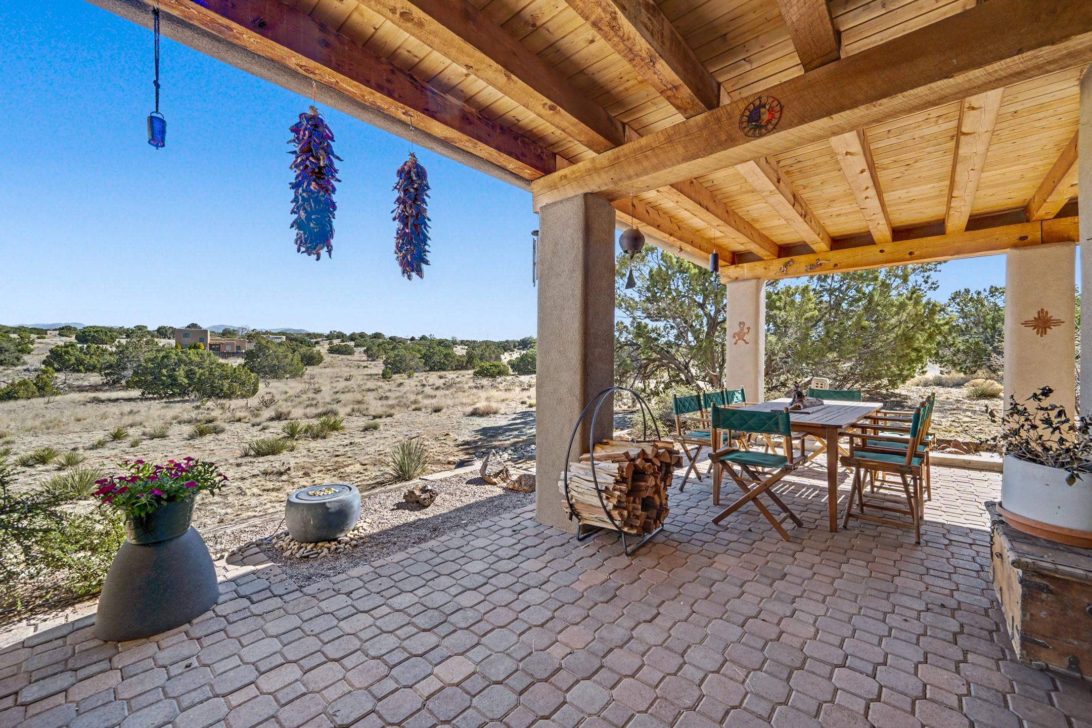 Stunning custom designed and built contemporary pueblo home privately located bordering a large Eldorado greenbelt. Gleaming saltillo tile floors, Kiva fireplaces and beam ceilings create that Santa Fe excitement while high ceilings and multiple long windows create a spacious sunny uplift throughout. There is an entertainers kitchen elegantly remodeled in 2017 with a large central island which flows to a formal dining area and a family room/den overlooking the north mountain foothills across the greenbelt. The sunken living room features a dramatic corner kiva fireplace and wonderful views to the west. There is excellent separation of primary suite from the guest bedrooms, all having Swedish engineered hardwood floors and the bathrooms have been totally refreshed in 2018. Two mini splits were added in 2018 for additional summer comfort. The boiler was replaced in 2019 and the home was re stuccoed in 2024. An oversized finished garage with plenty of storage and work area plus extra parking. This home shows pride of ownership inside and out. All this on 1.76 acres within easy reach of Eldorado amenities, local shopping, library, trails and parks, and only minutes into Santa Fe.