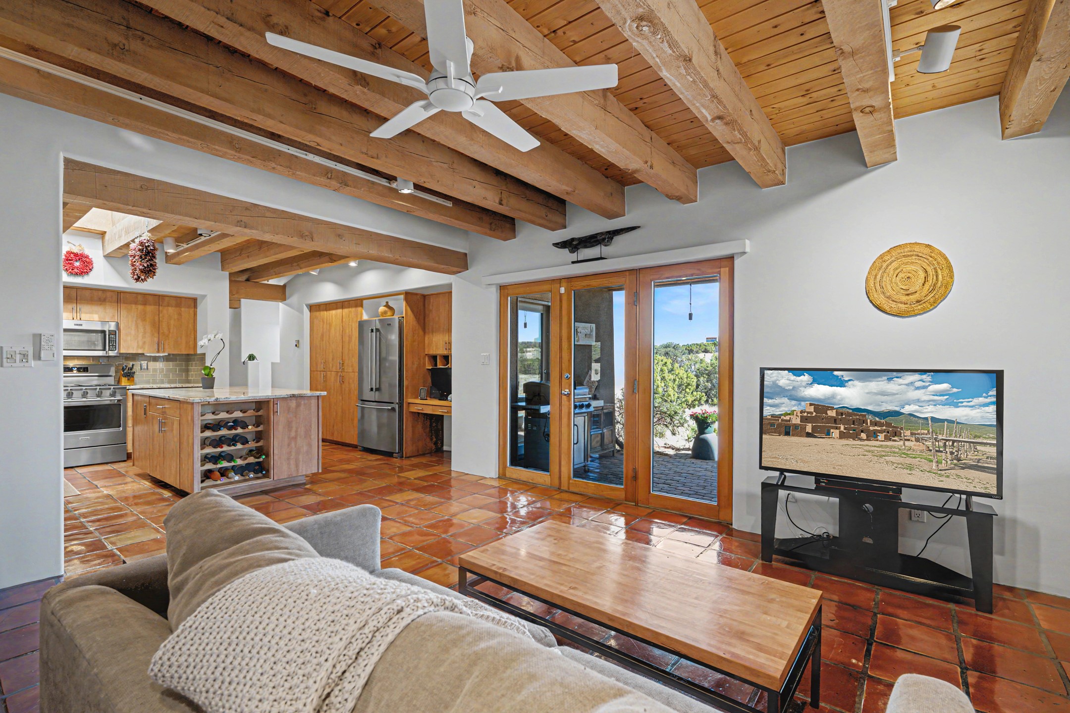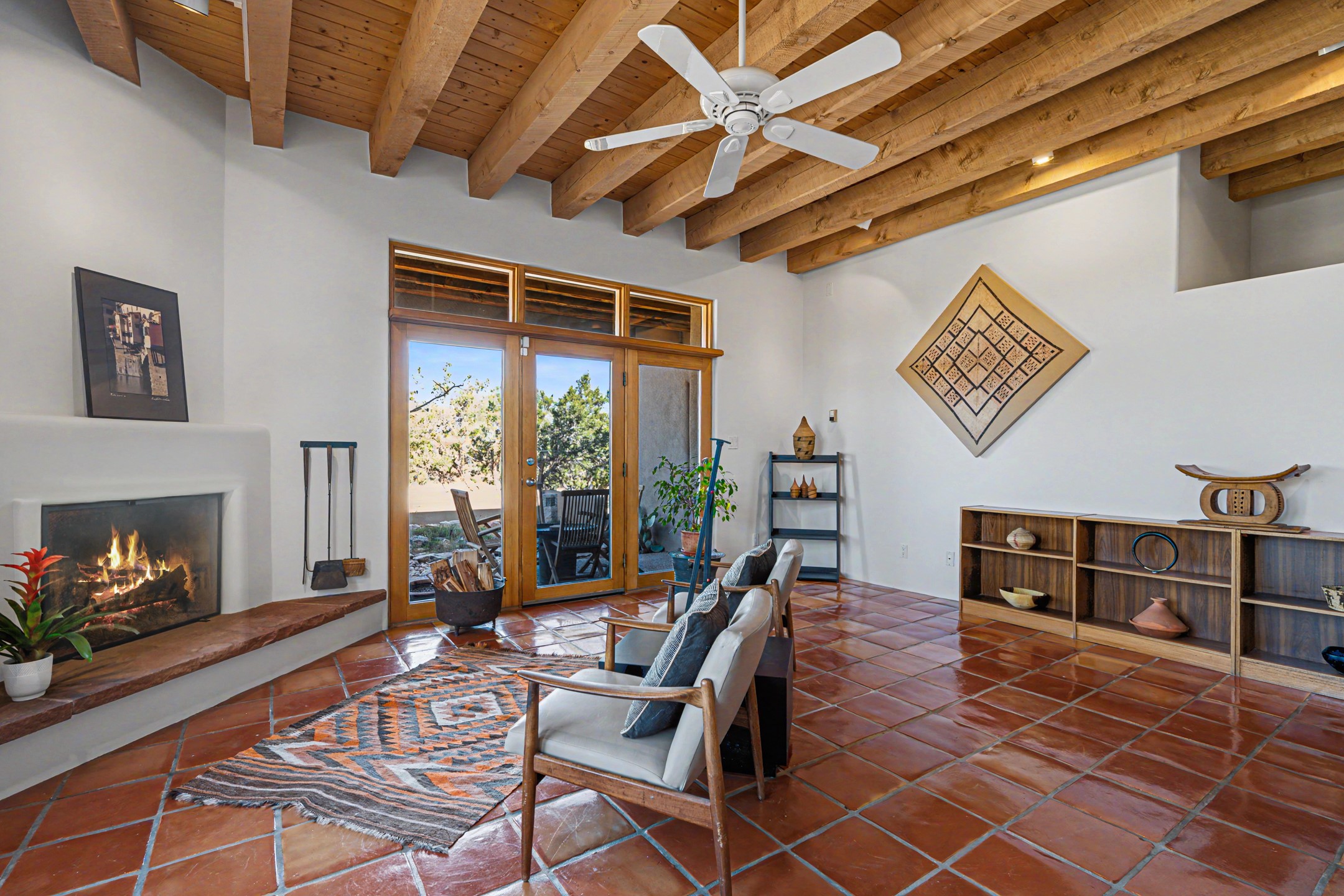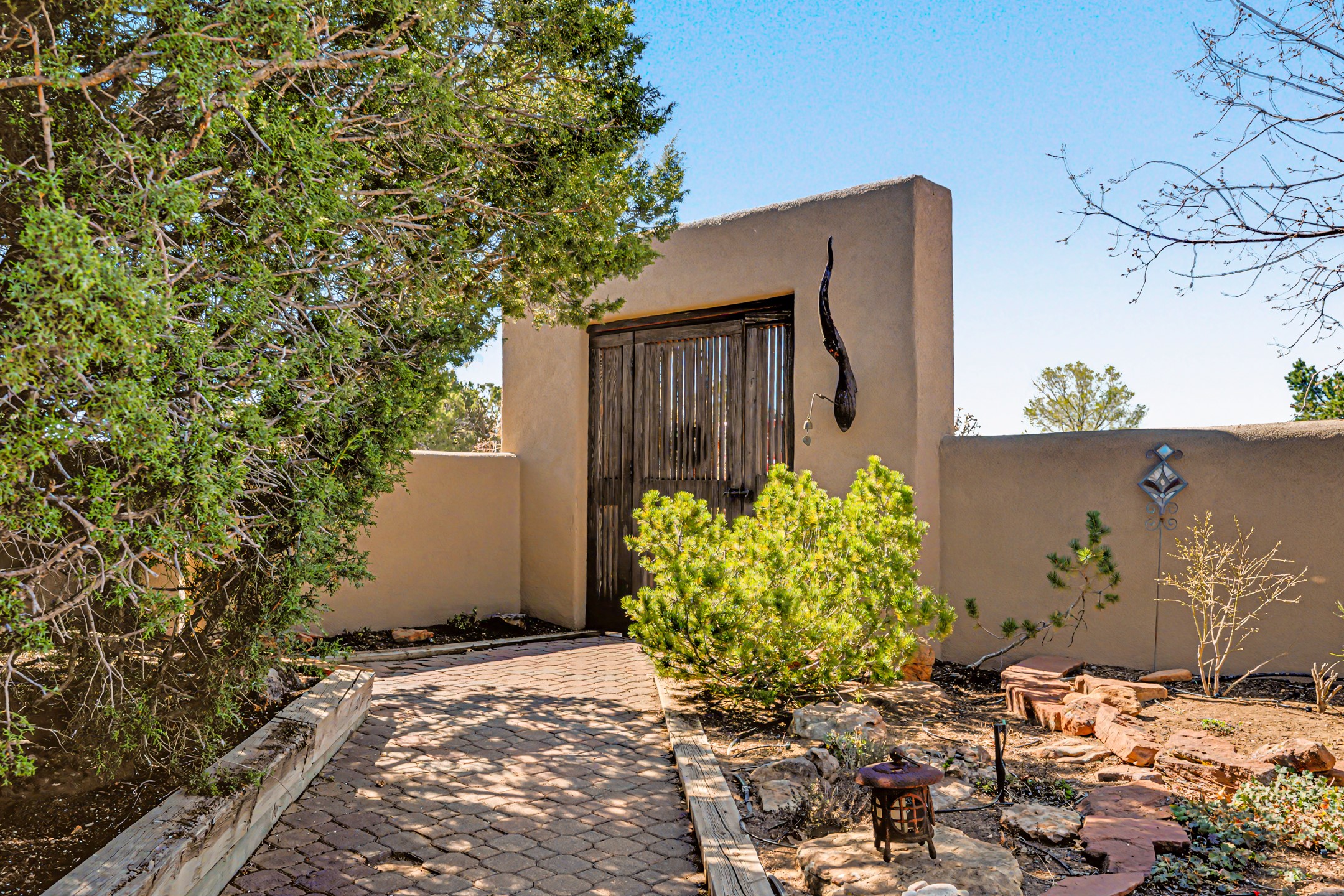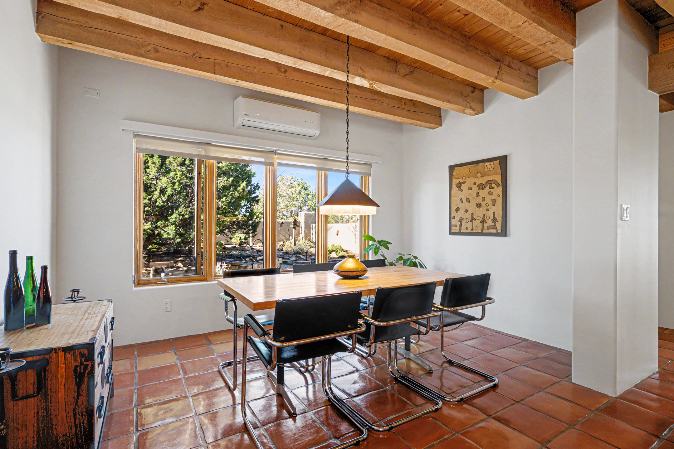 Stunning custom designed and built contemporary pueblo home privately located bordering a large Eldorado greenbelt. Gleaming saltillo tile floors, Kiva fireplaces and beam ceilings create that Santa Fe excitement while high ceilings and multiple long windows create a spacious sunny uplift throughout. There is an entertainers kitchen elegantly remodeled in 2017 with a large central island which flows to a formal dining area and a family room/den overlooking the north mountain foothills across the greenbelt. The sunken living room features a dramatic corner kiva fireplace and wonderful views to the west. There is excellent separation of primary suite from the guest bedrooms, all having Swedish engineered hardwood floors and the bathrooms have been totally refreshed in 2018. Two mini splits were added in 2018 for additional summer comfort. The boiler was replaced in 2019 and the home was re stuccoed in 2024. An oversized finished garage with plenty of storage and work area plus extra parking. This home shows pride of ownership inside and out. All this on 1.76 acres within easy reach of Eldorado amenities, local shopping, library, trails and parks, and only minutes into Santa Fe.