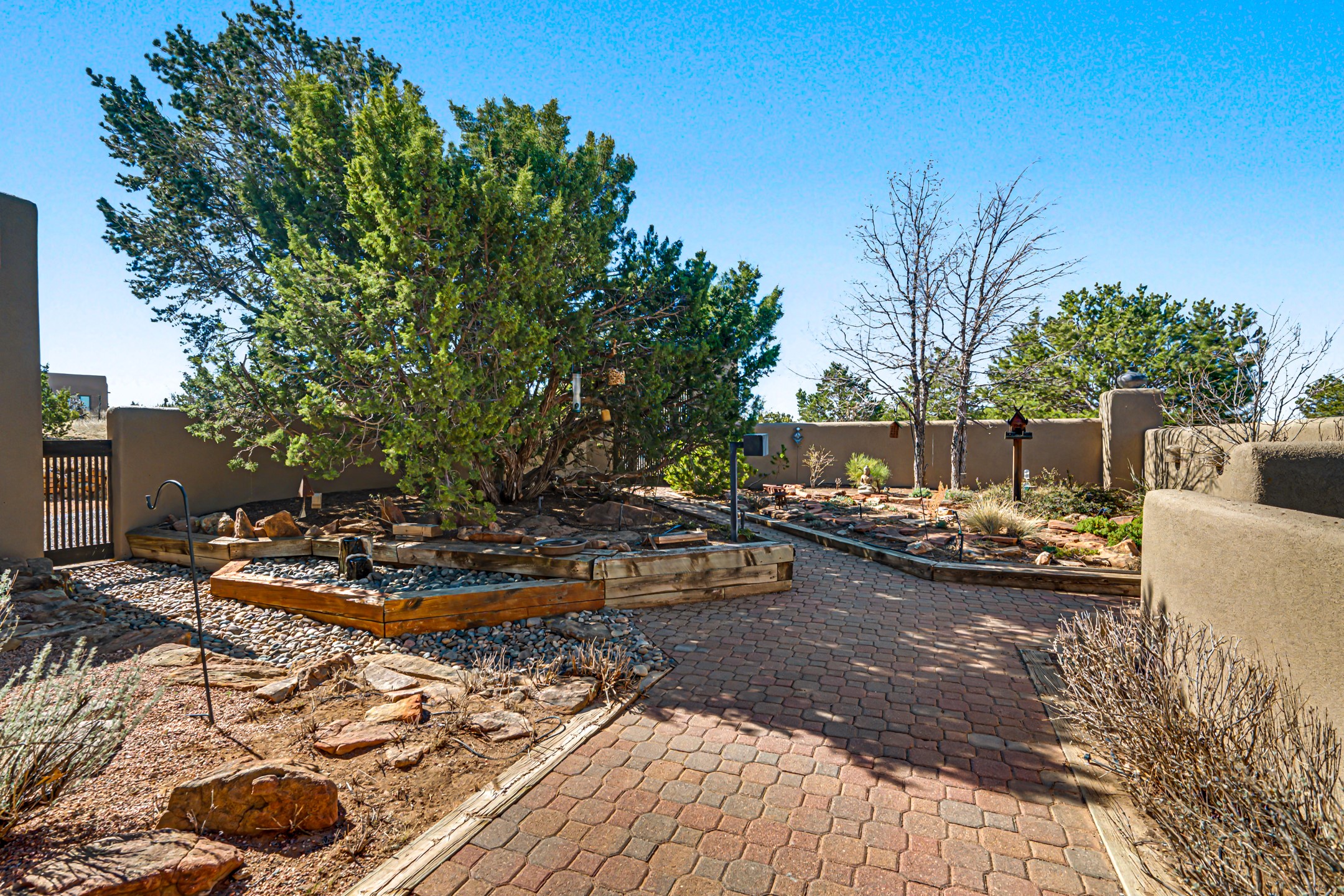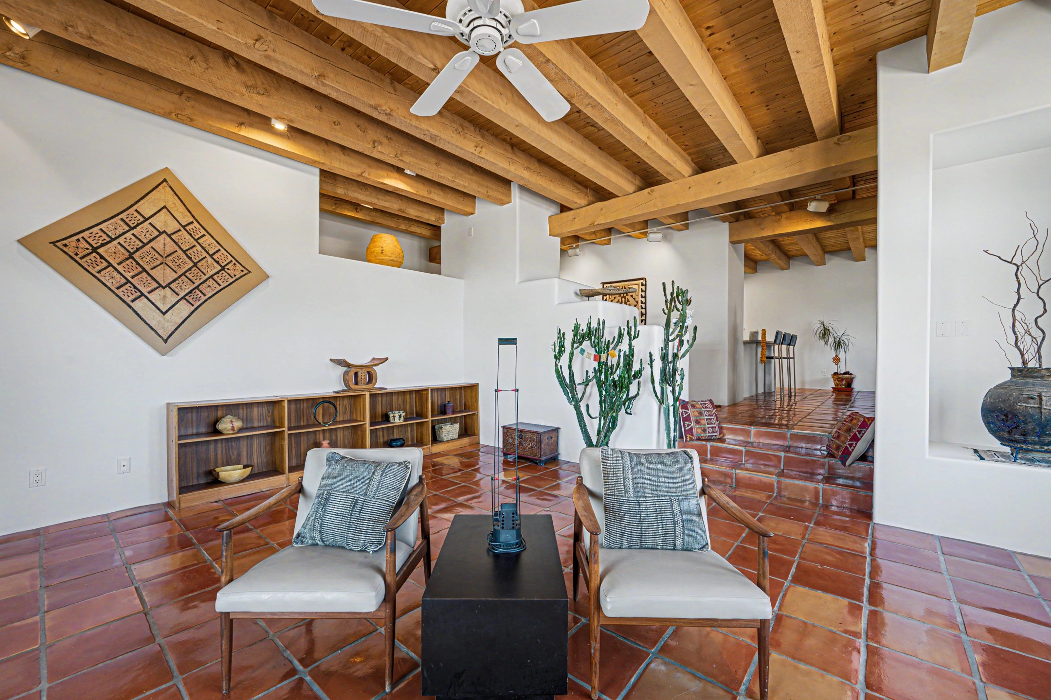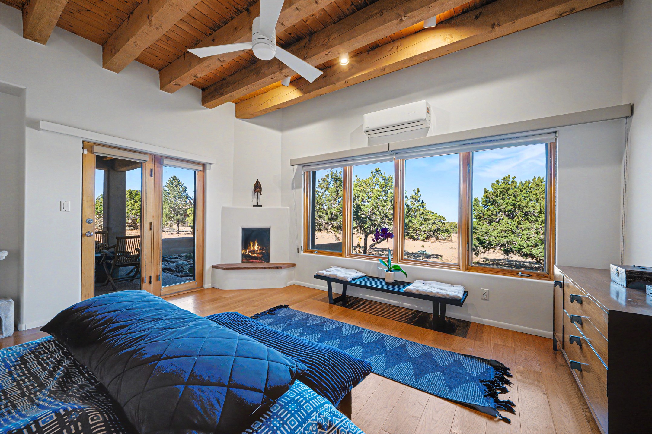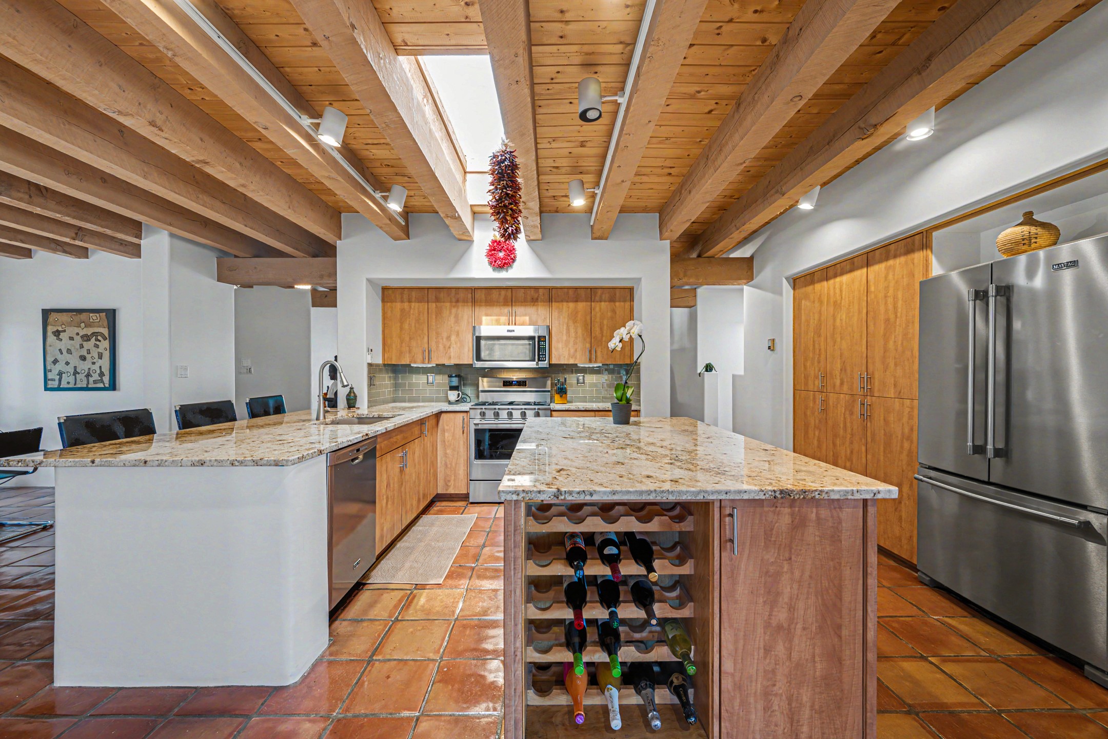 Stunning custom designed and built contemporary pueblo home privately located bordering a large Eldorado greenbelt. Gleaming saltillo tile floors, Kiva fireplaces and beam ceilings create that Santa Fe excitement while high ceilings and multiple long windows create a spacious sunny uplift throughout. There is an entertainers kitchen elegantly remodeled in 2017 with a large central island which flows to a formal dining area and a family room/den overlooking the north mountain foothills across the greenbelt. The sunken living room features a dramatic corner kiva fireplace and wonderful views to the west. There is excellent separation of primary suite from the guest bedrooms, all having Swedish engineered hardwood floors and the bathrooms have been totally refreshed in 2018. Two mini splits were added in 2018 for additional summer comfort. The boiler was replaced in 2019 and the home was re stuccoed in 2024. An oversized finished garage with plenty of storage and work area plus extra parking. This home shows pride of ownership inside and out. All this on 1.76 acres within easy reach of Eldorado amenities, local shopping, library, trails and parks, and only minutes into Santa Fe.