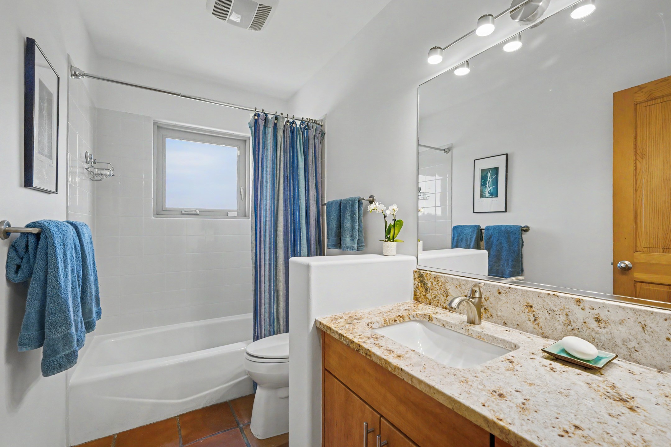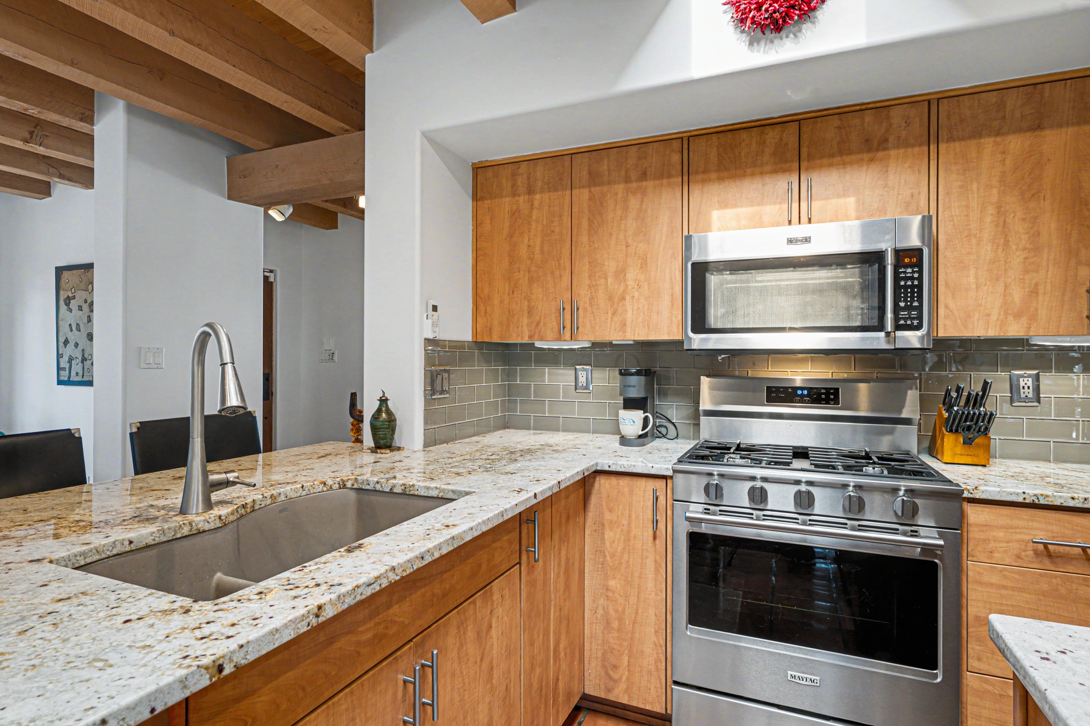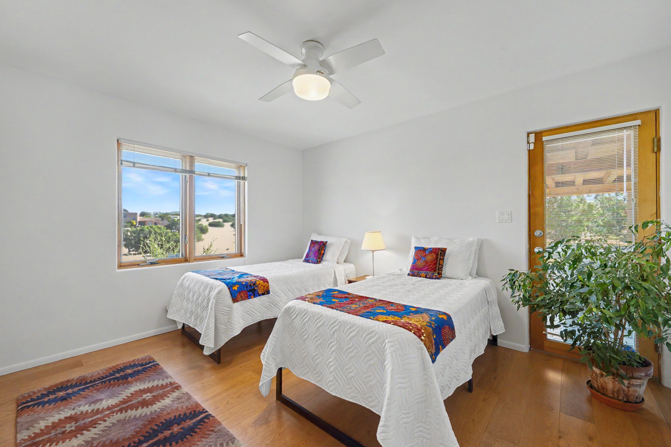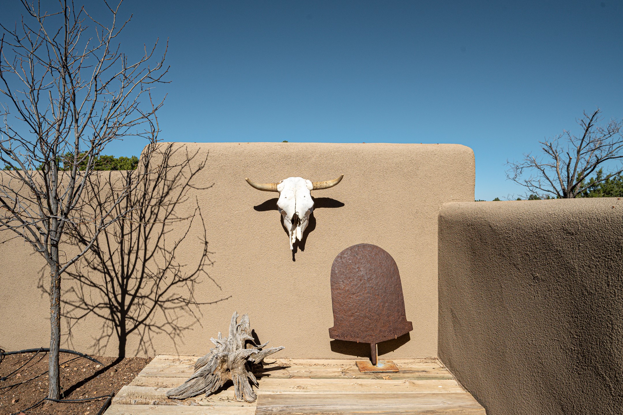 Stunning custom designed and built contemporary pueblo home privately located bordering a large Eldorado greenbelt. Gleaming saltillo tile floors, Kiva fireplaces and beam ceilings create that Santa Fe excitement while high ceilings and multiple long windows create a spacious sunny uplift throughout. There is an entertainers kitchen elegantly remodeled in 2017 with a large central island which flows to a formal dining area and a family room/den overlooking the north mountain foothills across the greenbelt. The sunken living room features a dramatic corner kiva fireplace and wonderful views to the west. There is excellent separation of primary suite from the guest bedrooms, all having Swedish engineered hardwood floors and the bathrooms have been totally refreshed in 2018. Two mini splits were added in 2018 for additional summer comfort. The boiler was replaced in 2019 and the home was re stuccoed in 2024. An oversized finished garage with plenty of storage and work area plus extra parking. This home shows pride of ownership inside and out. All this on 1.76 acres within easy reach of Eldorado amenities, local shopping, library, trails and parks, and only minutes into Santa Fe.