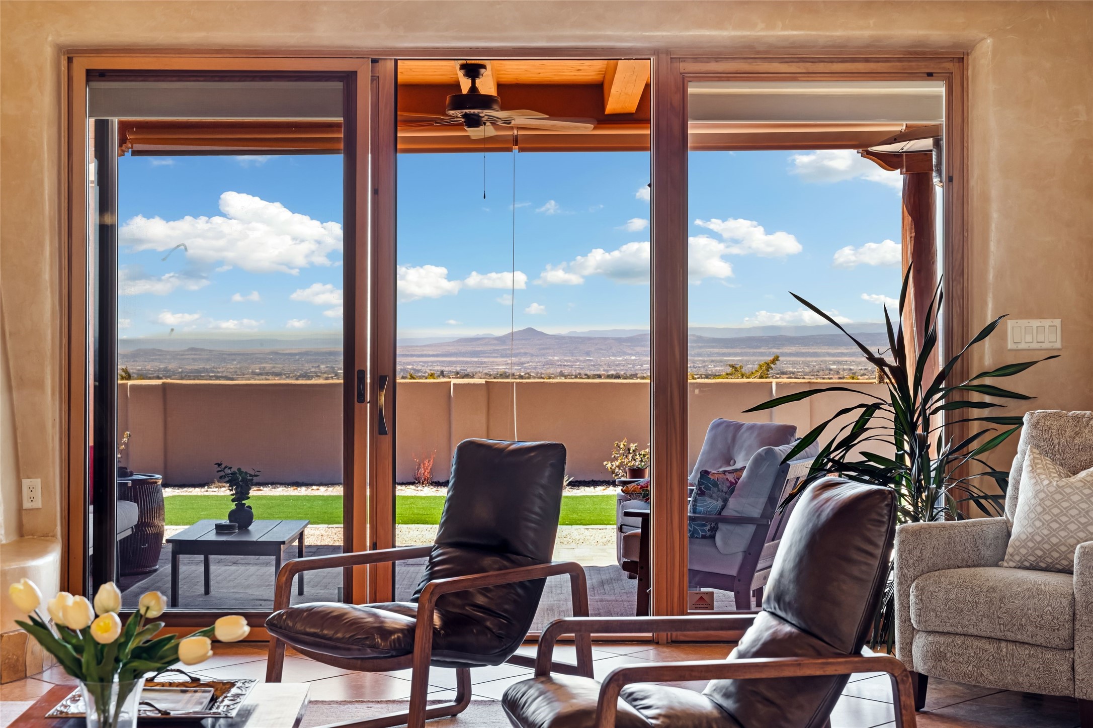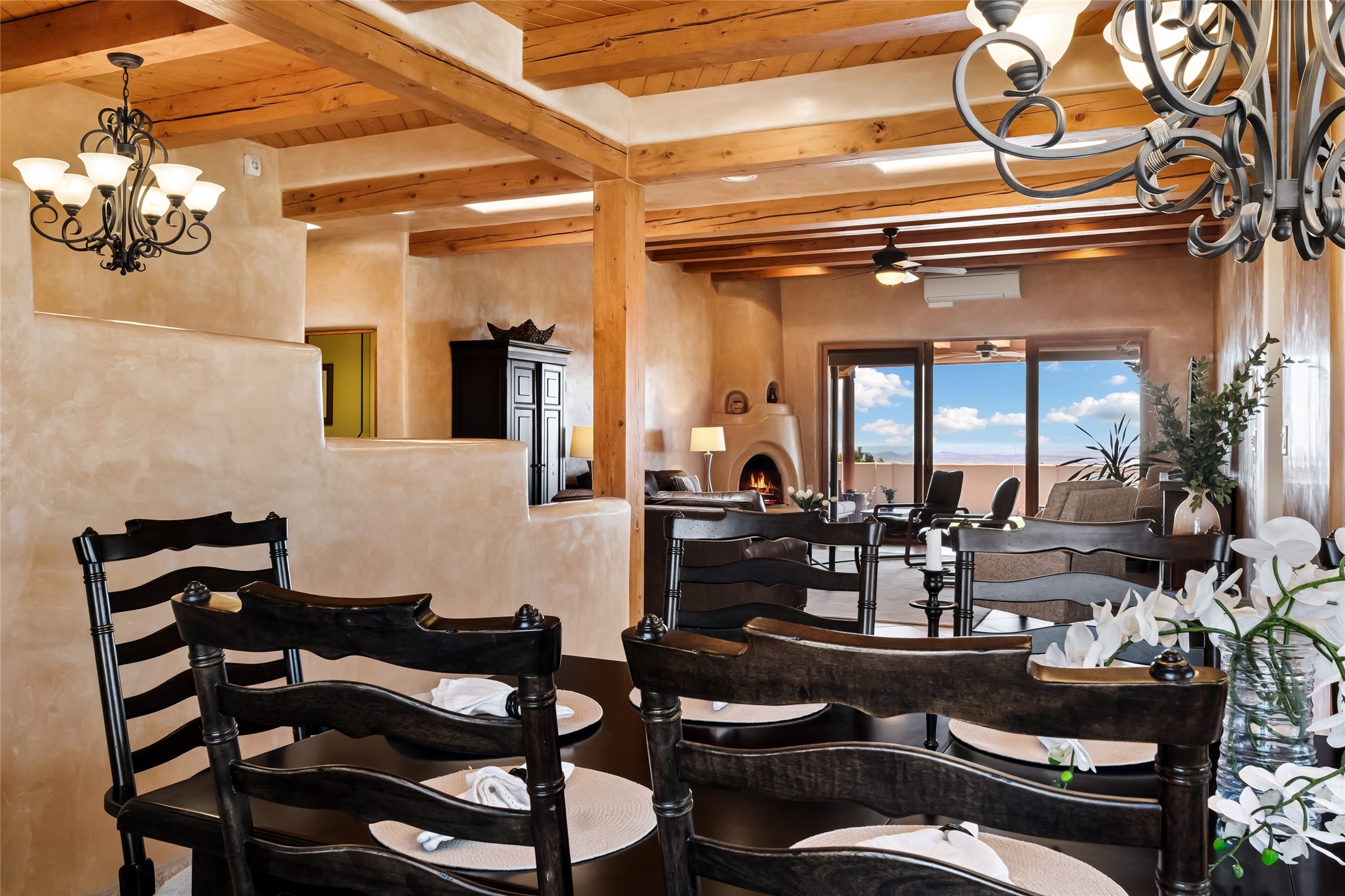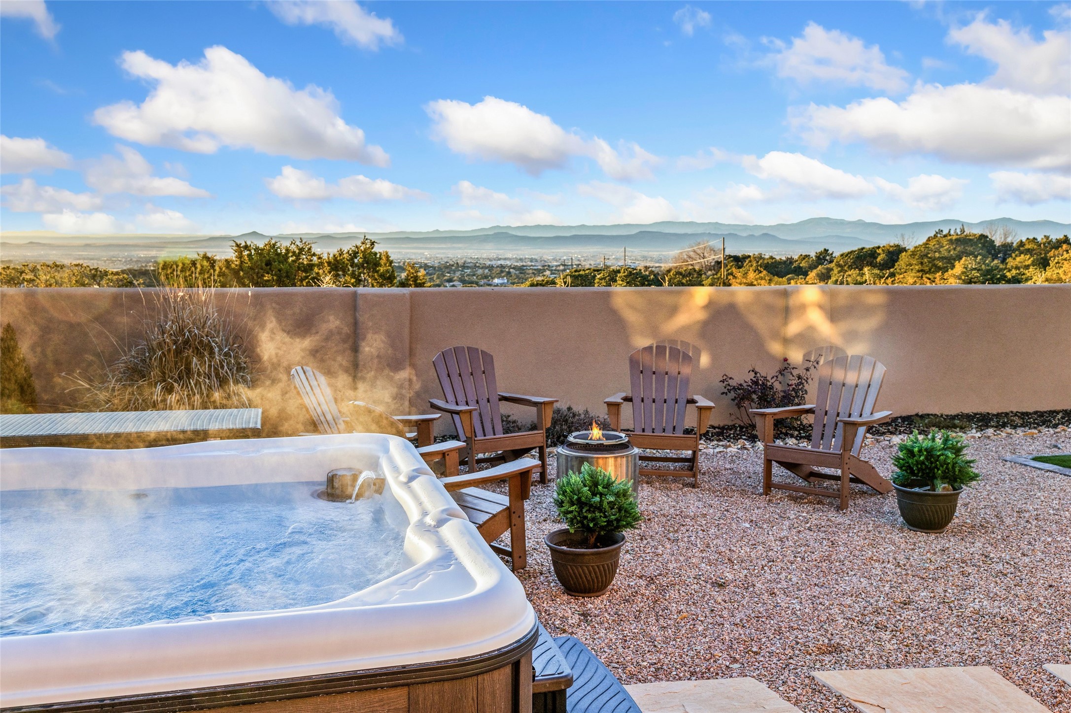 "Offering peace, privacy, and mountain views in every direction, 17 Sueo de Santa Fe is tucked away just minutes from downtown Santa Fe. This 5-acre property is ideally positioned to capture views of Sandia Mountain, the Sangre de Cristo sunrises, the Jemez Mountain sunsets, with convenient access to local favorites like El Gancho Fitness Swim & Racquet Club, Thrive Community School, and Harry's Roadhouse. Built in 2006, the 4-bedroom, 2.5-bath home features a flowing floor plan designed for both comfortable daily living and easy entertaining. Multiple west-facing sliding glass doors connect the interior living spaces to the backyard and covered portal, creating a seamless indoor-outdoor lifestyle. The recently remodeled kitchen opens to a spacious family room with a kiva fireplace. Additional highlights include a formal dining room, a separate living room with its own kiva fireplace, and refined finishes such as diamond plaster walls and travertine tile floors. The primary suite is a peaceful retreat with its own kiva fireplace, a generous walk-in closet, and a luxurious en-suite bath with a soaking tub. Outside, the recently redesigned backyard provides the perfect setting for entertaining, relaxing while enjoying the natural surroundings, or star gazing from the hot tub. With beautiful earth-toned stucco and modern mini-split systems for efficient year-round comfort, this home blends timeless Santa Fe style with thoughtful updates. Peaceful yet connected, it's an exceptional opportunity to enjoy a rare combination of privacy, natural beauty, and the Santa Fe lifestyle in one of the area's most sought-after settings."