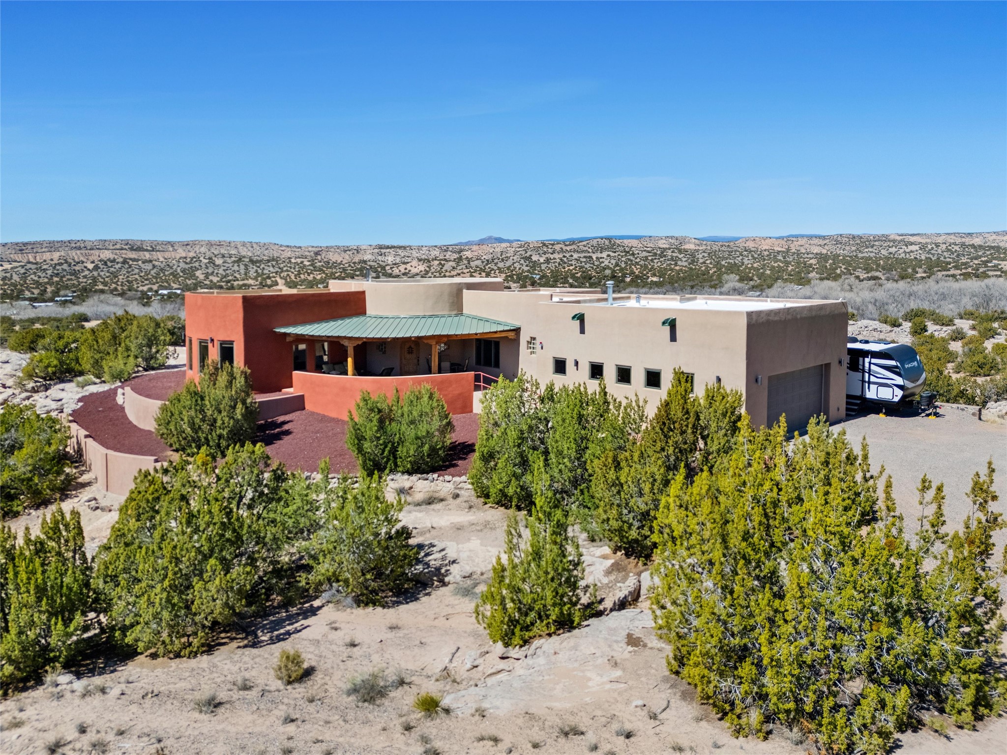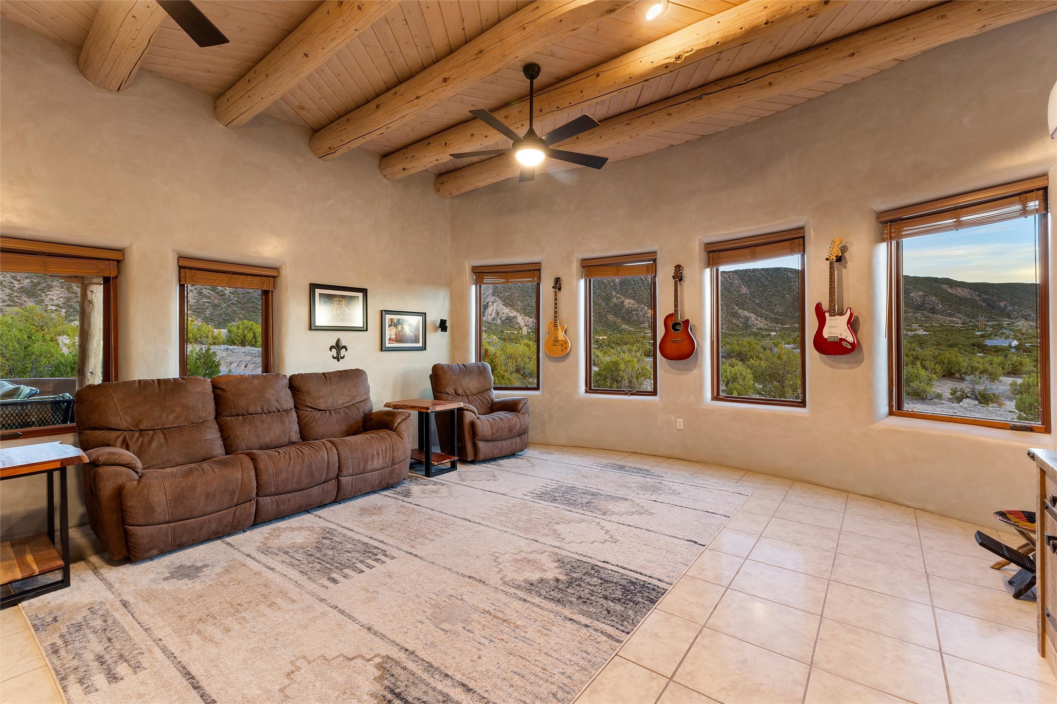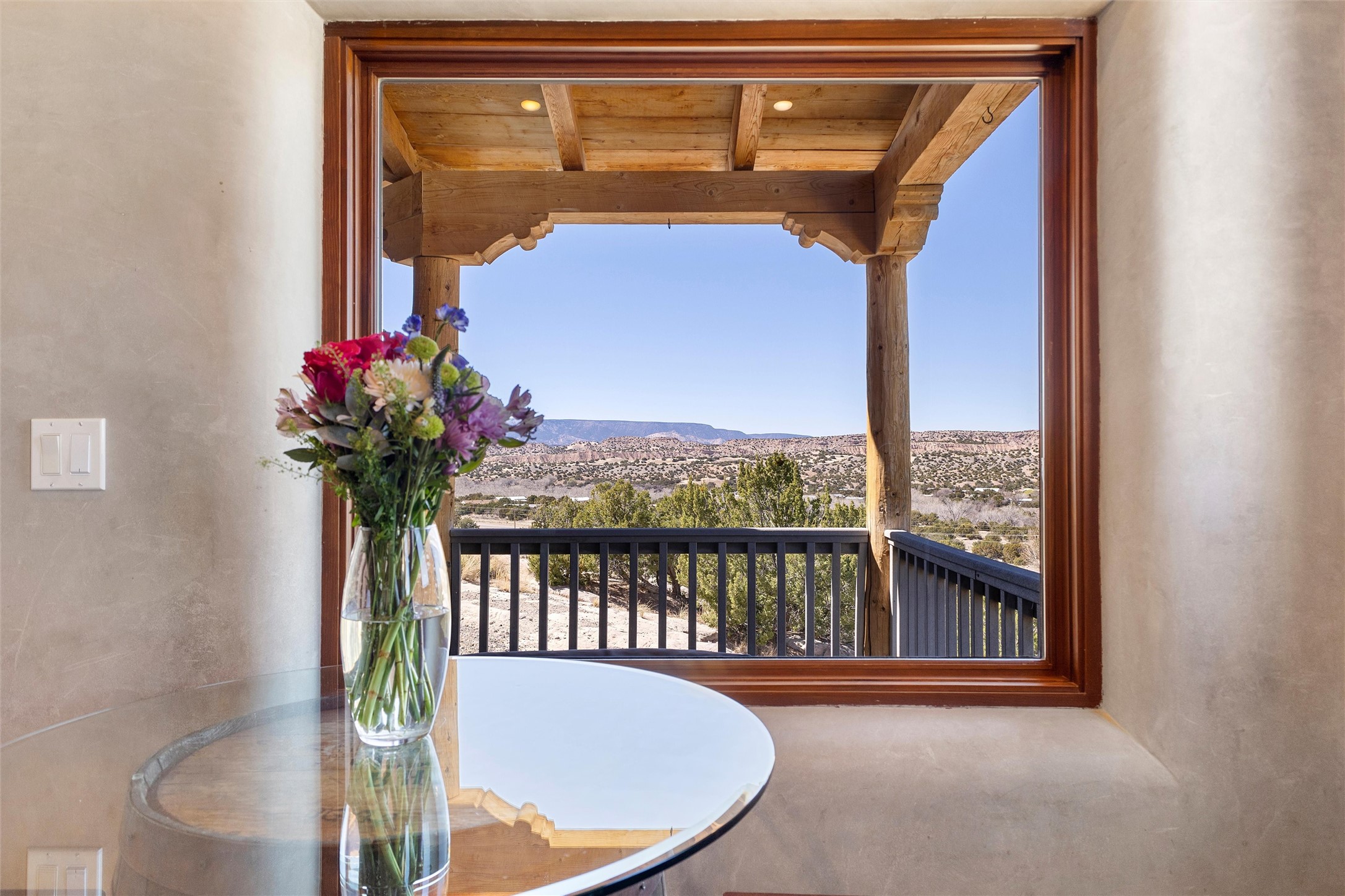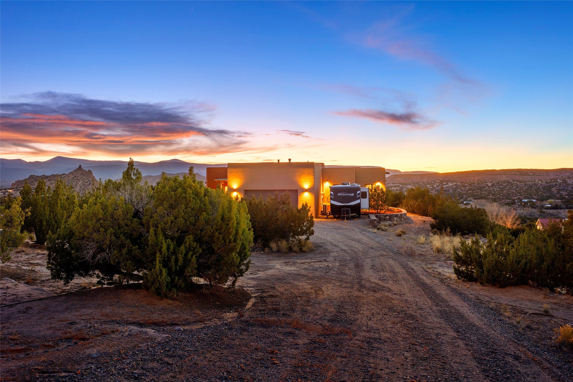 Heart-stopping views and truly astonishing vistas define this exceptional 2007 custom home set on 5+ private acres, including its own hoodoo rock formation. Built with highly insulated R-32 Rastra construction, this residence offers a rare blend of efficiency, comfort, and luxury just 13 minutes south of Ojo Caliente Hot Springs, 35 minutes to Los Alamos, 45 minutes to the Santa Fe Plaza, and an hour to Taos. A 5-zone ductless mini-split system added in 2024 provides year-round comfort.Located within the gated community of Rio Ojo Caliente, this home welcomes you with a covered portal entry and a hand-carved arched door. Inside, the grand living room features diamond-finish plaster walls, exposed wooden beams, and distinctive architectural details. The home has also benefited from recent stucco maintenance, full canales repair, sealing, and repainting, a freshly re-sealed roof in 2026 with warranty, and septic system servicing completed.Designed for comfort and privacy, the home offers excellent bedroom separation. The spacious primary suite opens to a wraparound covered composite deck portal with sweeping views of the Ojo Caliente River Valley, cottonwoods, Sierra Negra, Black Mesa, and the Pajarito ski area. The en-suite bath includes dual walk-in closets, soaking tub, and walk-in shower.The kitchen flows to the rear portal through French doors, ideal for entertaining or enjoying New Mexico sunsets. Both front and rear portals feature metal roofing added in 2023, offering 815 square feet of covered outdoor living.Additional highlights include 2 living areas, a formal dining room, oversized heated garage with two storage closets, and a 30-amp RV connection. The driveway was improved with new base course and grading in 2025.Private and quiet yet less than an hour from the restaurants, galleries, and culture of Santa Fe and Taos, with nearby hiking, biking, fishing, rafting and wildlife viewing.
