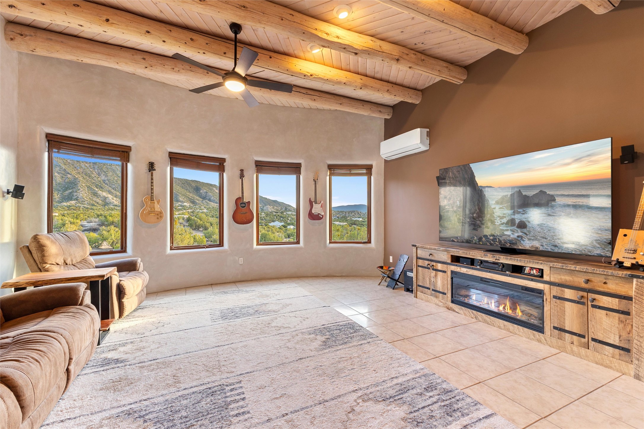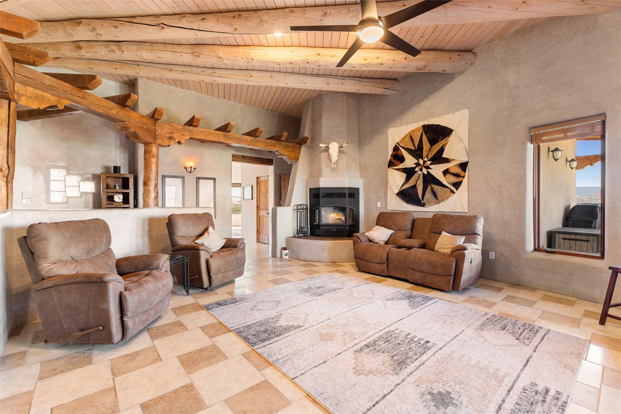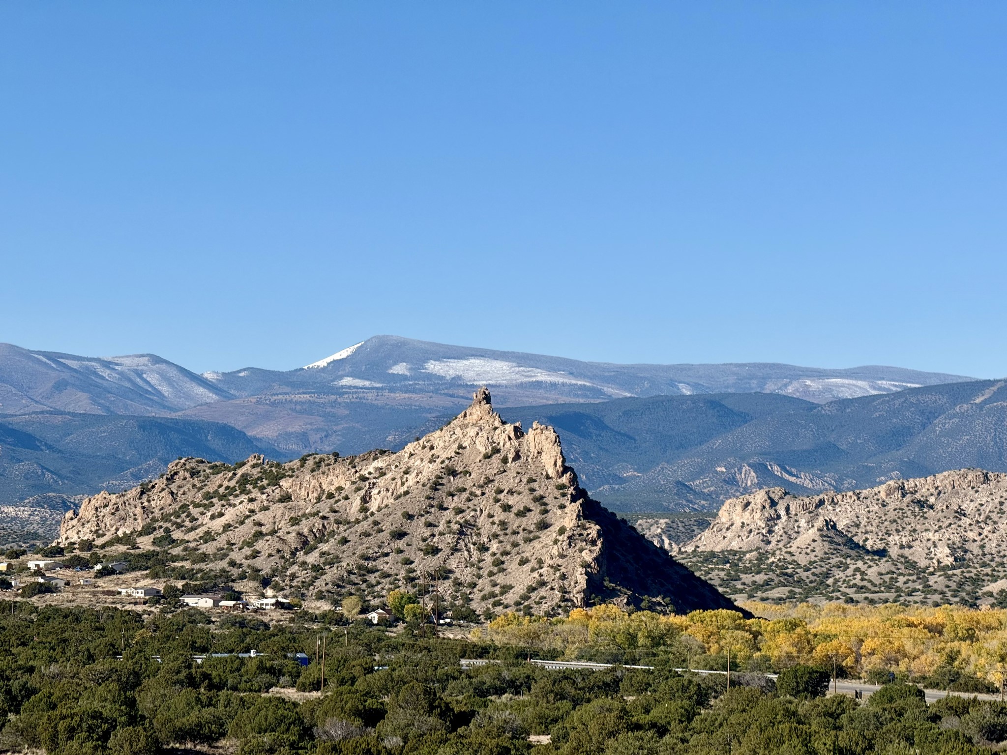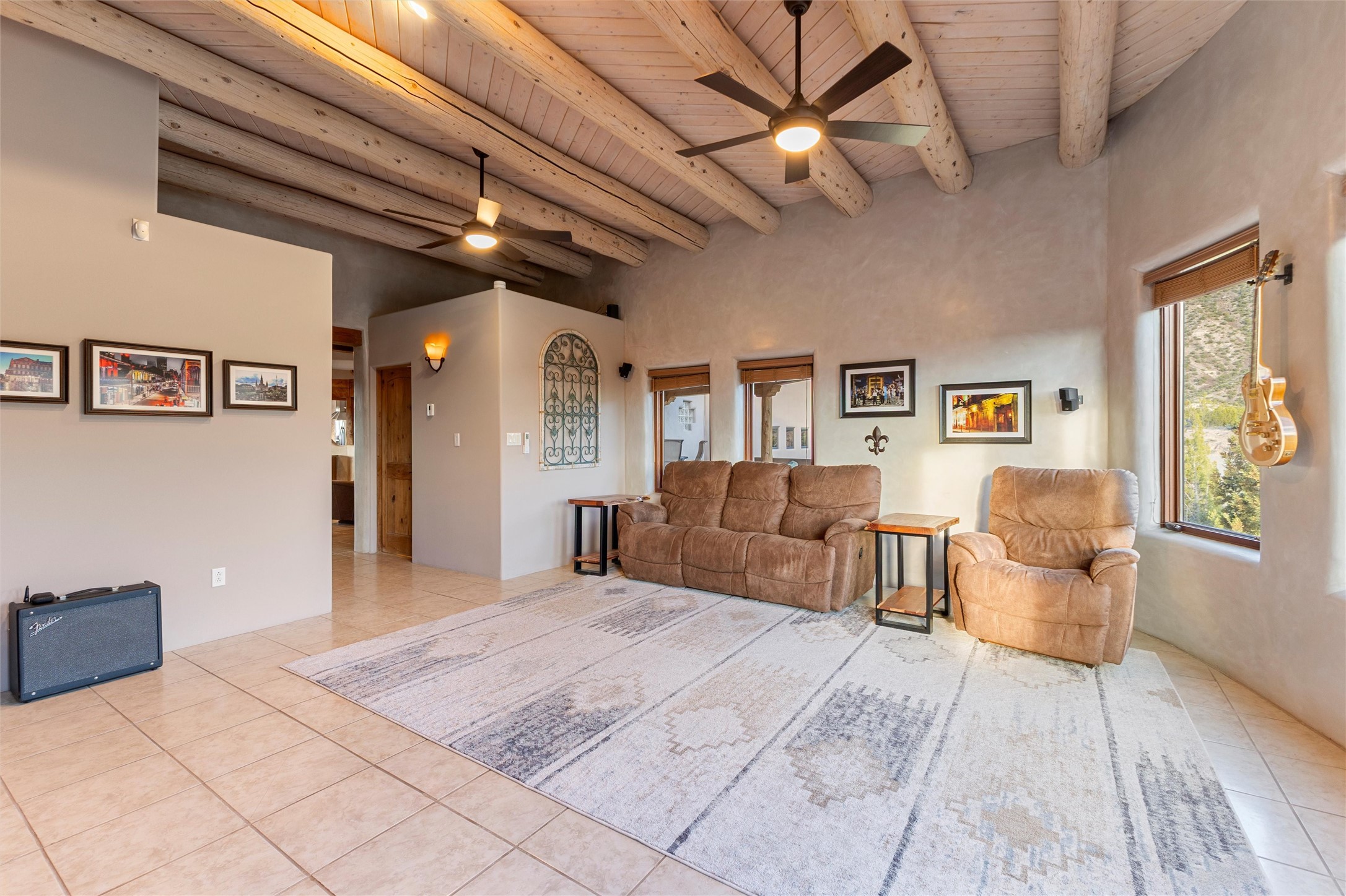 Heart-stopping views and truly astonishing vistas define this exceptional 2007 custom home set on 5+ private acres, including its own hoodoo rock formation. Built with highly insulated R-32 Rastra construction, this residence offers a rare blend of efficiency, comfort, and luxury just 13 minutes south of Ojo Caliente Hot Springs, 35 minutes to Los Alamos, 45 minutes to the Santa Fe Plaza, and an hour to Taos. A 5-zone ductless mini-split system added in 2024 provides year-round comfort.Located within the gated community of Rio Ojo Caliente, this home welcomes you with a covered portal entry and a hand-carved arched door. Inside, the grand living room features diamond-finish plaster walls, exposed wooden beams, and distinctive architectural details. The home has also benefited from recent stucco maintenance, full canales repair, sealing, and repainting, a freshly re-sealed roof in 2026 with warranty, and septic system servicing completed.Designed for comfort and privacy, the home offers excellent bedroom separation. The spacious primary suite opens to a wraparound covered composite deck portal with sweeping views of the Ojo Caliente River Valley, cottonwoods, Sierra Negra, Black Mesa, and the Pajarito ski area. The en-suite bath includes dual walk-in closets, soaking tub, and walk-in shower.The kitchen flows to the rear portal through French doors, ideal for entertaining or enjoying New Mexico sunsets. Both front and rear portals feature metal roofing added in 2023, offering 815 square feet of covered outdoor living.Additional highlights include 2 living areas, a formal dining room, oversized heated garage with two storage closets, and a 30-amp RV connection. The driveway was improved with new base course and grading in 2025.Private and quiet yet less than an hour from the restaurants, galleries, and culture of Santa Fe and Taos, with nearby hiking, biking, fishing, rafting and wildlife viewing.