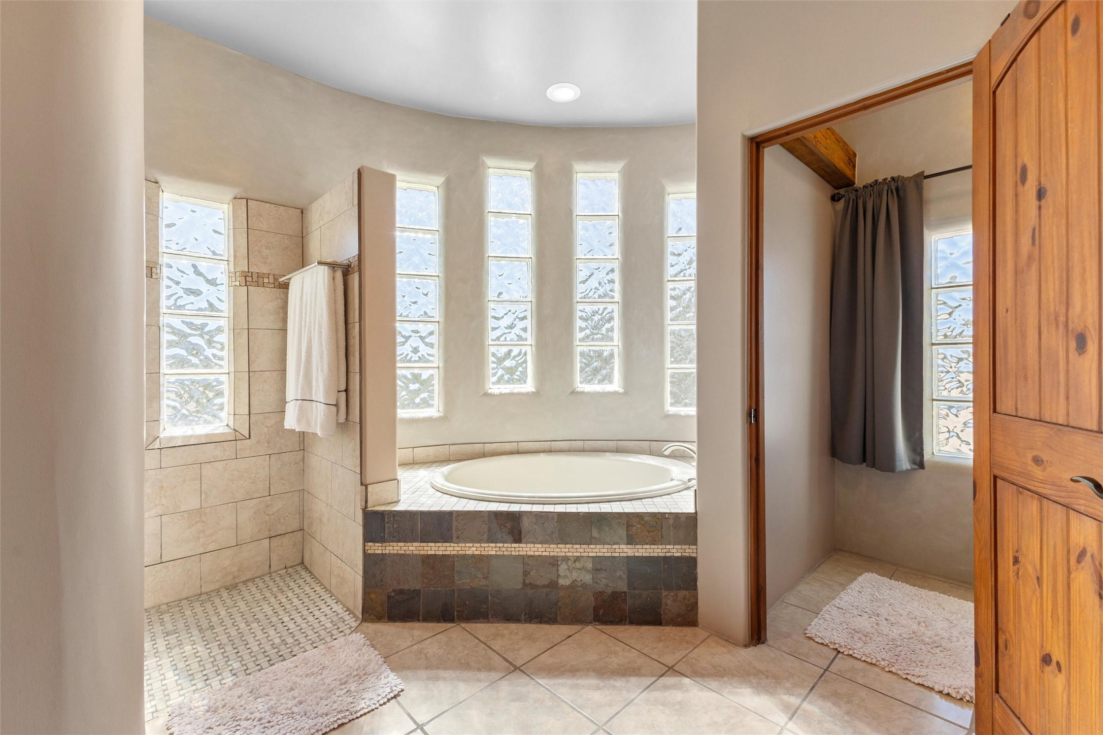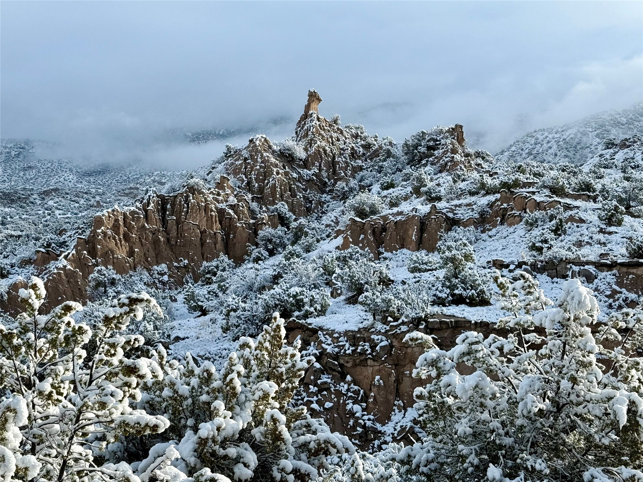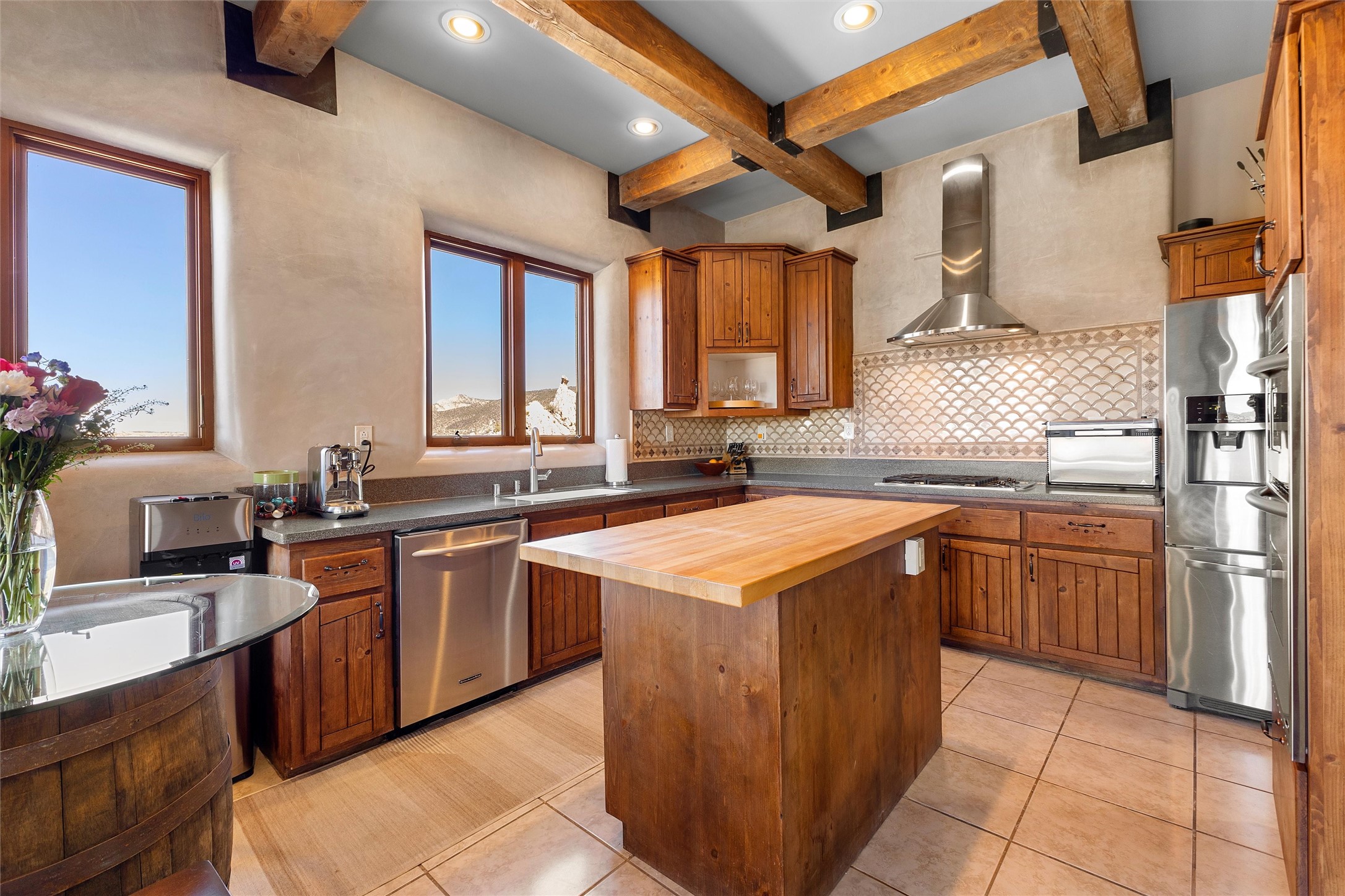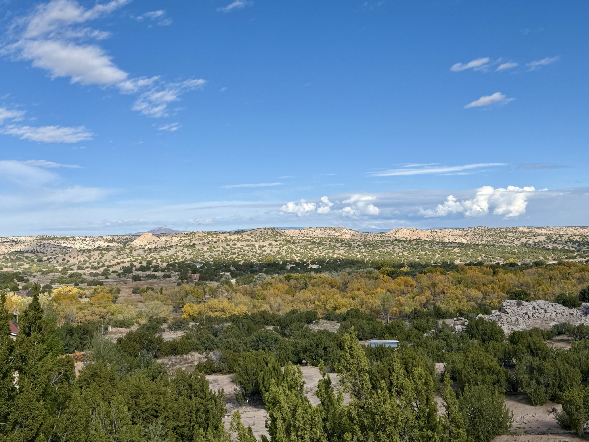 Heart-stopping views and truly astonishing vistas define this exceptional 2007 custom home set on 5+ private acres, including its own hoodoo rock formation. Built with highly insulated R-32 Rastra construction, this residence offers a rare blend of efficiency, comfort, and luxury just 13 minutes south of Ojo Caliente Hot Springs, 35 minutes to Los Alamos, 45 minutes to the Santa Fe Plaza, and an hour to Taos. A 5-zone ductless mini-split system added in 2024 provides year-round comfort.Located within the gated community of Rio Ojo Caliente, this home welcomes you with a covered portal entry and a hand-carved arched door. Inside, the grand living room features diamond-finish plaster walls, exposed wooden beams, and distinctive architectural details. The home has also benefited from recent stucco maintenance, full canales repair, sealing, and repainting, a freshly re-sealed roof in 2026 with warranty, and septic system servicing completed.Designed for comfort and privacy, the home offers excellent bedroom separation. The spacious primary suite opens to a wraparound covered composite deck portal with sweeping views of the Ojo Caliente River Valley, cottonwoods, Sierra Negra, Black Mesa, and the Pajarito ski area. The en-suite bath includes dual walk-in closets, soaking tub, and walk-in shower.The kitchen flows to the rear portal through French doors, ideal for entertaining or enjoying New Mexico sunsets. Both front and rear portals feature metal roofing added in 2023, offering 815 square feet of covered outdoor living.Additional highlights include 2 living areas, a formal dining room, oversized heated garage with two storage closets, and a 30-amp RV connection. The driveway was improved with new base course and grading in 2025.Private and quiet yet less than an hour from the restaurants, galleries, and culture of Santa Fe and Taos, with nearby hiking, biking, fishing, rafting and wildlife viewing.