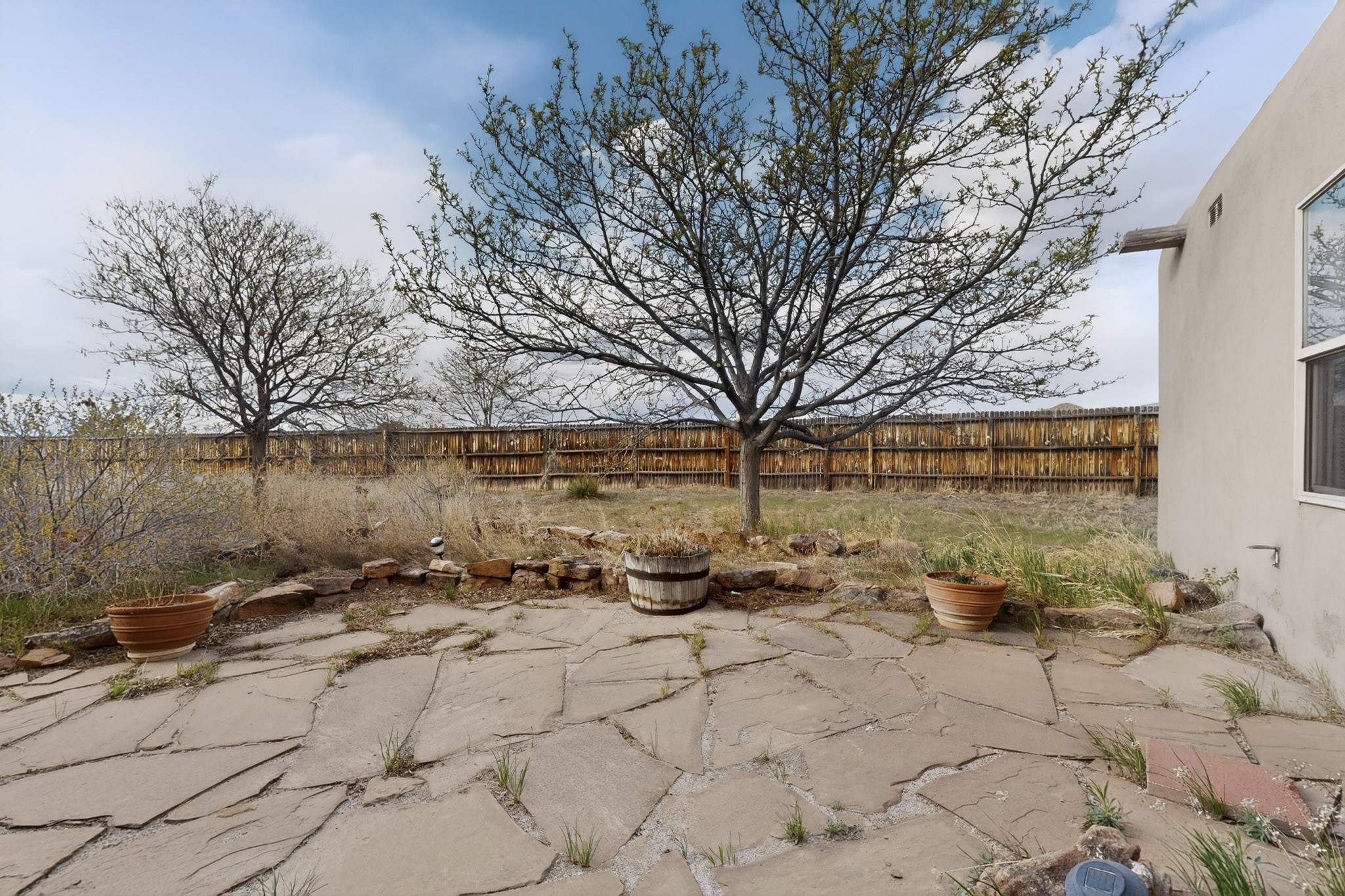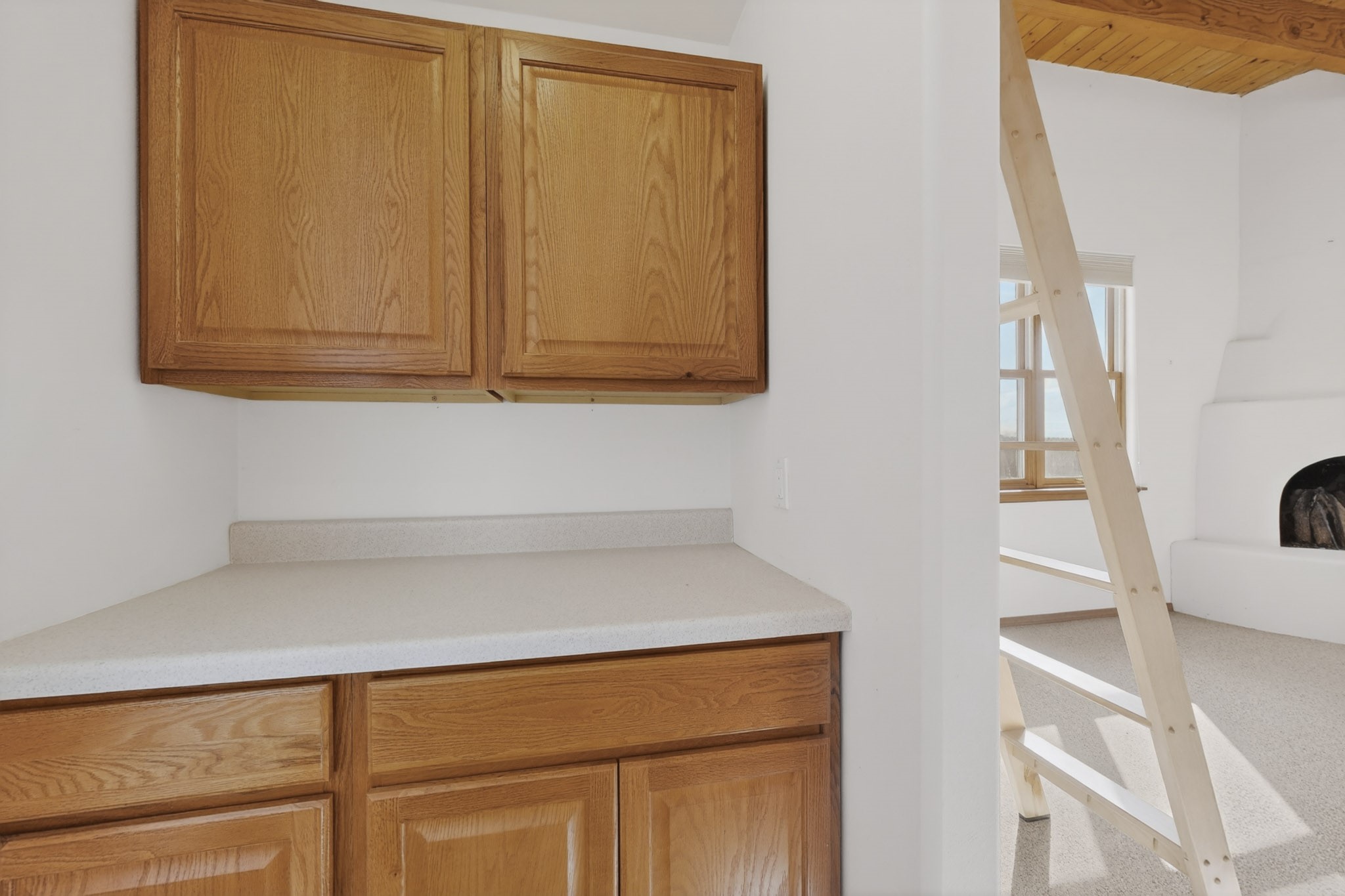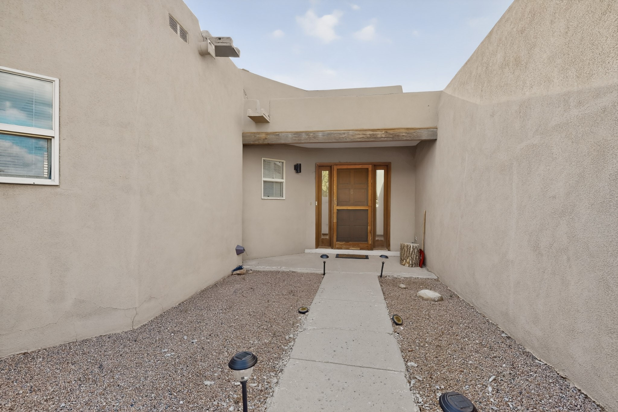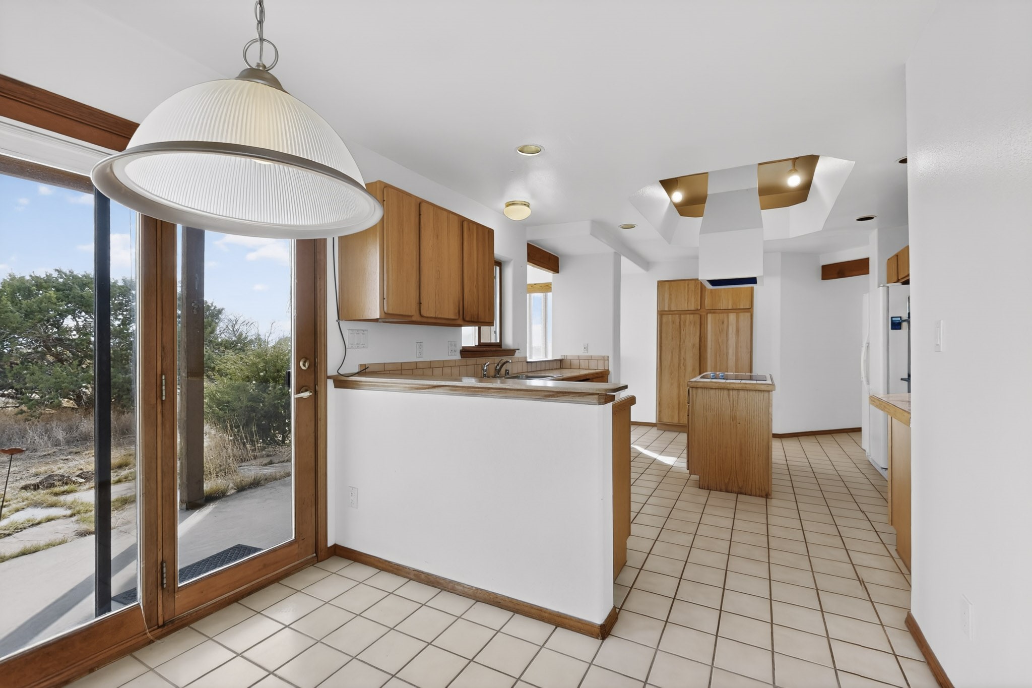 A Painter's Studio custom built for a painter including high ceiling, tons of light and special art storage area. Originally custom built by Hi Point for an artist couple, this 3 bedroom, 2 bath passive solar designed home is filled with light. The kitchen includes an east facing breakfast nook ideal for your morning beverage, a central island, and a dining area which also makes a lovely office. Steps lead down to the livingroom featuring high beam ceilings and kiva fireplace, plus long southern exposure to sunset mountain views. The main bedroom is nicely separated from the guest suite, and can also access the studio for night time inspired moments! There are two portals and a large privately fenced yard, plus a 2 car garage with circular driveway. This home needs TLC which over time will bring it back to its former glory. Conveniently located just off paved access to Eldorado Amenities and local shopping, hike/bike trails, greenbelt, and minutes into Santa Fe.