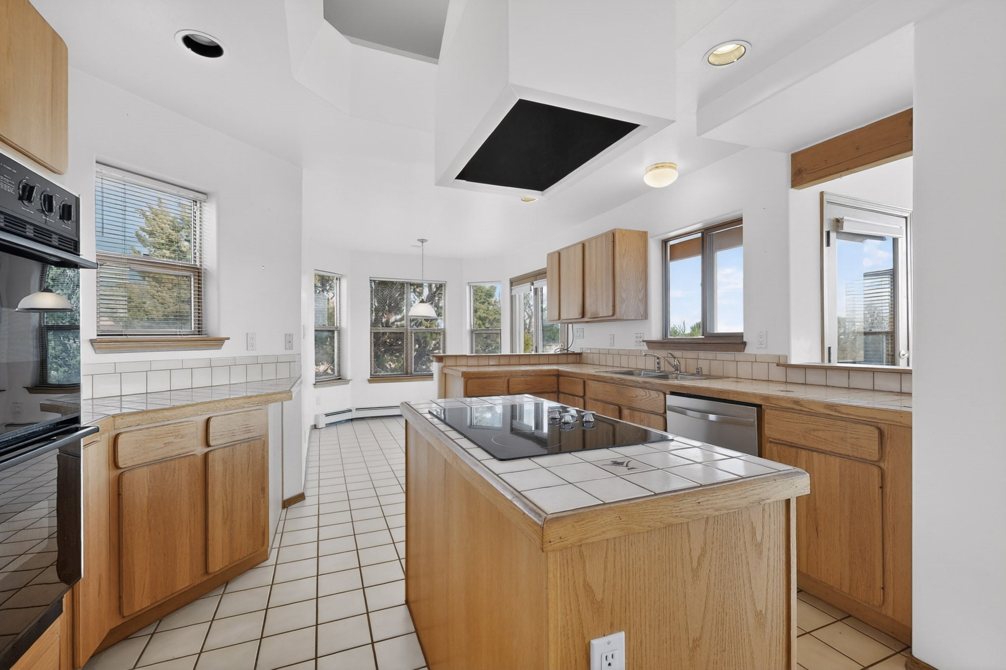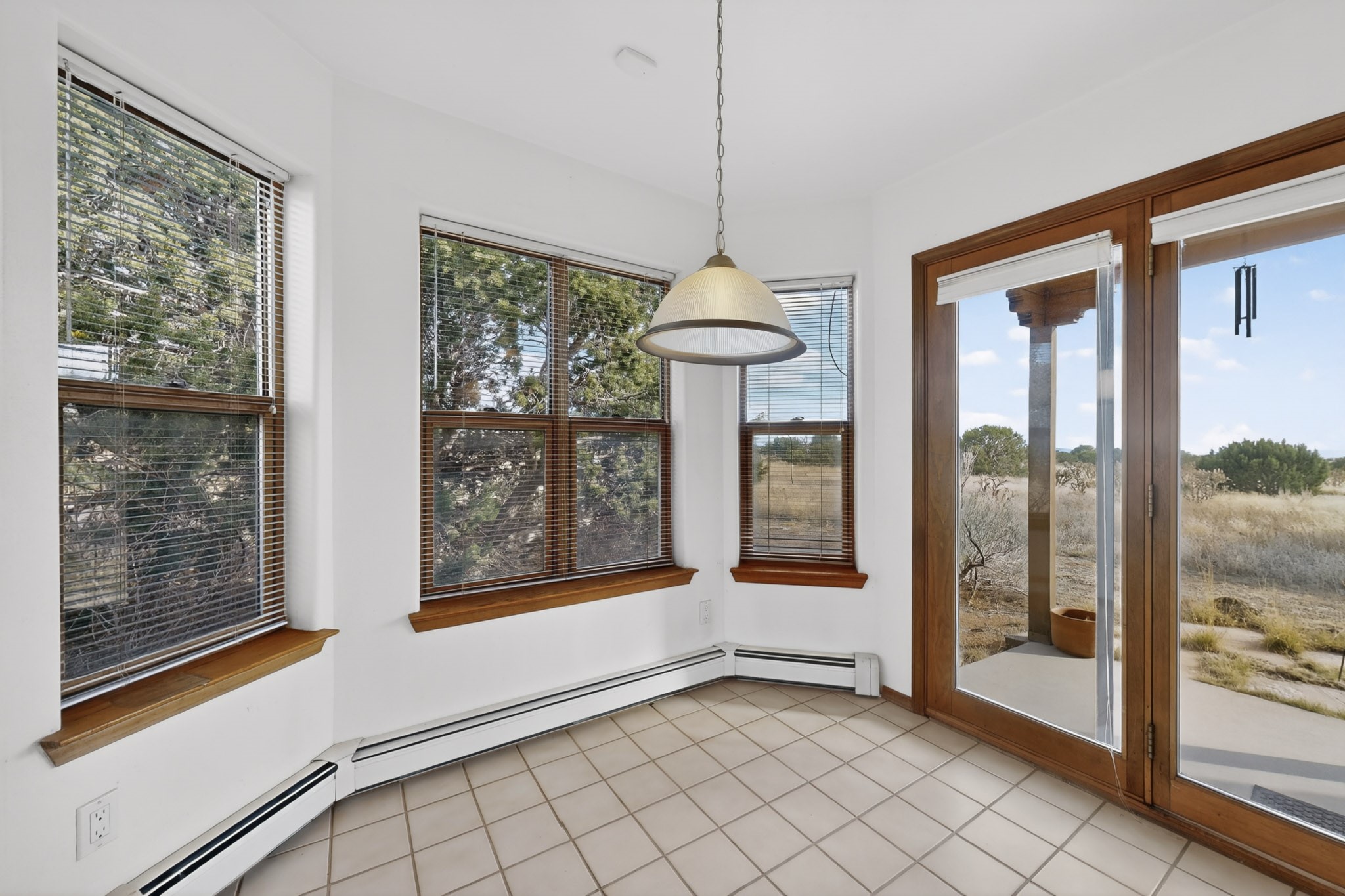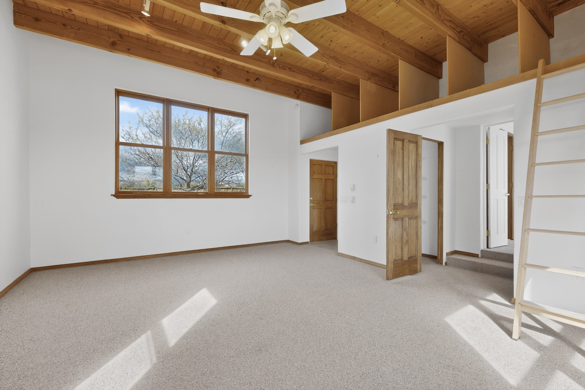A Painter's Studio custom built for a painter including high ceiling, tons of light and special art storage area. Originally custom built by Hi Point for an artist couple, this 3 bedroom, 2 bath passive solar designed home is filled with light. The kitchen includes an east facing breakfast nook ideal for your morning beverage, a central island, and a dining area which also makes a lovely office. Steps lead down to the livingroom featuring high beam ceilings and kiva fireplace, plus long southern exposure to sunset mountain views. The main bedroom is nicely separated from the guest suite, and can also access the studio for night time inspired moments! There are two portals and a large privately fenced yard, plus a 2 car garage with circular driveway. This home needs TLC which over time will bring it back to its former glory. Conveniently located just off paved access to Eldorado Amenities and local shopping, hike/bike trails, greenbelt, and minutes into Santa Fe.