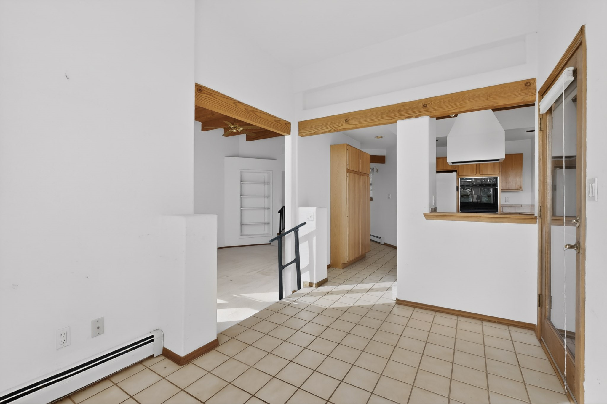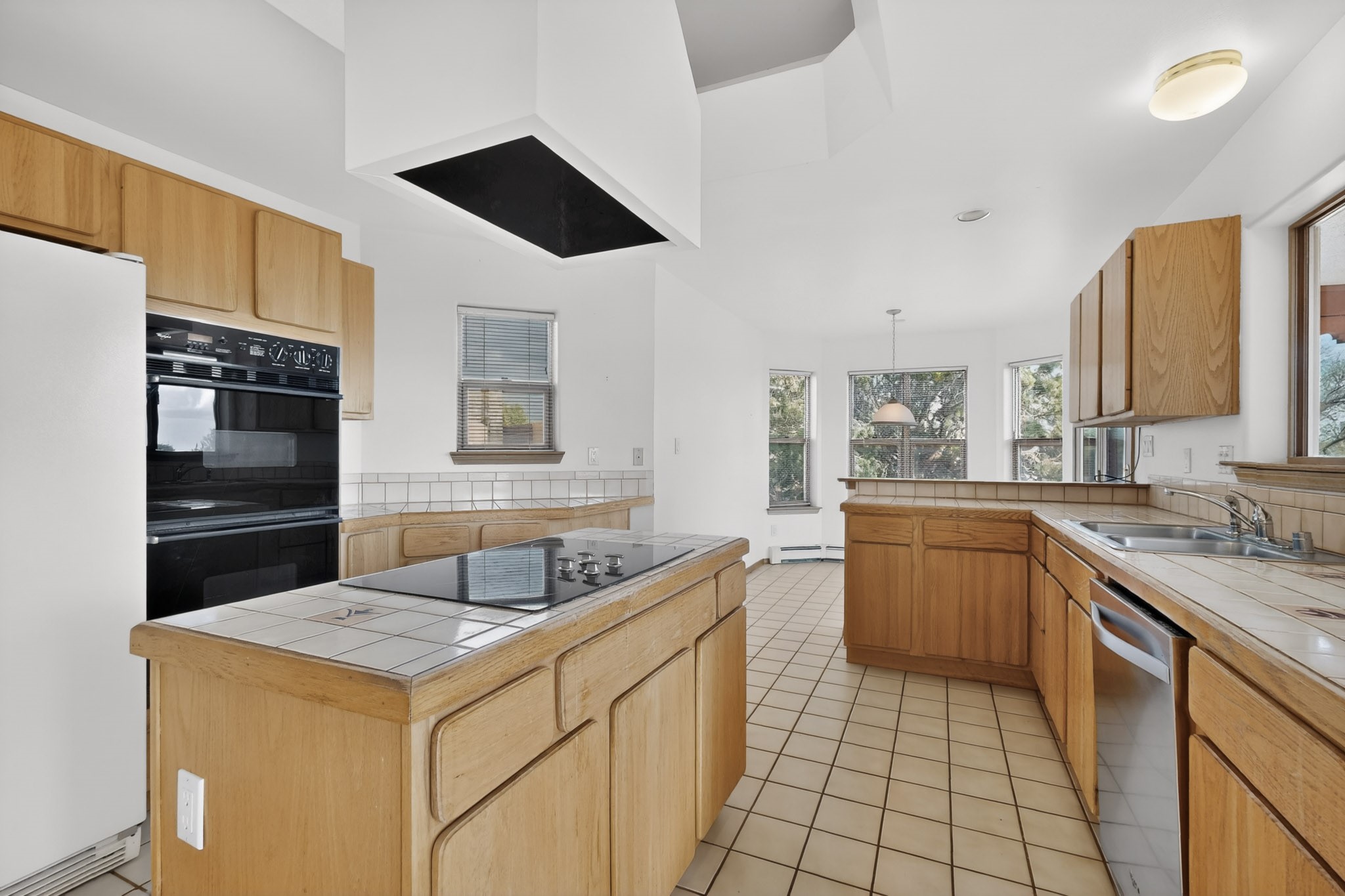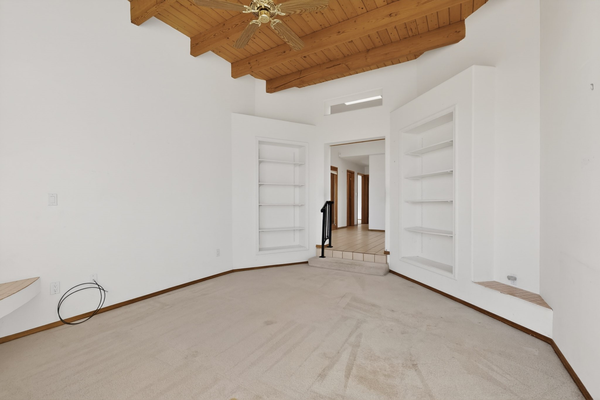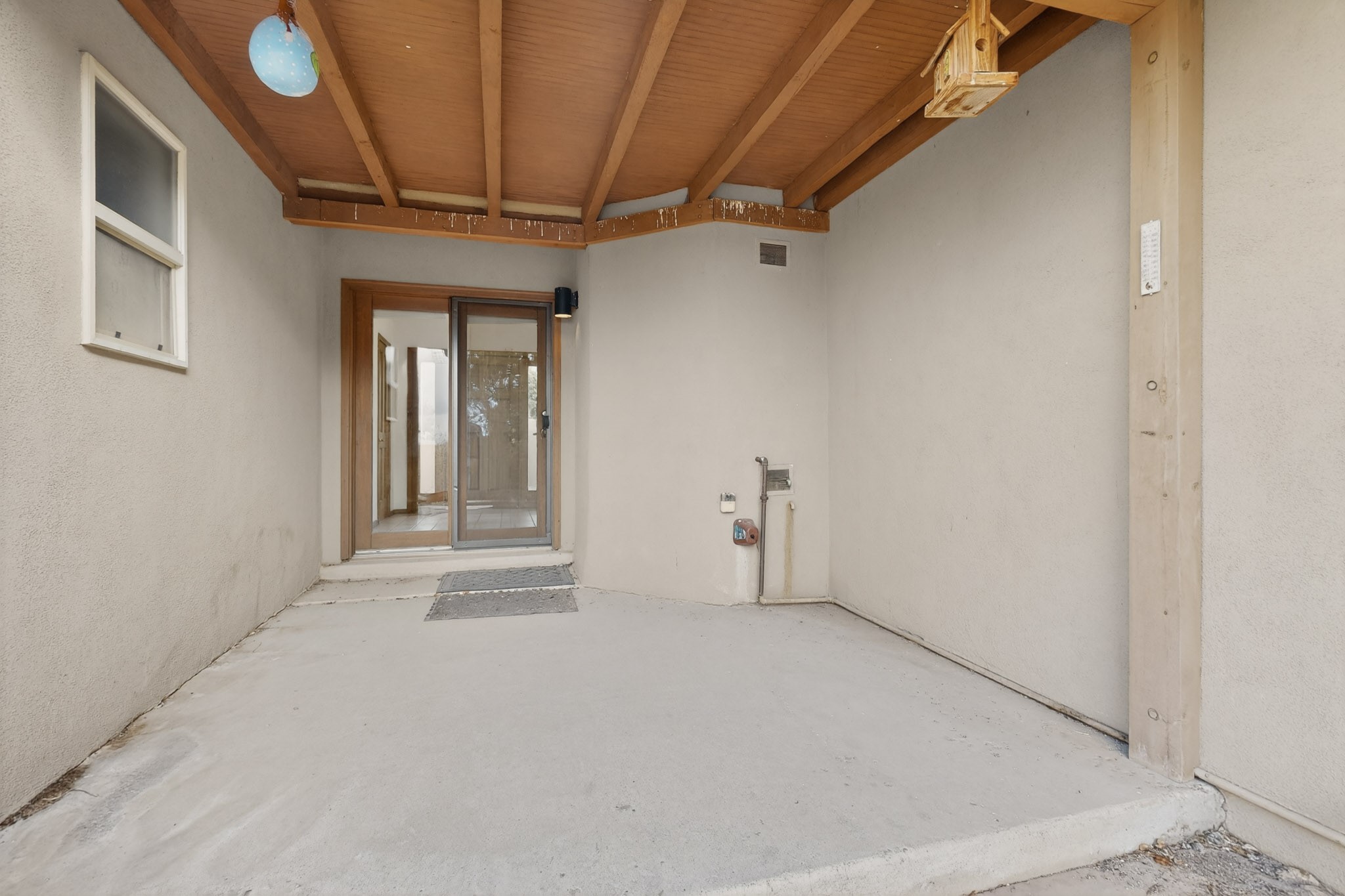 A Painter's Studio custom built for a painter including high ceiling, tons of light and special art storage area. Originally custom built by Hi Point for an artist couple, this 3 bedroom, 2 bath passive solar designed home is filled with light. The kitchen includes an east facing breakfast nook ideal for your morning beverage, a central island, and a dining area which also makes a lovely office. Steps lead down to the livingroom featuring high beam ceilings and kiva fireplace, plus long southern exposure to sunset mountain views. The main bedroom is nicely separated from the guest suite, and can also access the studio for night time inspired moments! There are two portals and a large privately fenced yard, plus a 2 car garage with circular driveway. This home needs TLC which over time will bring it back to its former glory. Conveniently located just off paved access to Eldorado Amenities and local shopping, hike/bike trails, greenbelt, and minutes into Santa Fe.