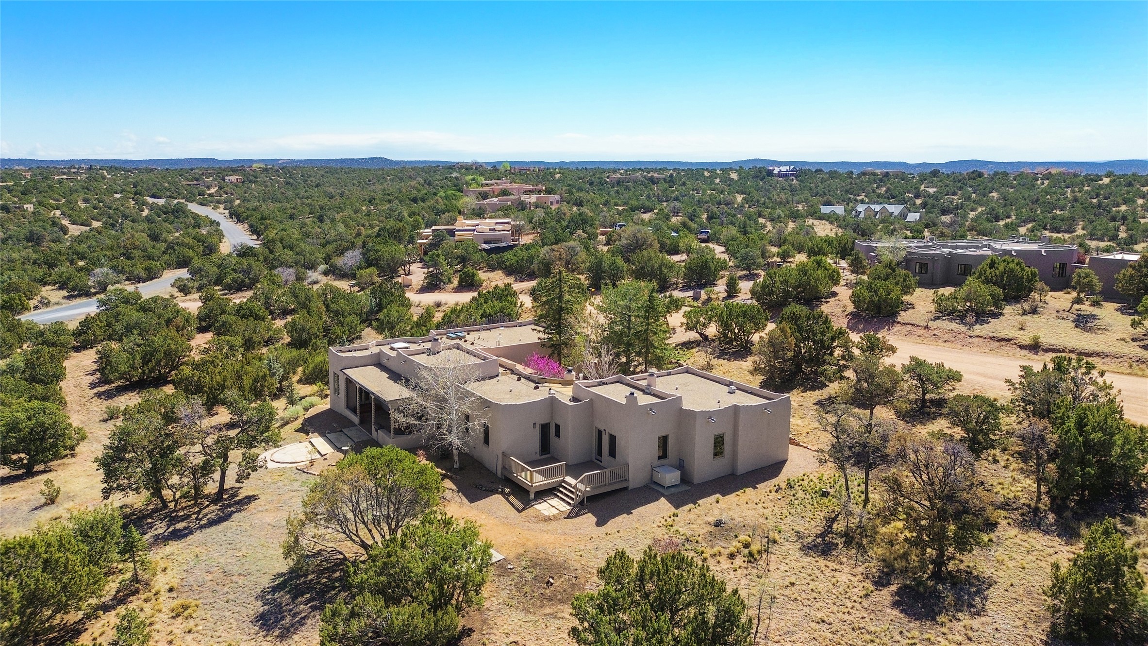 Exquisite Santa Fe-style custom residence showcasing timeless craftsmanship and refined Southwestern elegance. Wood-planked soaring ceilings, hand-carved posts, rich adobe accent walls, and brick floors create a warm, inviting atmosphere that blends seamlessly with the serene natural surroundings. Privately set in a park-like setting on over three lush, treed acres, the home captures sweeping views. The thoughtfully designed open floor plan slows effortlessly, with expansive windows framing the landscape and nearly every room offering direct access to the outdoors. Hand-carved Nichos and three traditional kiva fireplaces add distinctive architectural character and charm. A gated courtyard entry provides a welcoming and intimate arrival experience, The rear portal offers an idyllic setting for sunset gatherings wildlife observations, birding, and outdoor dining while a flagstone patio extends gracefully into the surrounding land. This on-of-kind property is rich in ambiance and authenticity. Tastefully remodeled, the home features a beautifully updated kitchen and bath, a high-efficiency natural gas radiant heating system (Pex tubing), and refreshed stucco. Additional upgrades include an on-demand hot water system and a recently installed septic system for peace of mind. The acreage allows for horses and is currently home to roaming deer and native wildlife, enhancing the sense of tranquility and connection to nature. A spacious three-car garage completes the offering. Ideally located just minutes from the heart of Santa Fe, with convenient access to local amenities, dining, and shopping, this exeptional property offers the perfect balance of privacy, compfort, and sophistication. Watch the video and check out the Virtual Tour!