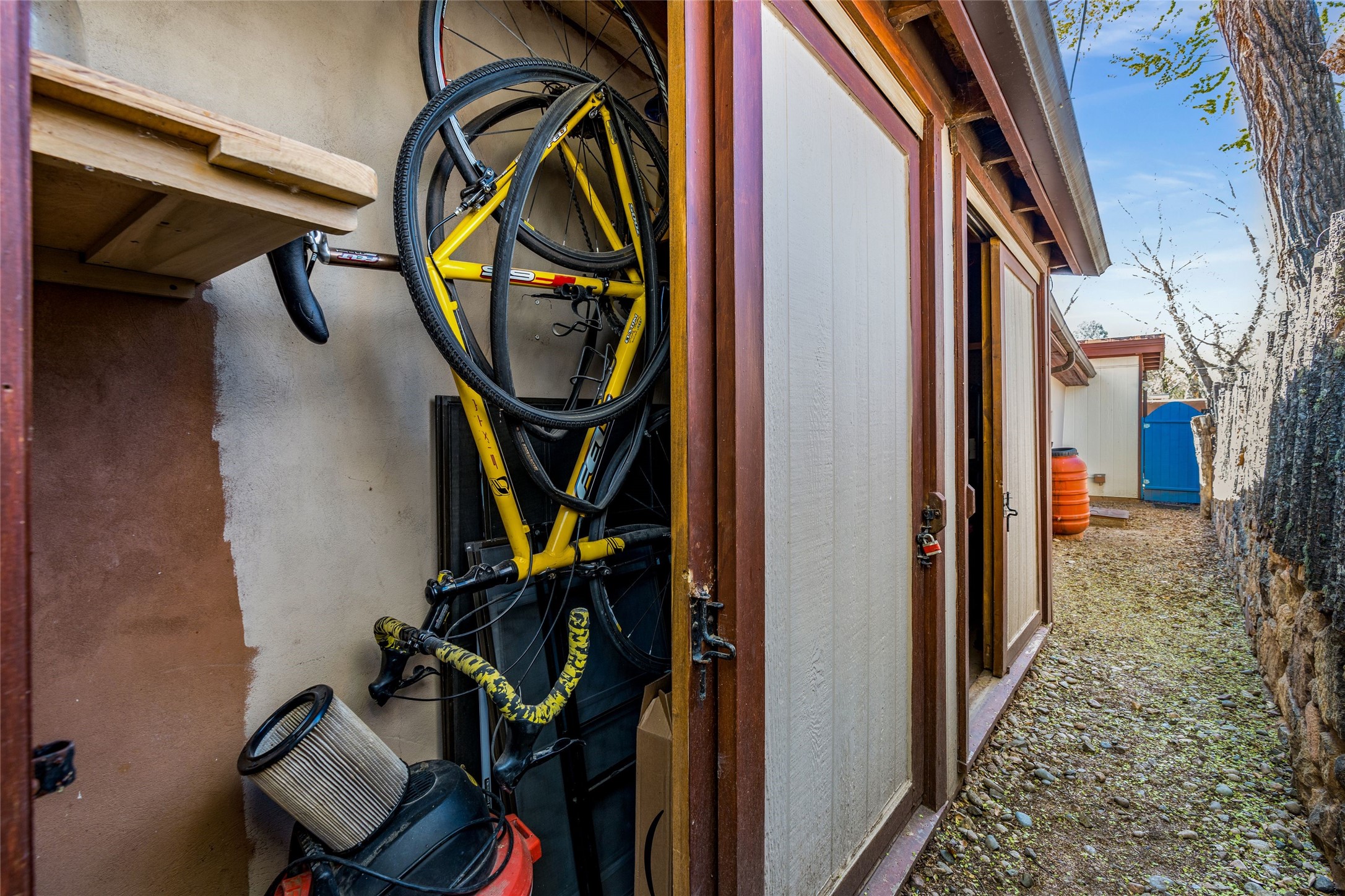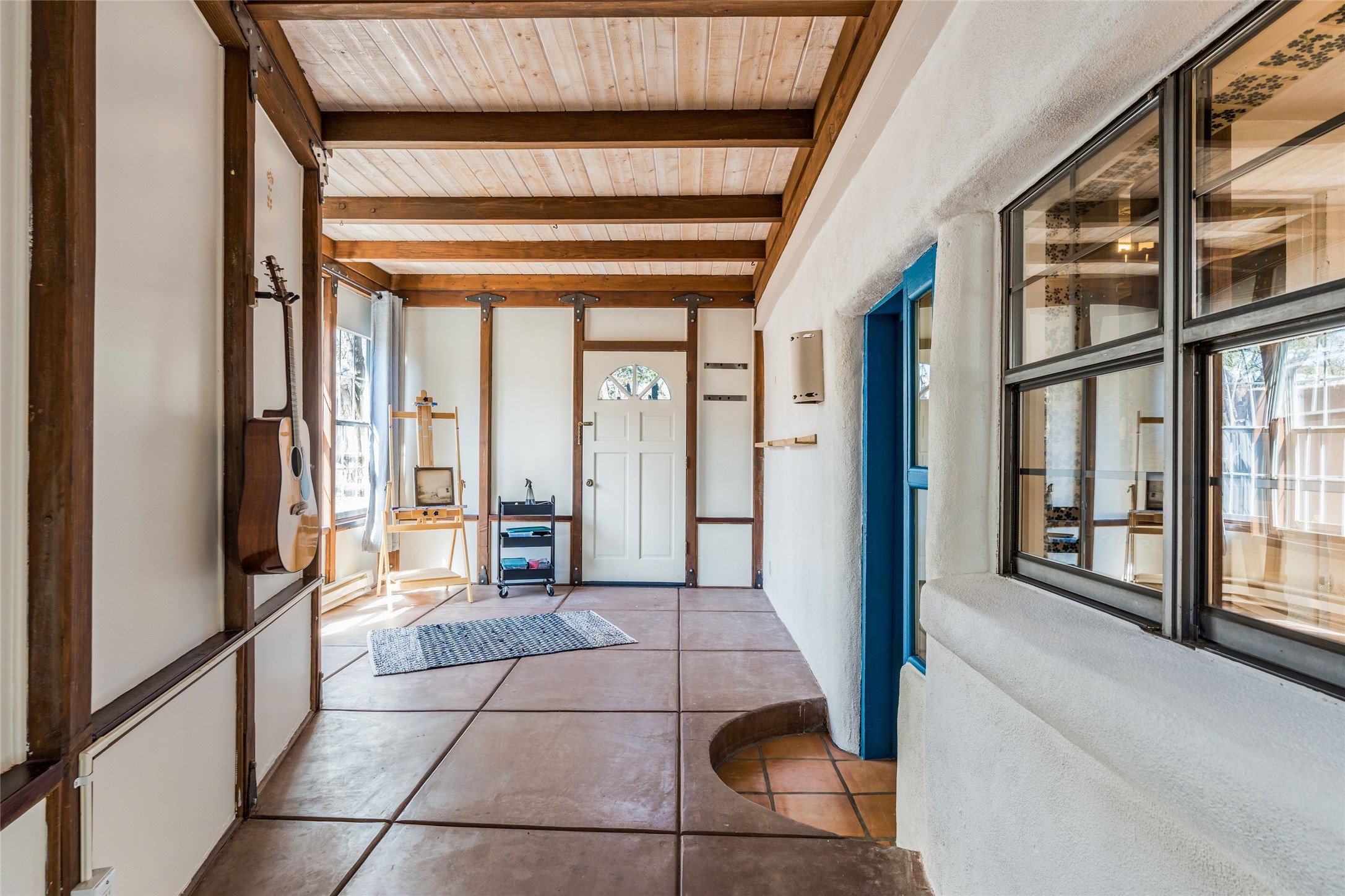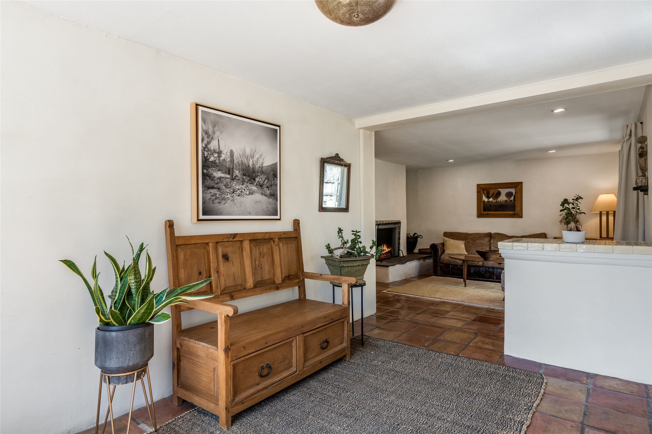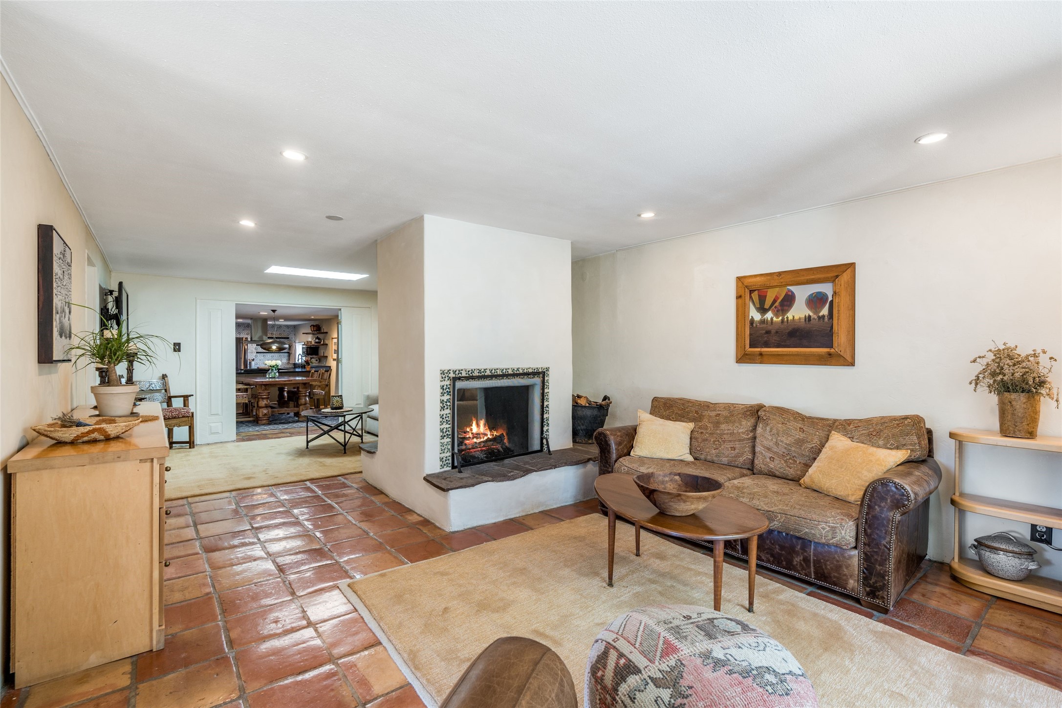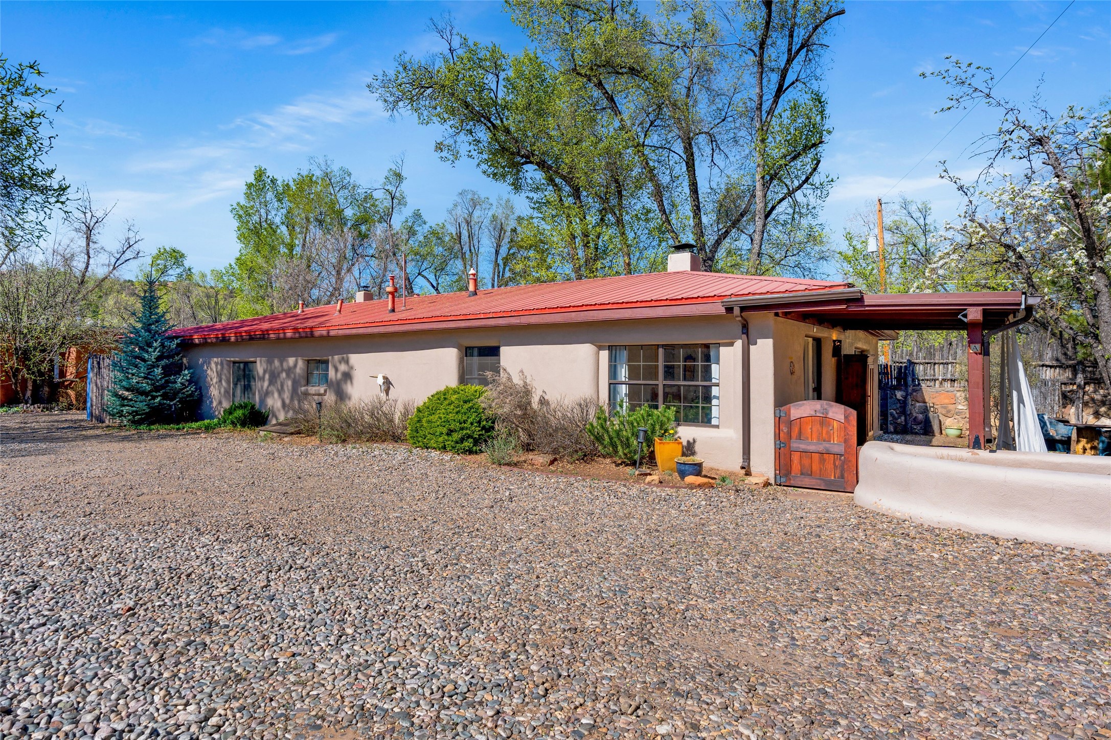Located by the river, minutes from town in the heart of Tesuque, this pitched roof stand-alone mostly adobe home, parts of which date to the late 1800's, is beautifully renovated and ready for its new owner! Entering through the handmade front door is the spacious entry with an East facing window seat for morning reading in the sun and a unique Moroccan light fixture. The main living room/family room is separated by a big double-sided fireplace, good enough to mostly heat the house! The nice large dining room is open to the kitchen for easy entertaining and cooking in the super cool and newly redone kitchen. With black soapstone counters, beautiful tile, locally built cabinetry, mahogany built-in pantry, gas stove, reverse osmosis system and all new appliances, it is a cook's dream! The 3 bedrooms afford plenty of room for family or friends. The main guest room is a nice large size and shares the full bath with the 3rd bedroom which would make a great home office or den and has access to storage in the attic. The main bedroom at the back of the house, has a classic corner kiva fireplace and en suite bath, as well as direct access to outside and the studio for music, painting, writing or separate entry office. So many extras! Pre moratorium well with filtration system and 3-acre ft of water, two tank grey water septic system, good outside storage, newer boiler and washer dryer and pleasant outdoor garden area with pear and apple trees. All this with out-your-door hiking on the Ridge and Winsor trails or meandering along the Tesuque River under the big old majestic cottonwoods. This is a unique two home condo situation with no HOA dues. The two free standing homes split any driveway/septic/well costs 50/50 as needed. Separate furniture package is available if desired.